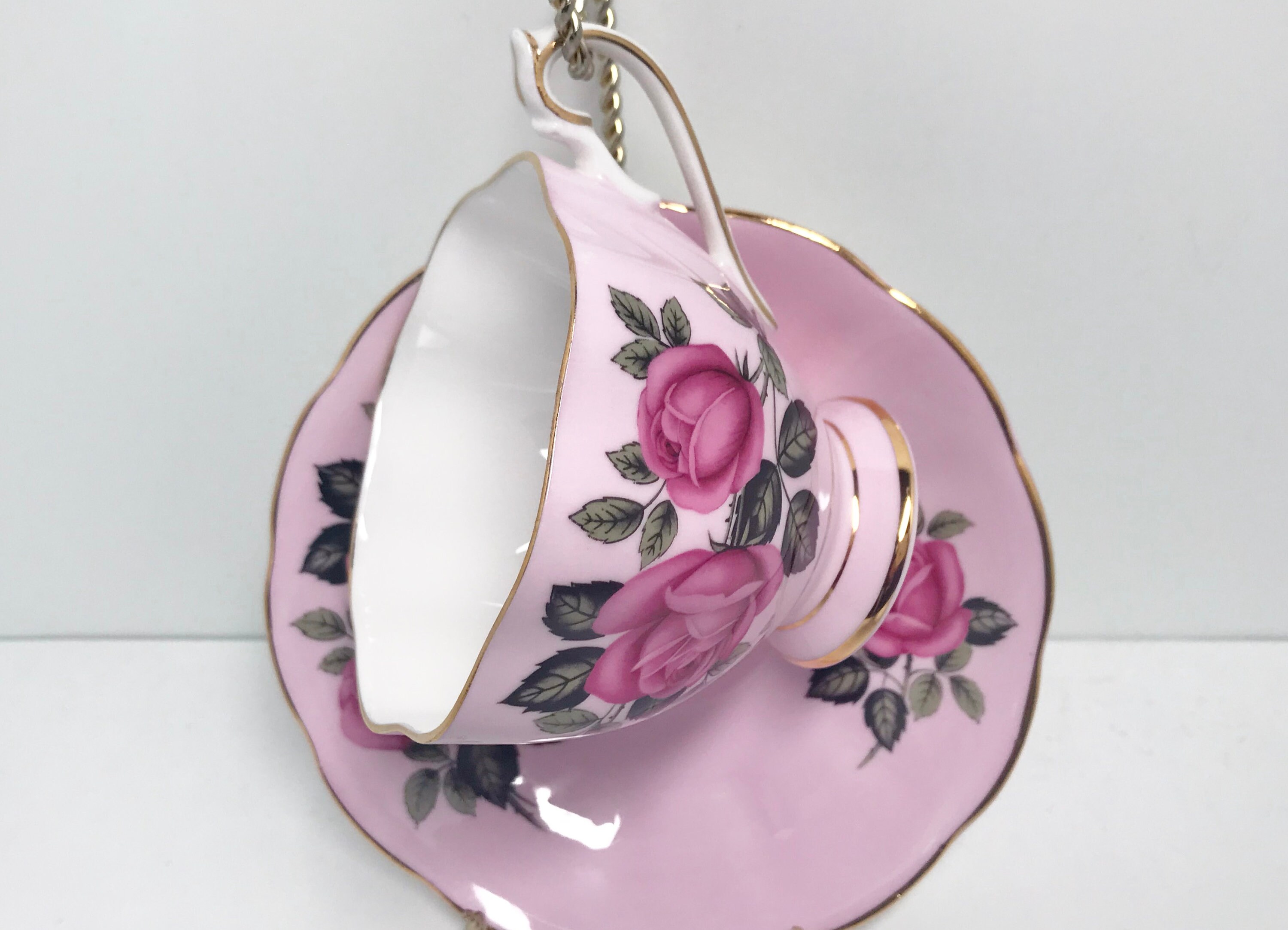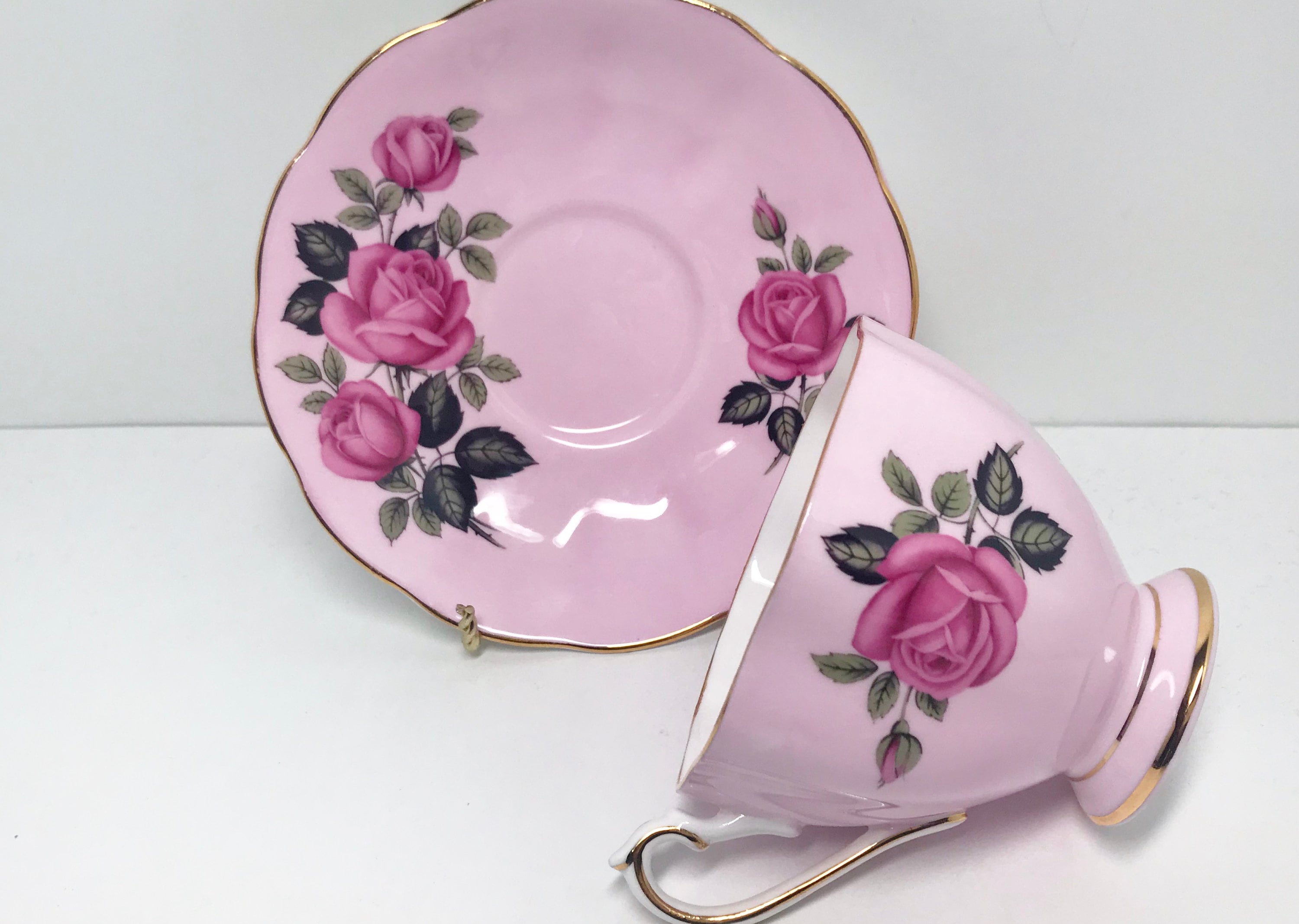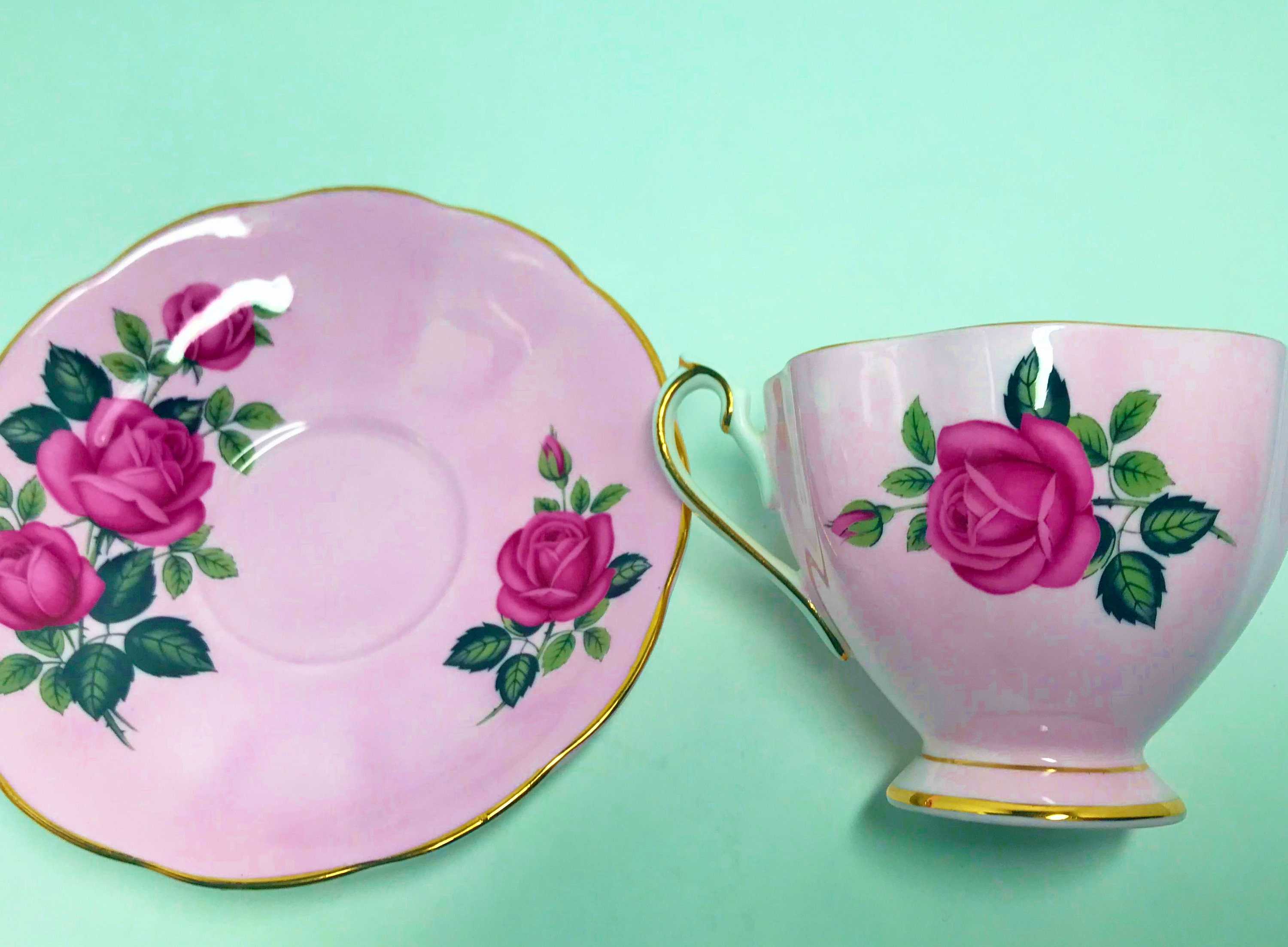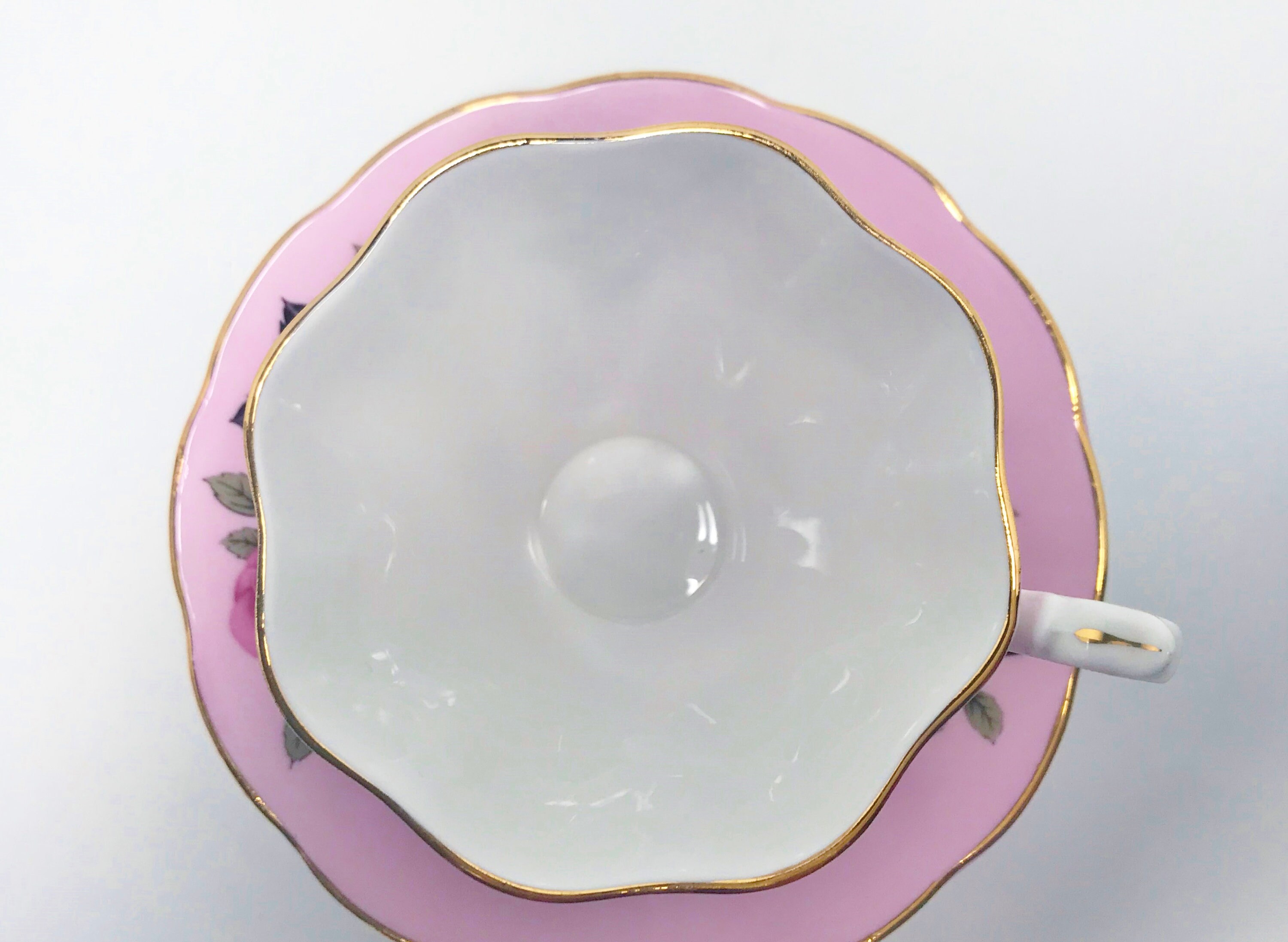 Queen Anne Bone China of England created this pink teacup and saucer in the 1950s. The golden border creates a perfect frame for the lovely blossoms.