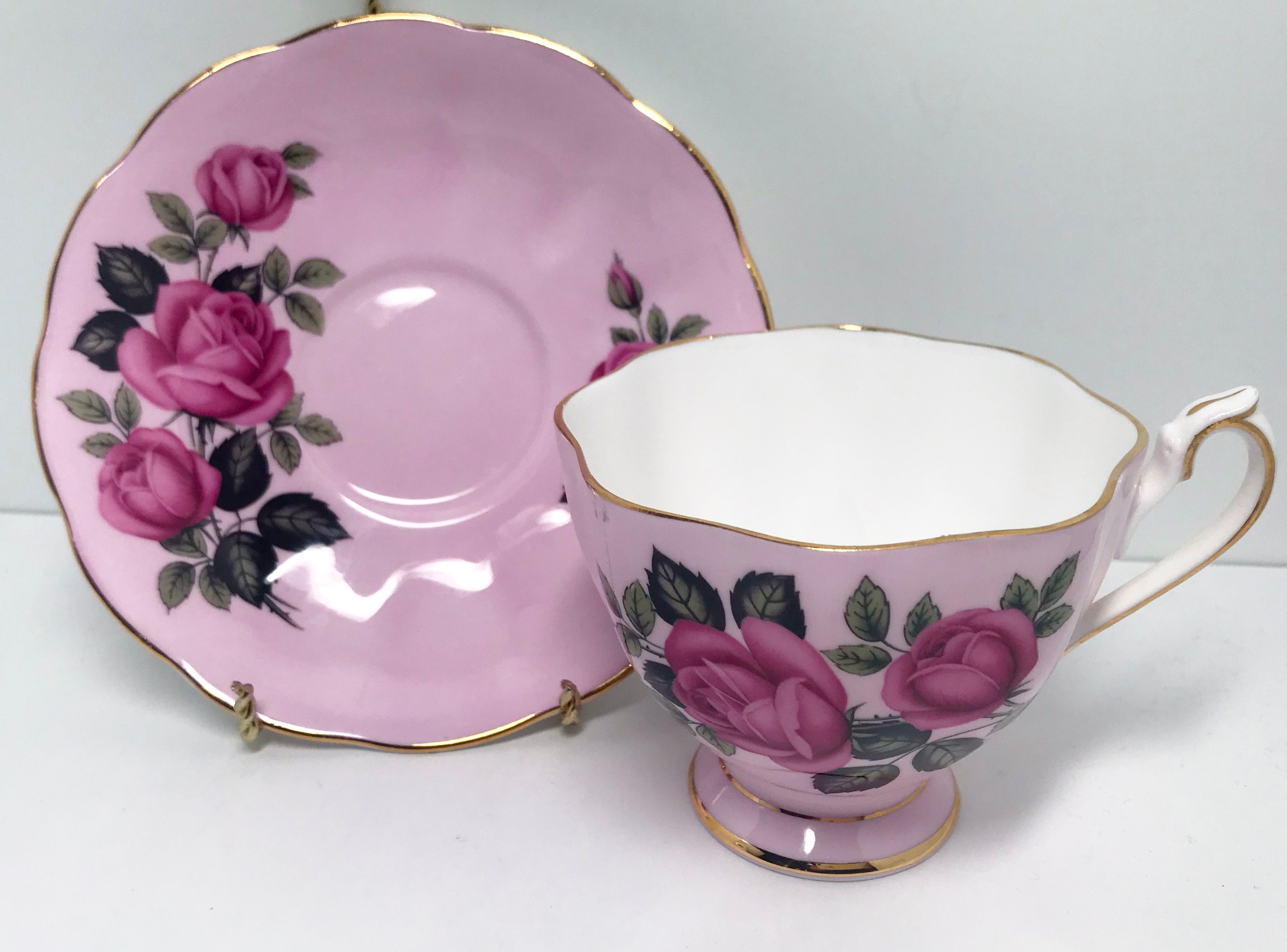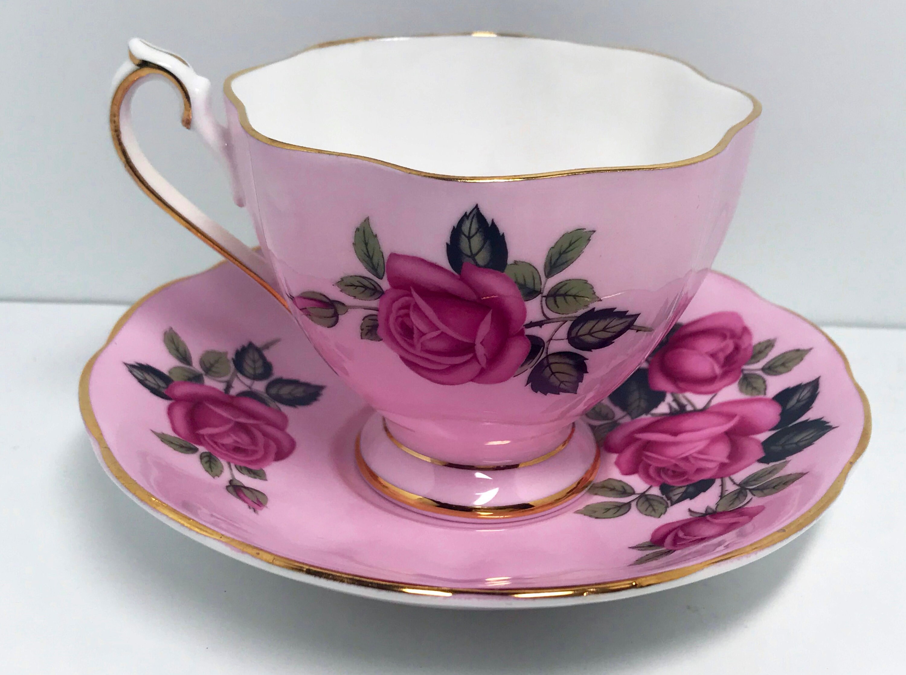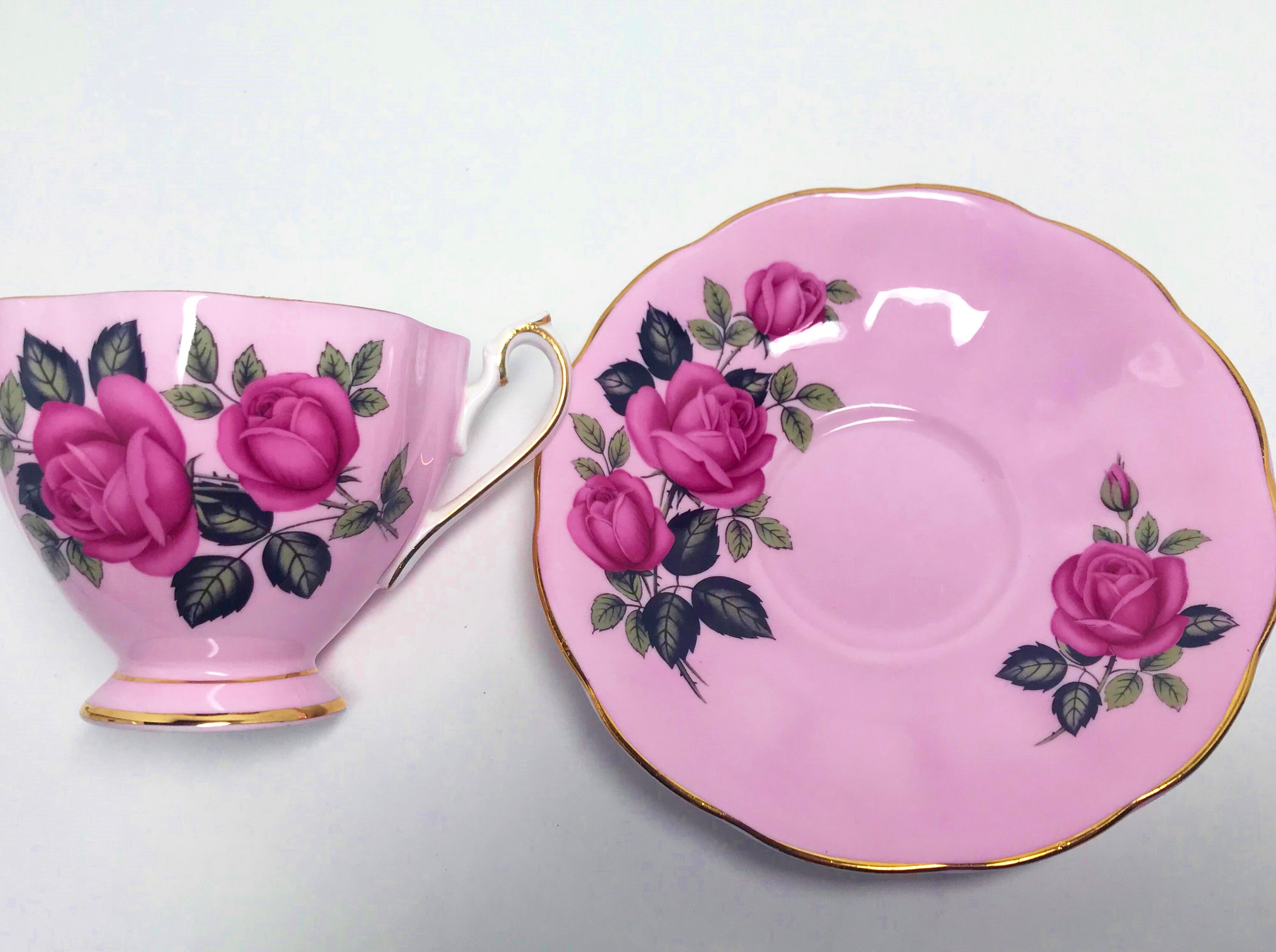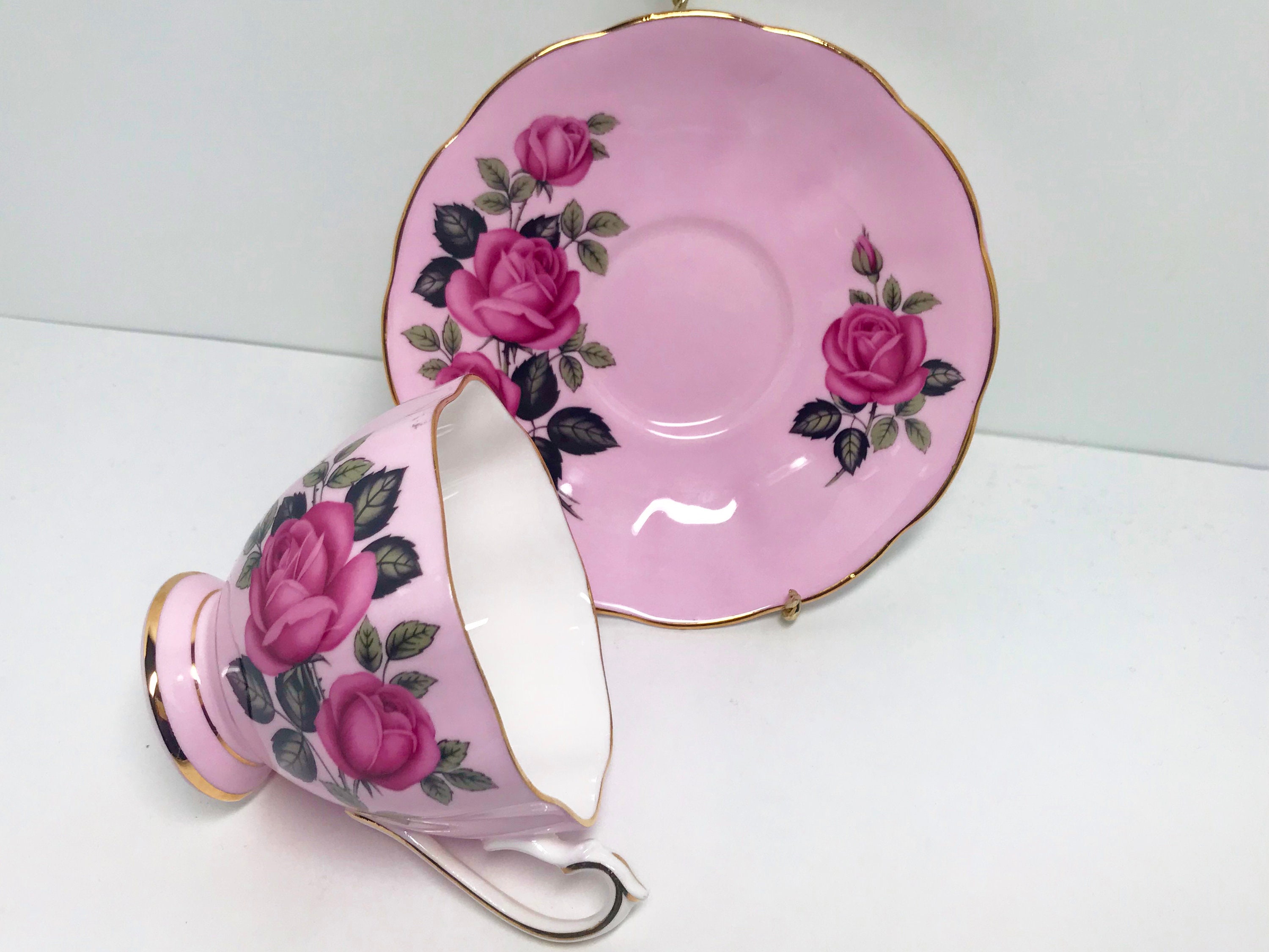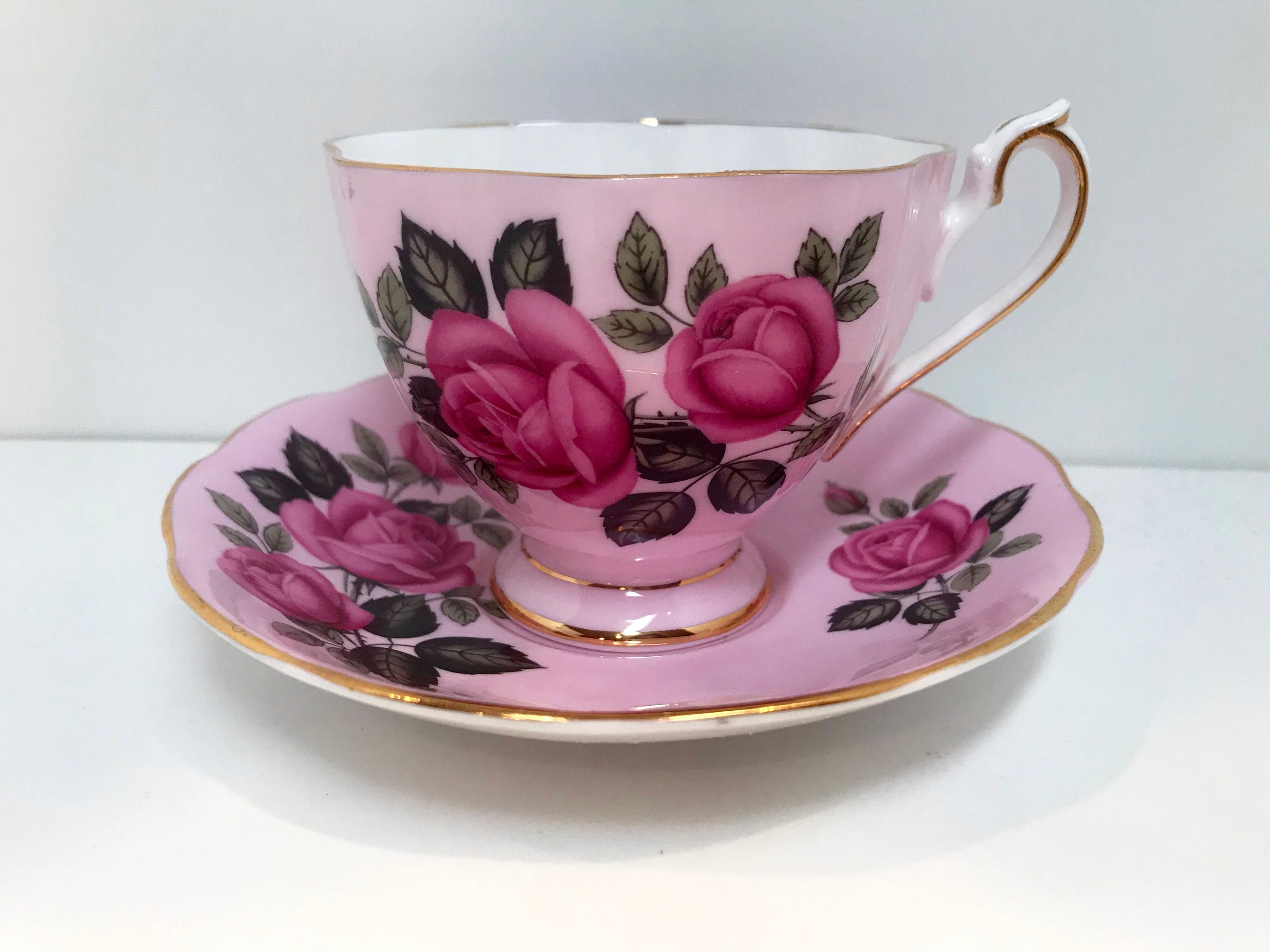 Pink roses symbolize gratitude, grace, and joy. Overall, the flowers are seen as a token of admiration when given to someone. This vibrant teacup and saucer has a panels, a footed cup and gold trim.
