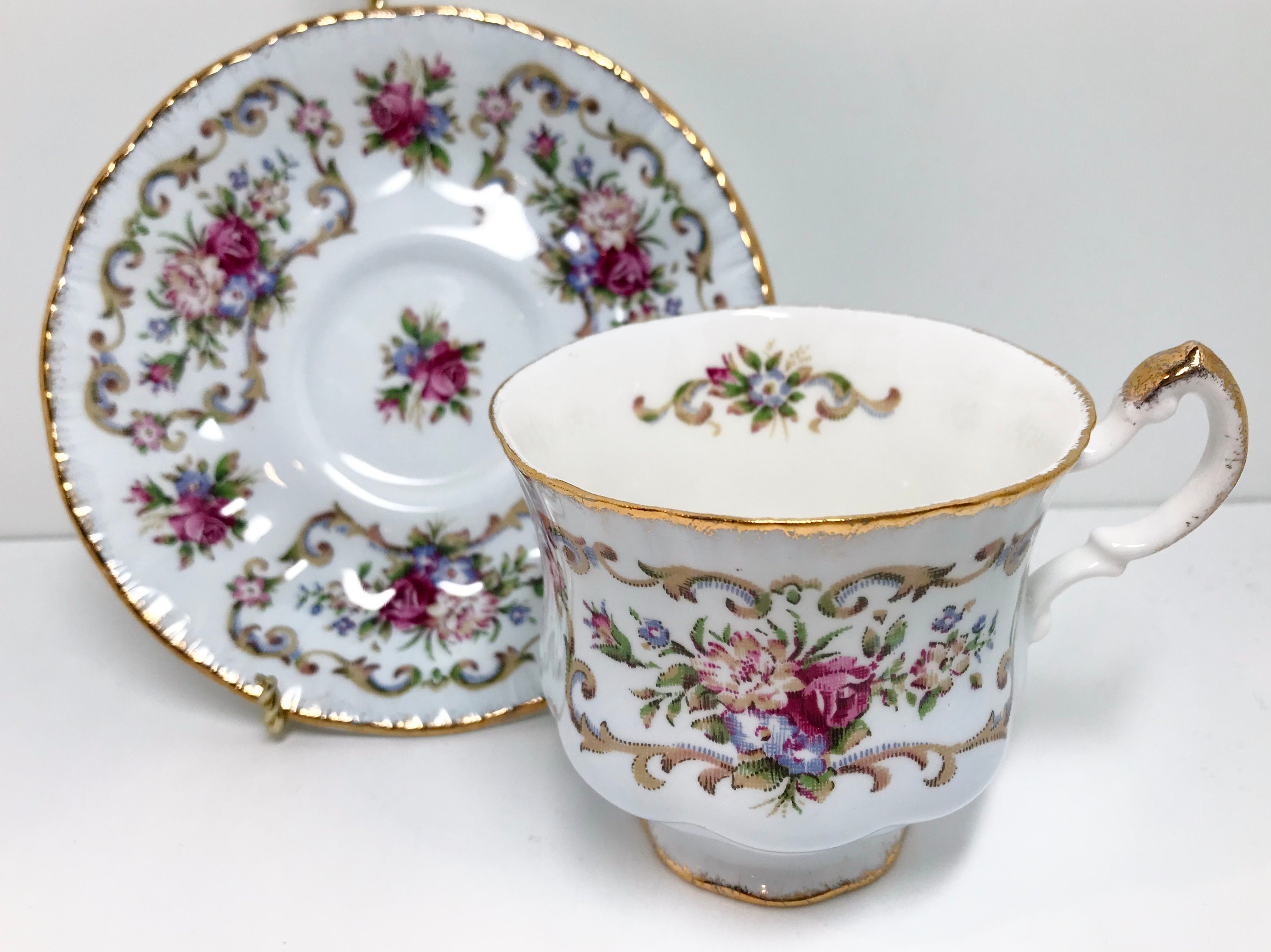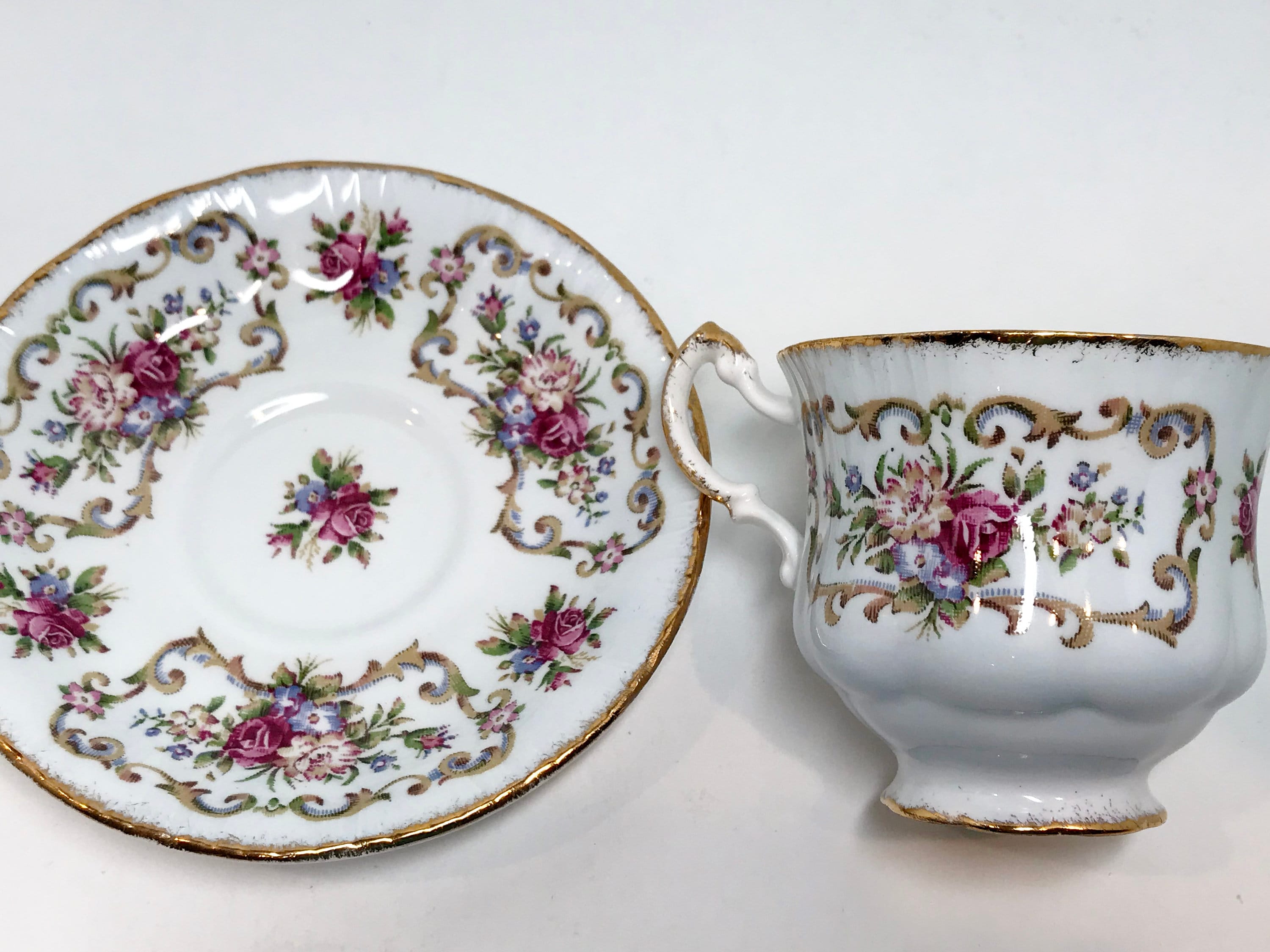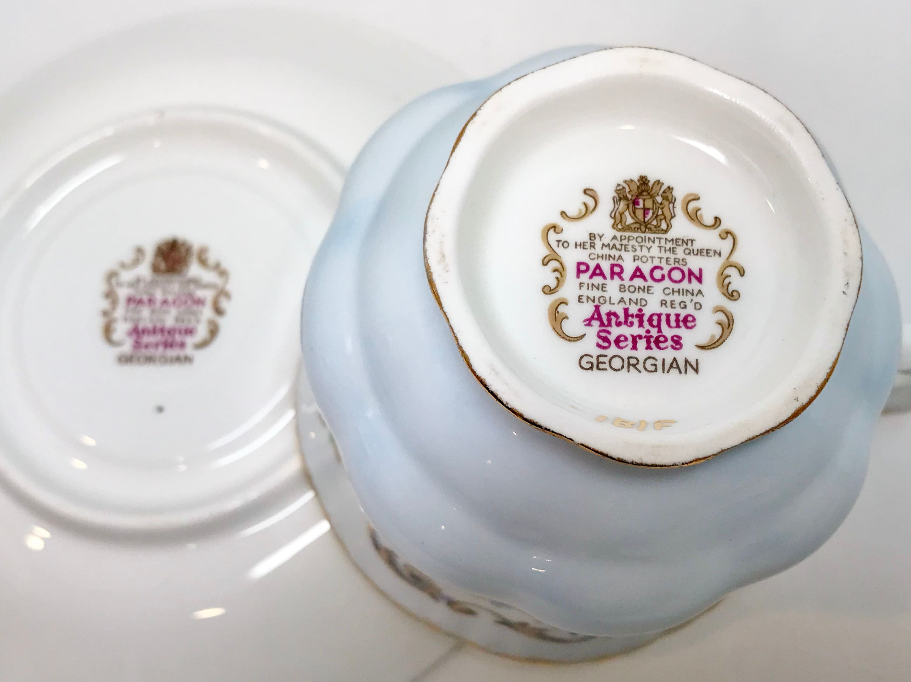 Paragon Fine Bone China, one of the premier companies, produced this pedestal teacup and saucer trimmed in gold. It proudly carries the royal warranty for its quality from Queen Elizabeth of England.