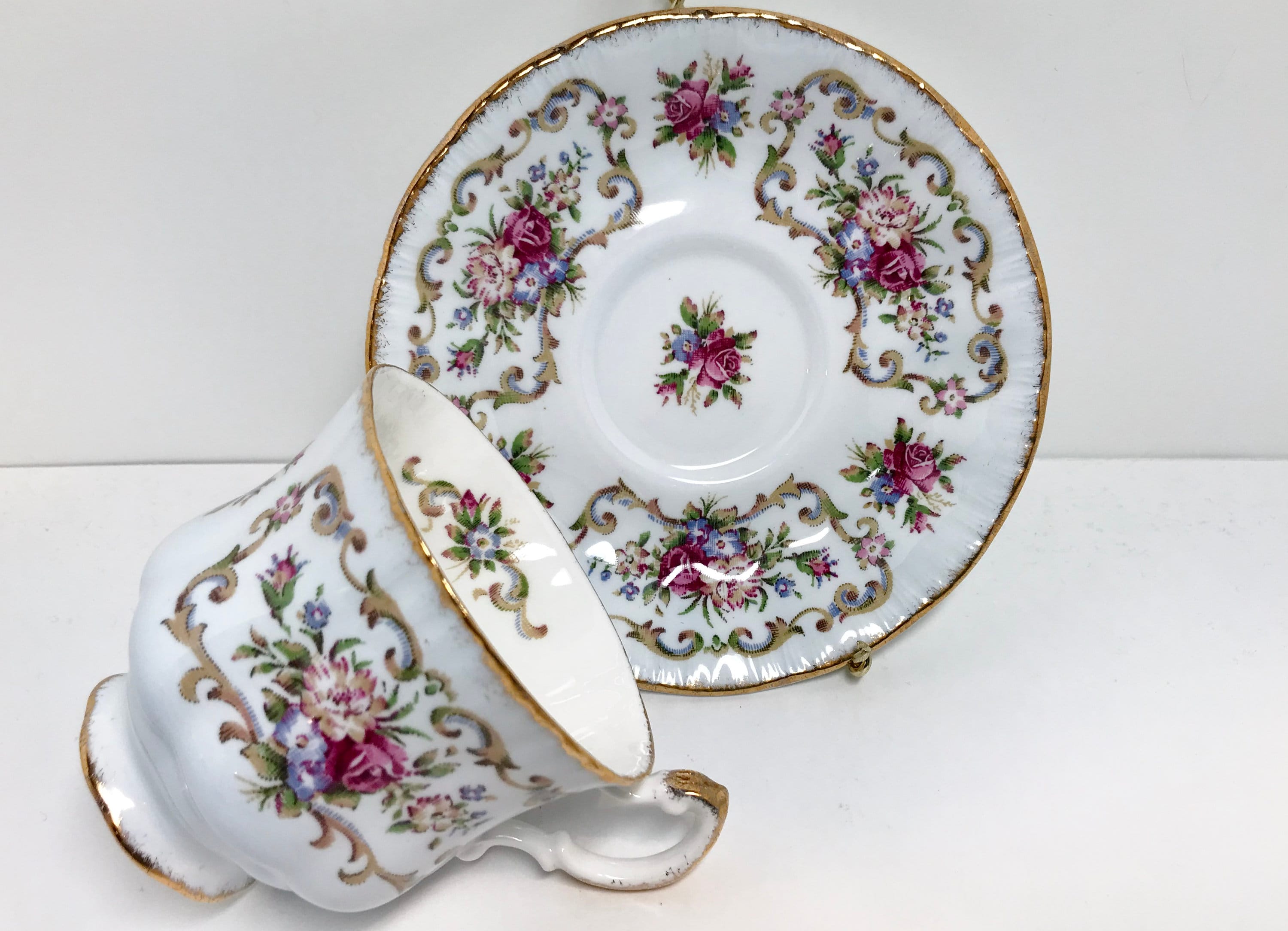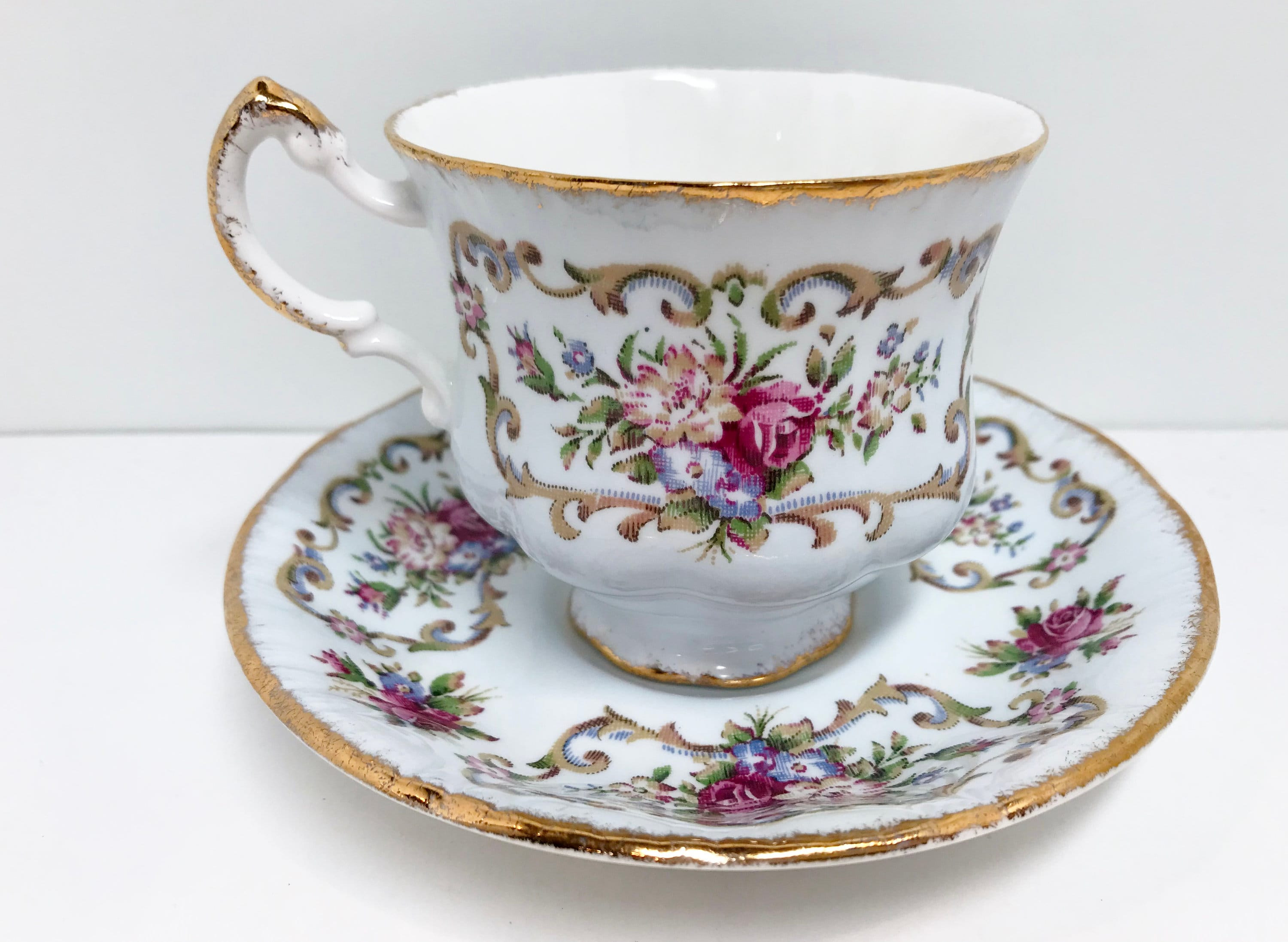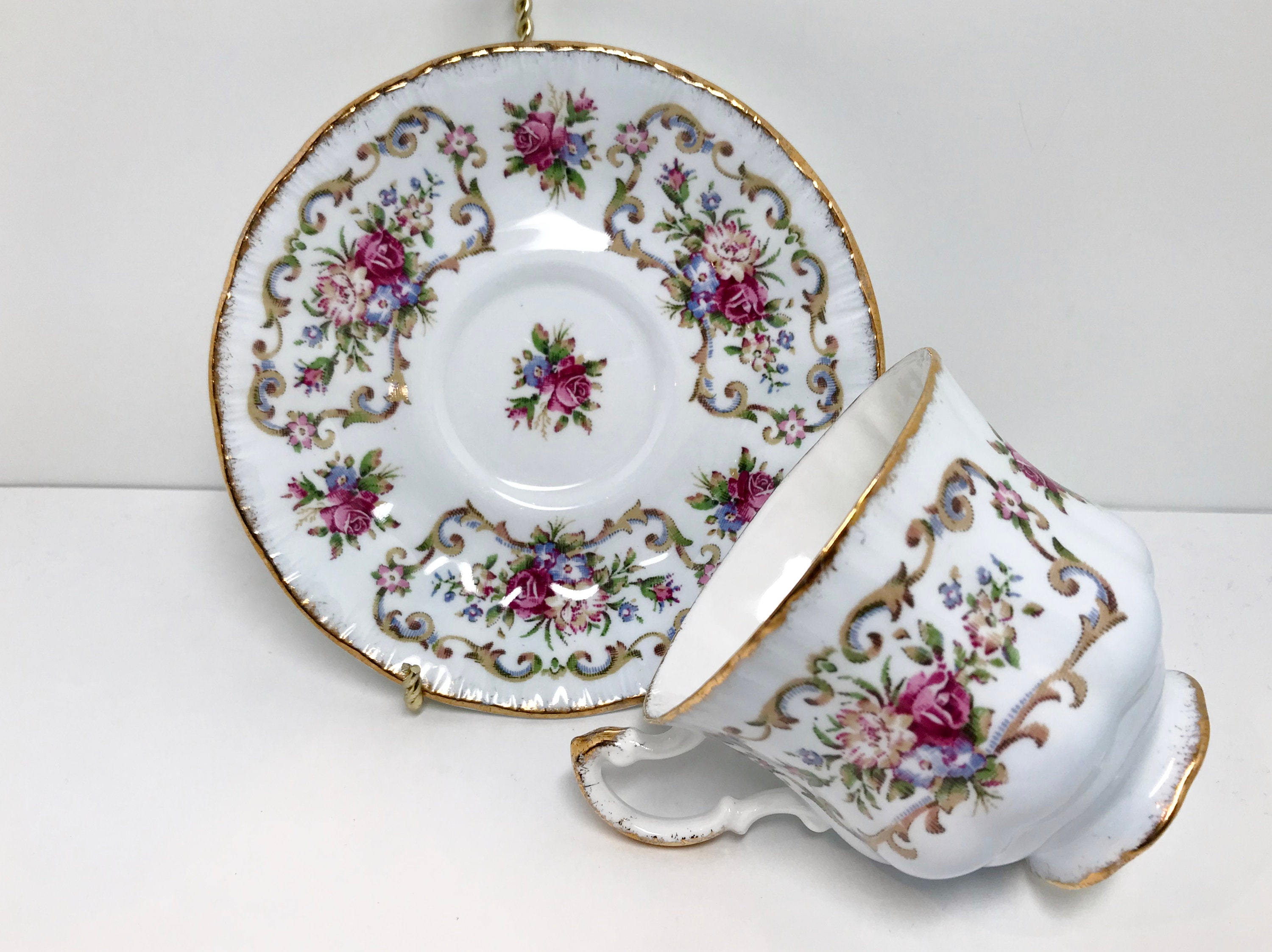 Paragon Fine Bone China, one of the premier companies, produced this pedestal teacup and saucer trimmed in gold. It proudly carries the royal warranty for its quality from Queen Elizabeth of England.