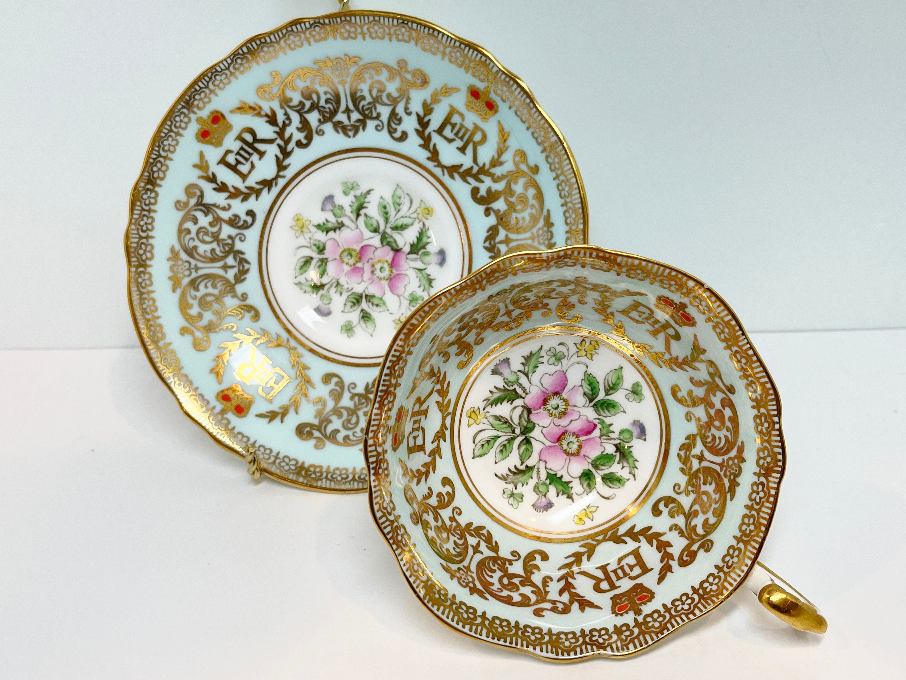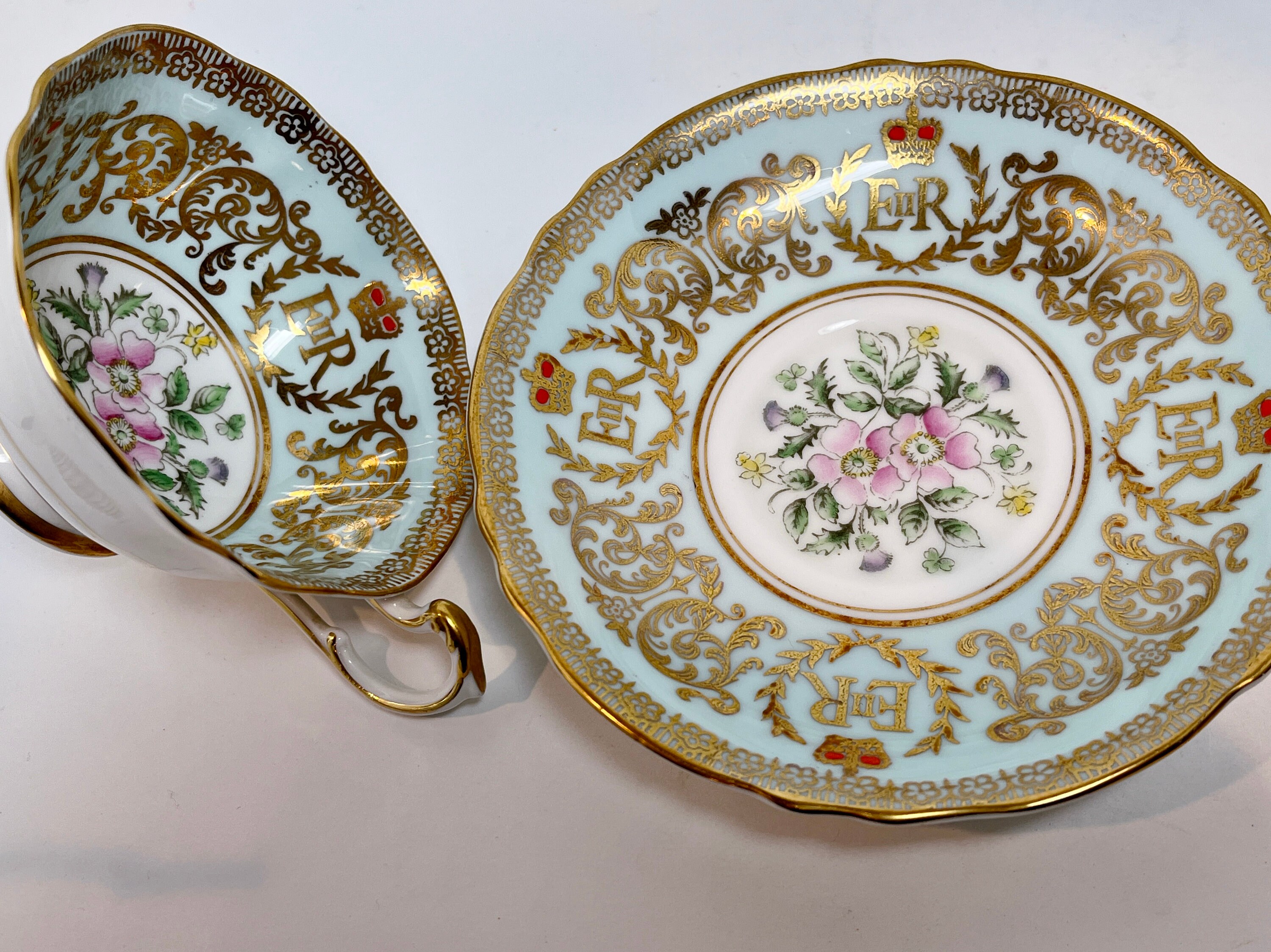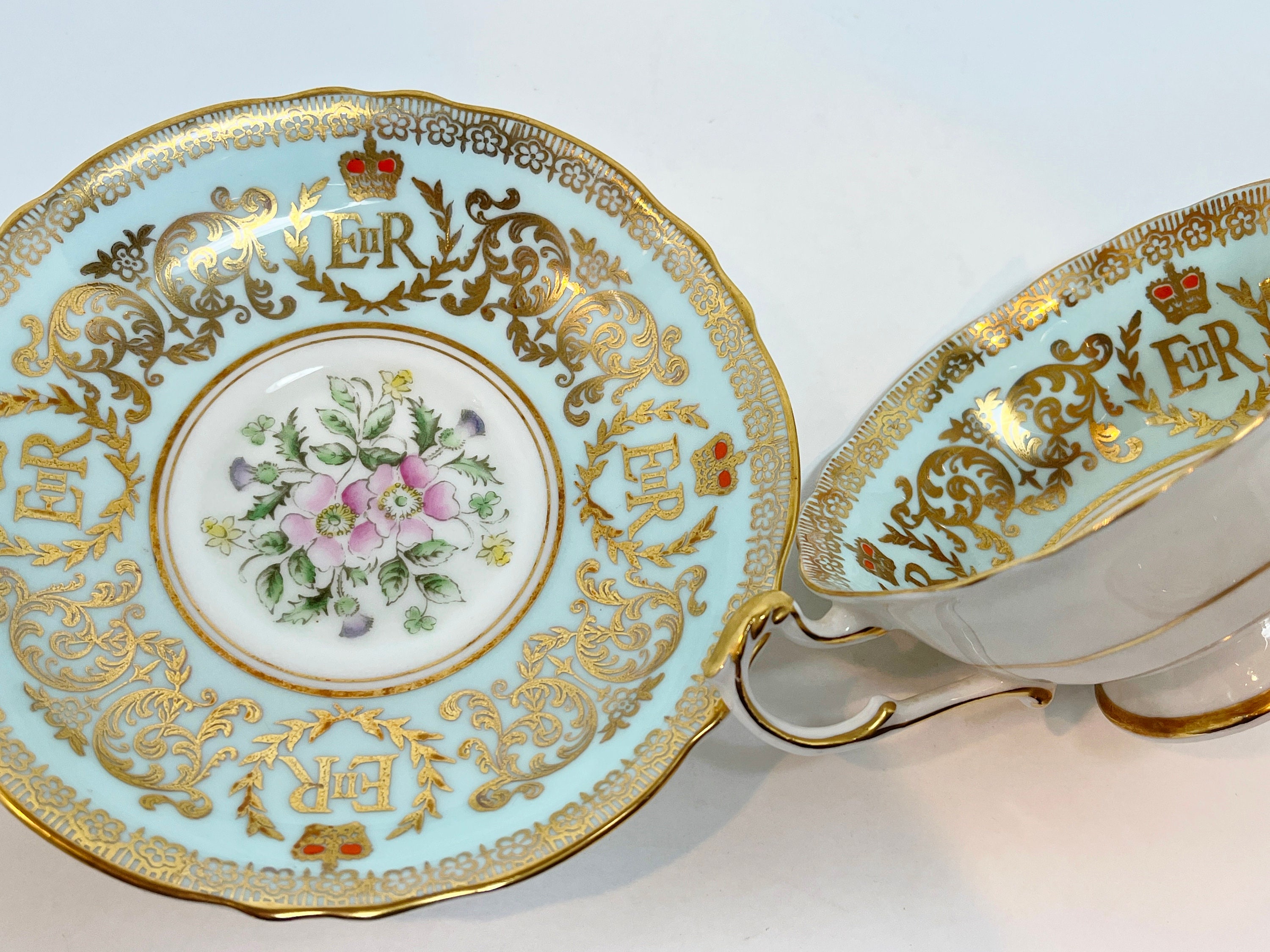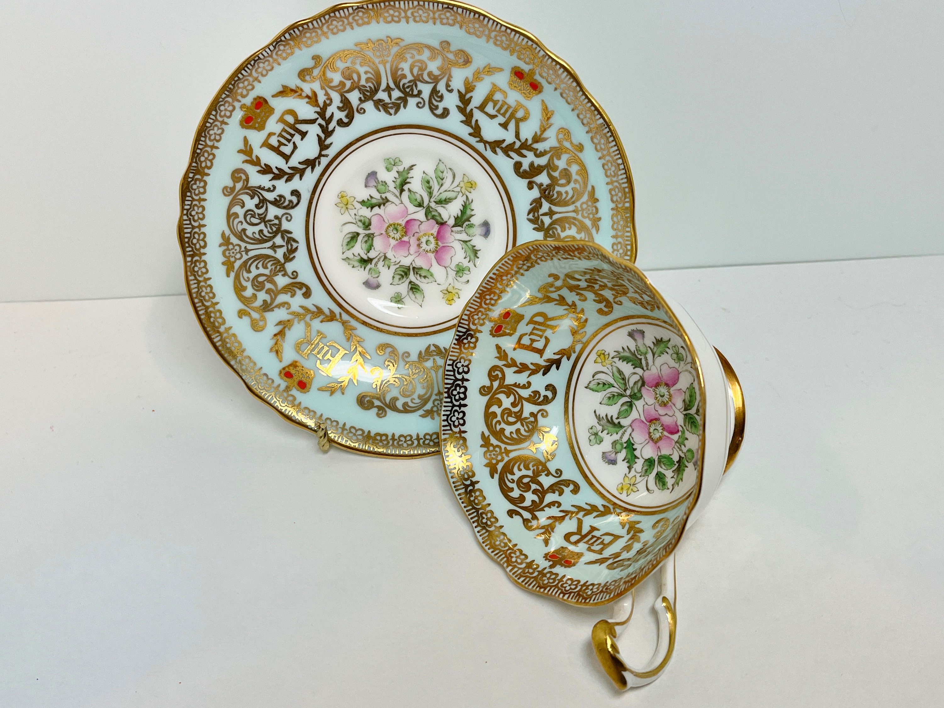 Paragon Fine Bone China of England has utilized a timeless approach with pale aqua and gold as well as a classic shape. This teacup and saucer commemorates the coronation of the current Queen Elizabeth II.