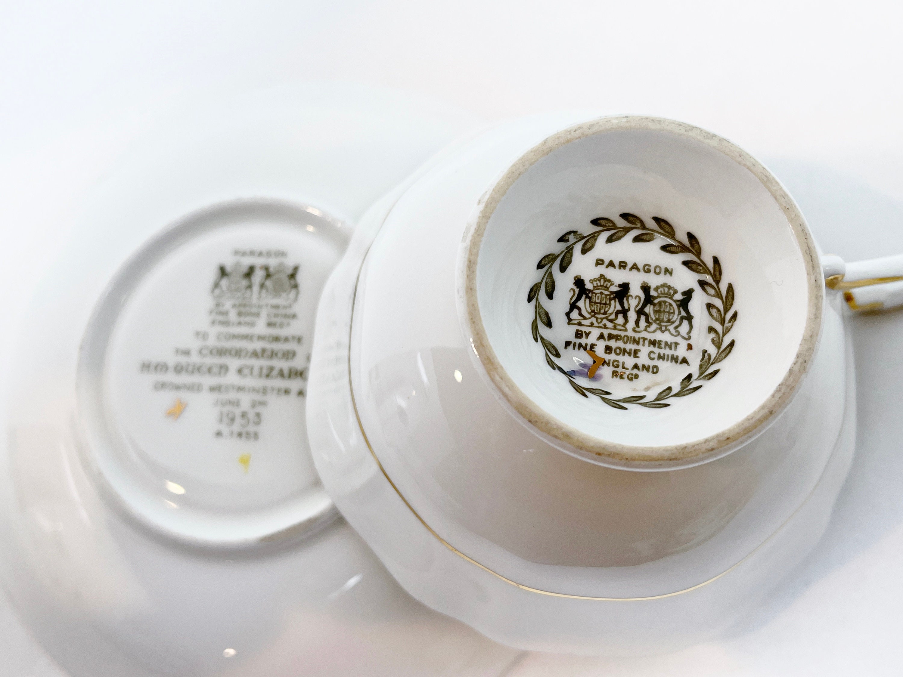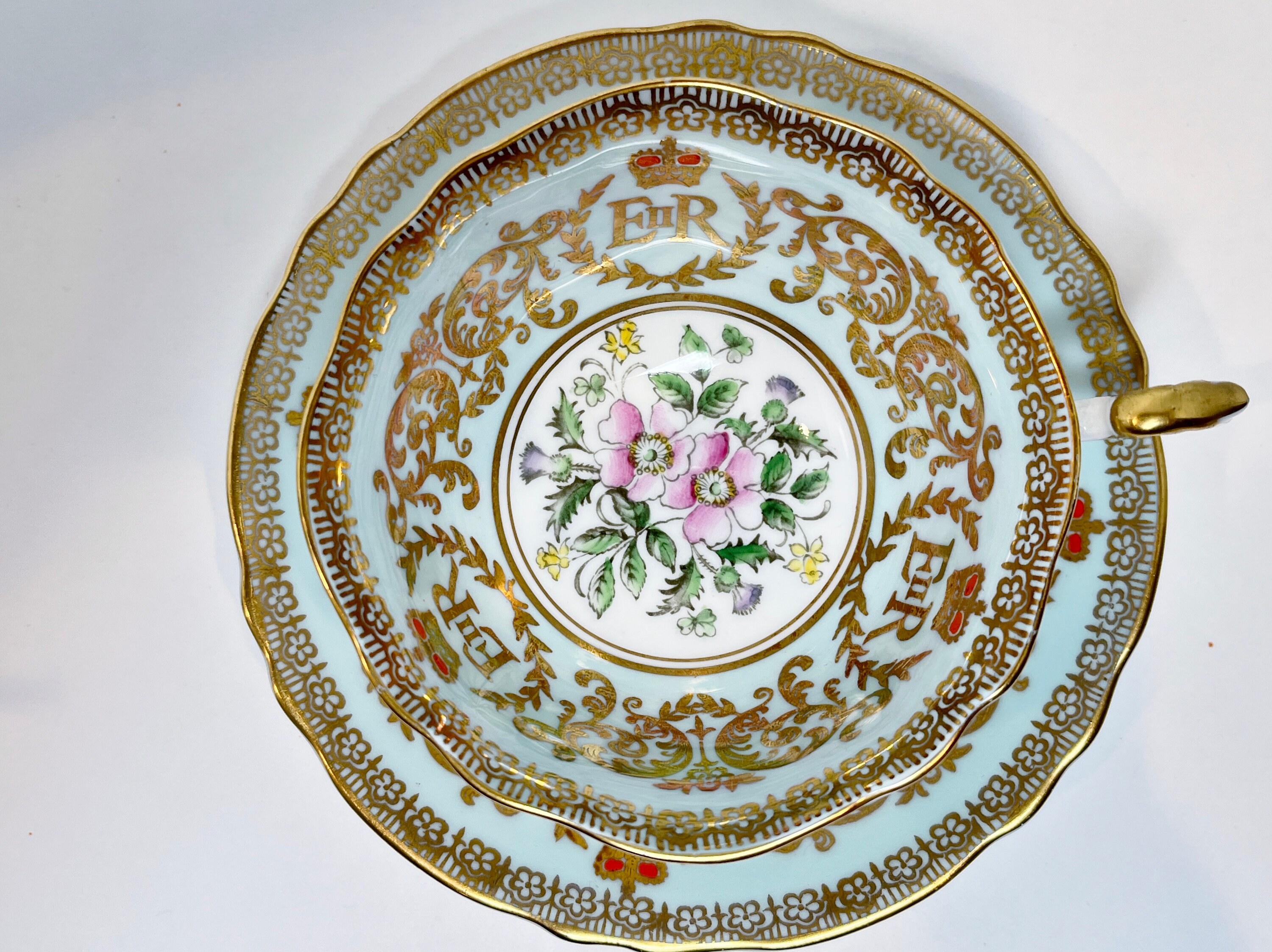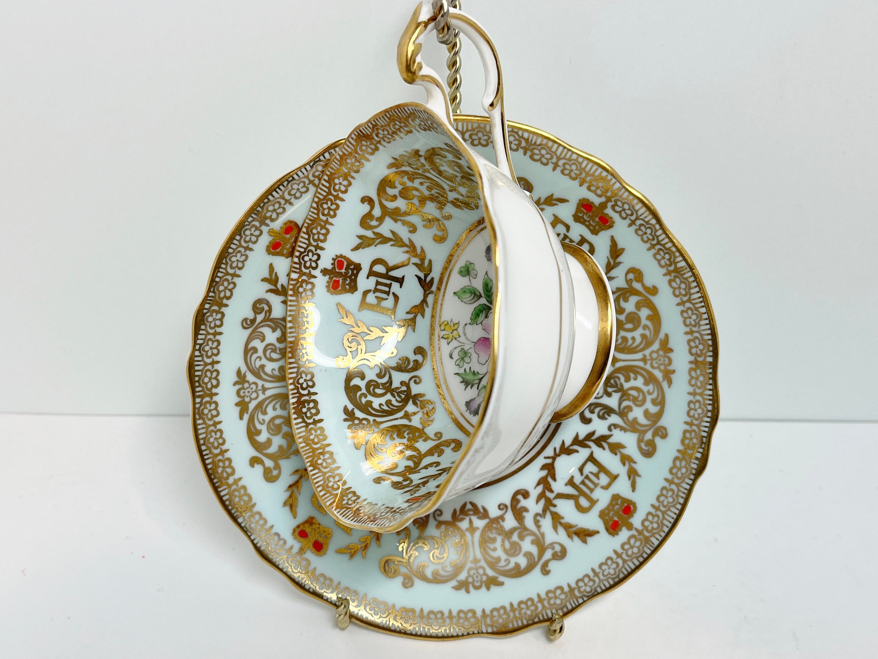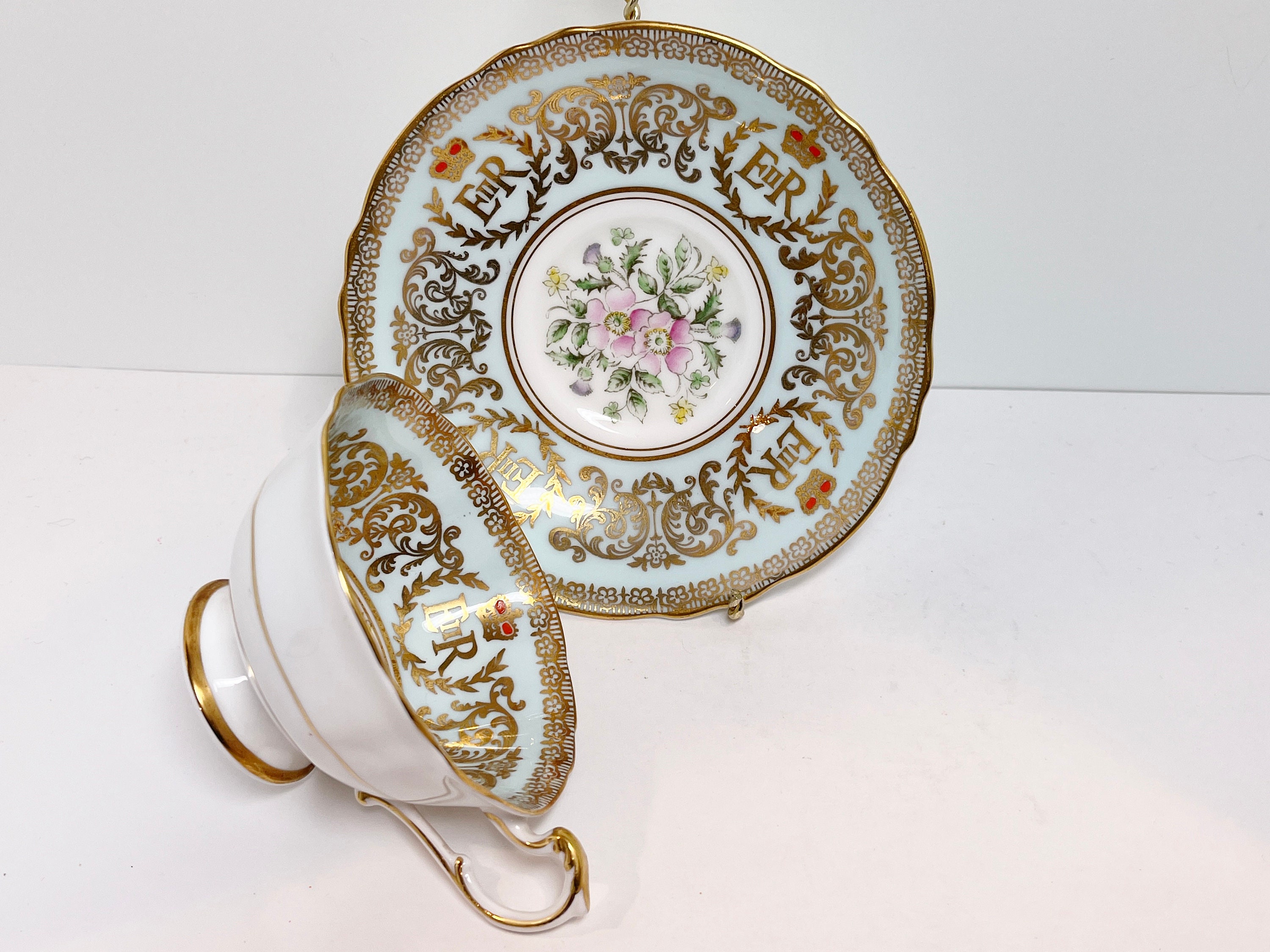 Paragon Fine Bone China of England has utilized a timeless approach with pale aqua and gold as well as a classic shape. This teacup and saucer commemorates the coronation of the current Queen Elizabeth II.