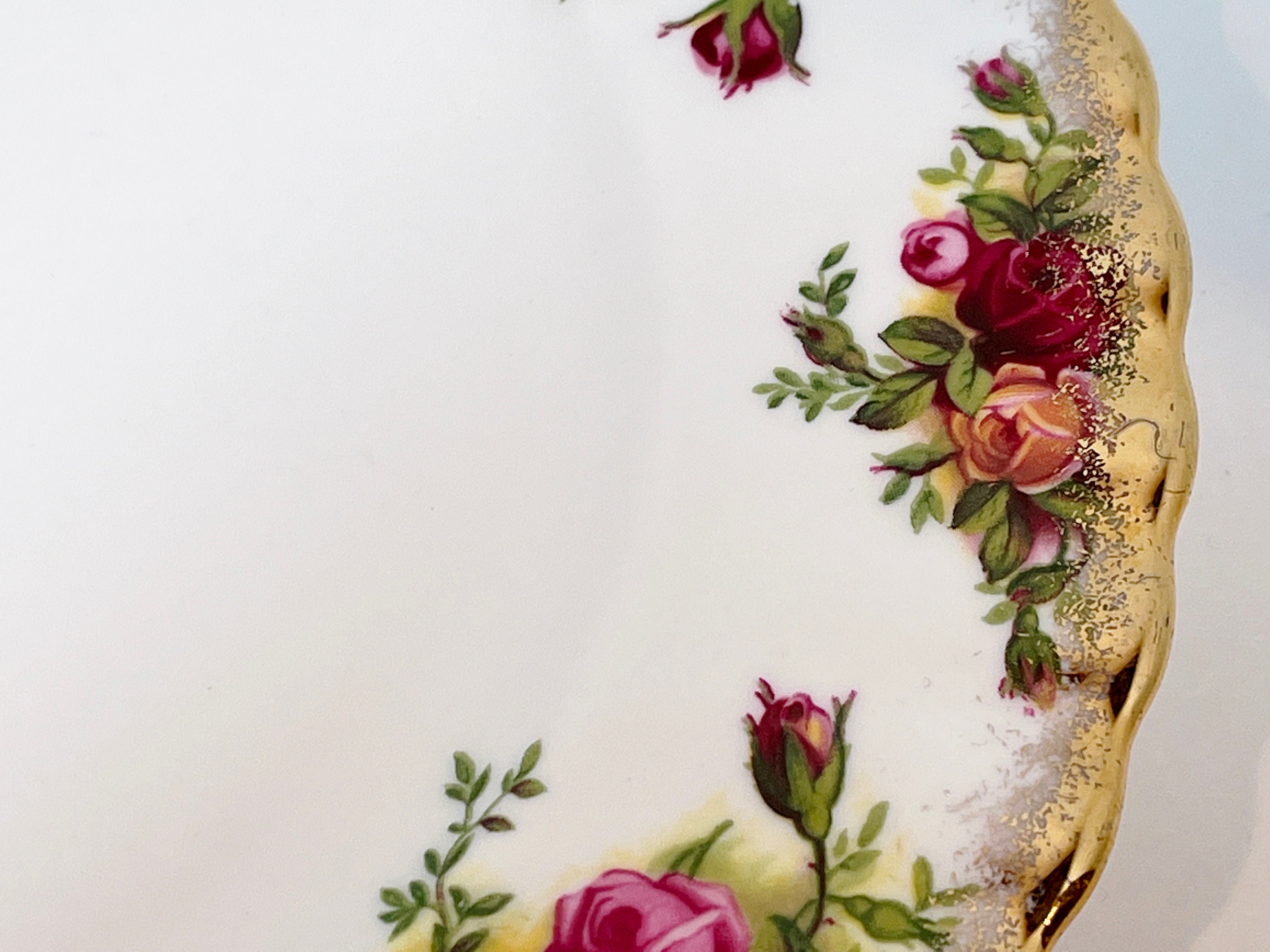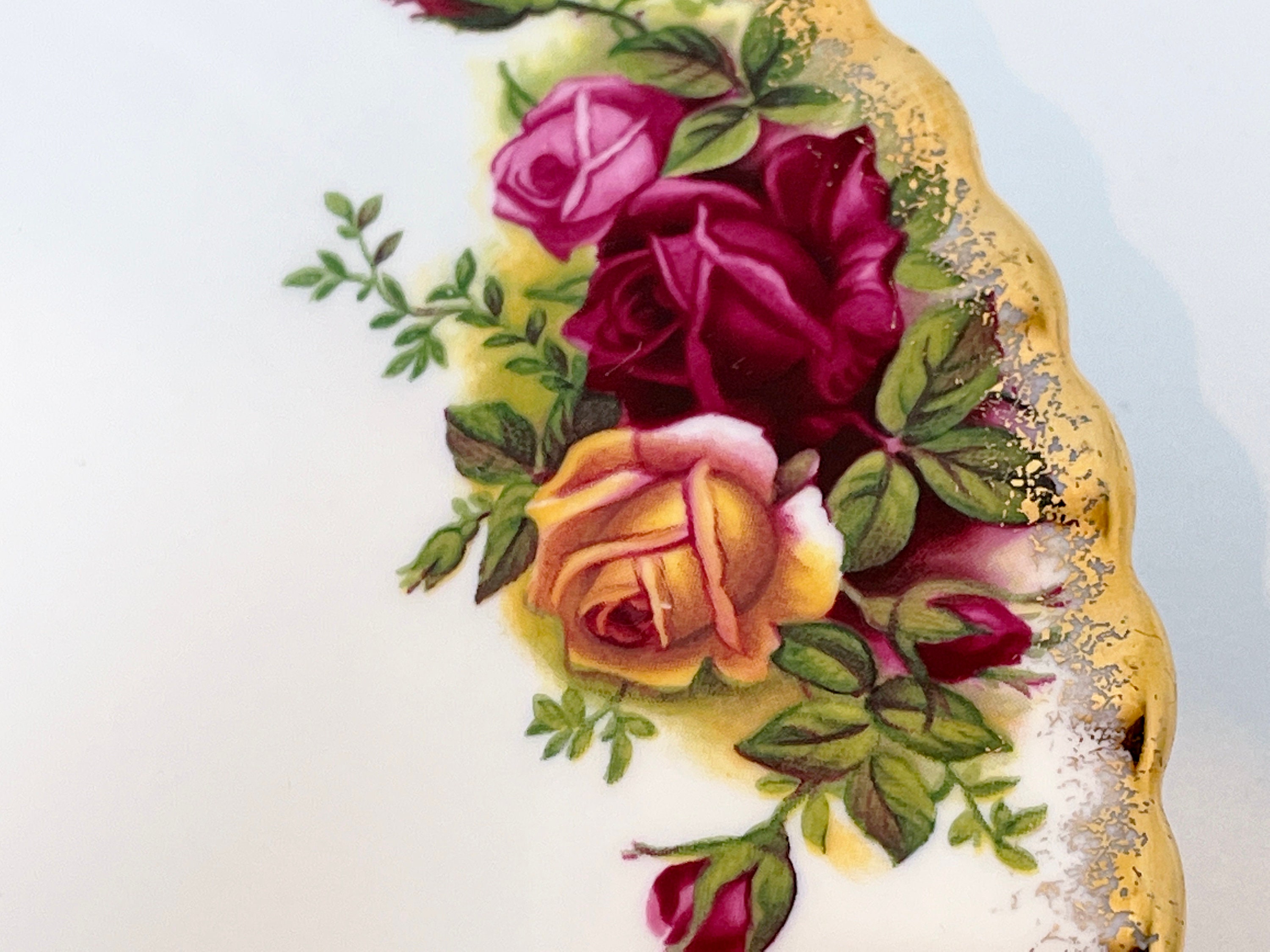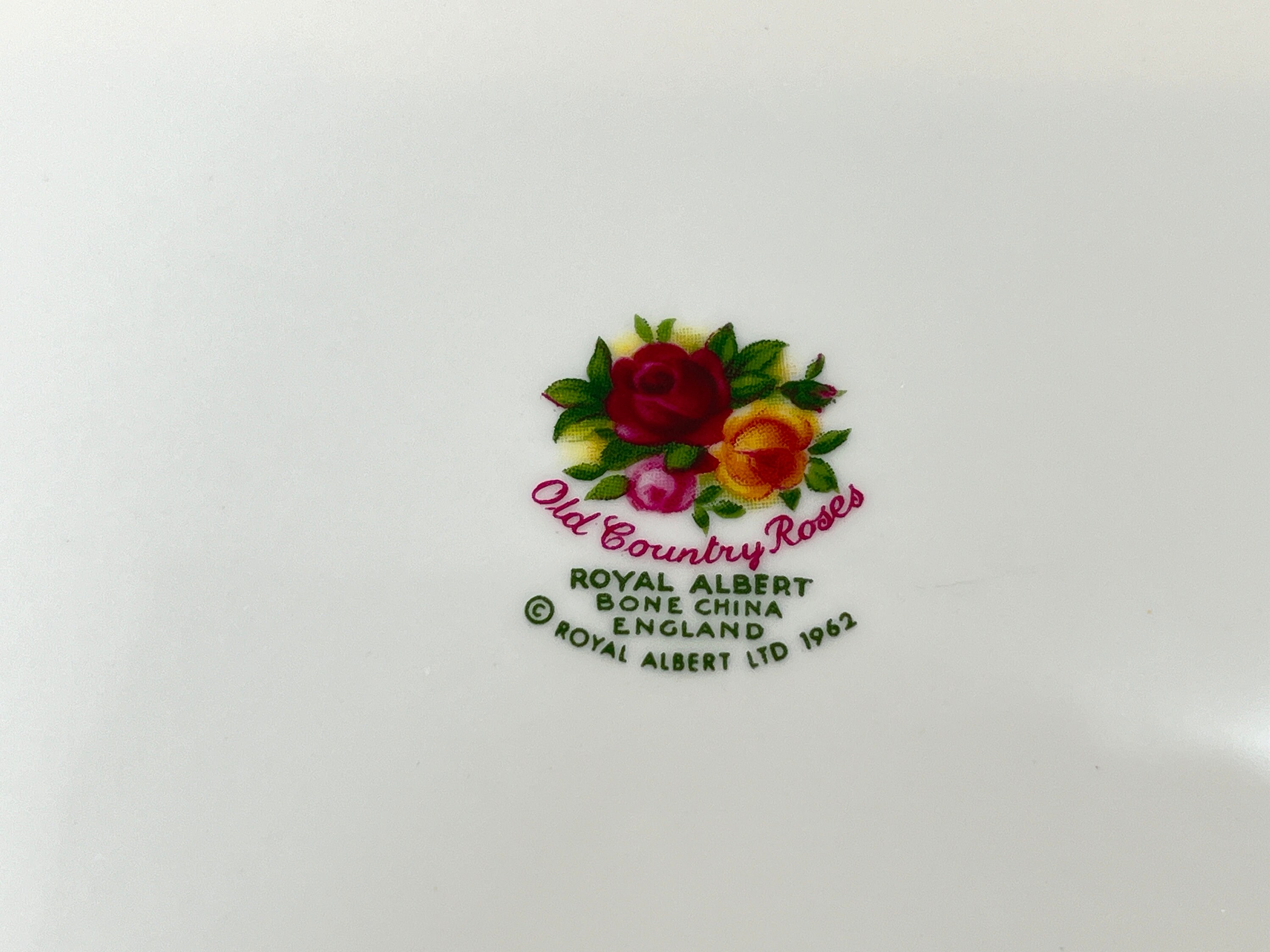 This elegant plate is by Royal Albert Bone China of England. It is called Old Country Roses. It was so very popular that it was reissued again in later years. The backstamp tells us that it was made between 1973 and 1993.