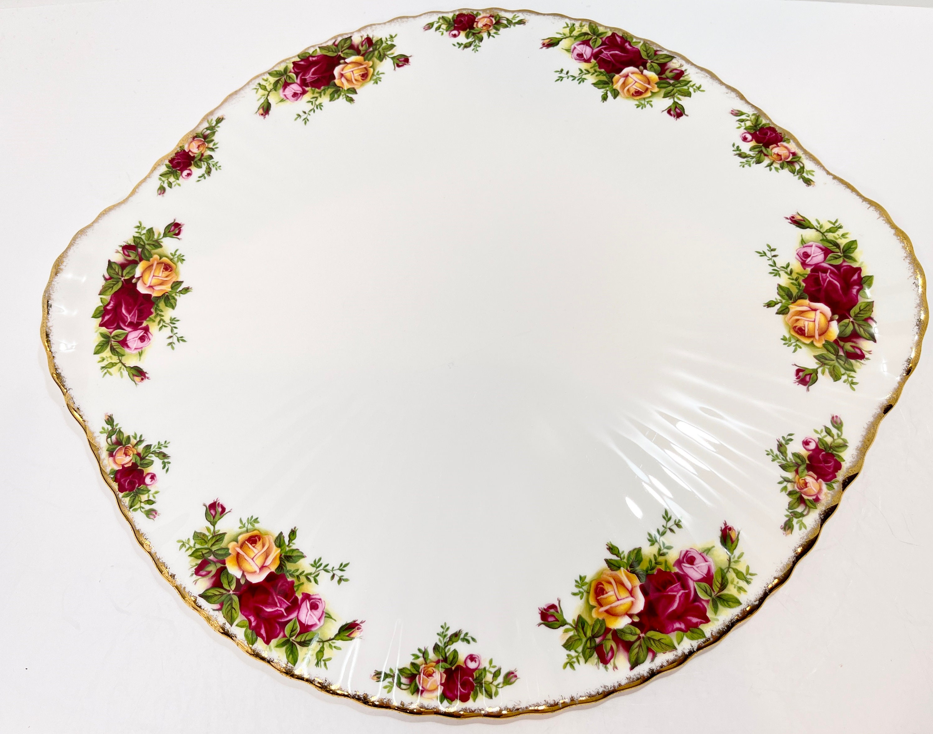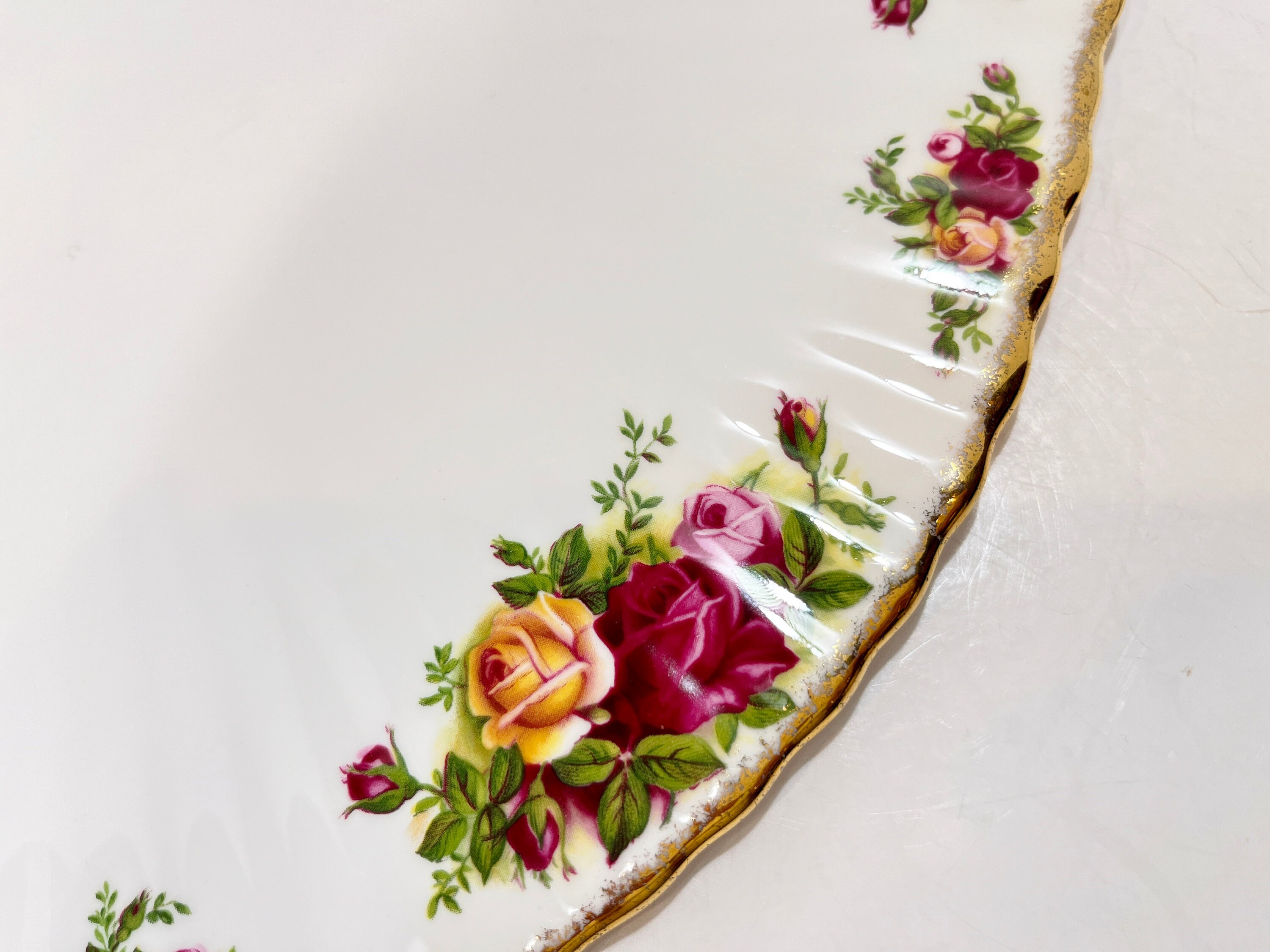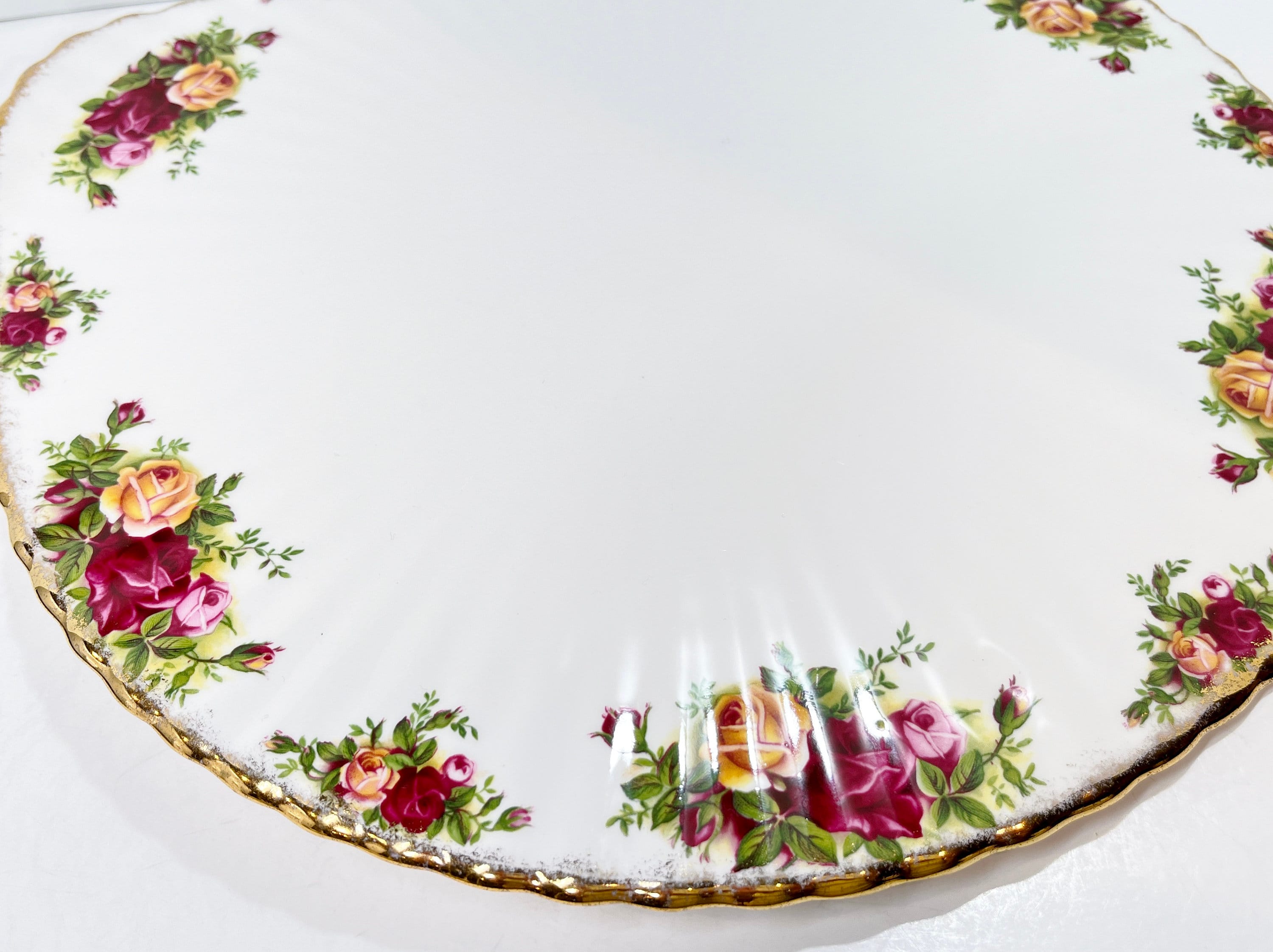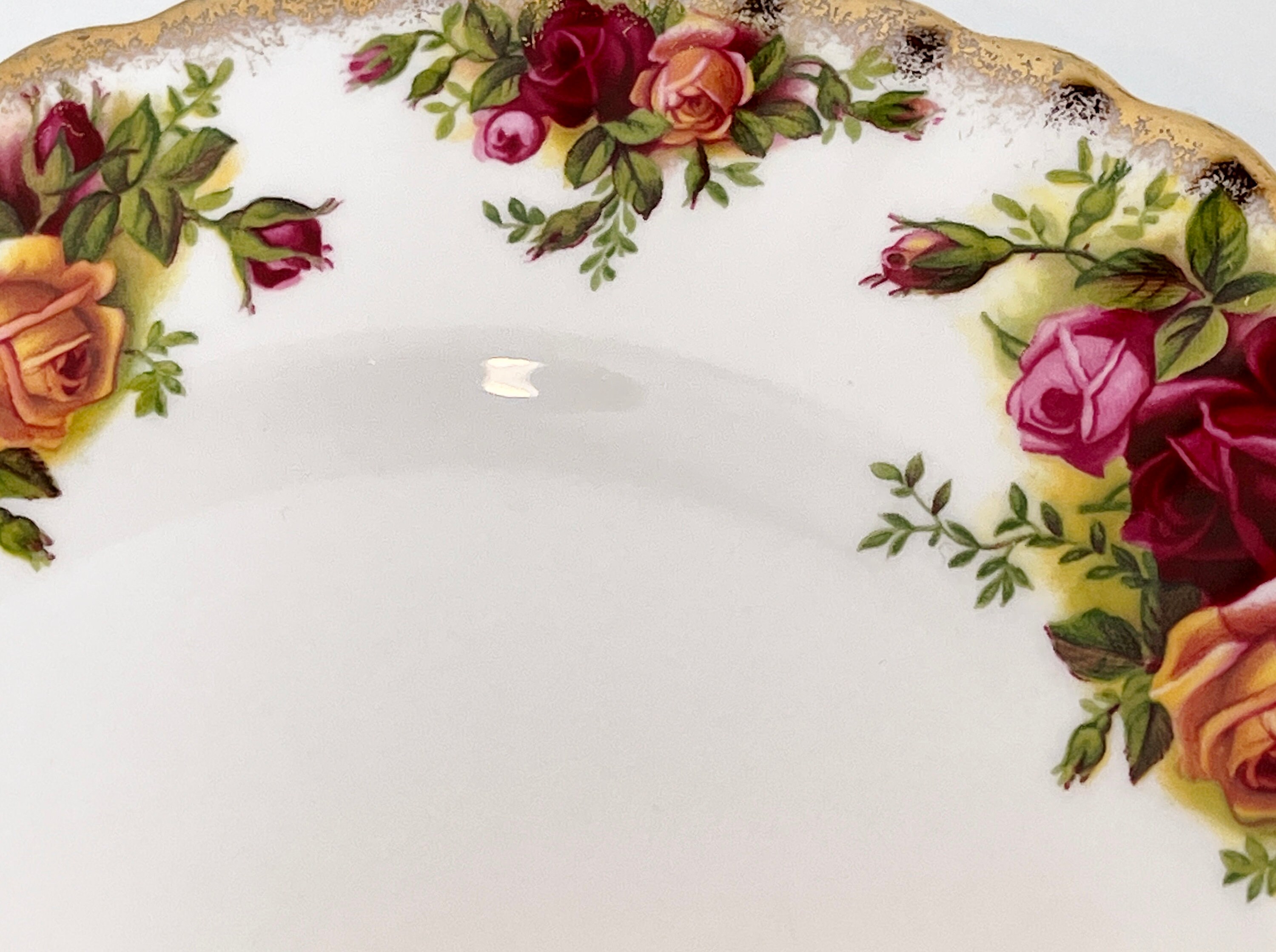 This elegant plate is by Royal Albert Bone China of England. It is called Old Country Roses. It was so very popular that it was reissued again in later years. The backstamp tells us that it was made between 1973 and 1993.