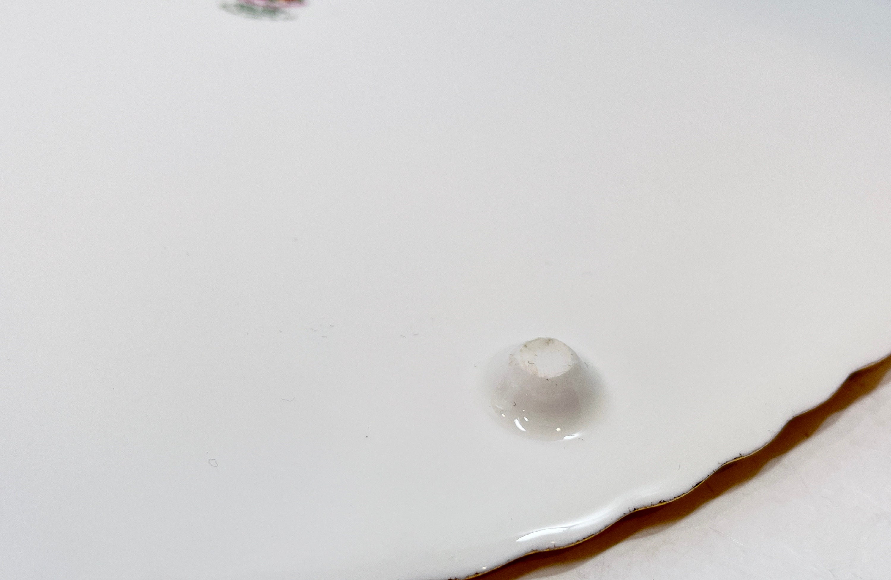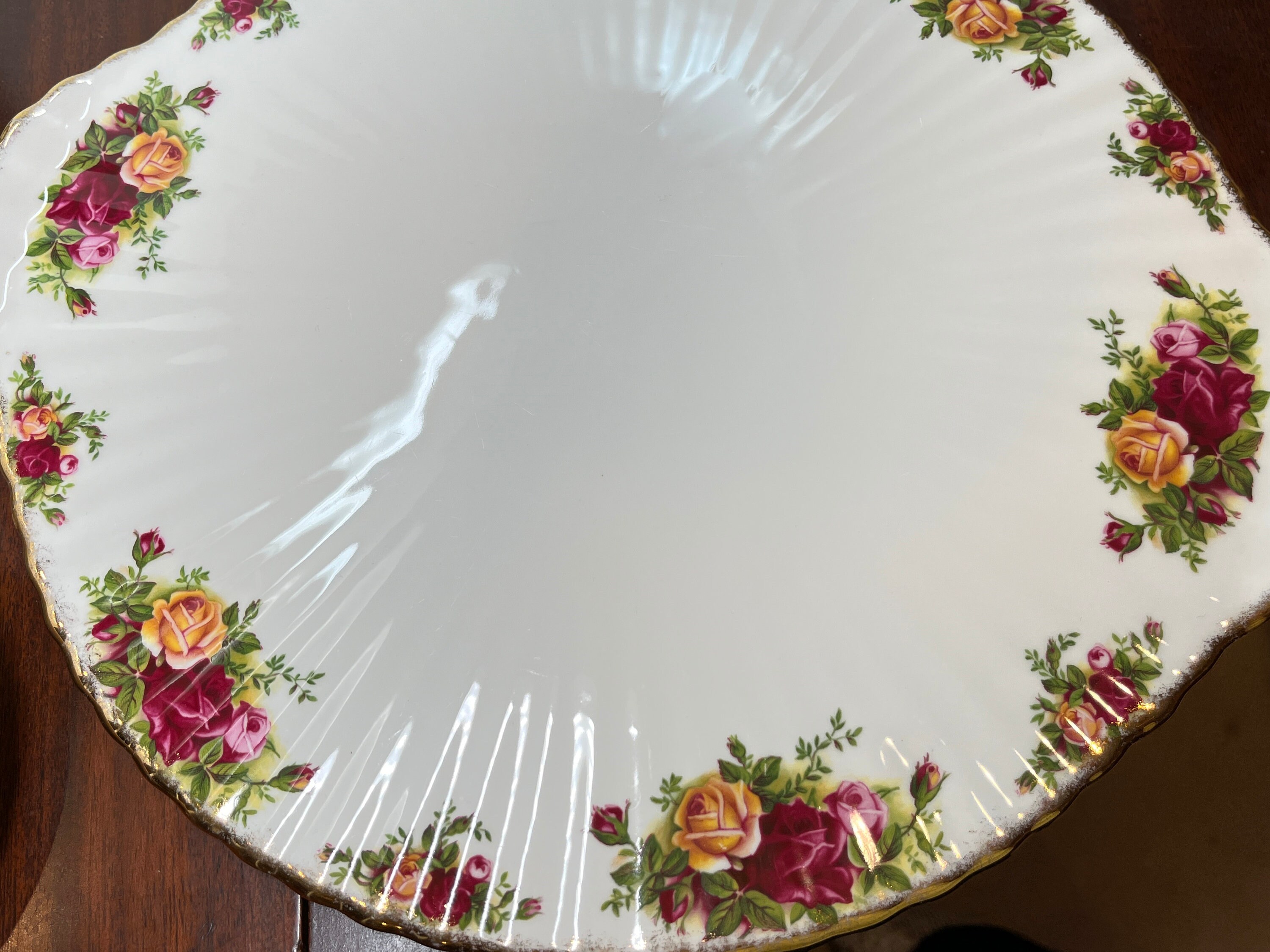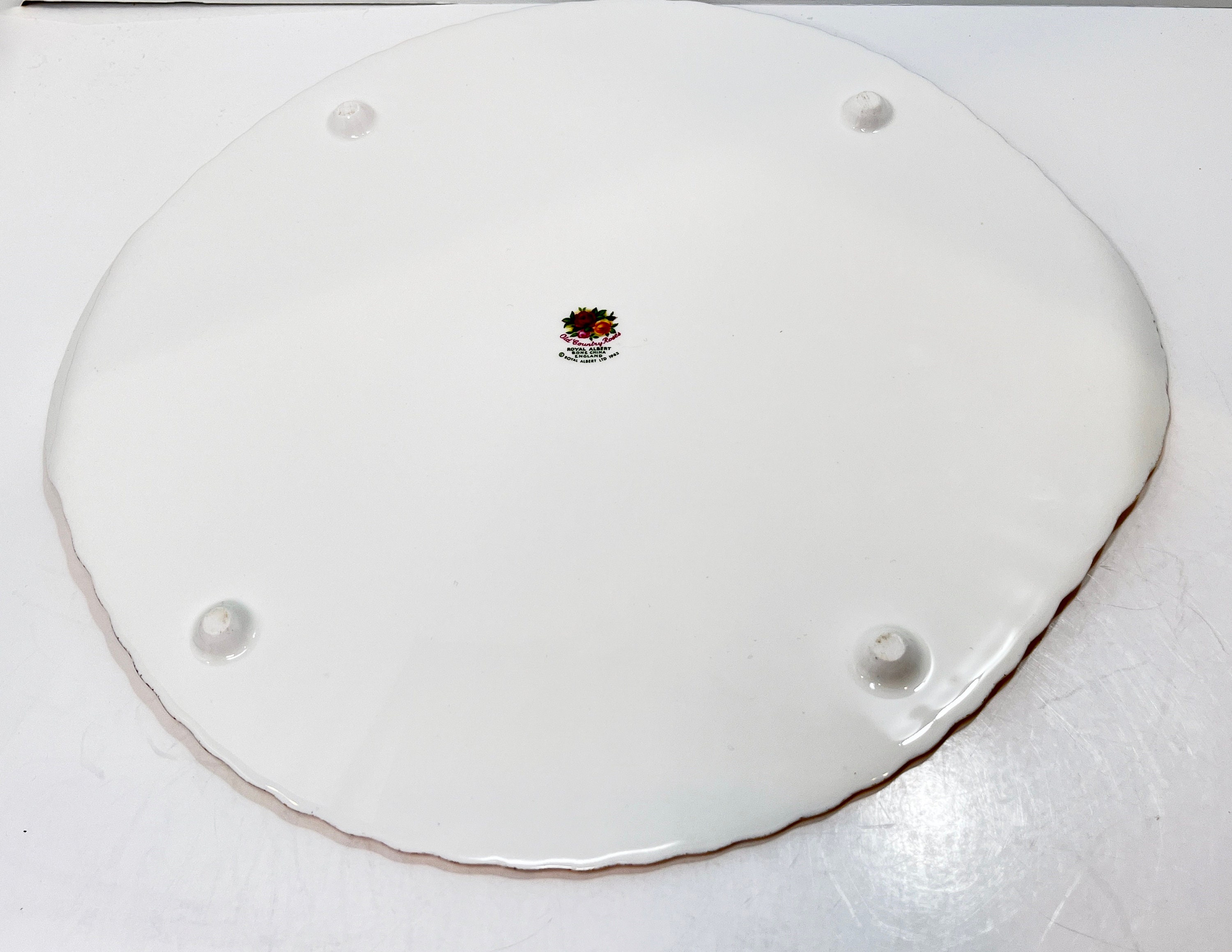 Enjoy serving a beautiful cake upon this classic bone china footed cake plate. There are four little feet and two wing type handles on this.