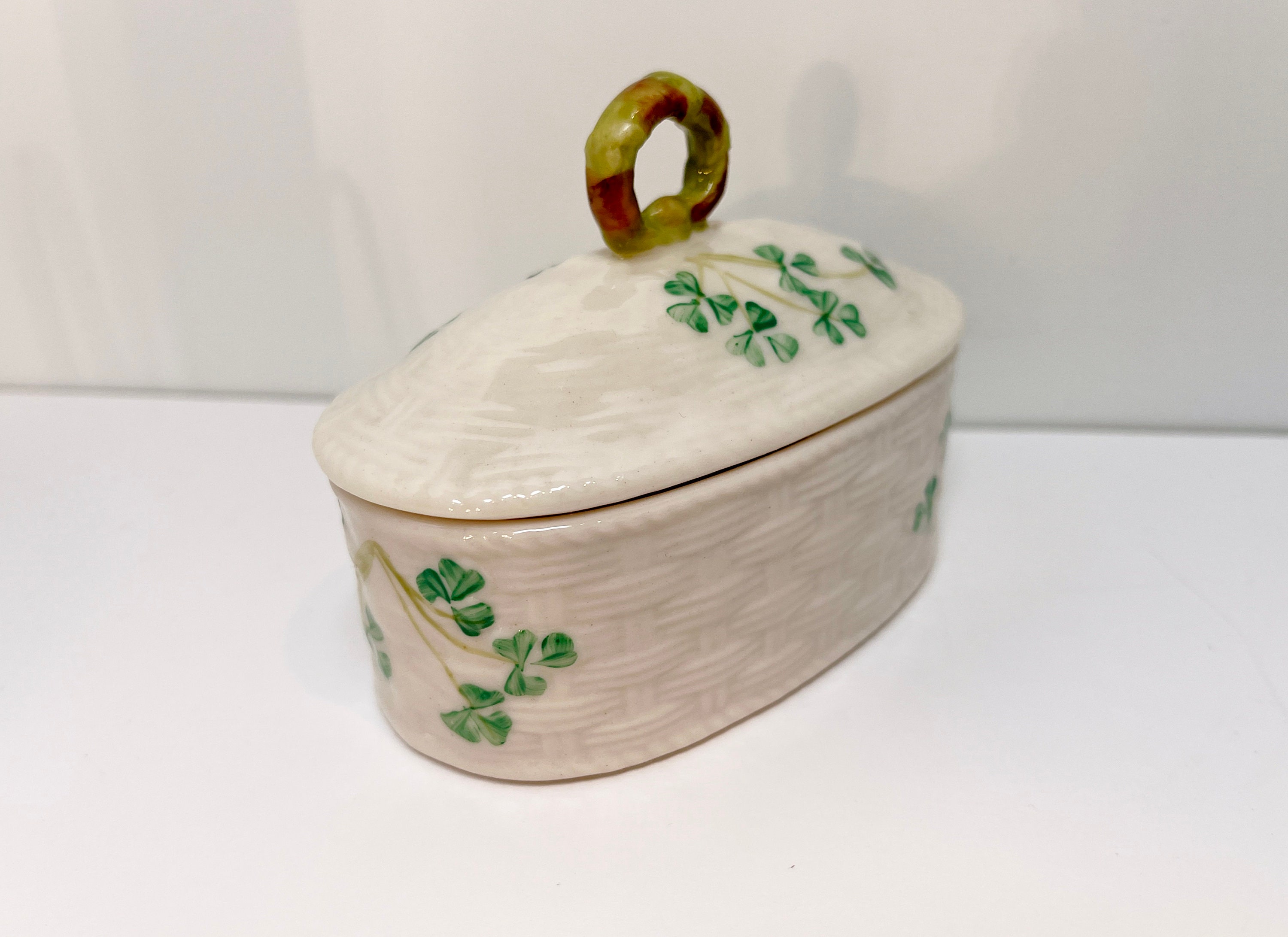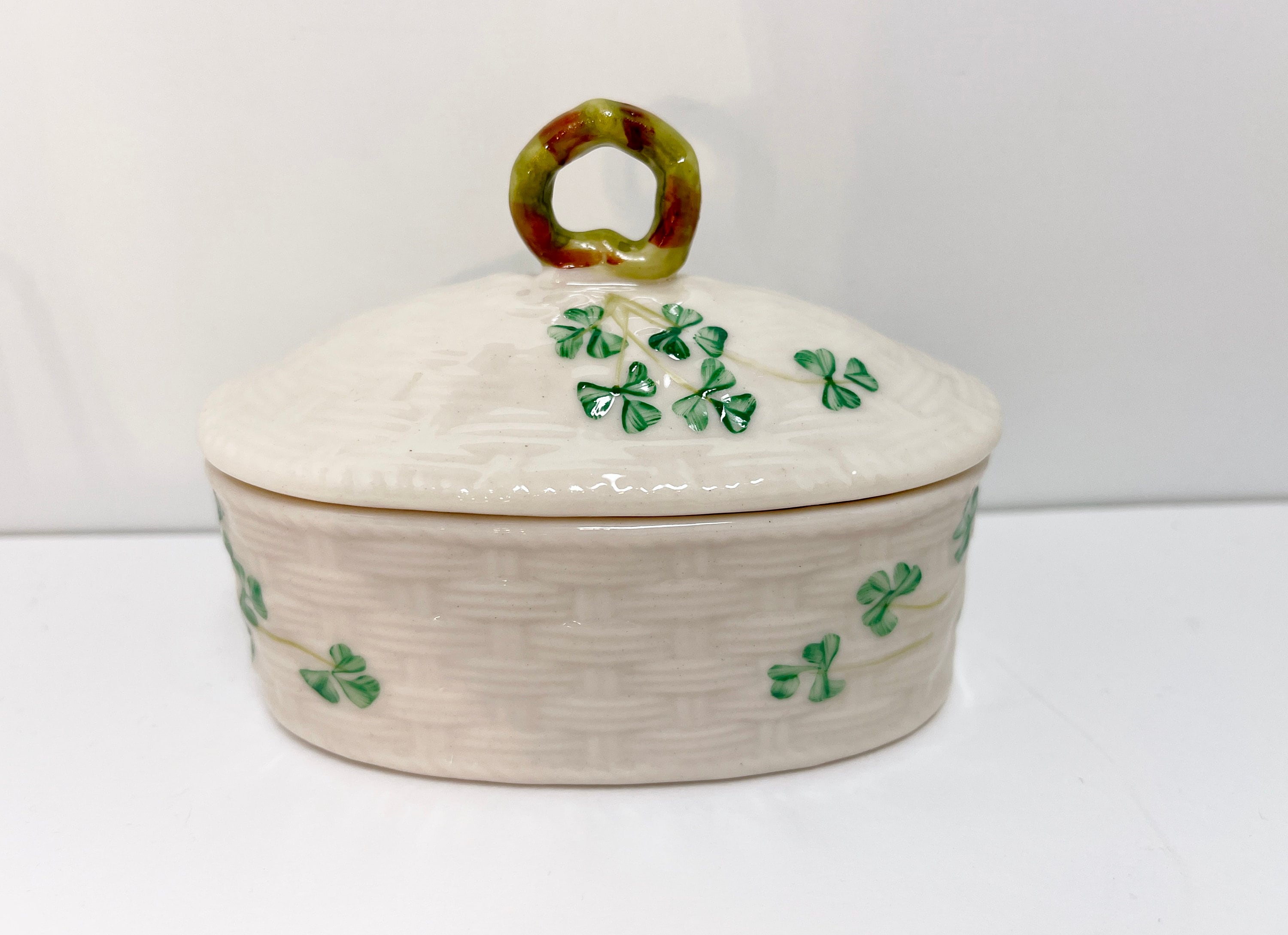 Belleek Covered Trinket Box, Irish Porcelain, Irish China, Irish Bowl, Shamrocks Box, Belleek Box, Belleek Container