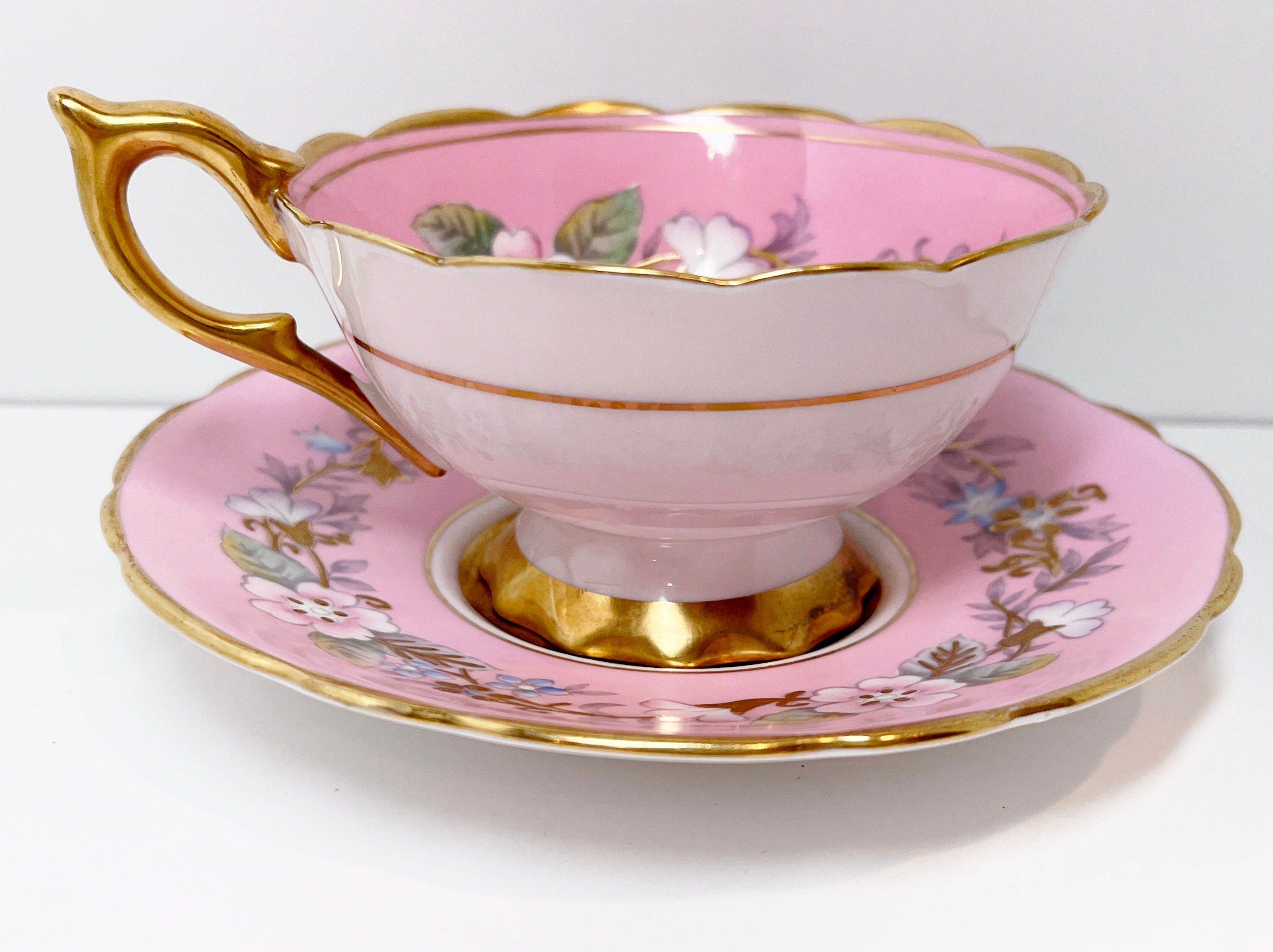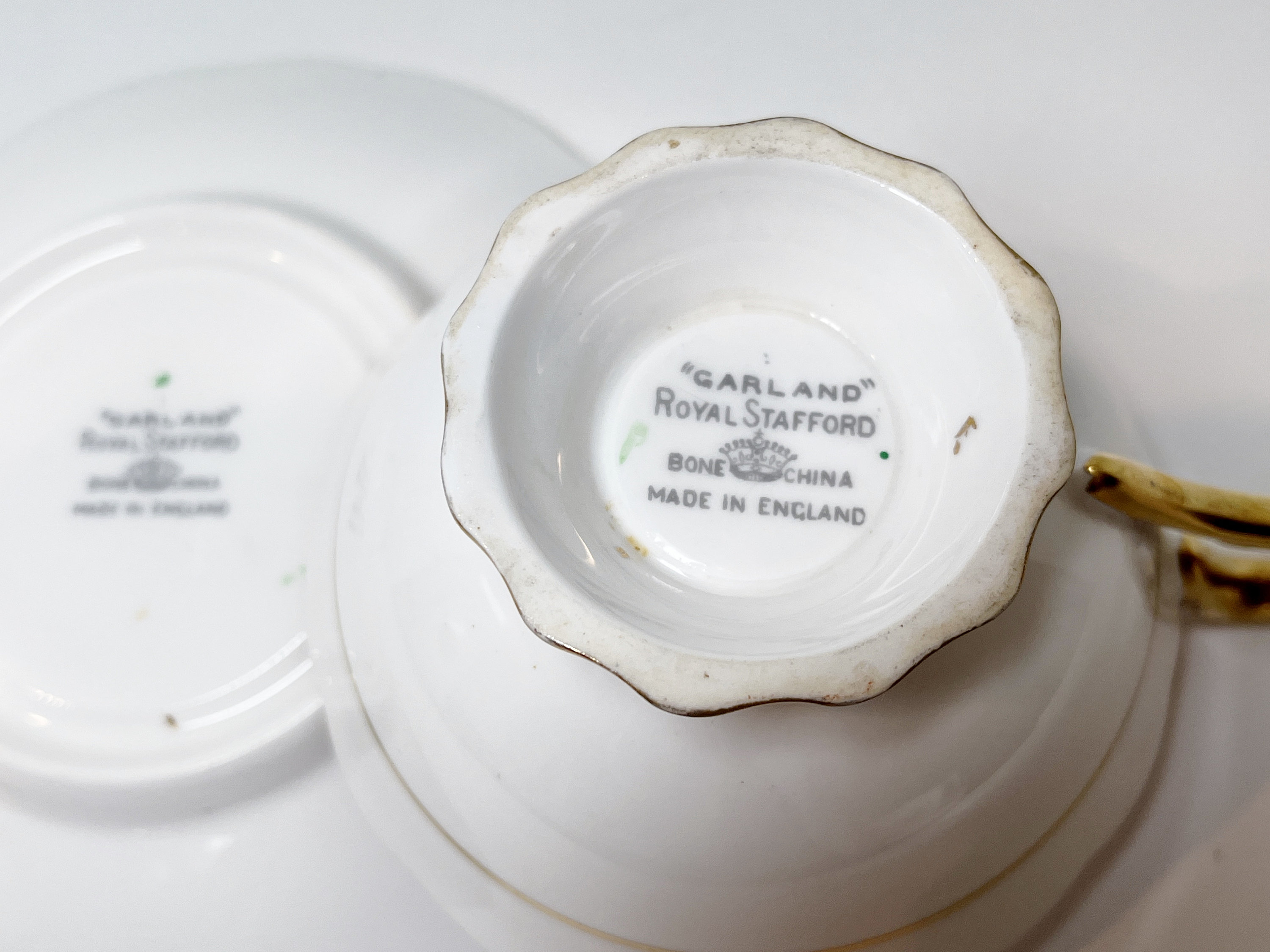 Royal Stafford Bone China of England created this hand painted teacup and saucer in the 1950s. One can feel the gold paint upon the surface. This pattern is highly sought after and is called Garland.