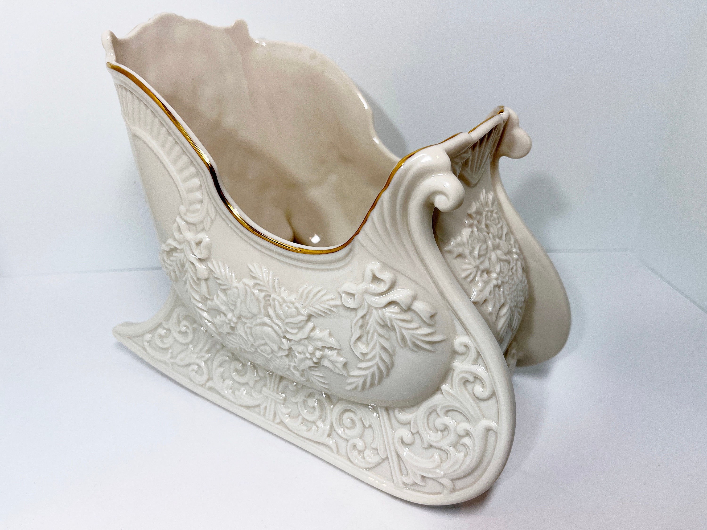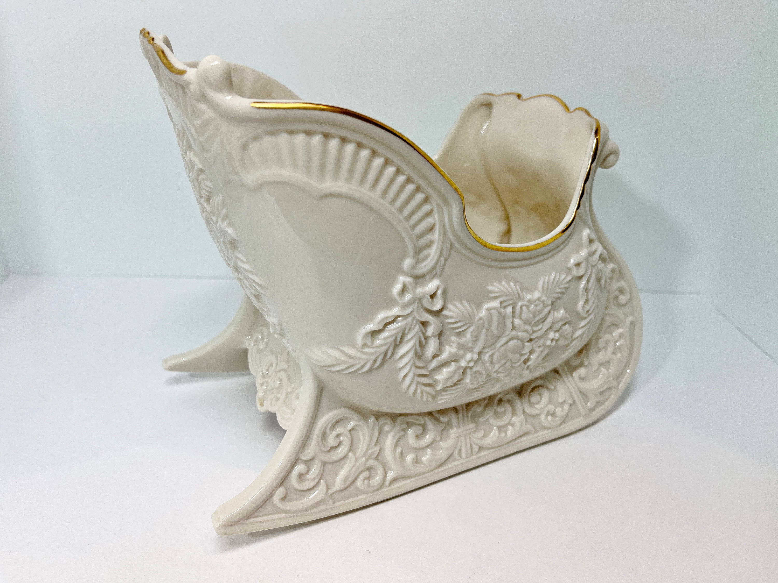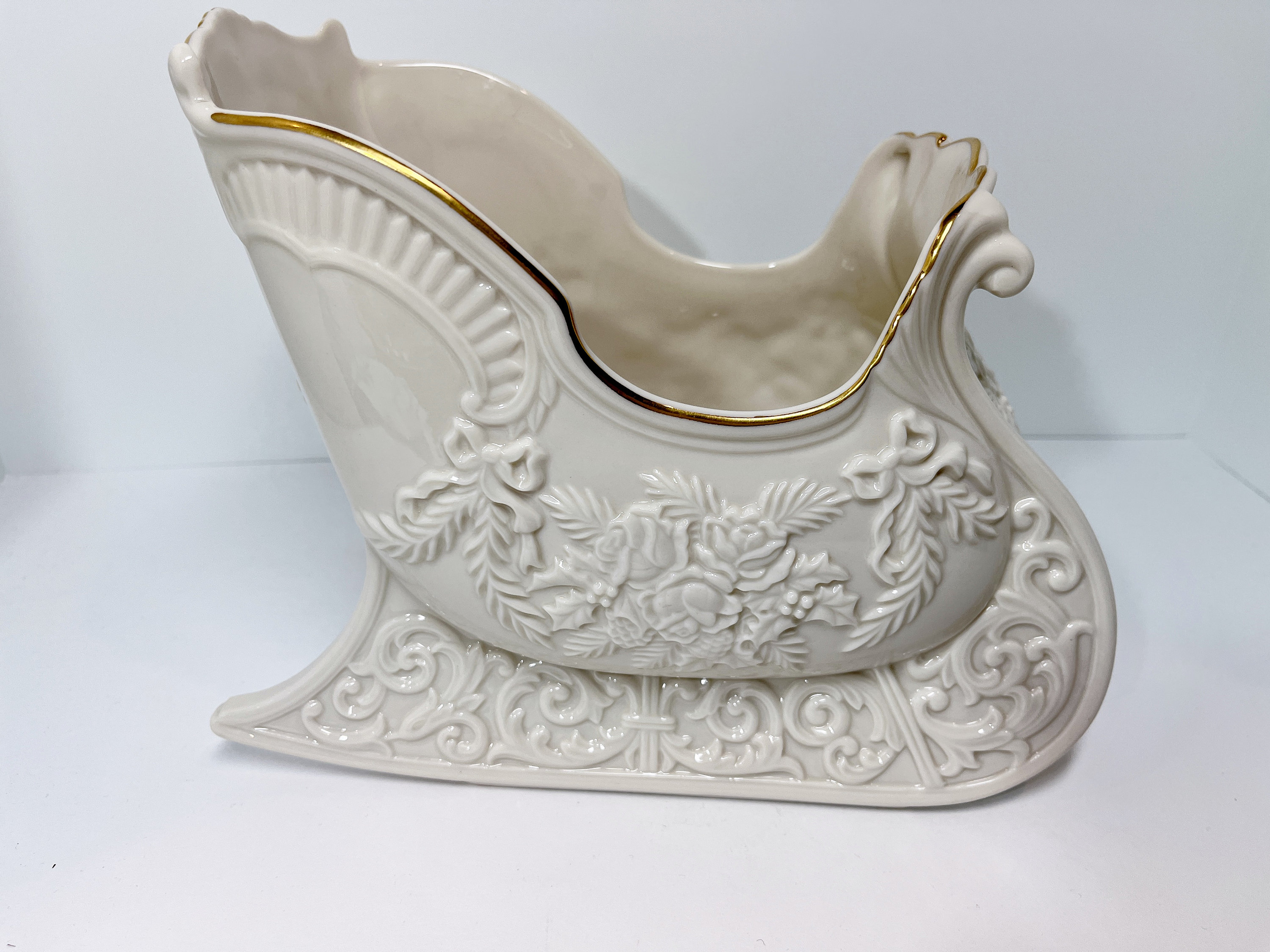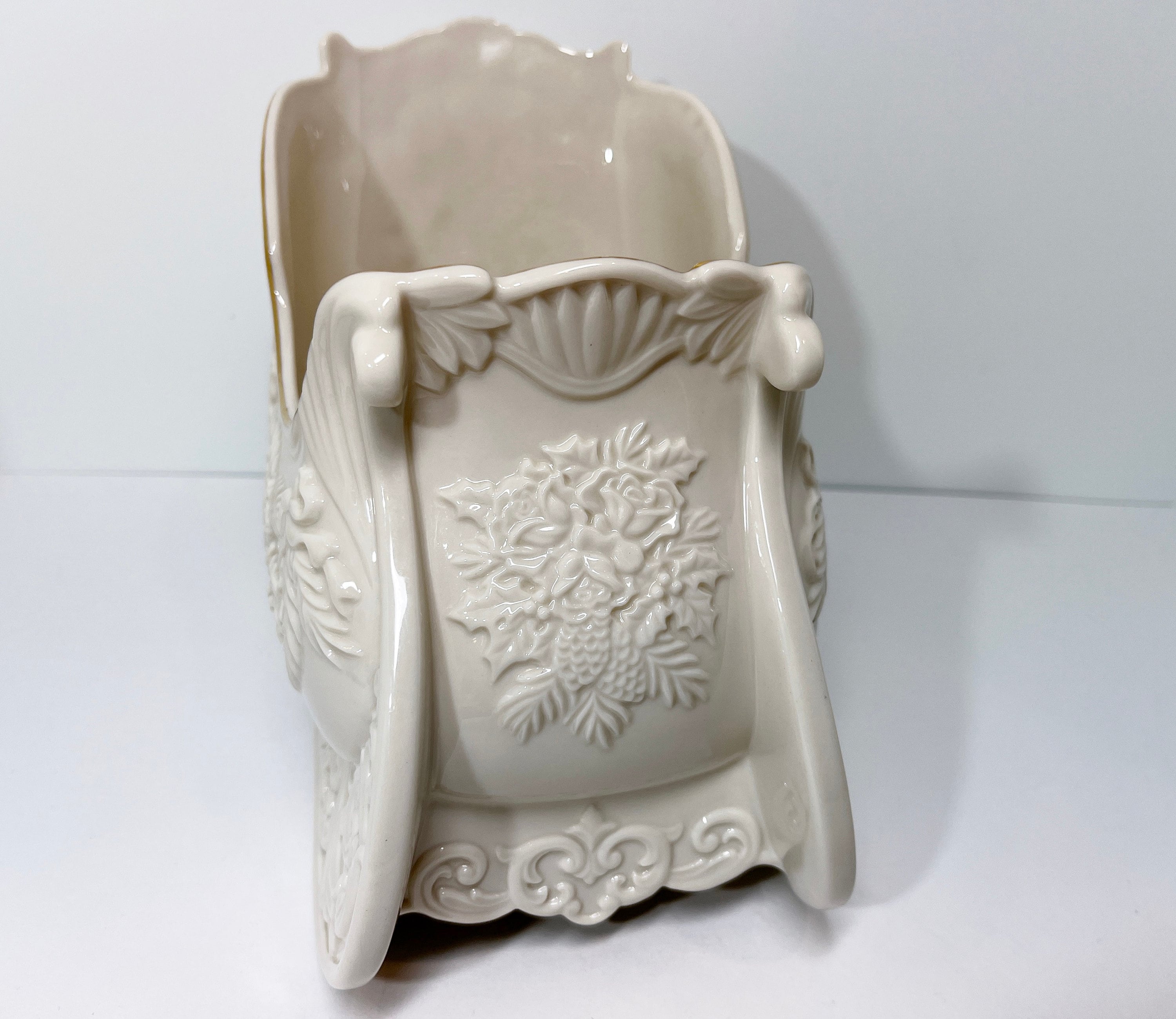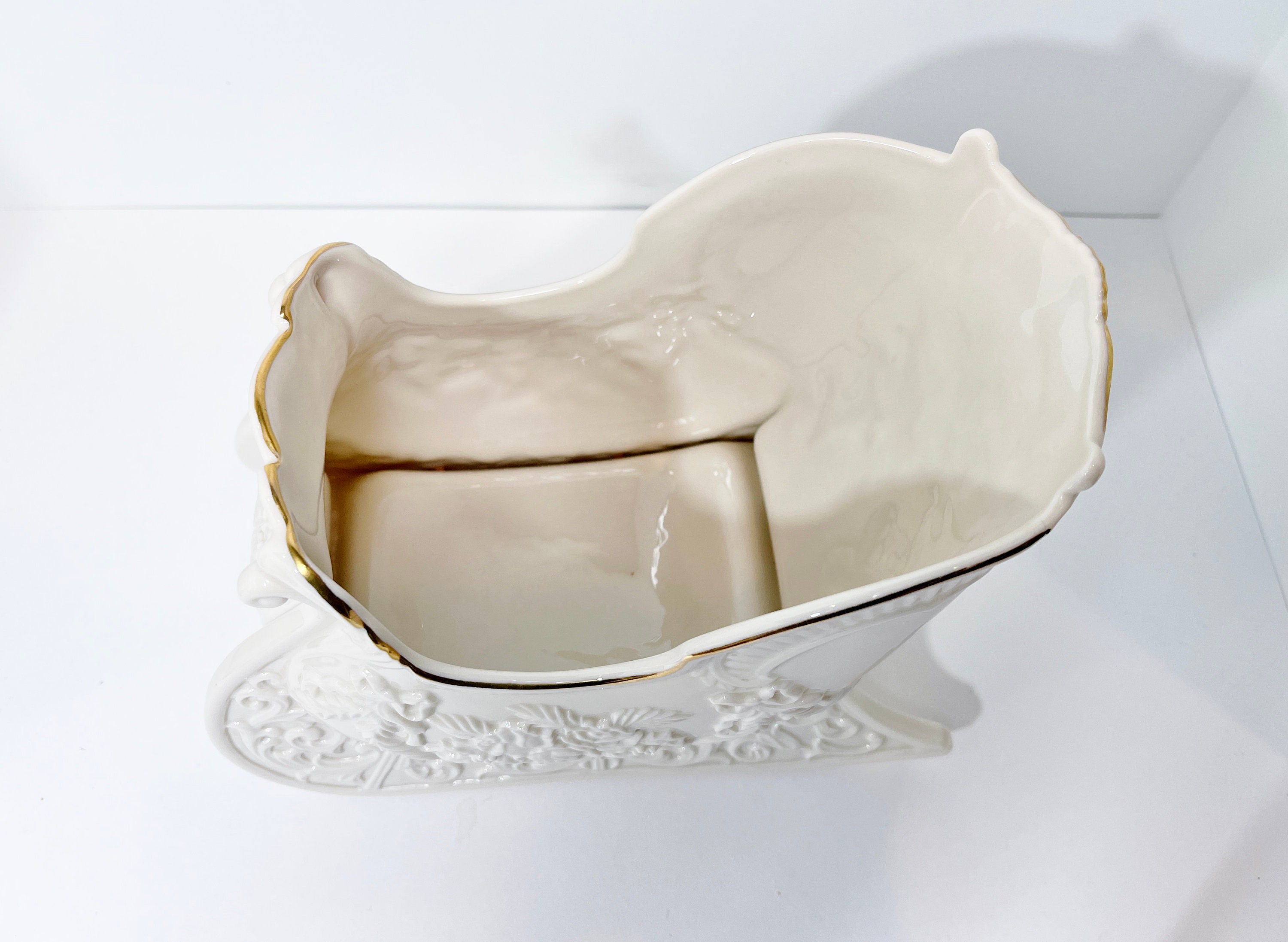 This is a beautiful shapely sleigh made of quality materials. The light dances on the creamy porcelain while the crafted boughs, bows and ribbons add fascination.