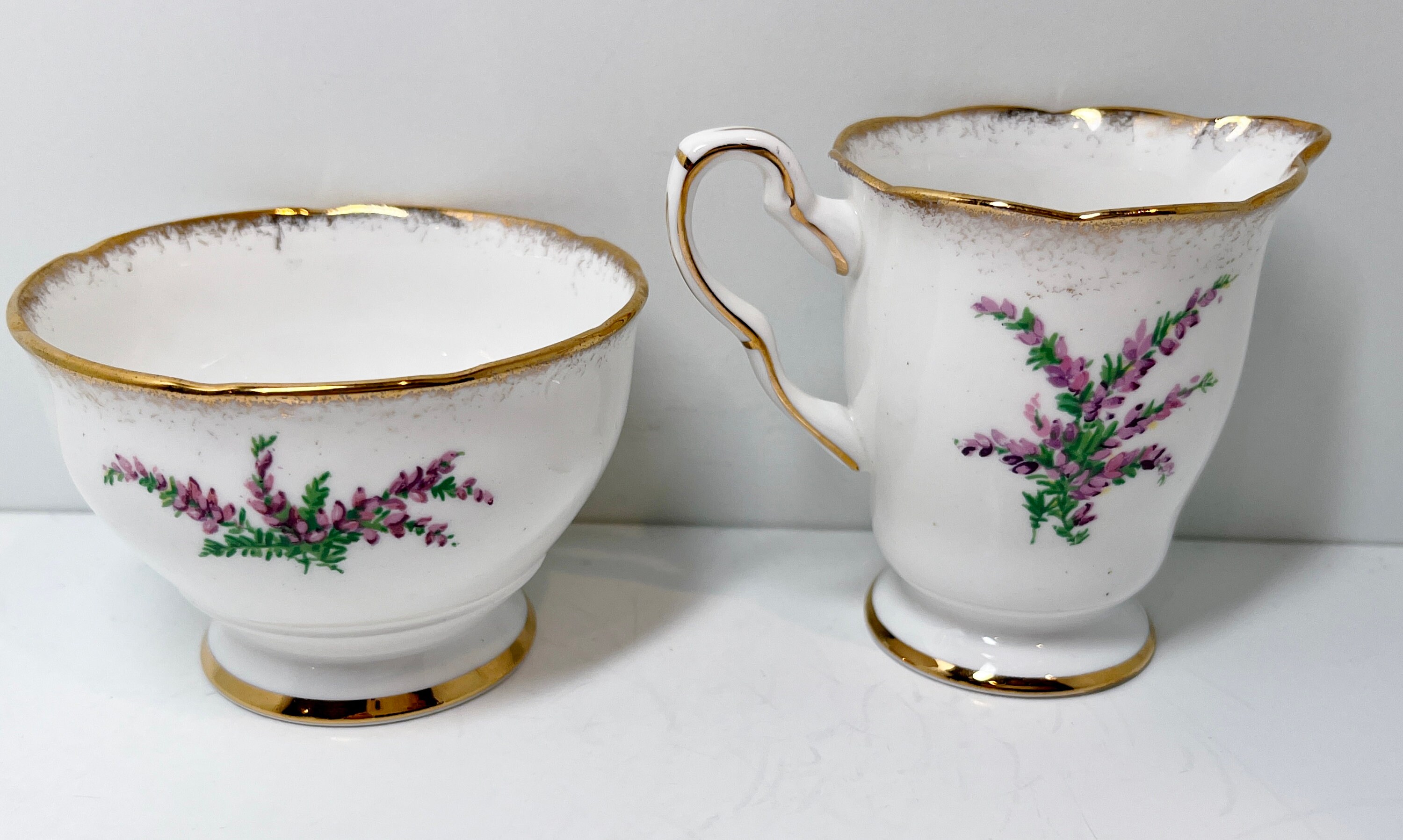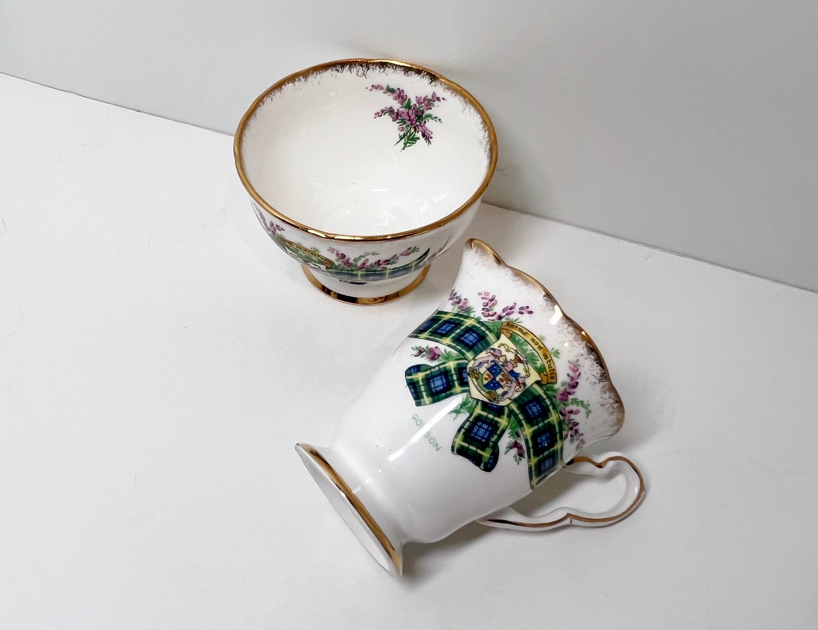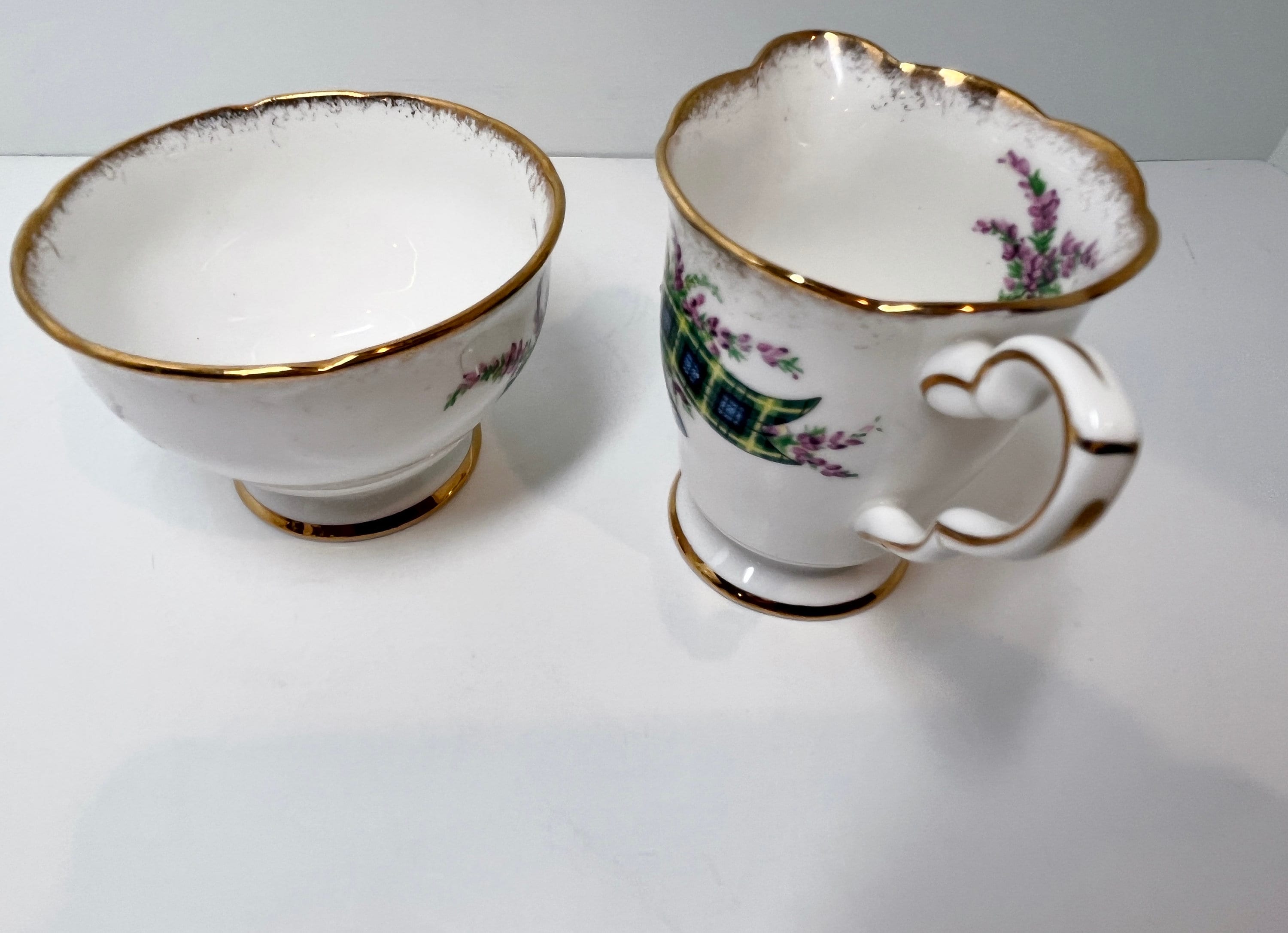 The powerful Clan Gordon tartan is displayed upon this noteworthy Scottish creamer and sugar bowl.