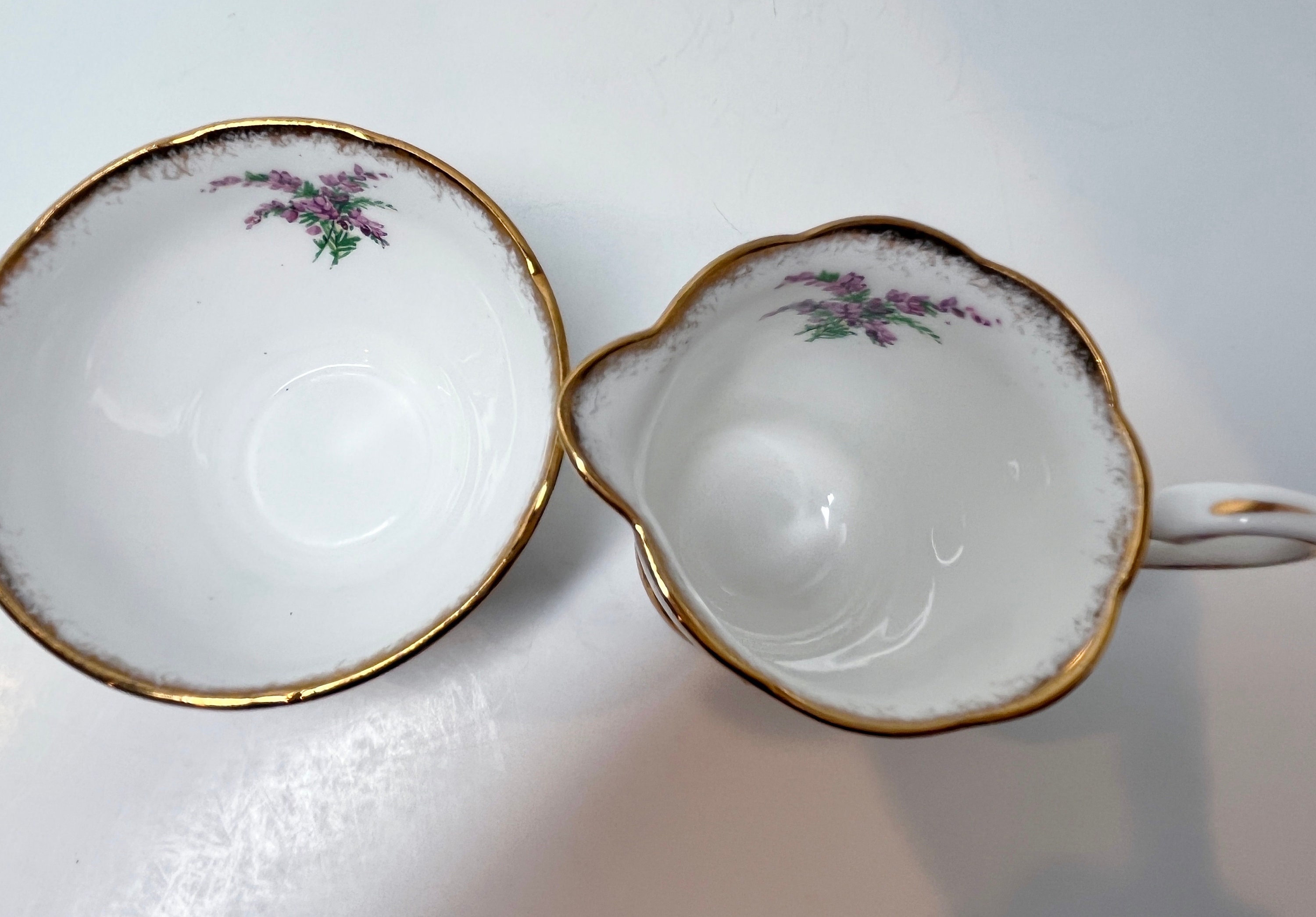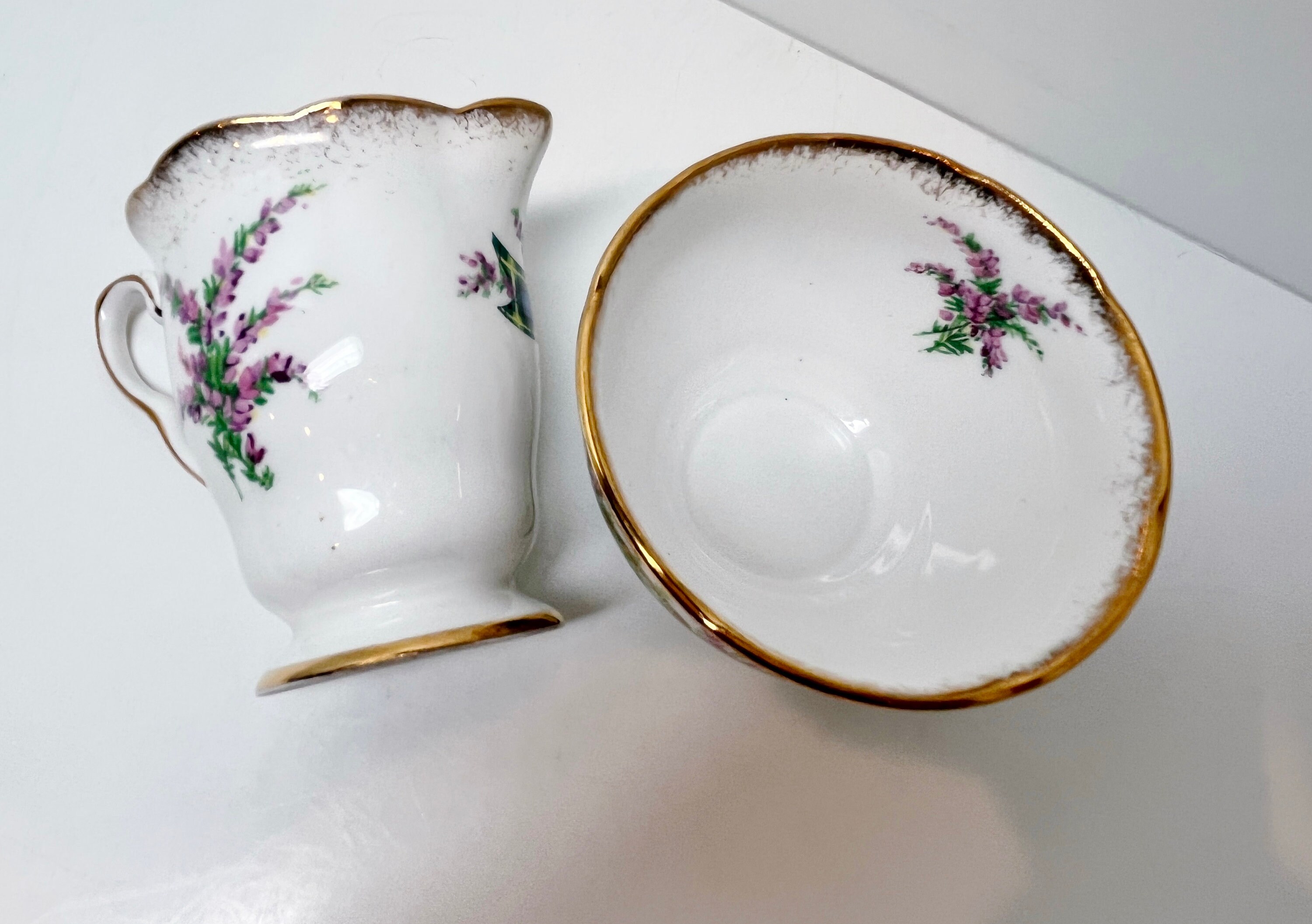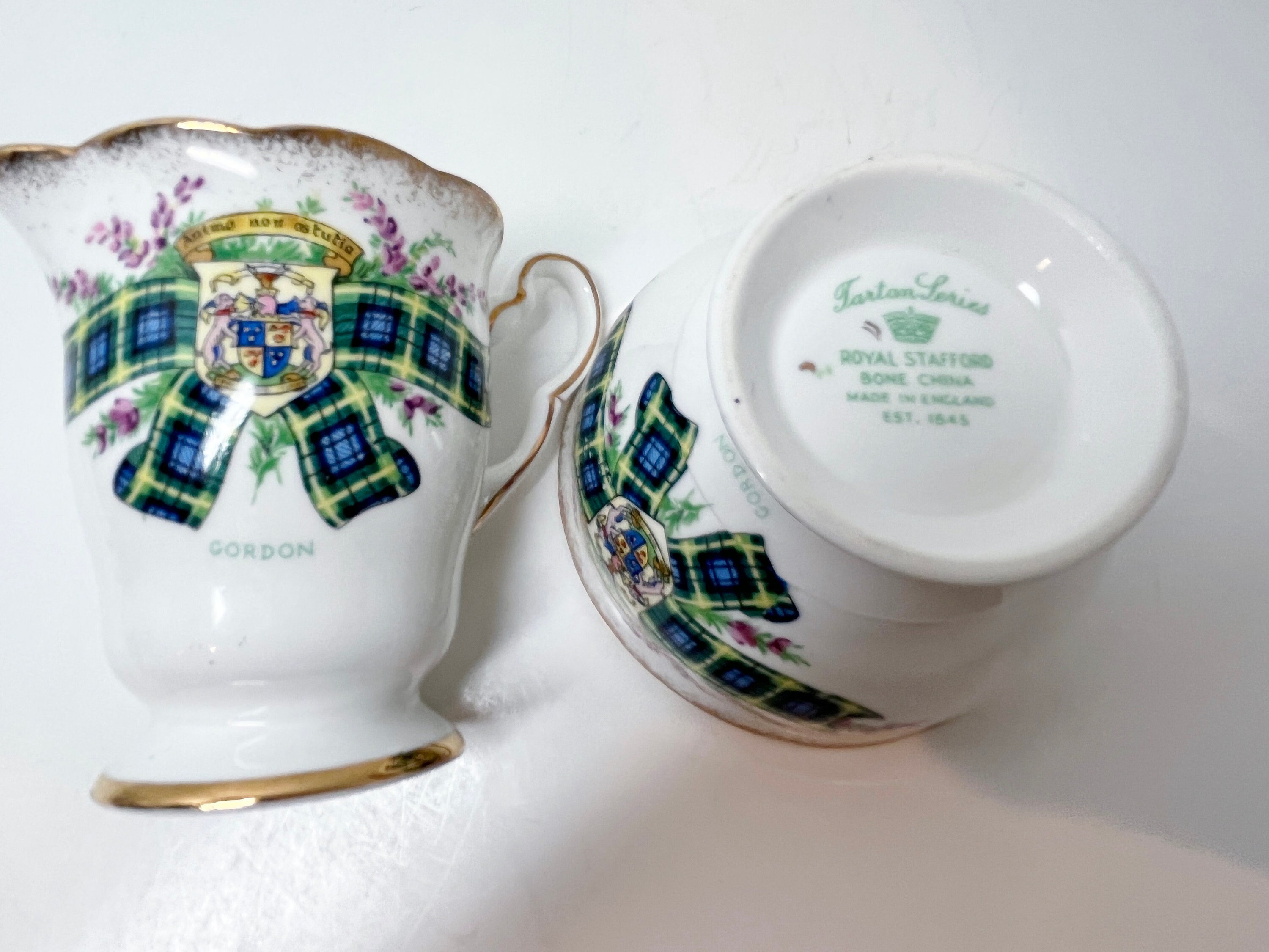 Royal Stafford Bone China of England created this crested creamer and saucer and using the Gordon Tartan. It is partially hand painted and hand trimmed in gold gilt on the edges.