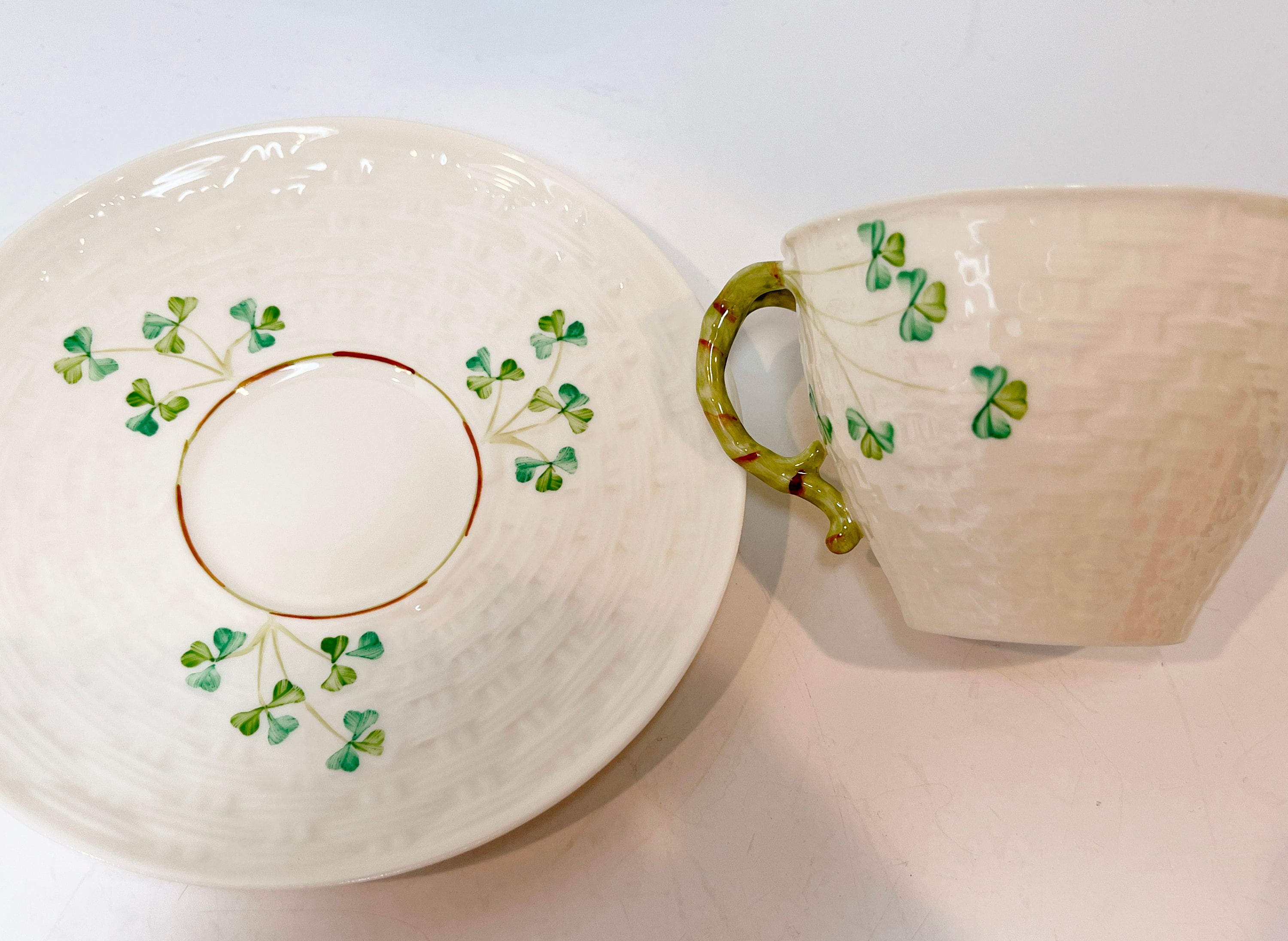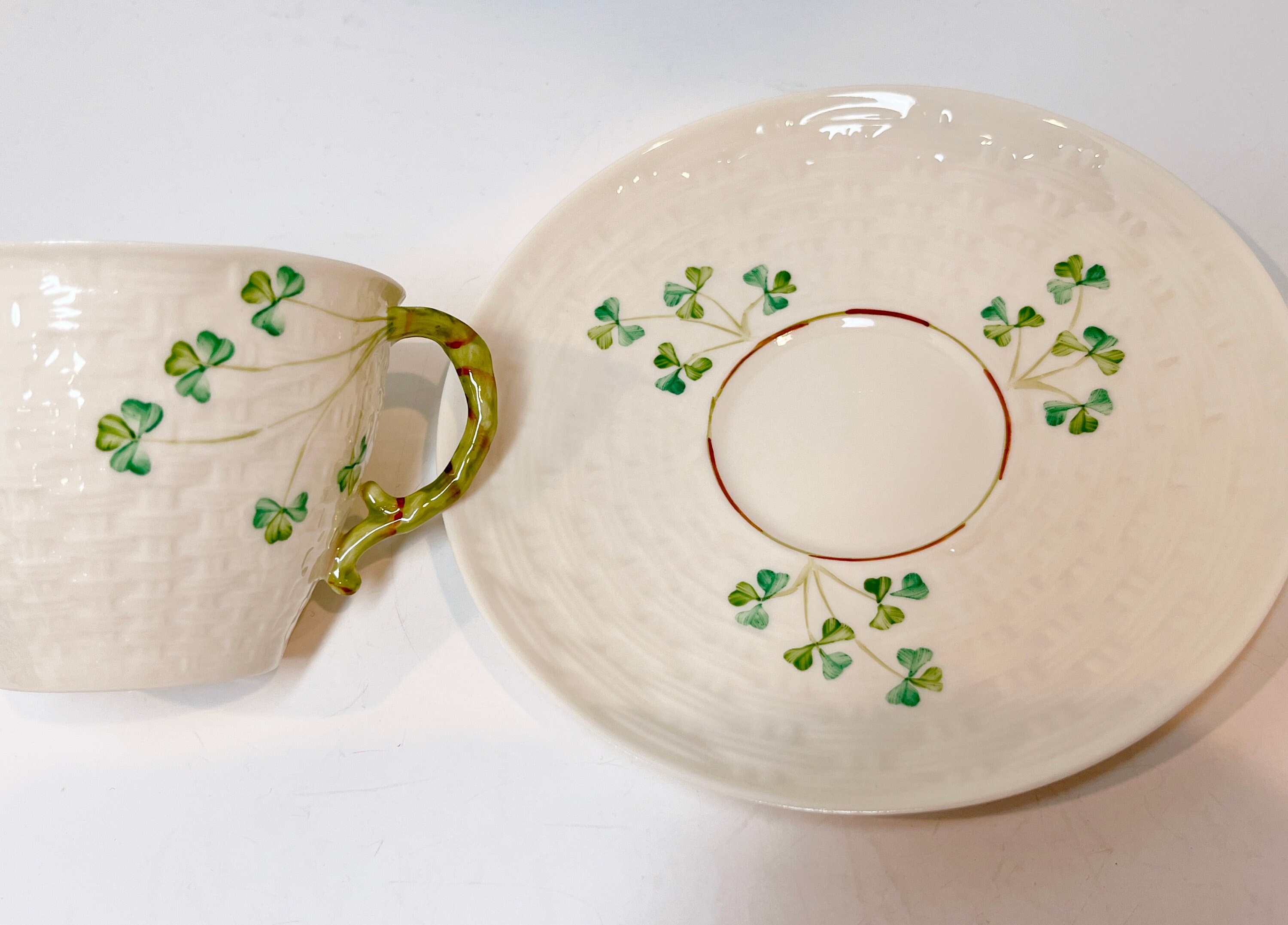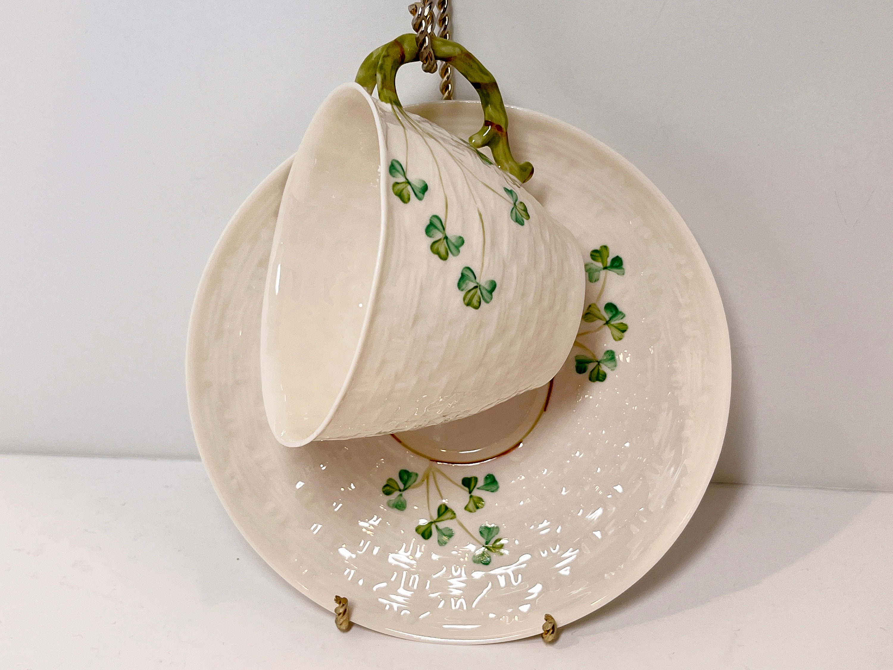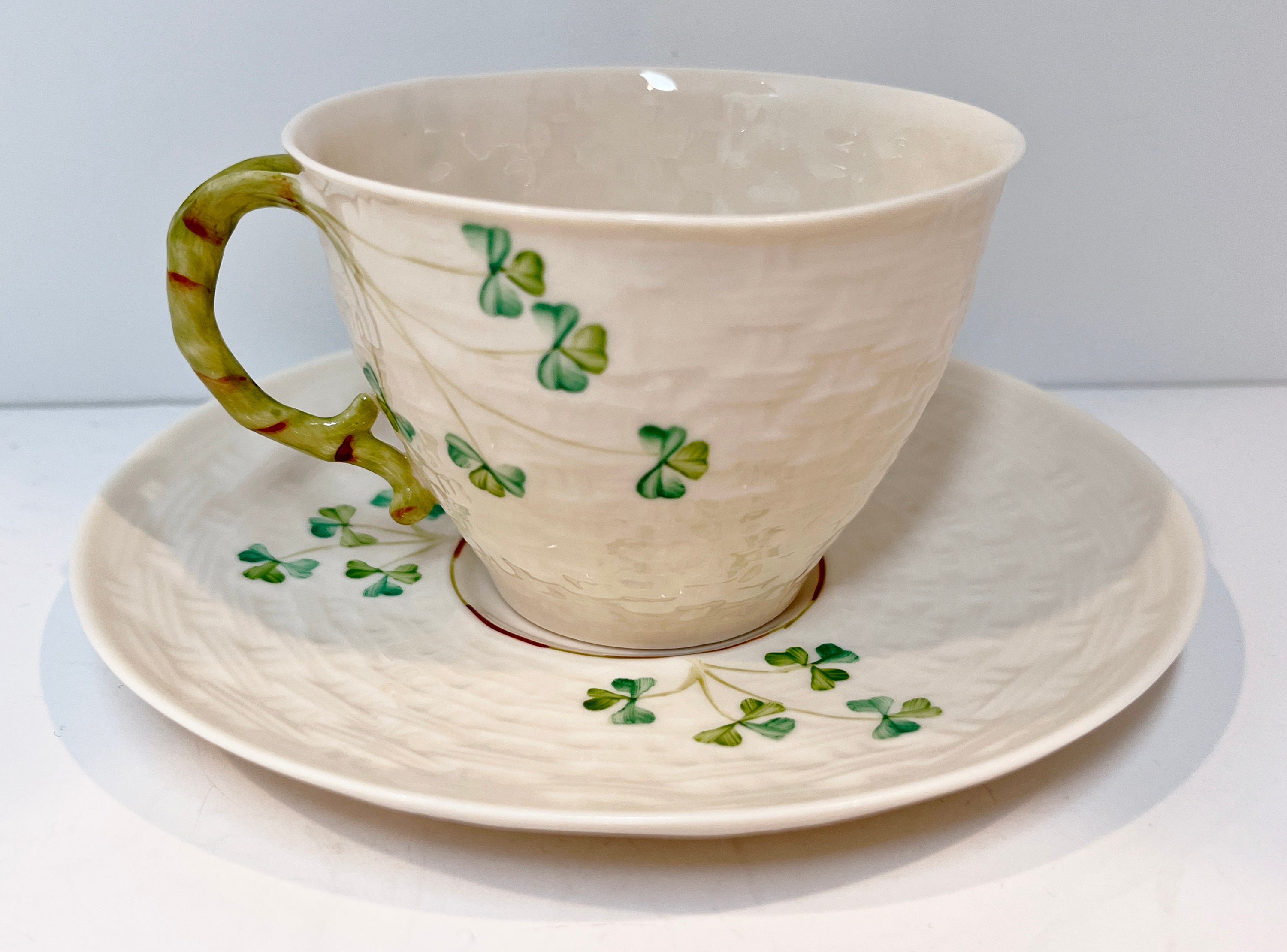 Hand painted Irish shamrocks drape beautifully across the basket weave Belleek tea cup and saucer. The inside is the same rich cream.