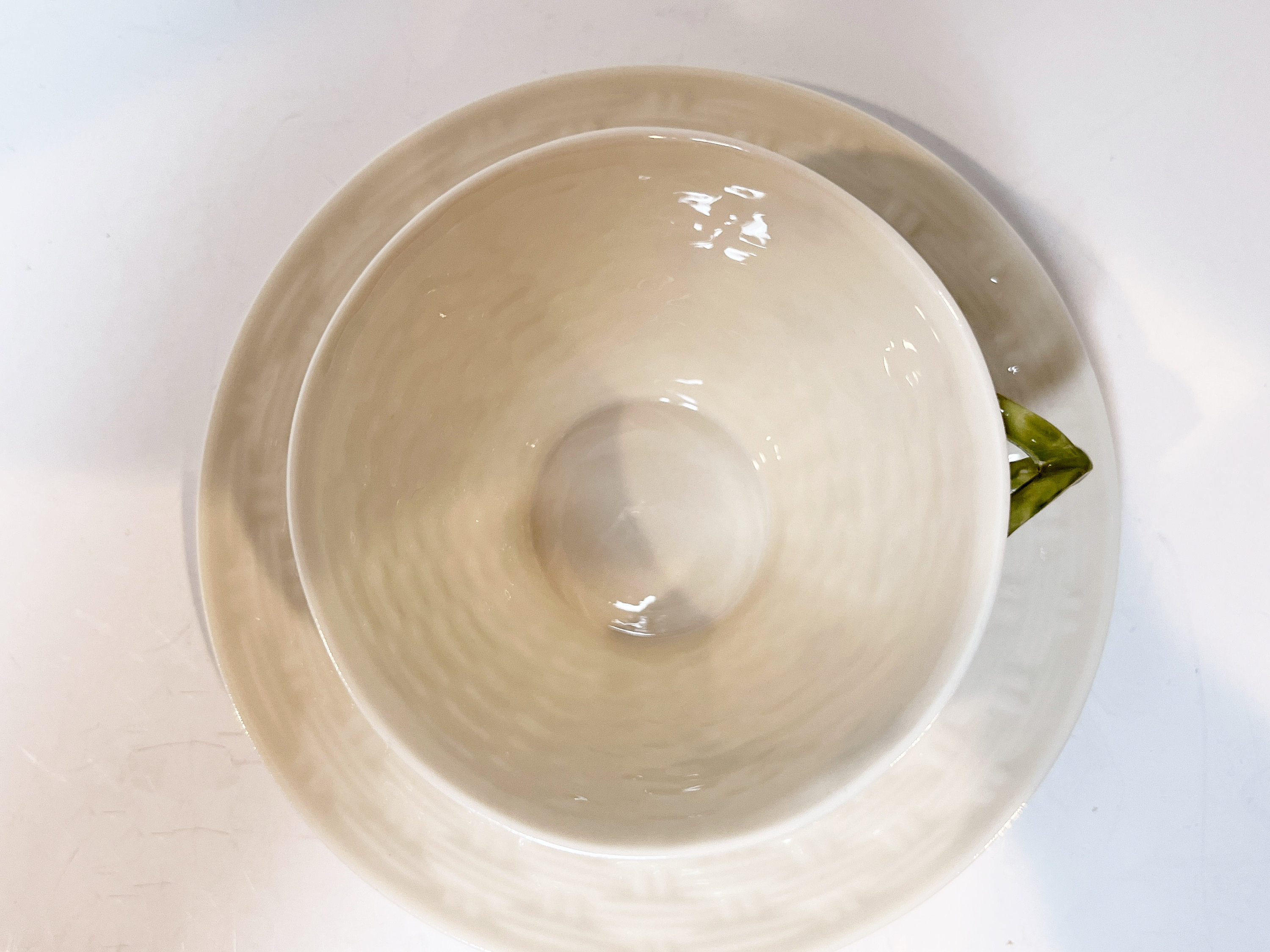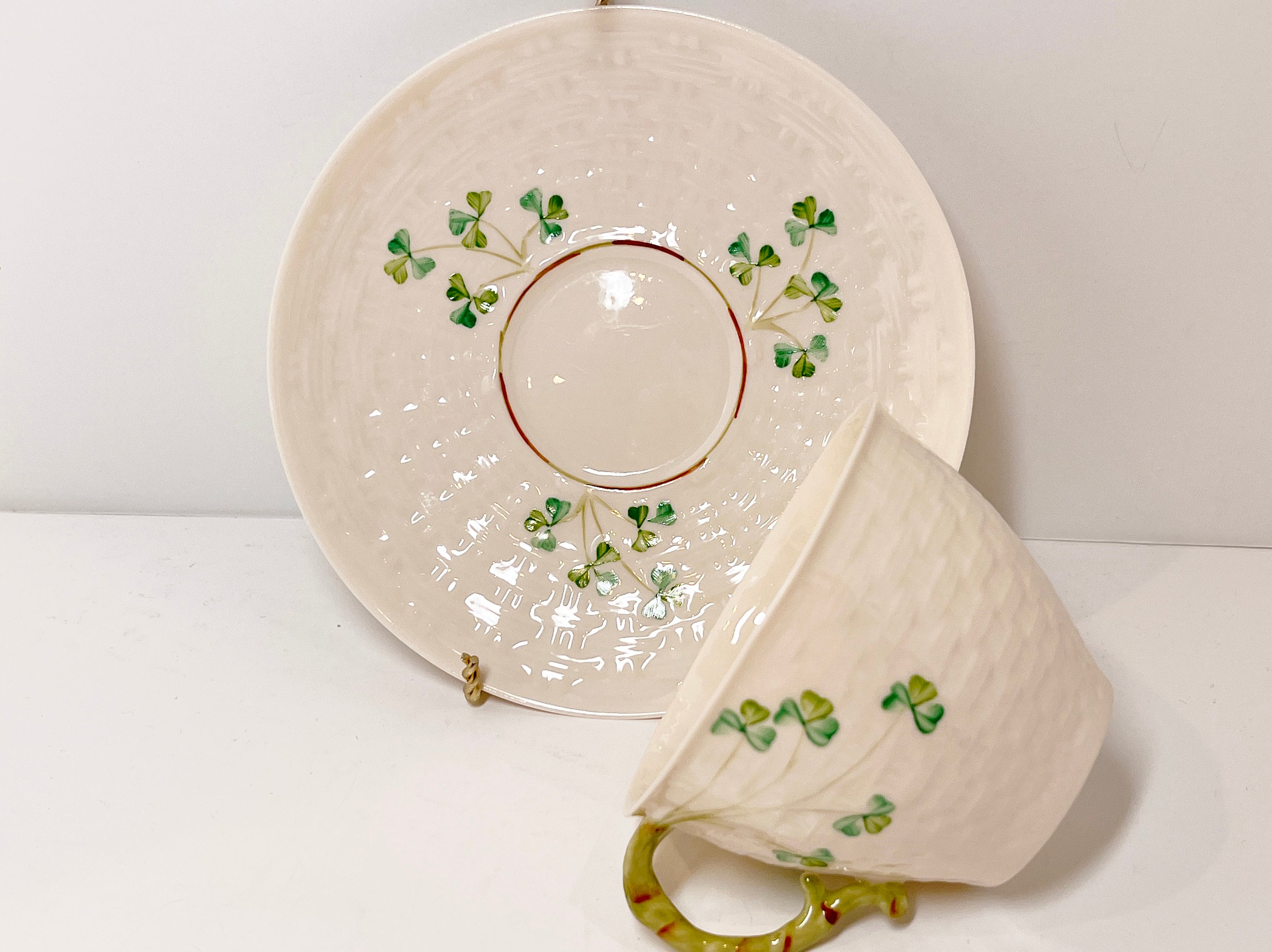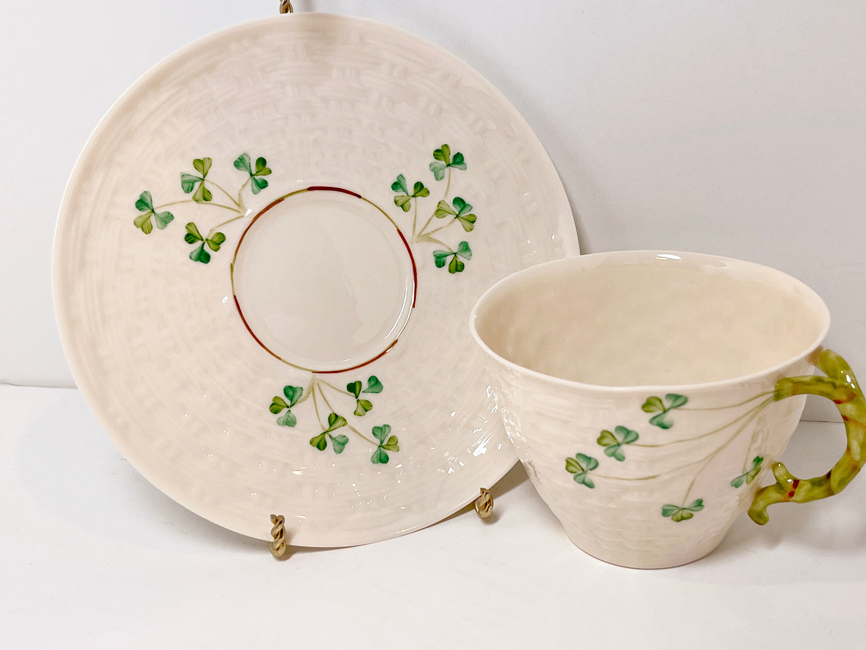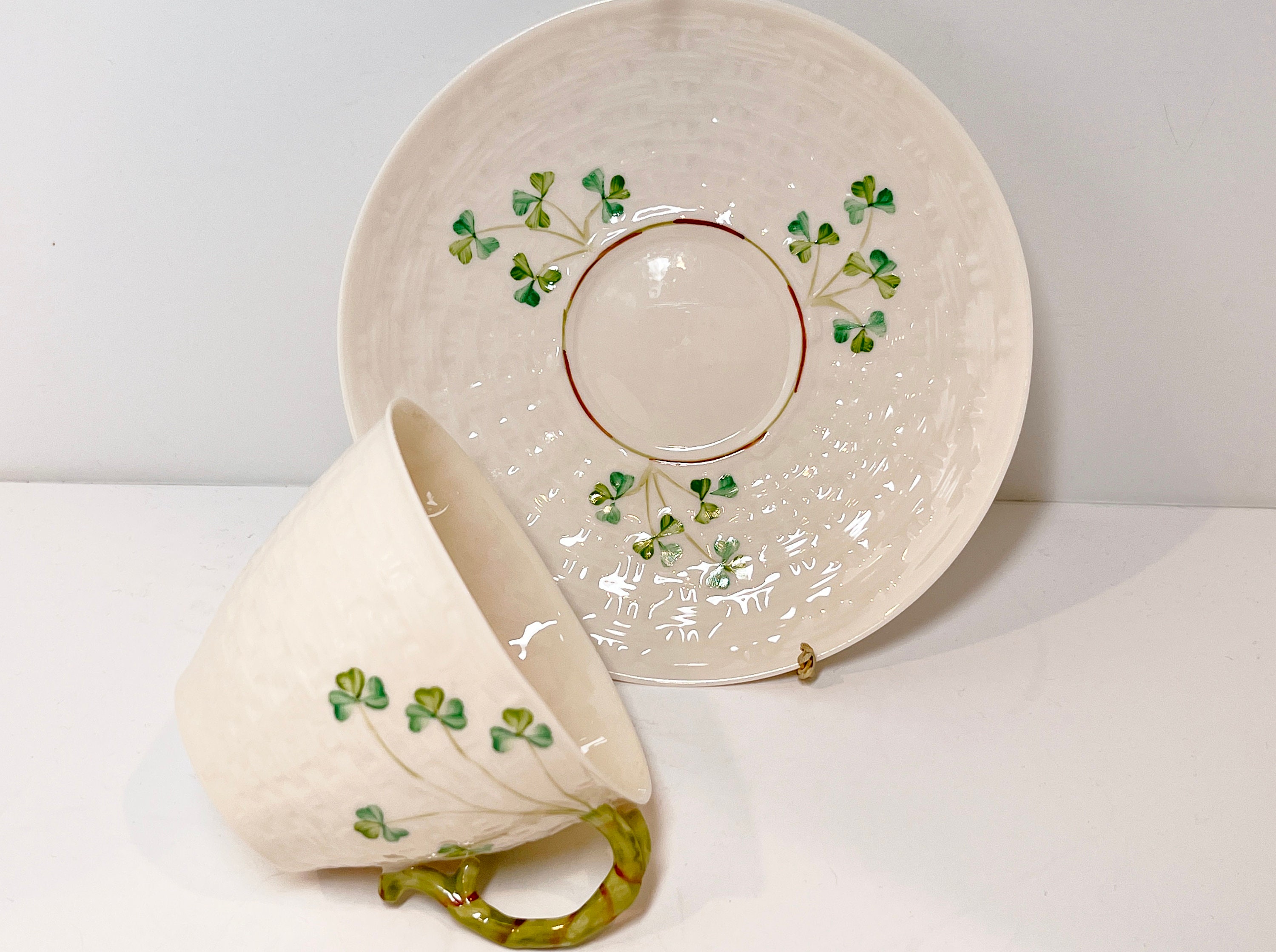 Hand painted Irish shamrocks drape beautifully across the basket weave Belleek tea cup and saucer. The inside is the same rich cream.