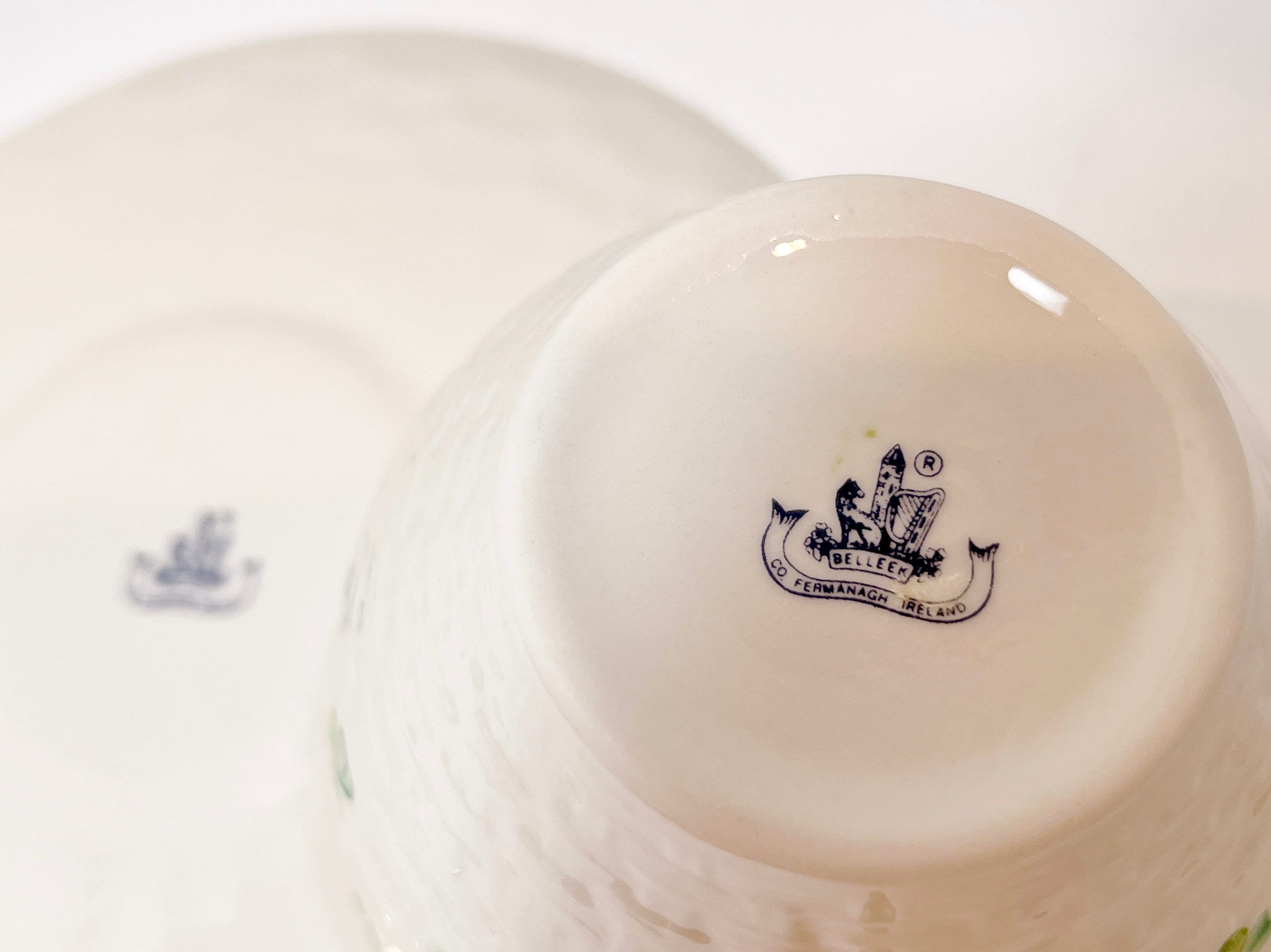 All the Belleek marks contain the Irish wolfhound, the Devenish Round Tower, the Irish harp and the touch of Irish shamrocks on each end. This lovely Parian ware is known for its translucency and quality. This teacup and saucer proudly wears the eighth blue mark for the years between 1993 to 1997.