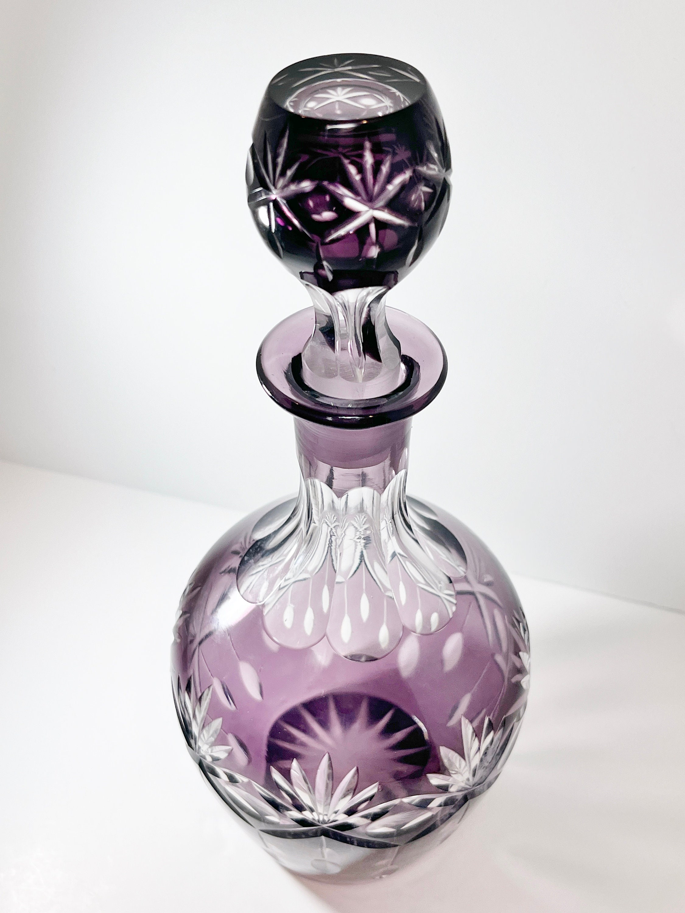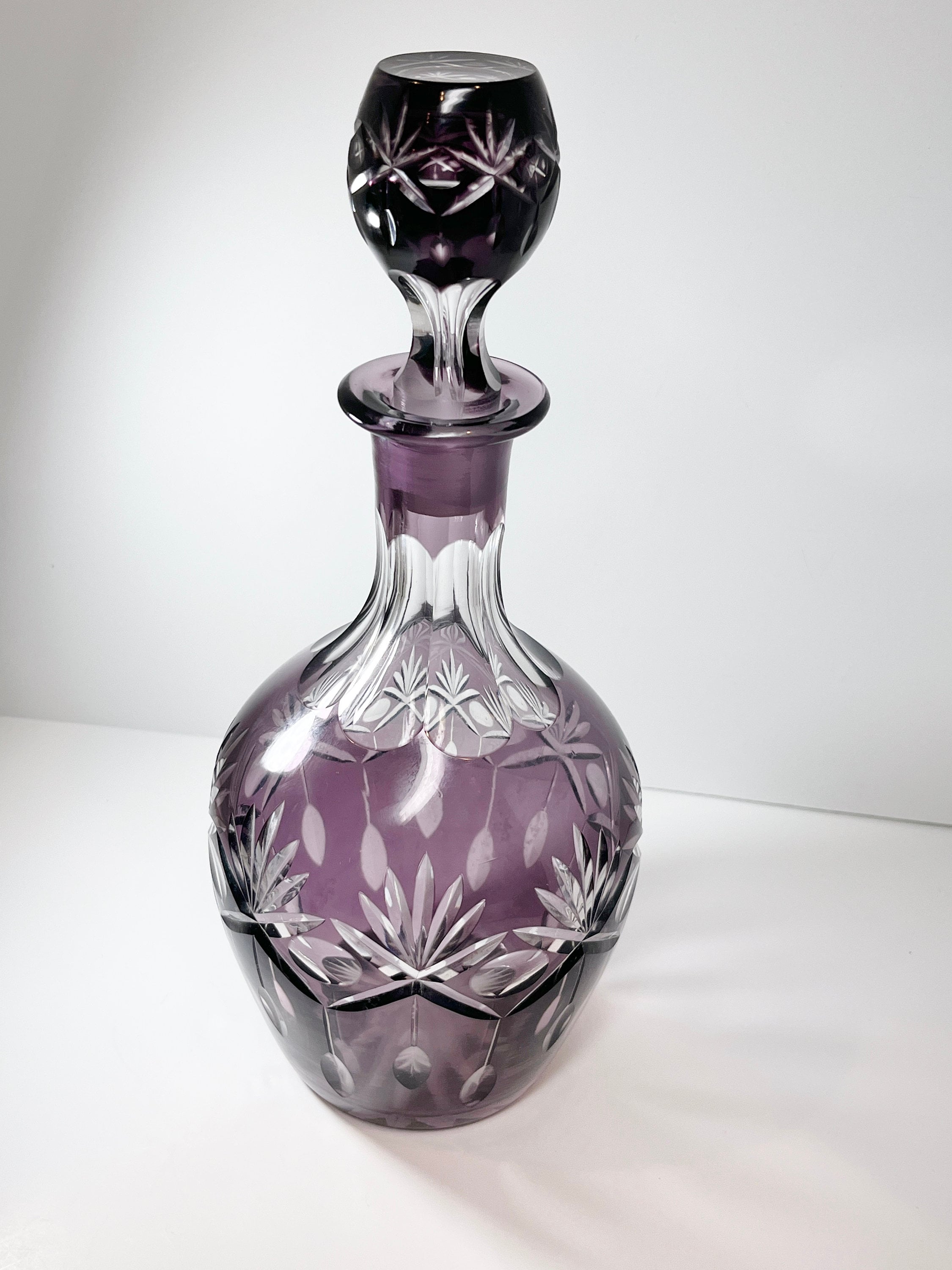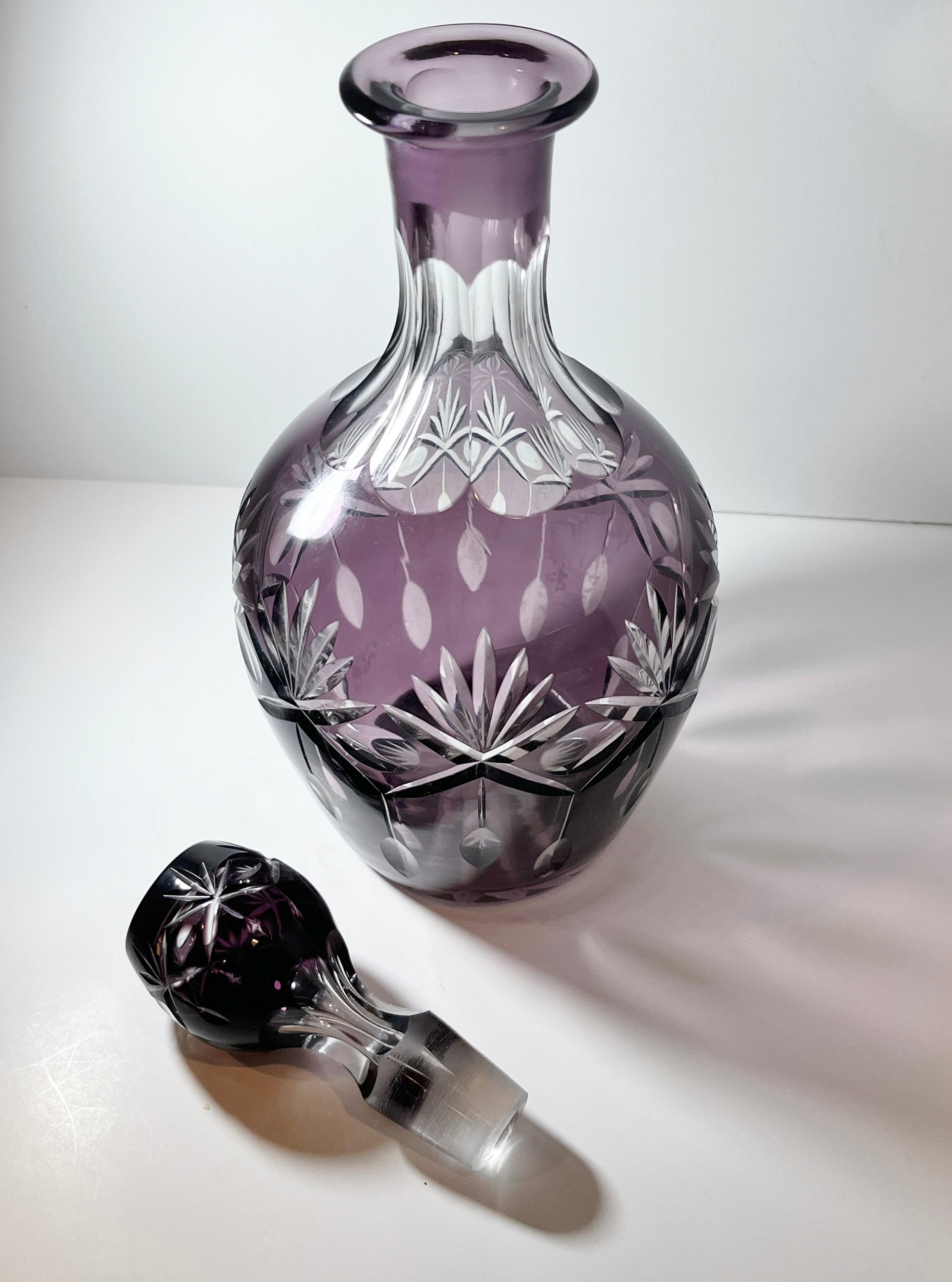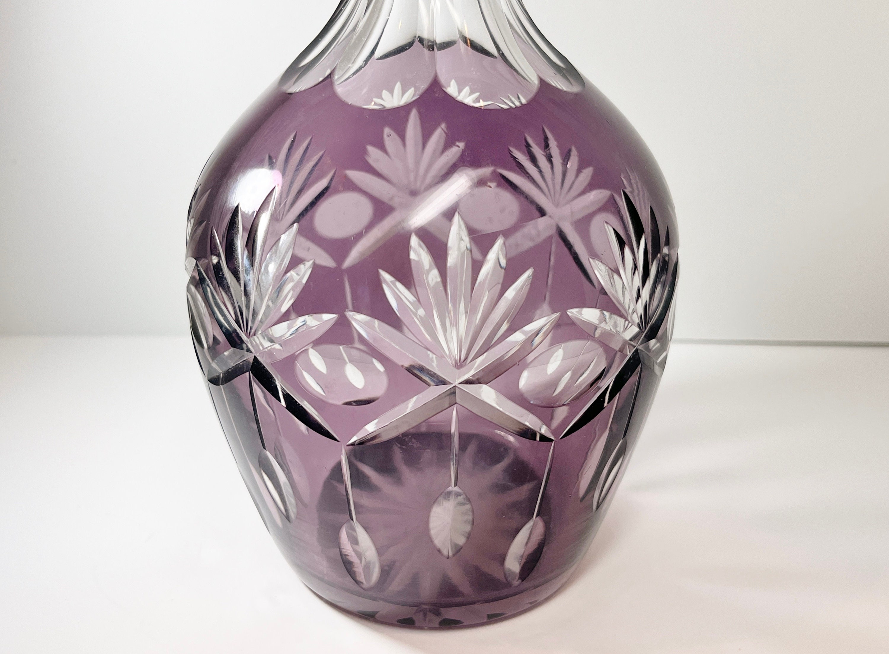 The technique is to create two layers of glass, in this case amethyst over clear. The circles, fans and straight lines were cut upon the royal purple until the clear under glass was visible.