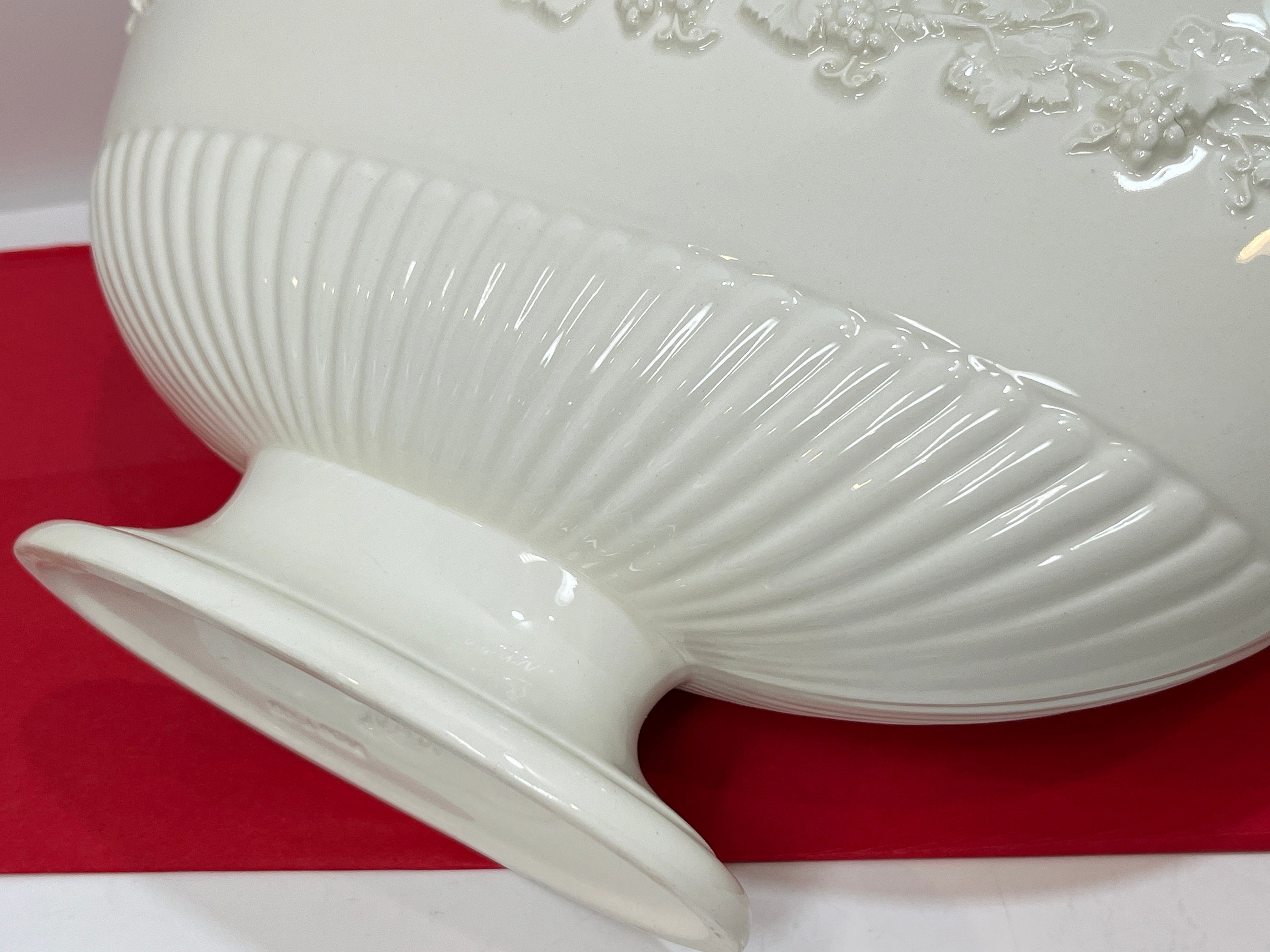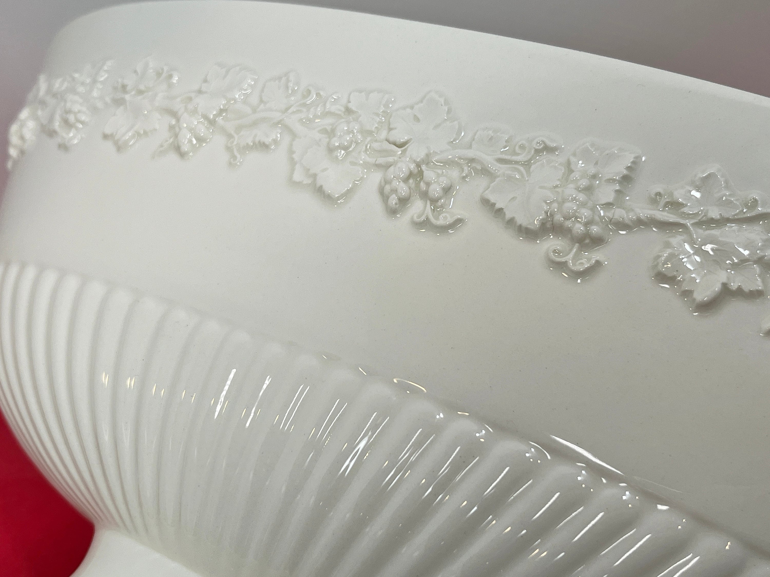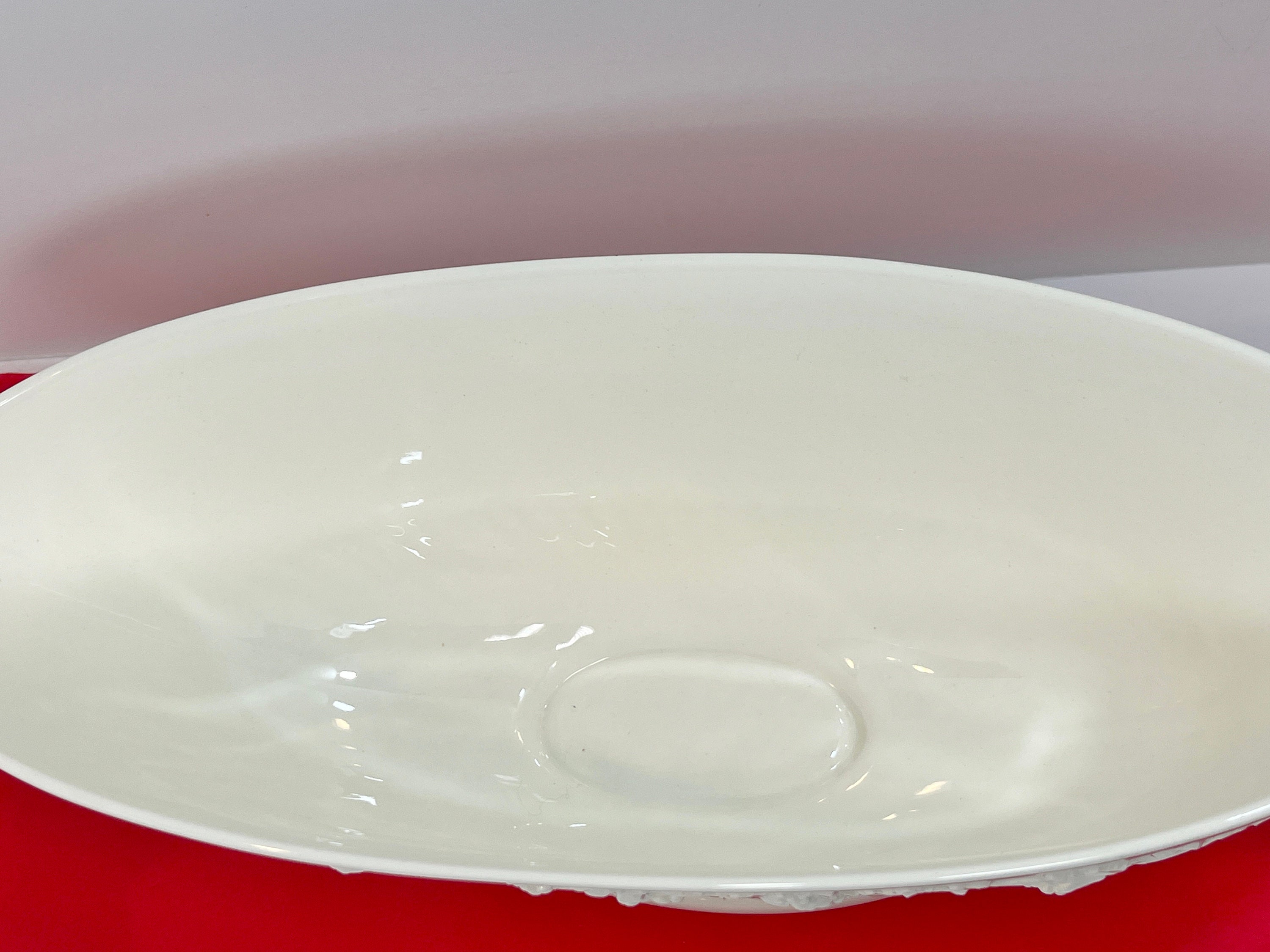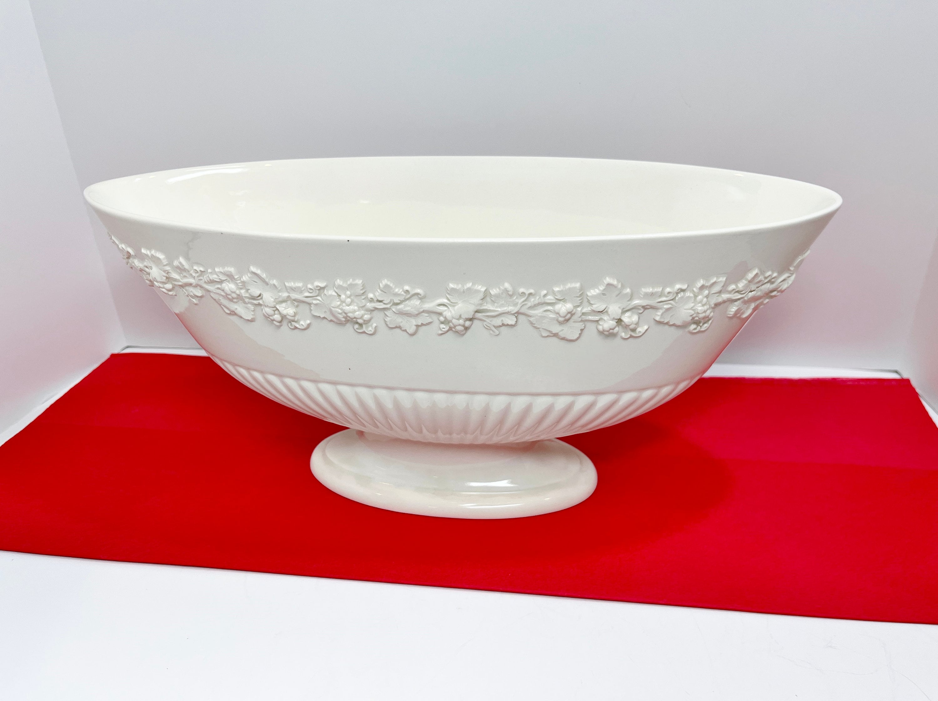 This premium oval centerpiece of embossed Queensware by Wedgwood is lovely, cream, shiny and elegant. The hand cut cream pottery is applied over the bowl and then fired. The piece has the Wedgwood logo on the bottom. Of course, it is made in England. The name Wedgwood is incised in the bottom too, but it does not photograph well.