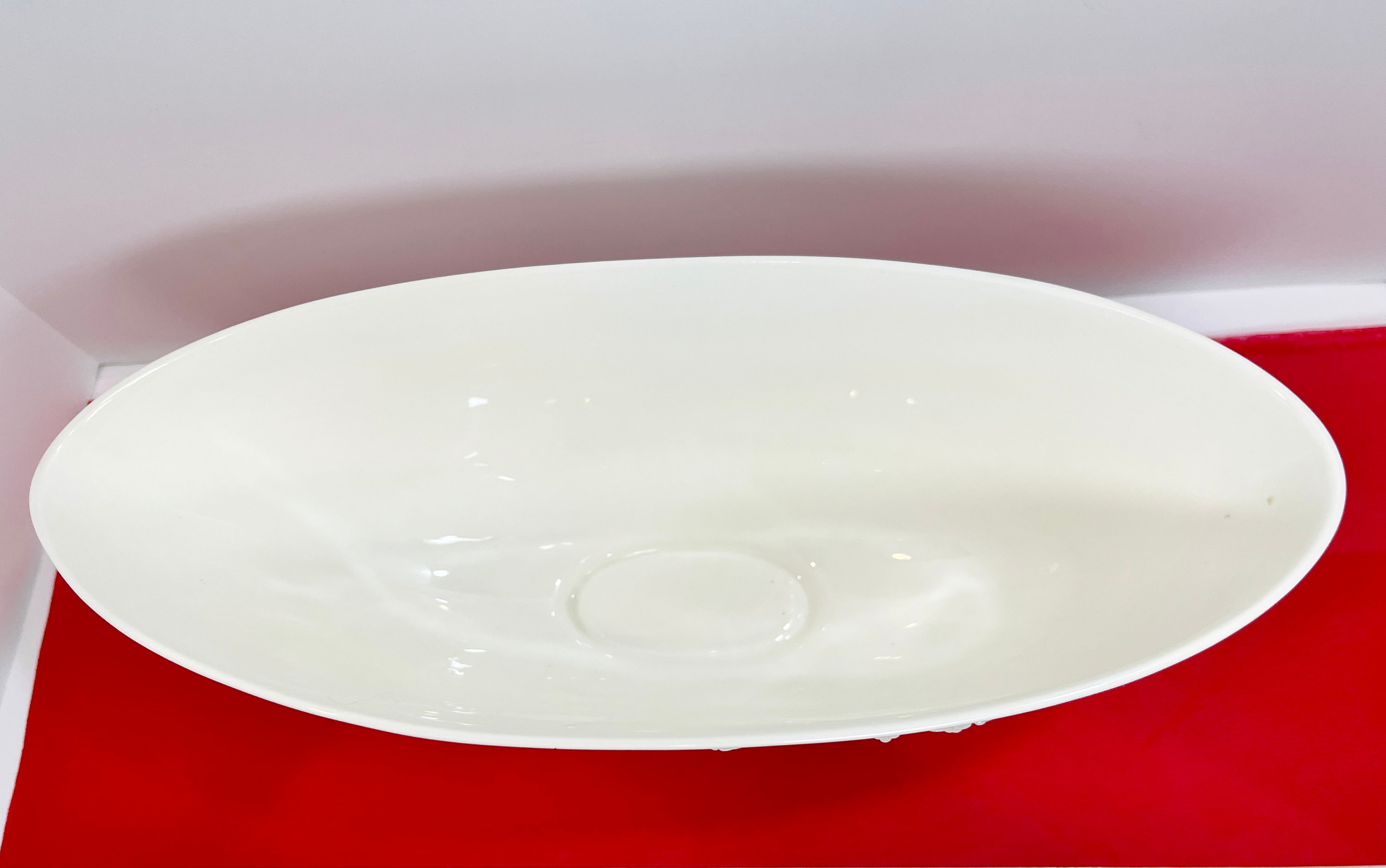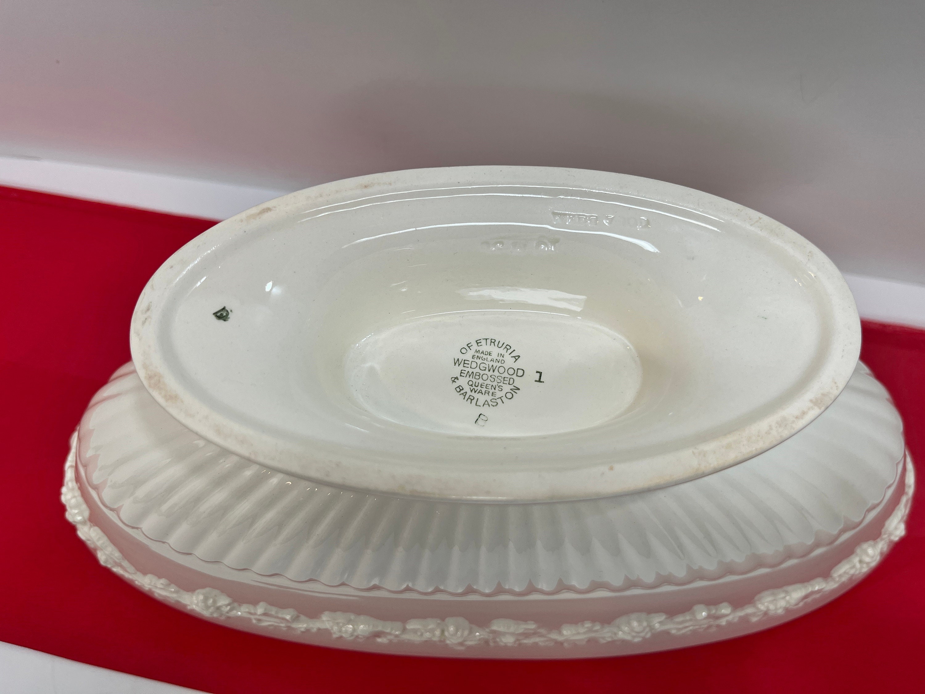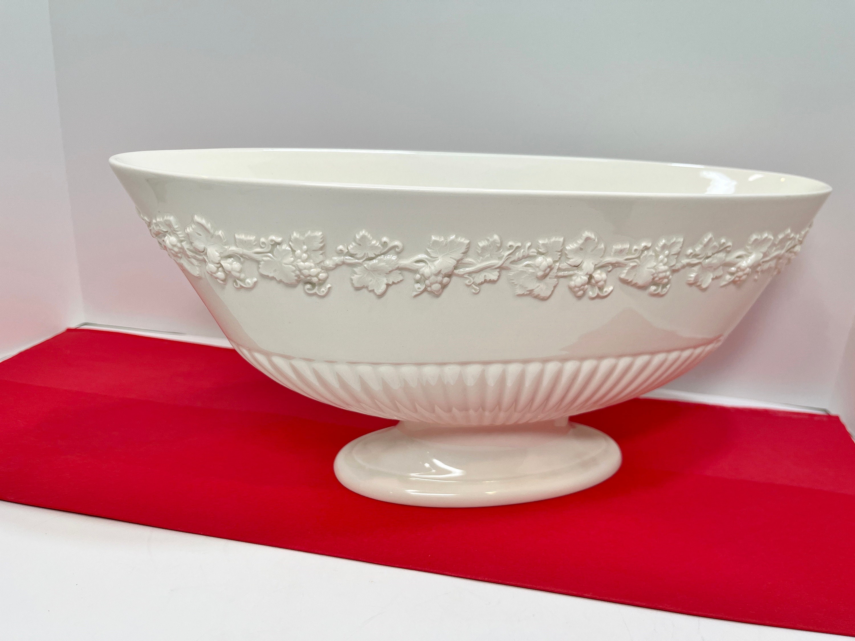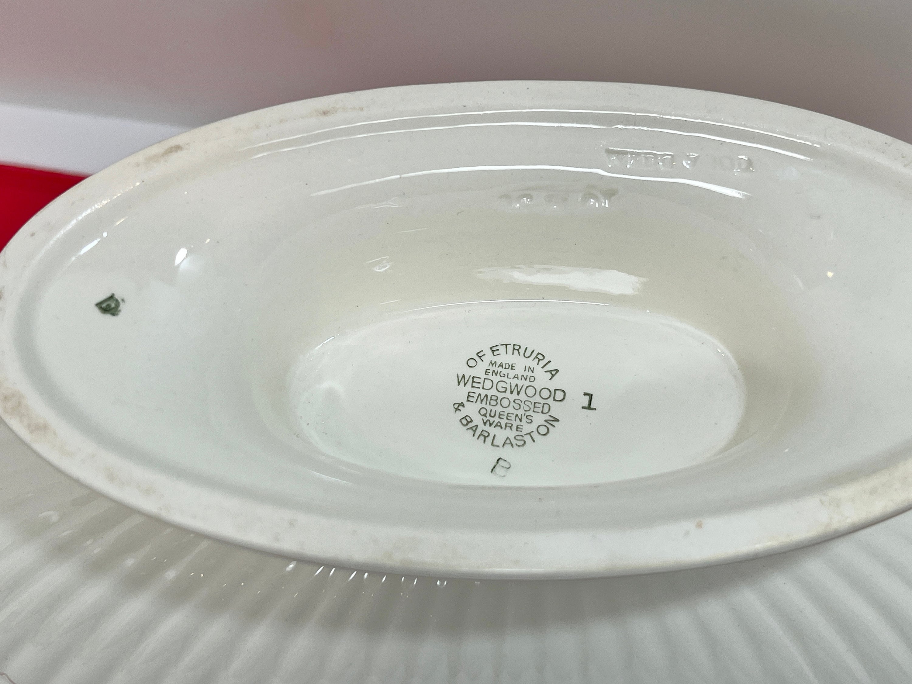 This premium oval centerpiece of embossed Queensware by Wedgwood is lovely, cream, shiny and elegant. The hand cut cream pottery is applied over the bowl and then fired. The piece has the Wedgwood logo on the bottom. Of course, it is made in England. The name Wedgwood is incised in the bottom too, but it does not photograph well.