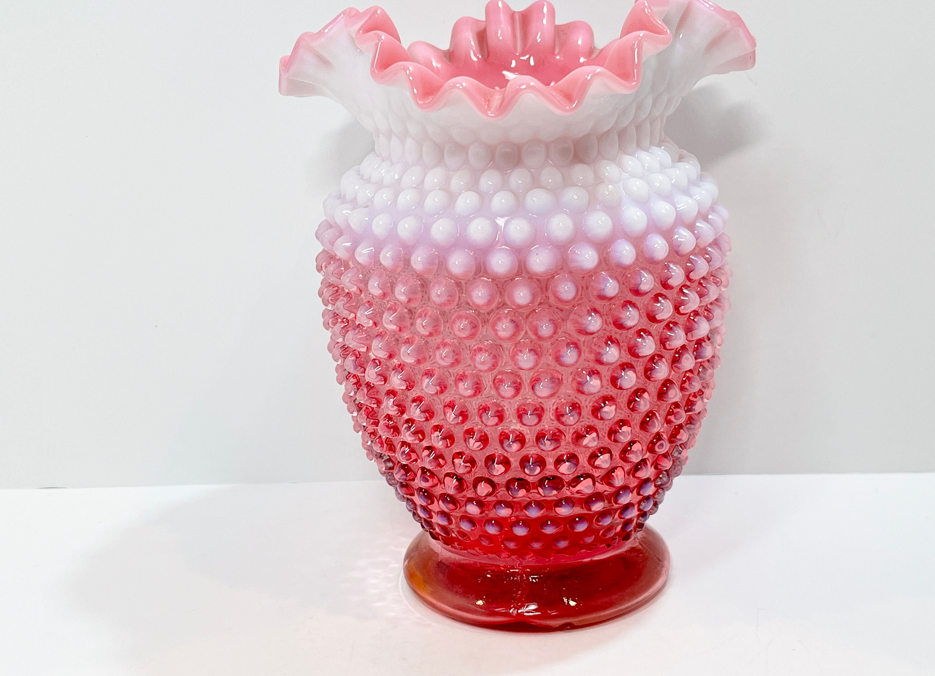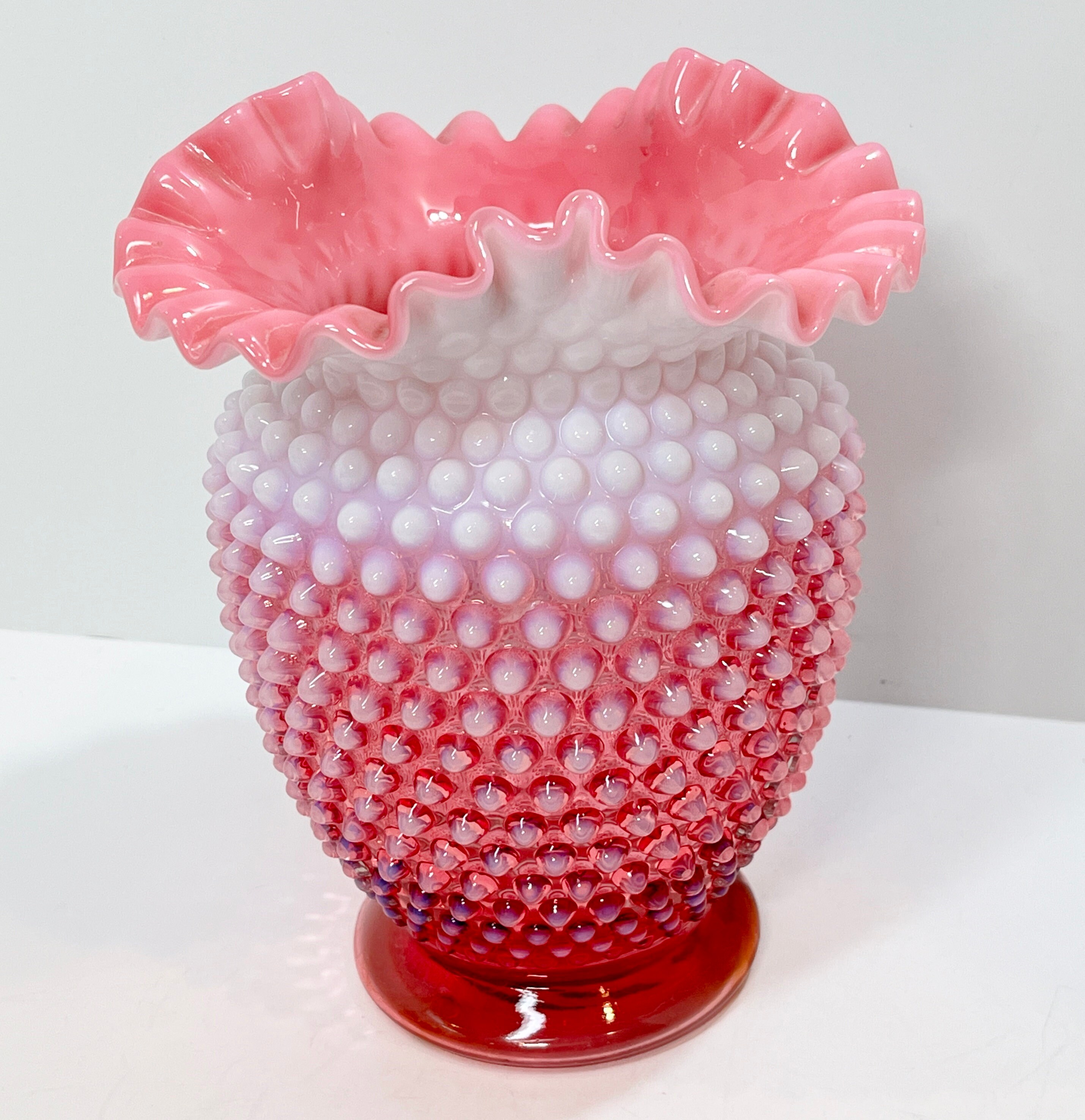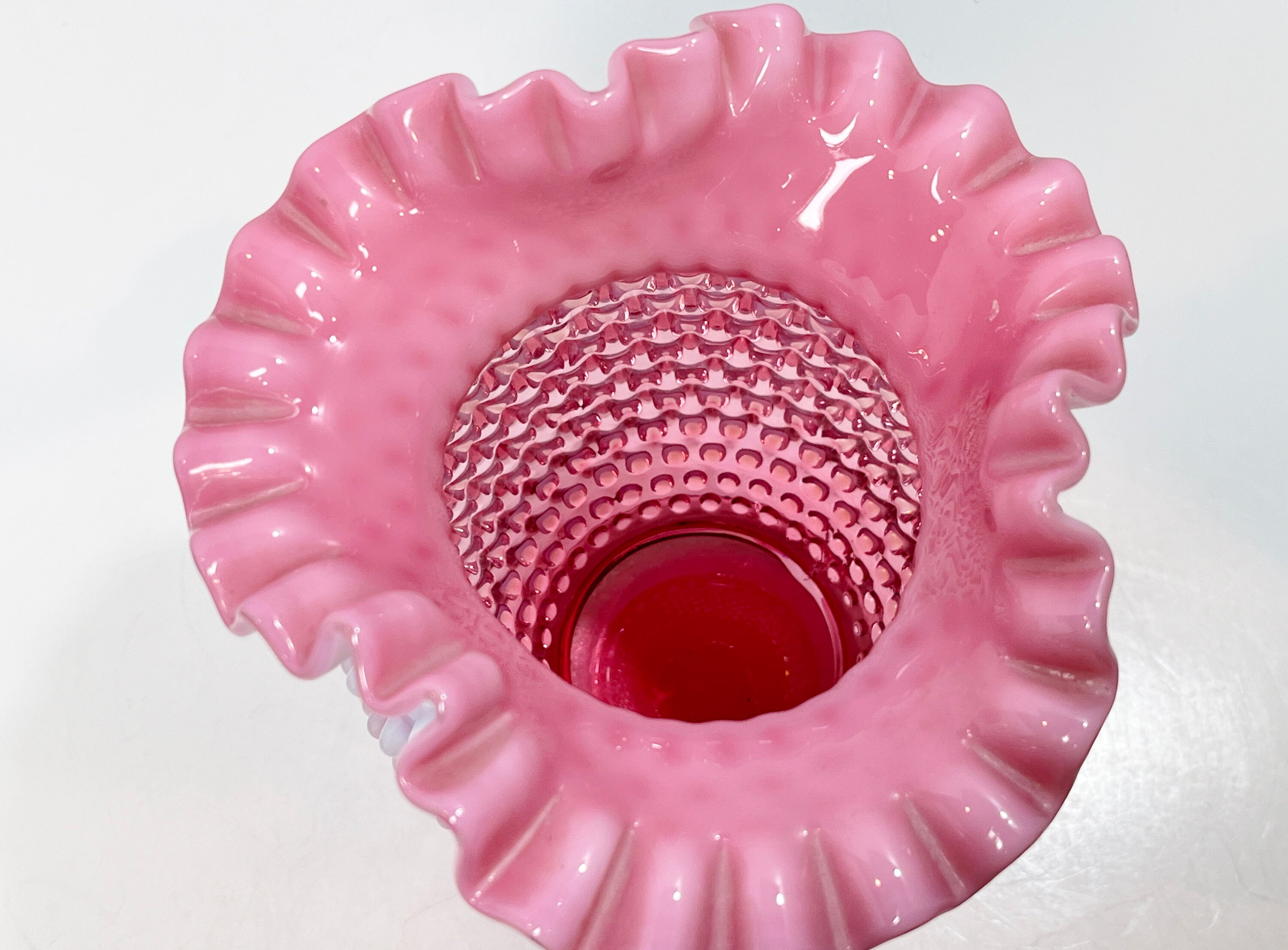 Fenton provides the perfect vase in pink hobnail. The beauty of the inside tantalizes us with its gentle ruffled top. The white hobnails are called opalescent. Of course, this is 8 inches tall. Generally, it is the color that makes it special.