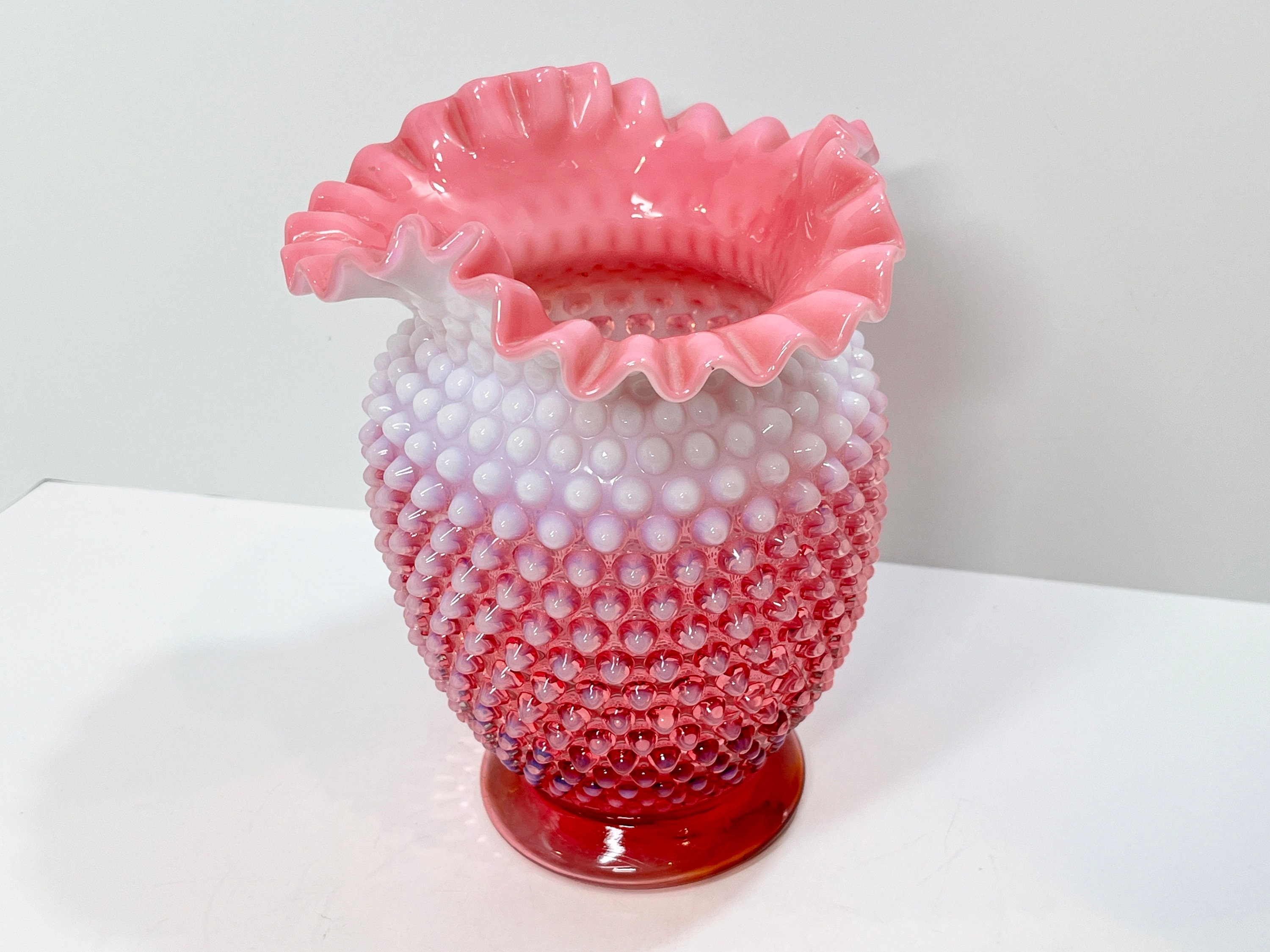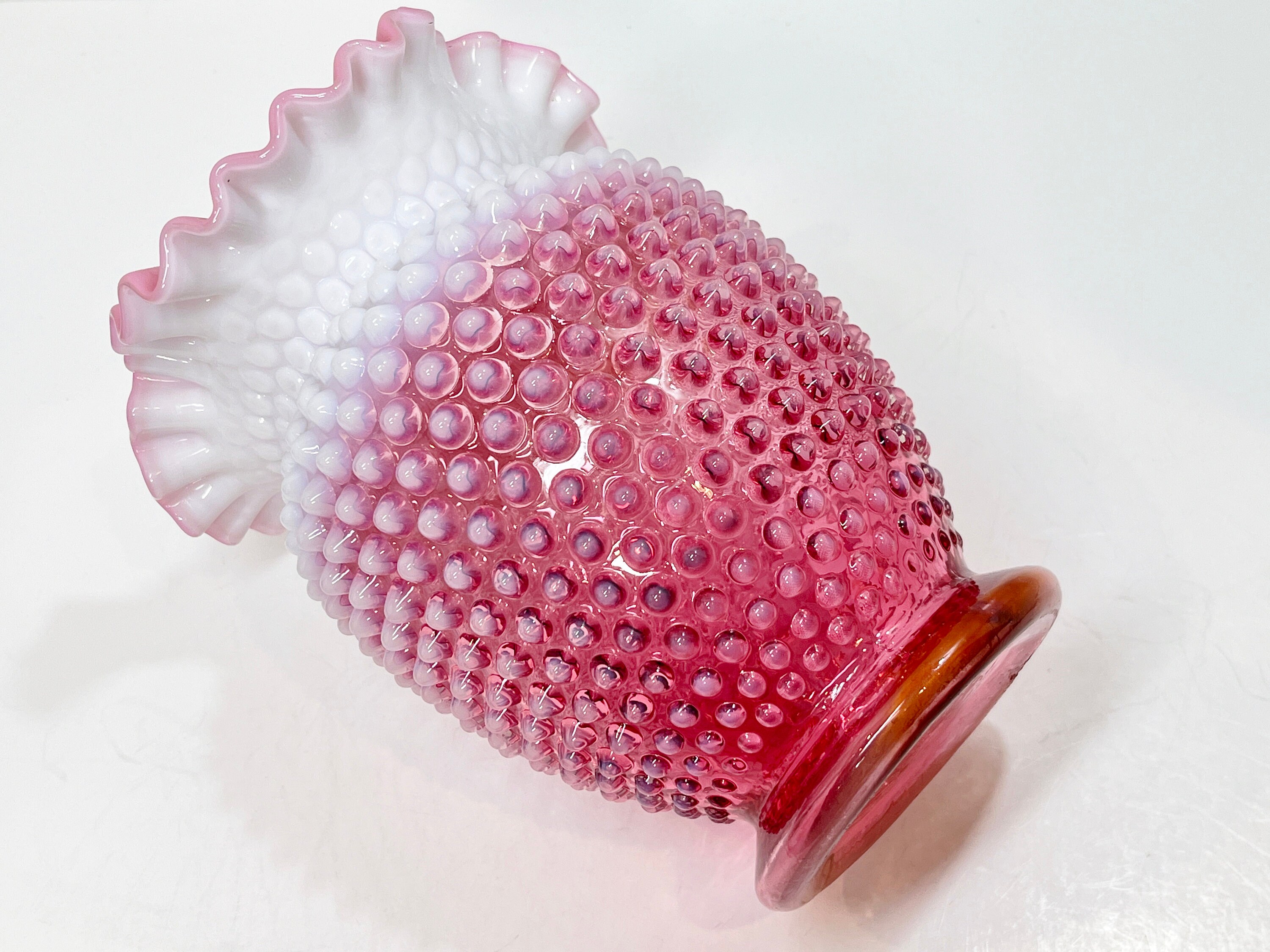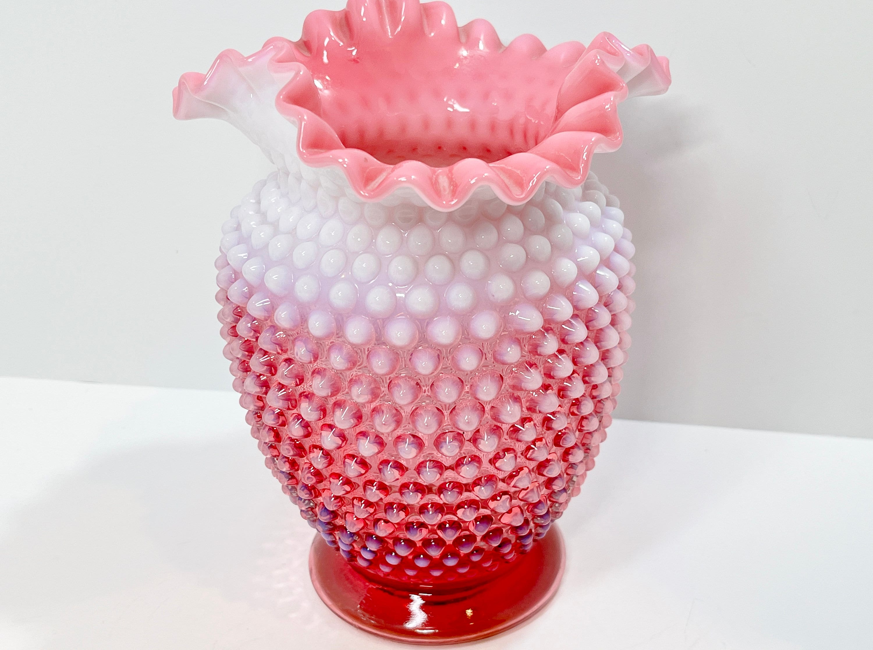 Fenton provides the perfect vase in pink hobnail. The beauty of the inside tantalizes us with its gentle ruffled top. The white hobnails are called opalescent. Of course, this is 8 inches tall. Generally, it is the color that makes it special.