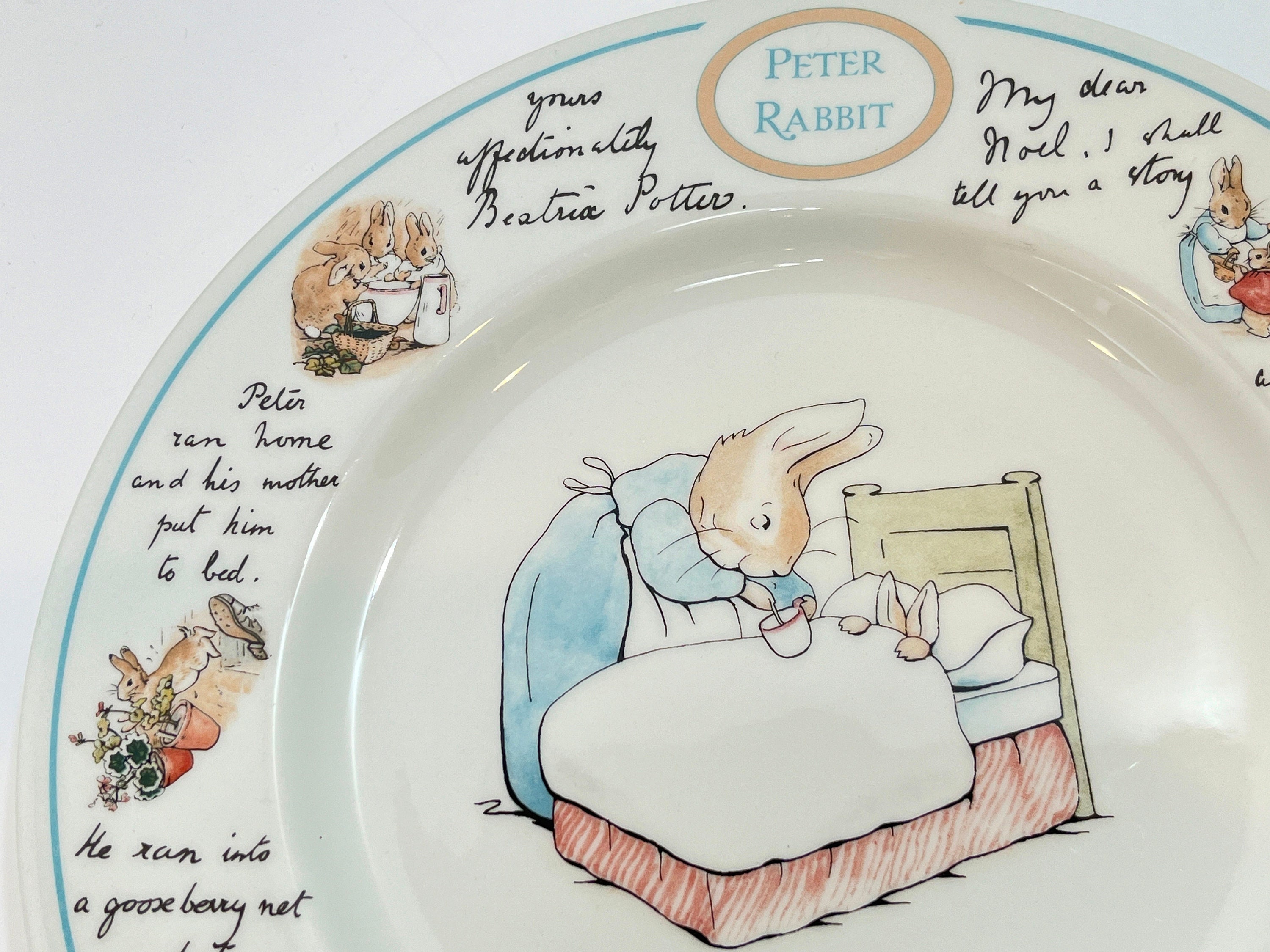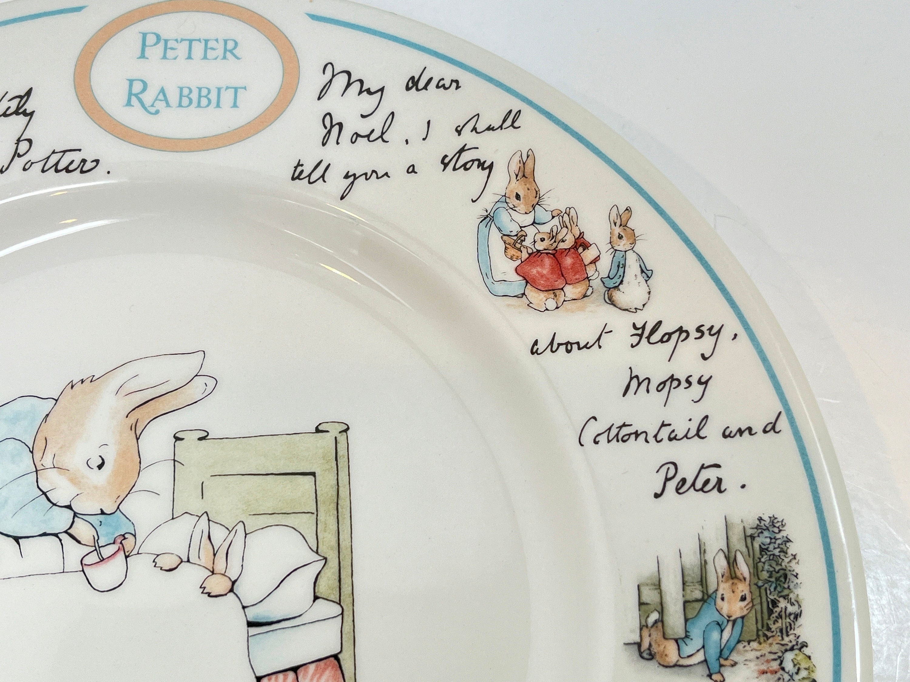 Enjoy the classic Peter Rabbit story by Beatrix Potter. This cake plate is 10" in diameter. It could be used as a dining plate too.