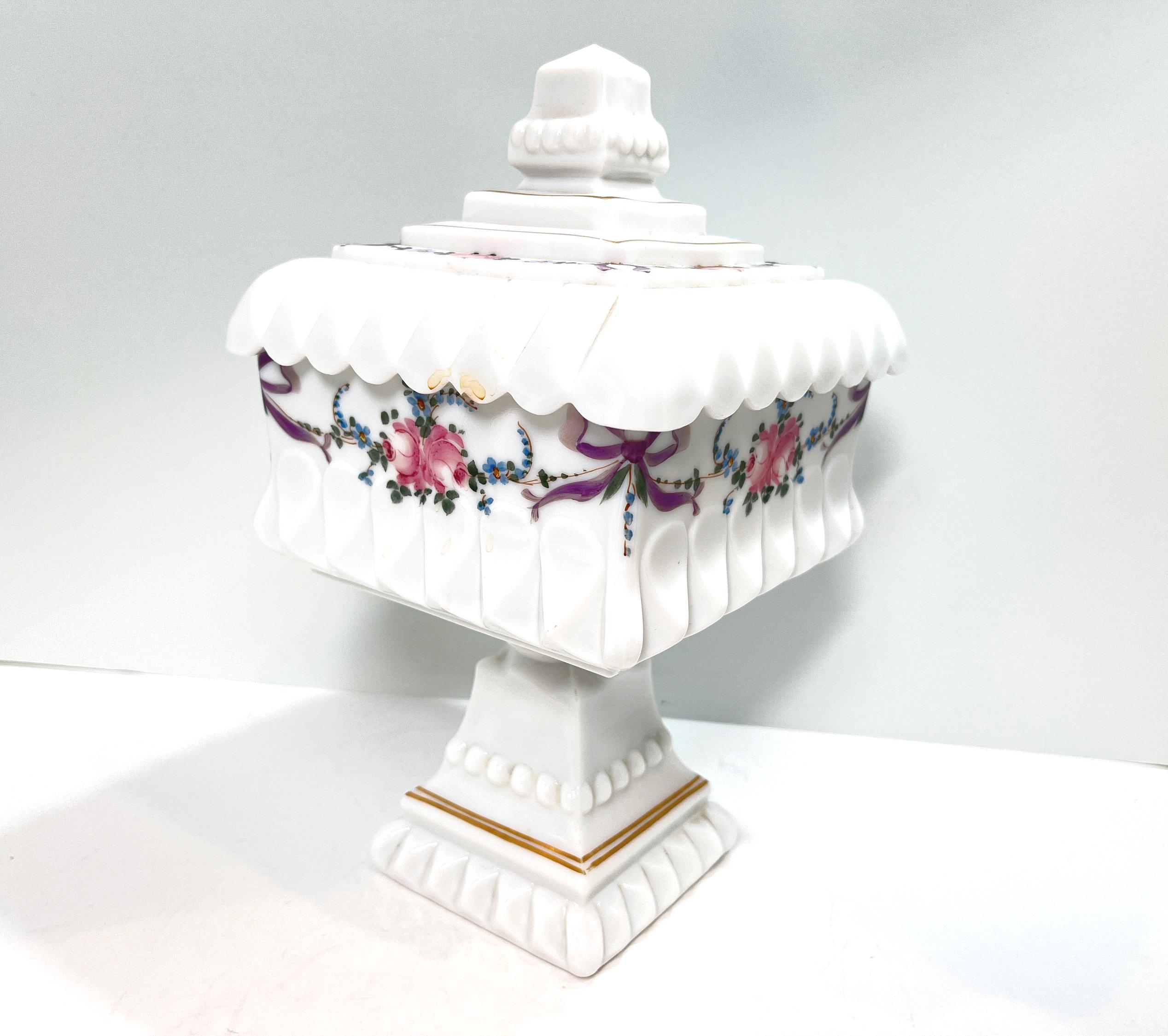 Made in the mid-century, this sparkling white decorative piece charms with its roses, tiny blue flowers, and lilac ribbons. Produced by the Westmoreland Glass Company of Grapeville, Pennsylvania, it was originally sold as a bridal centerpiece. The clever design allows the cover to be removed and placed underneath to add height, and both pieces are beautifully hand-painted.