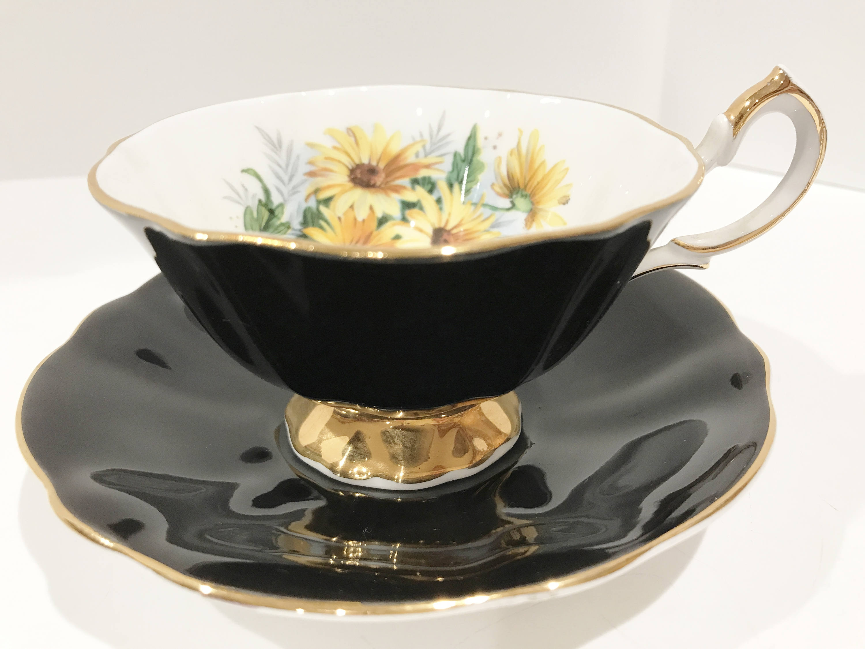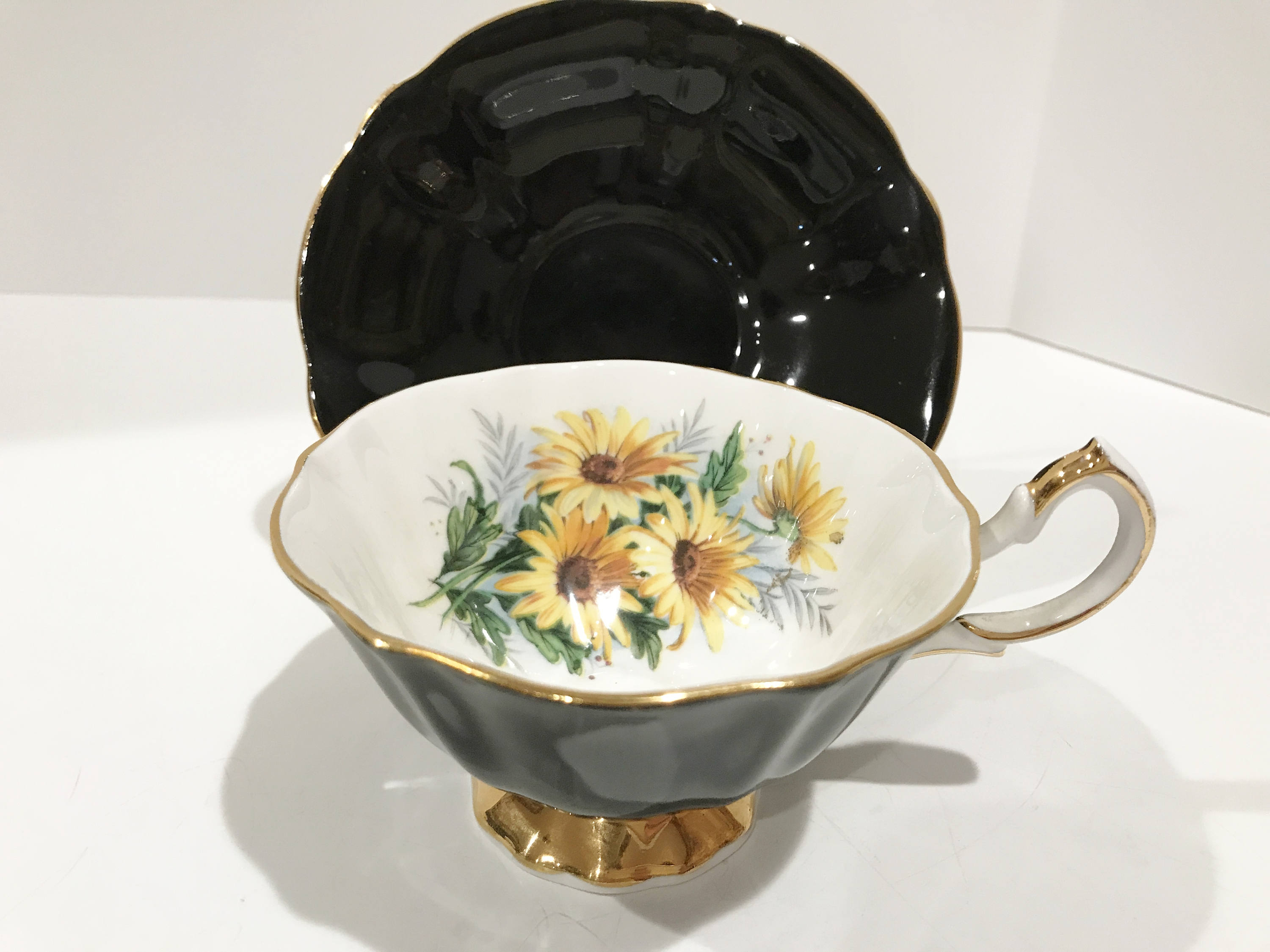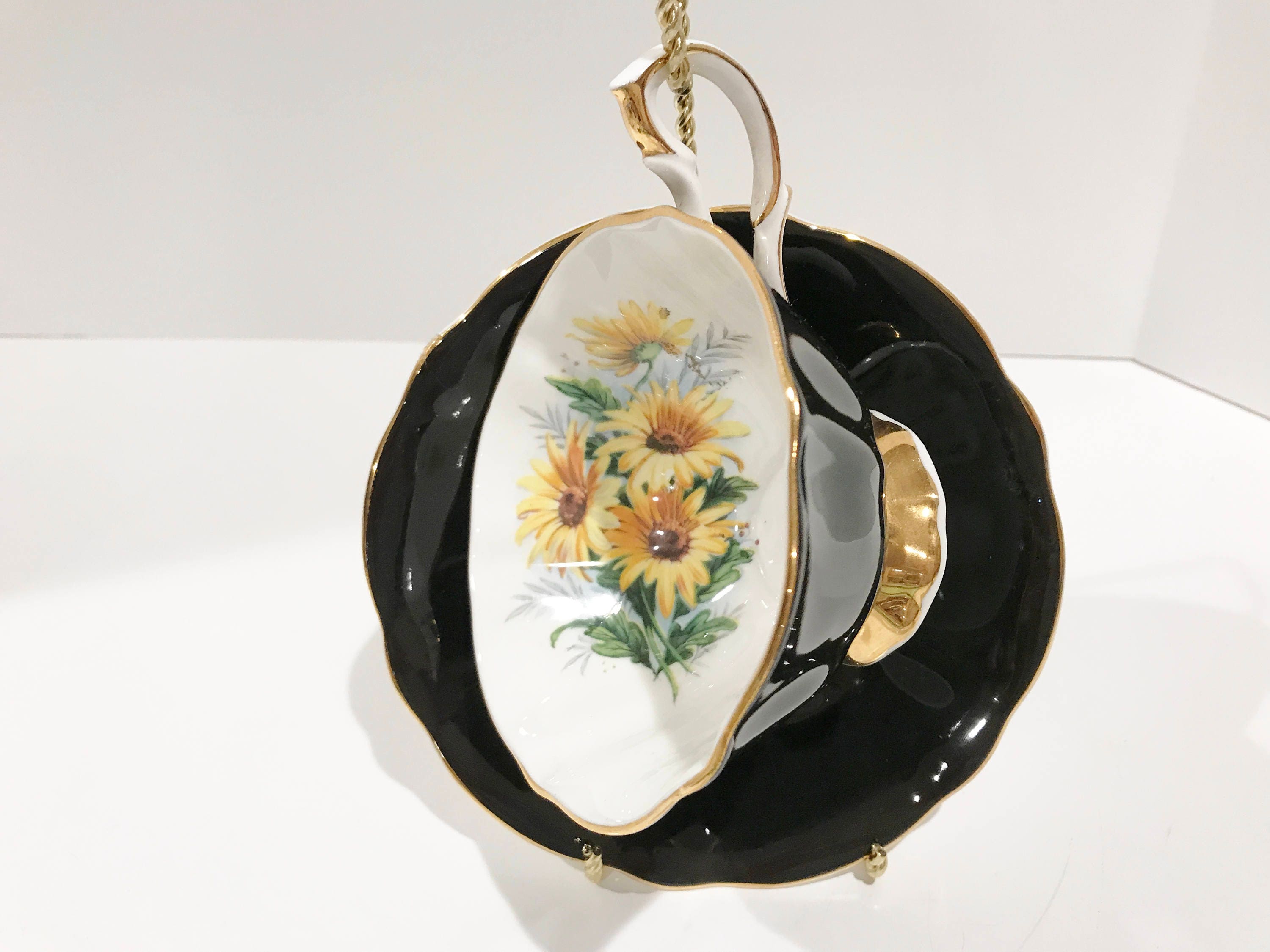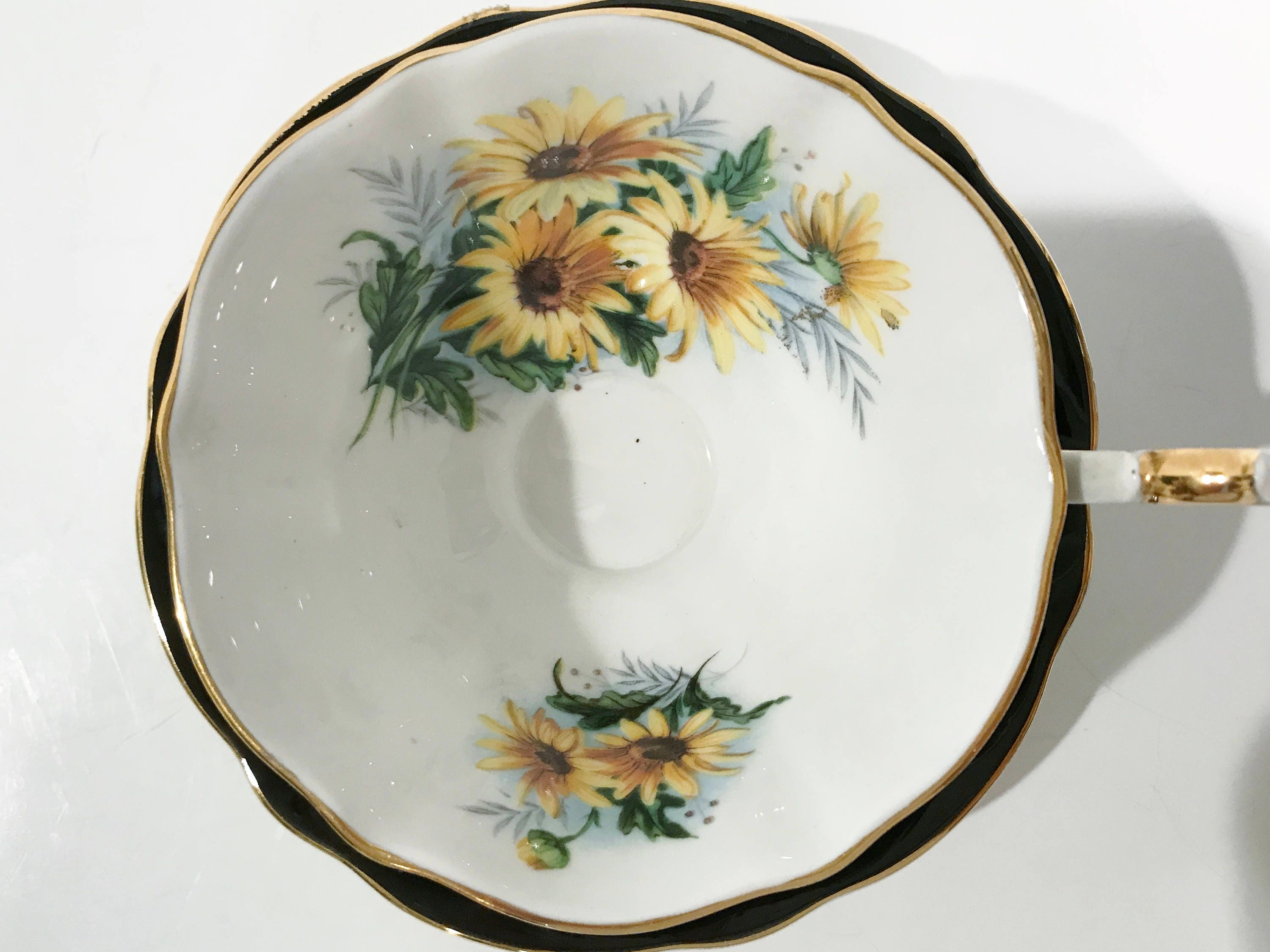 This stunning black and daisy tea cup and saucer is by Queen Anne Fine China,