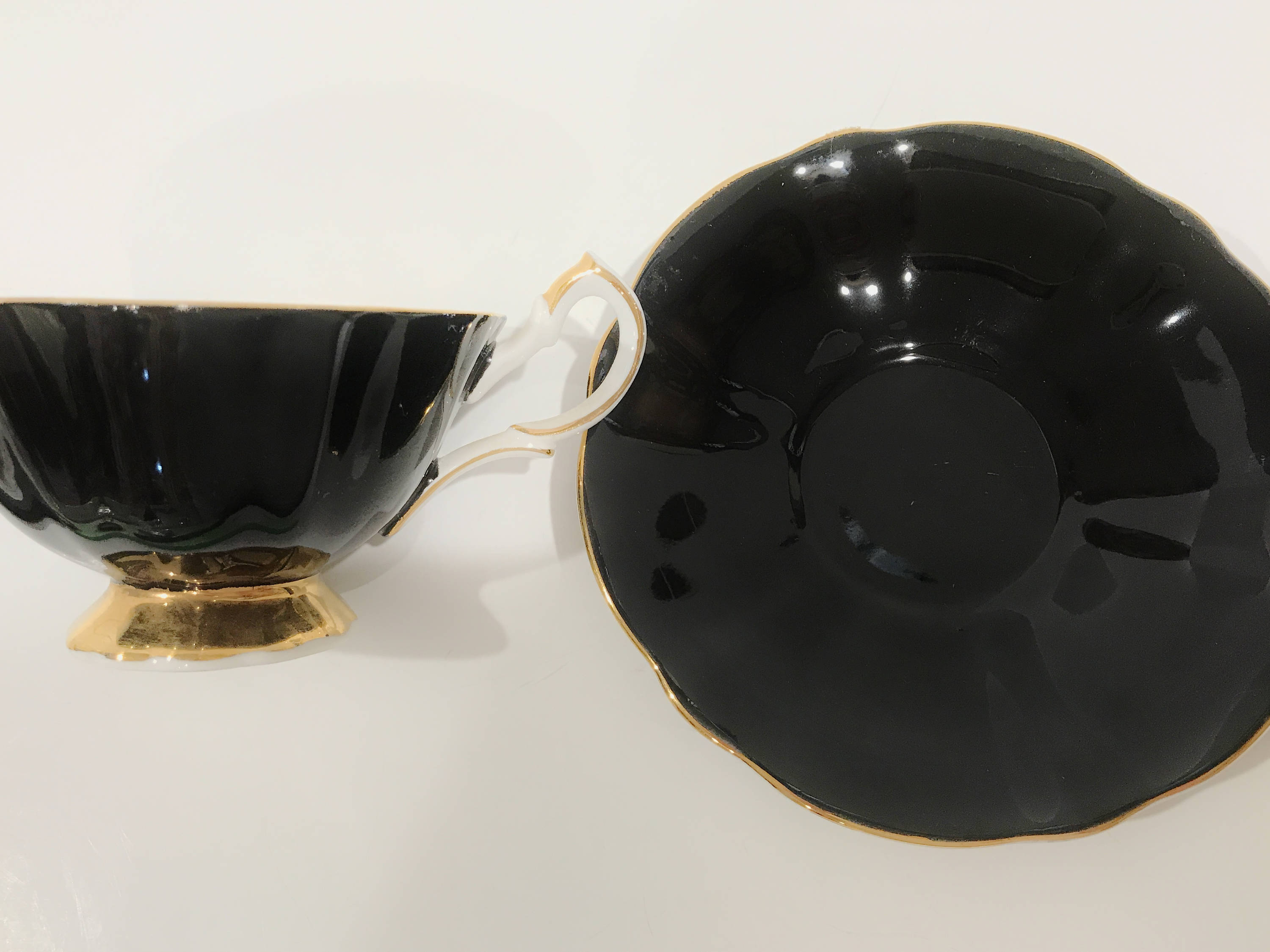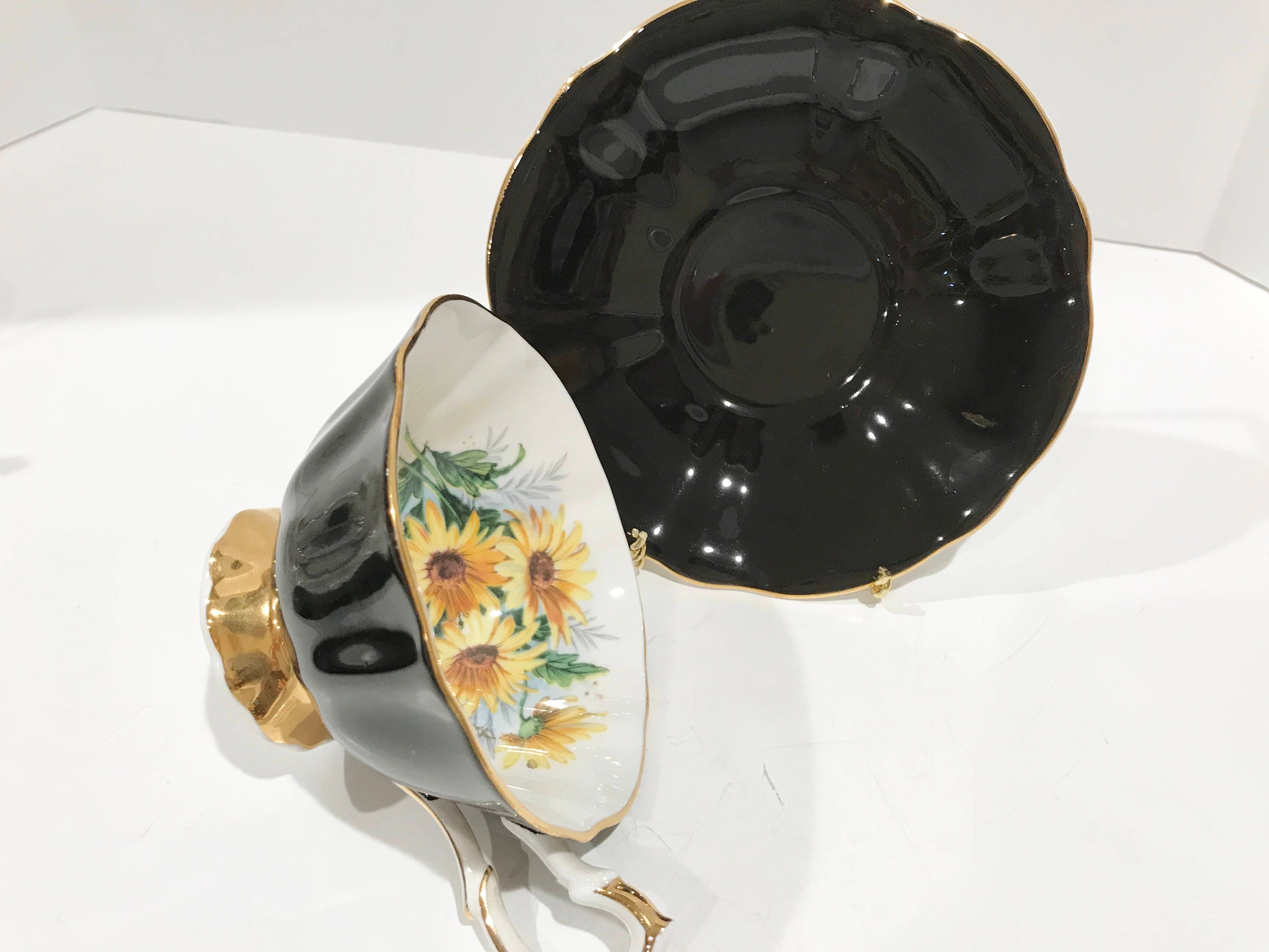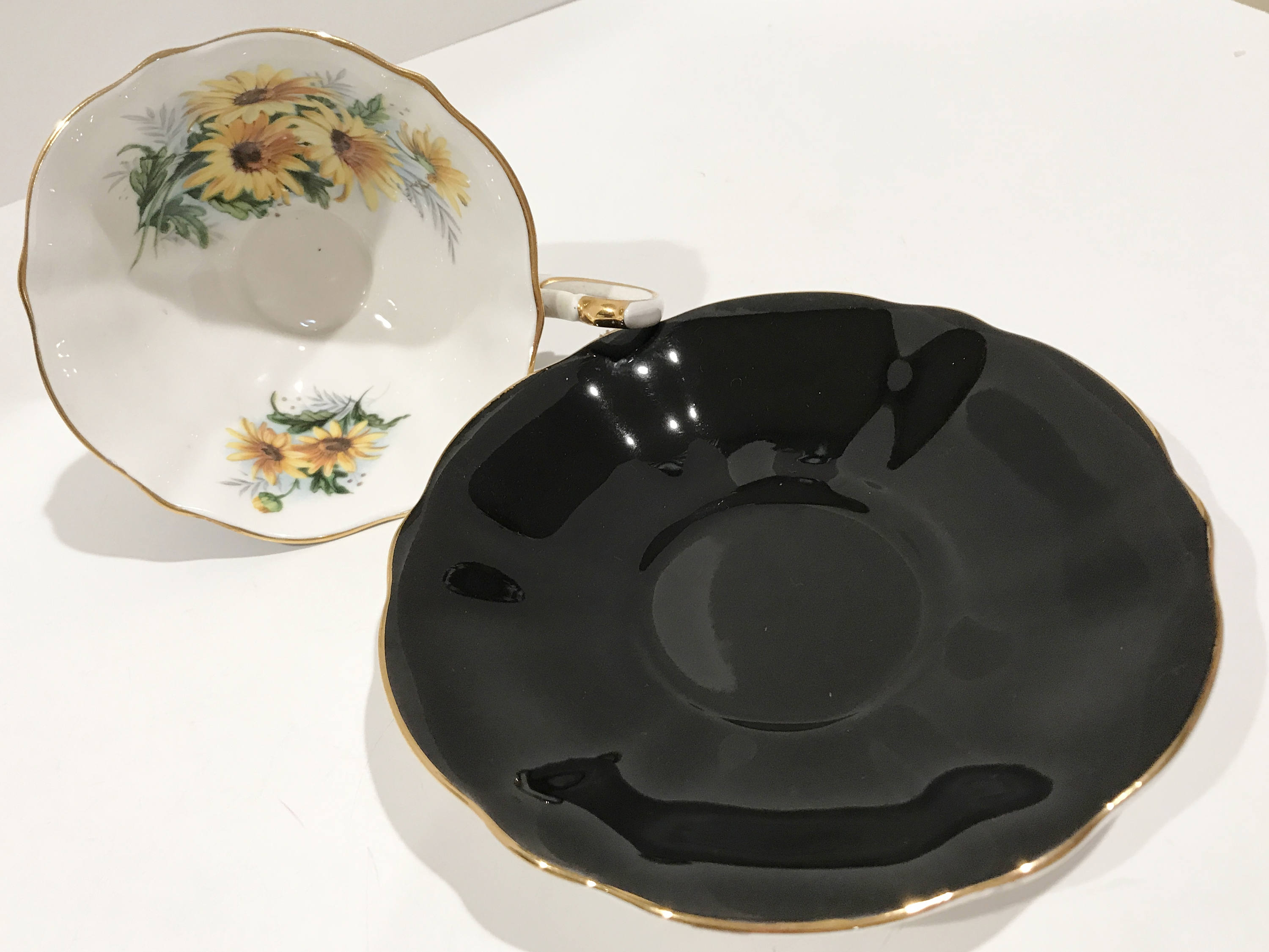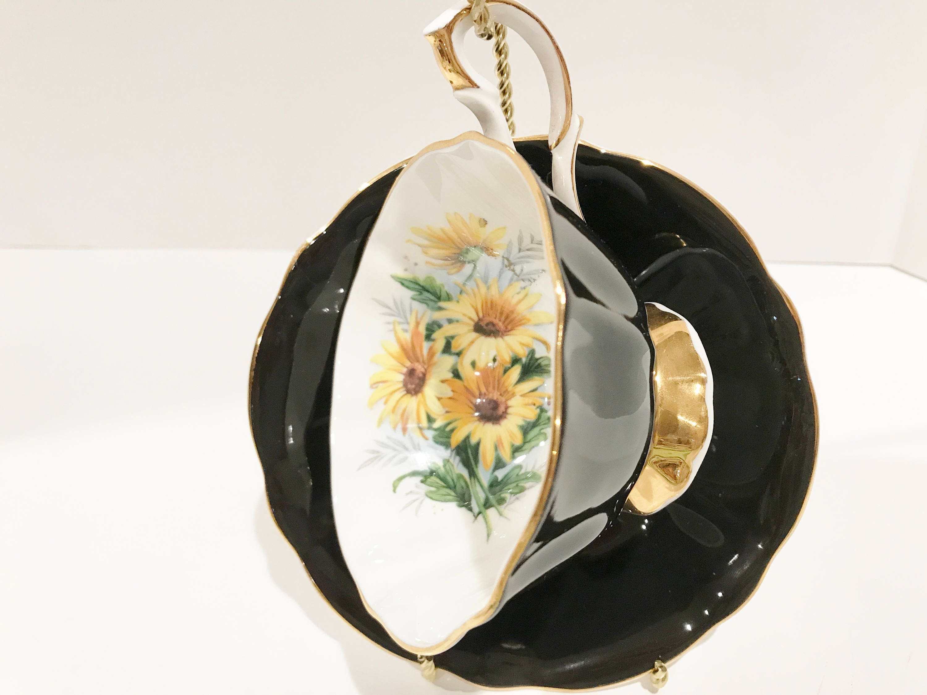 This stunning black and daisy tea cup and saucer is by Queen Anne Fine China,