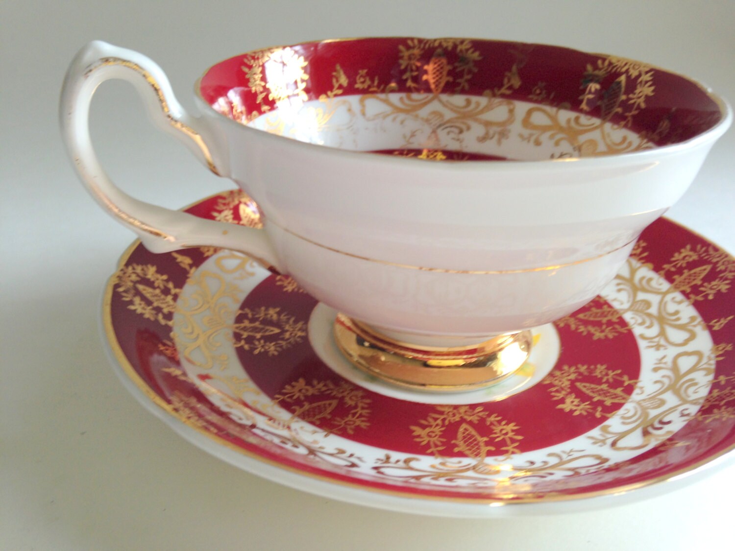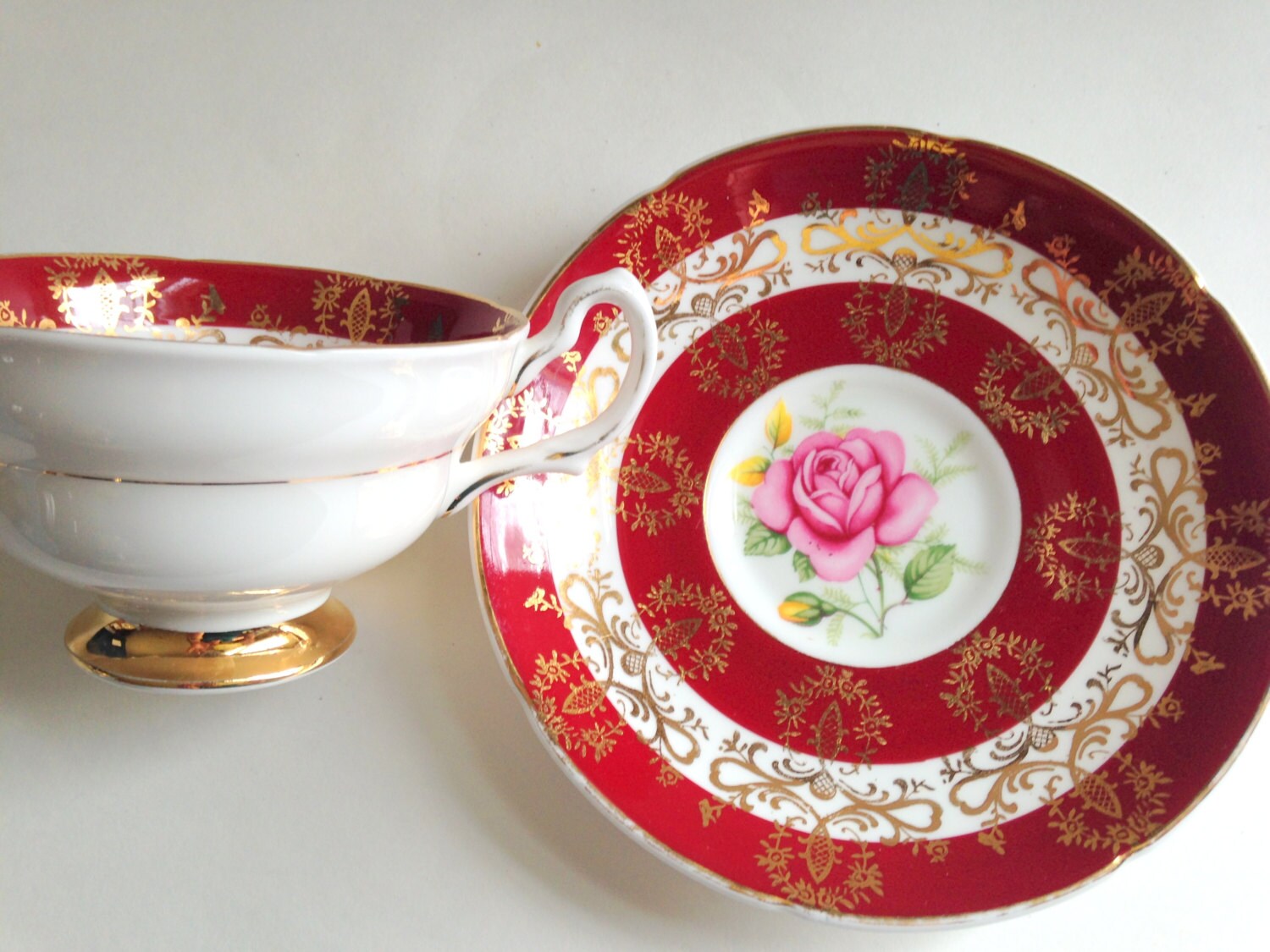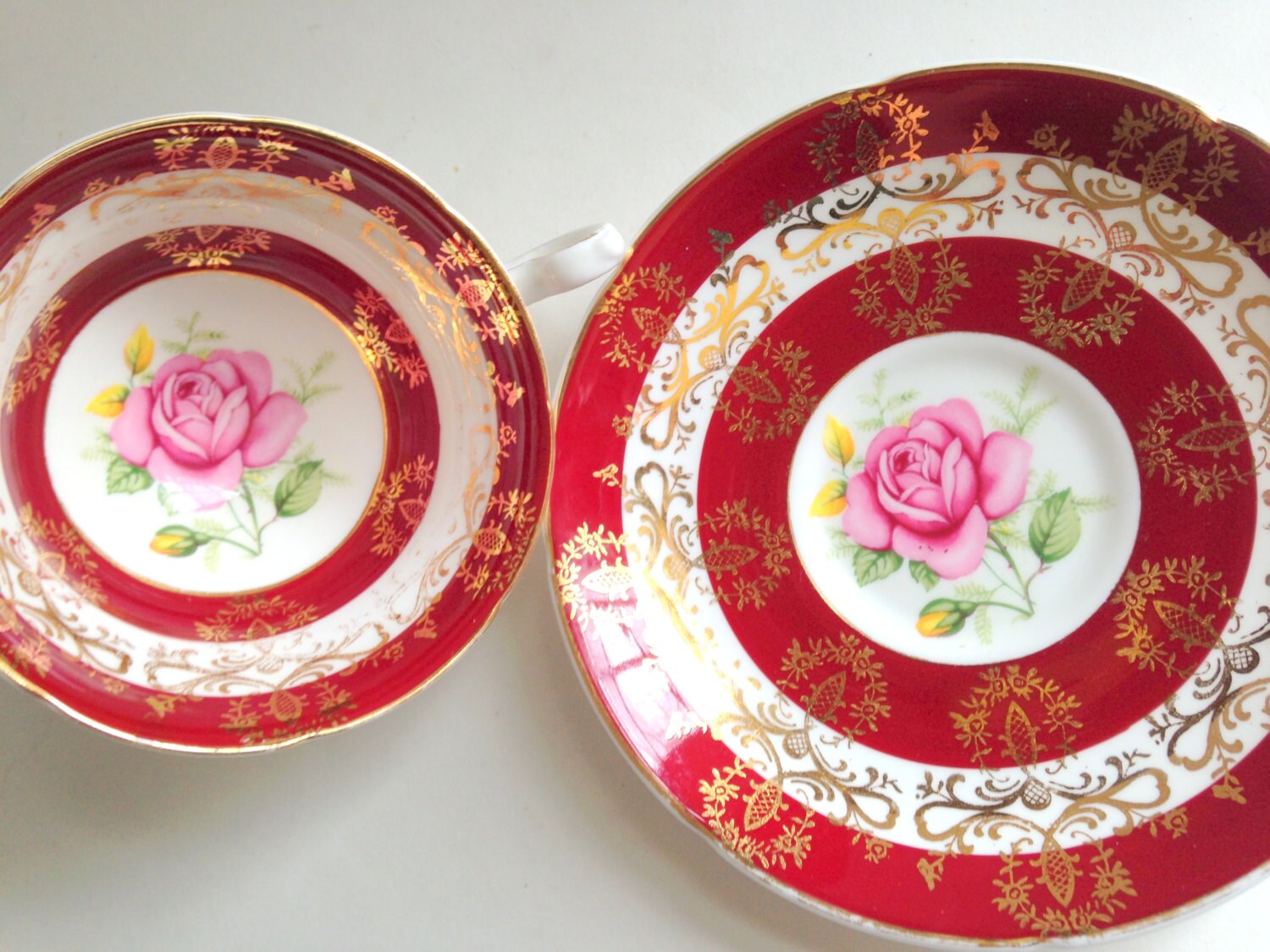 Enjoy tea time with a crimson tea cup and saucer. The pink rose is the surprise at the bottom of a warm cup of friendship.