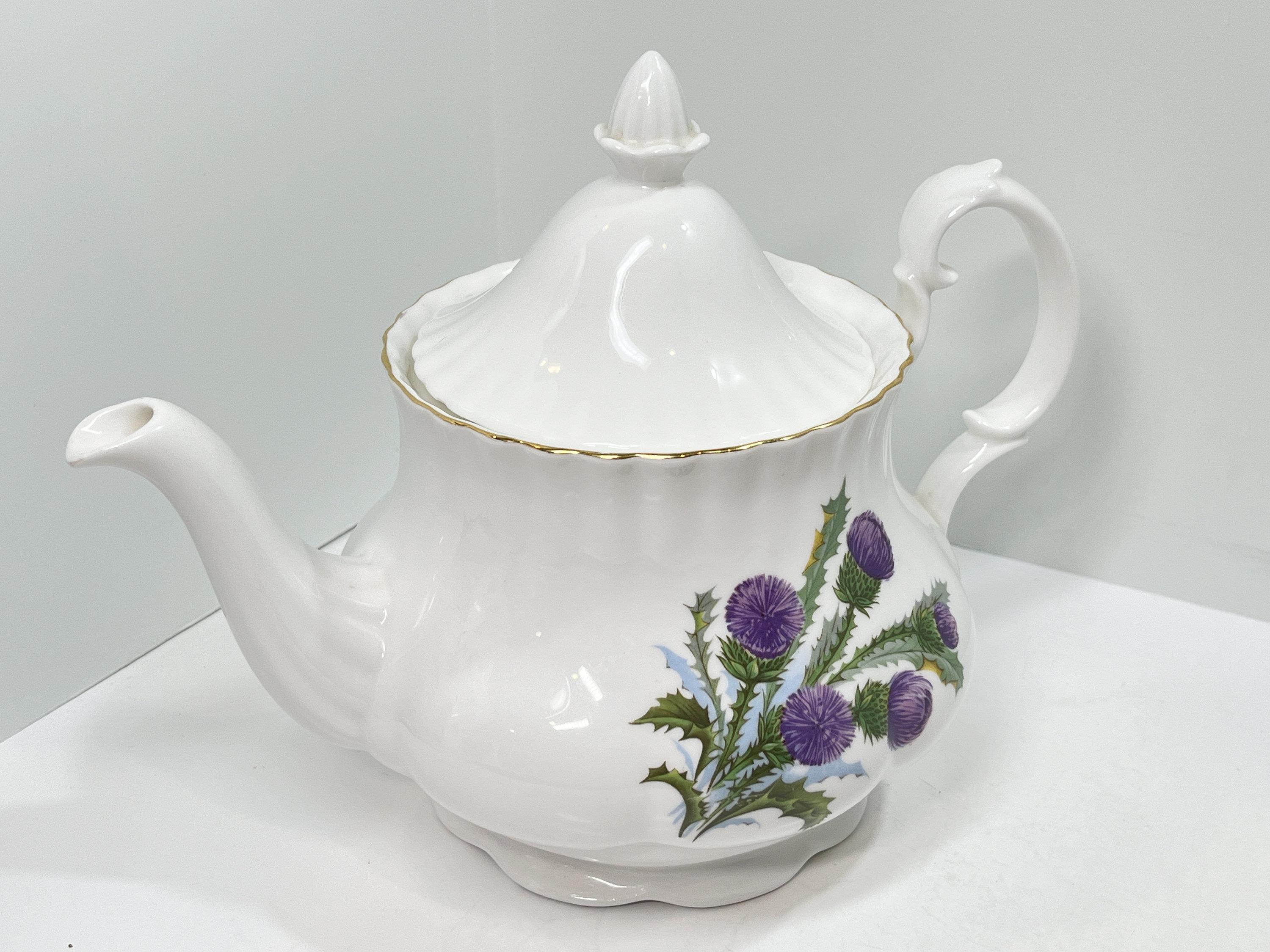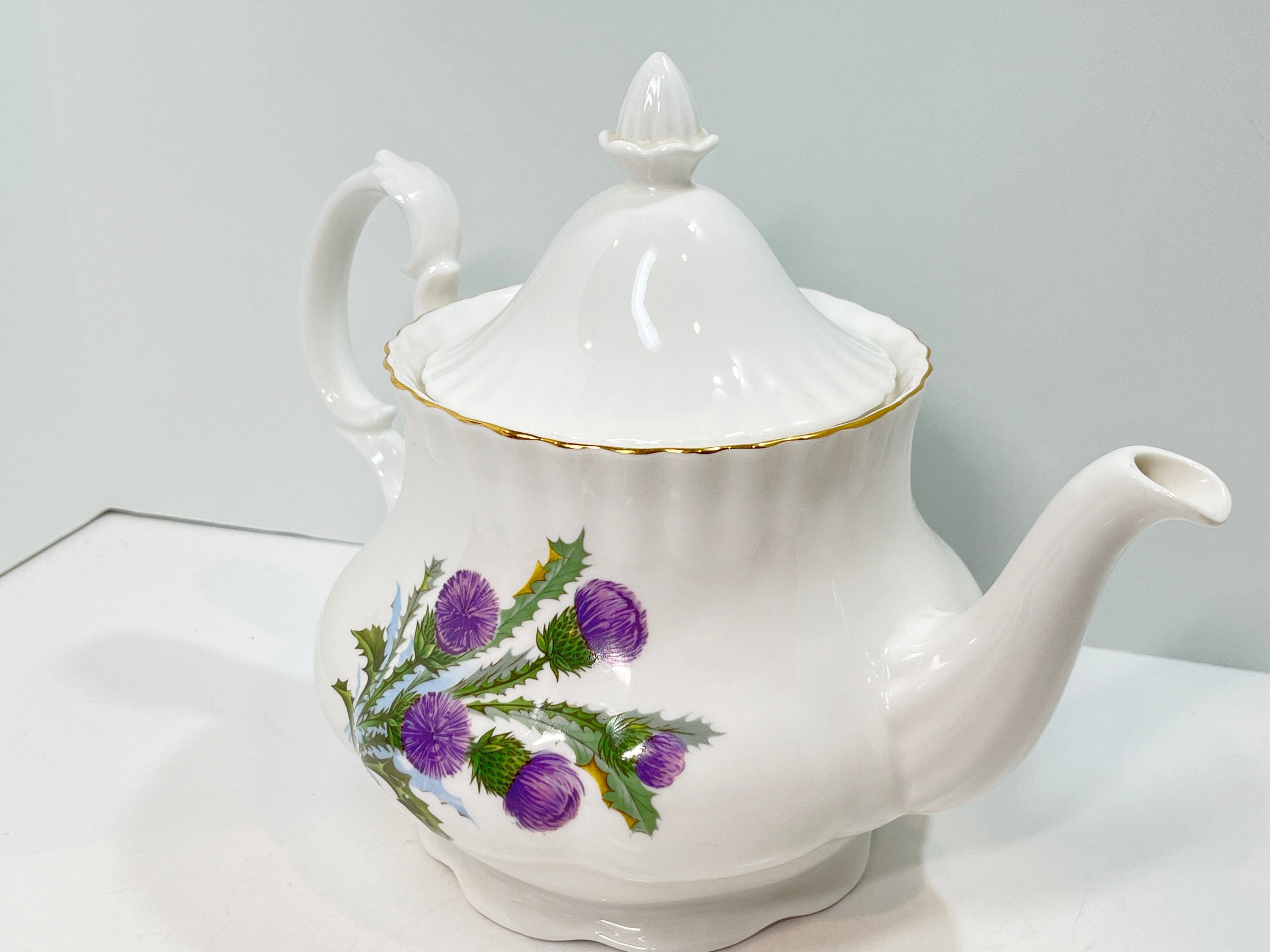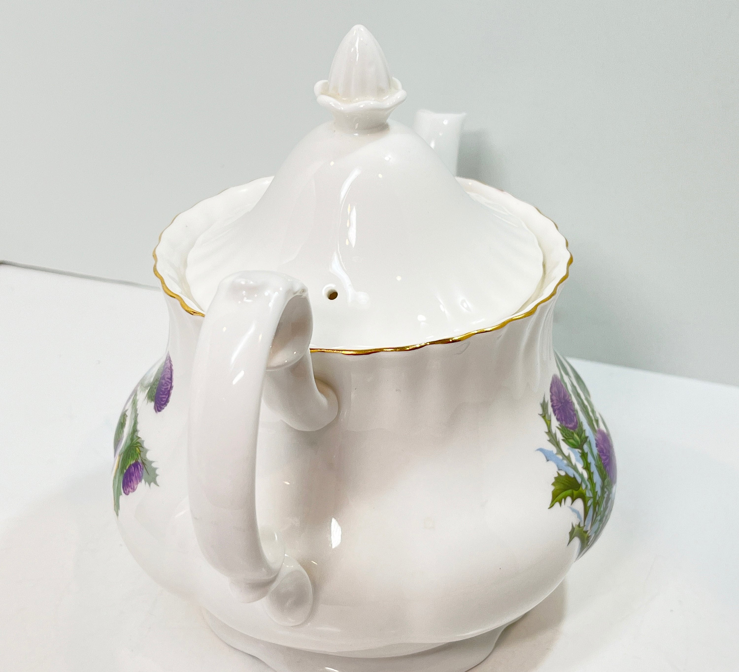 This crisp, clear, vibrant teapot is by Royal Vale Bone China of England.