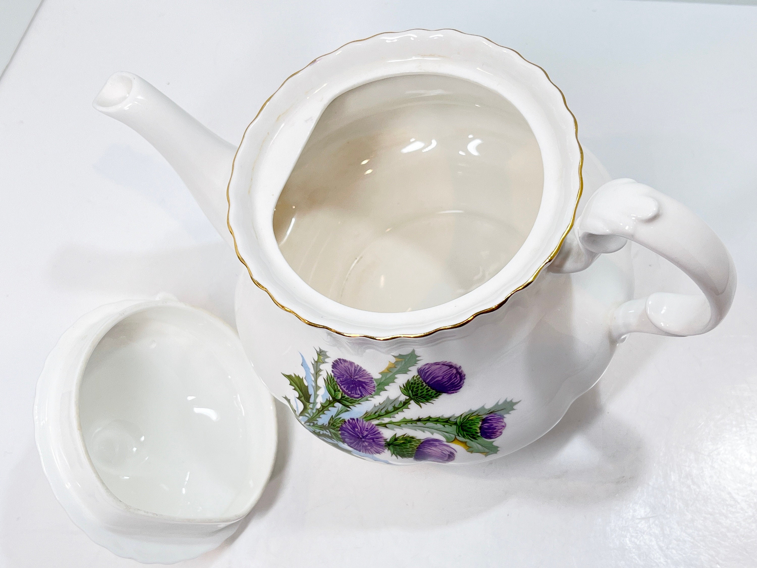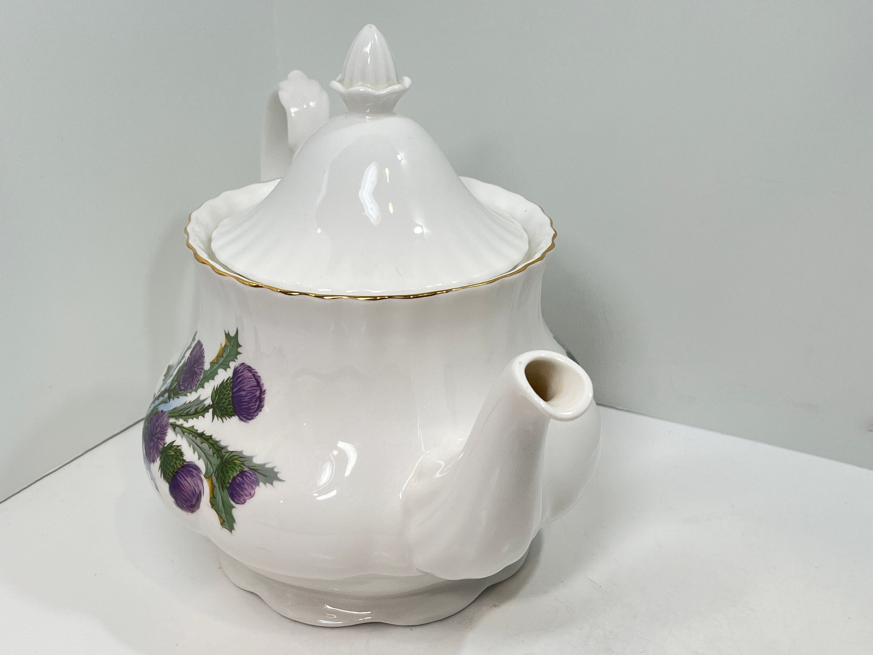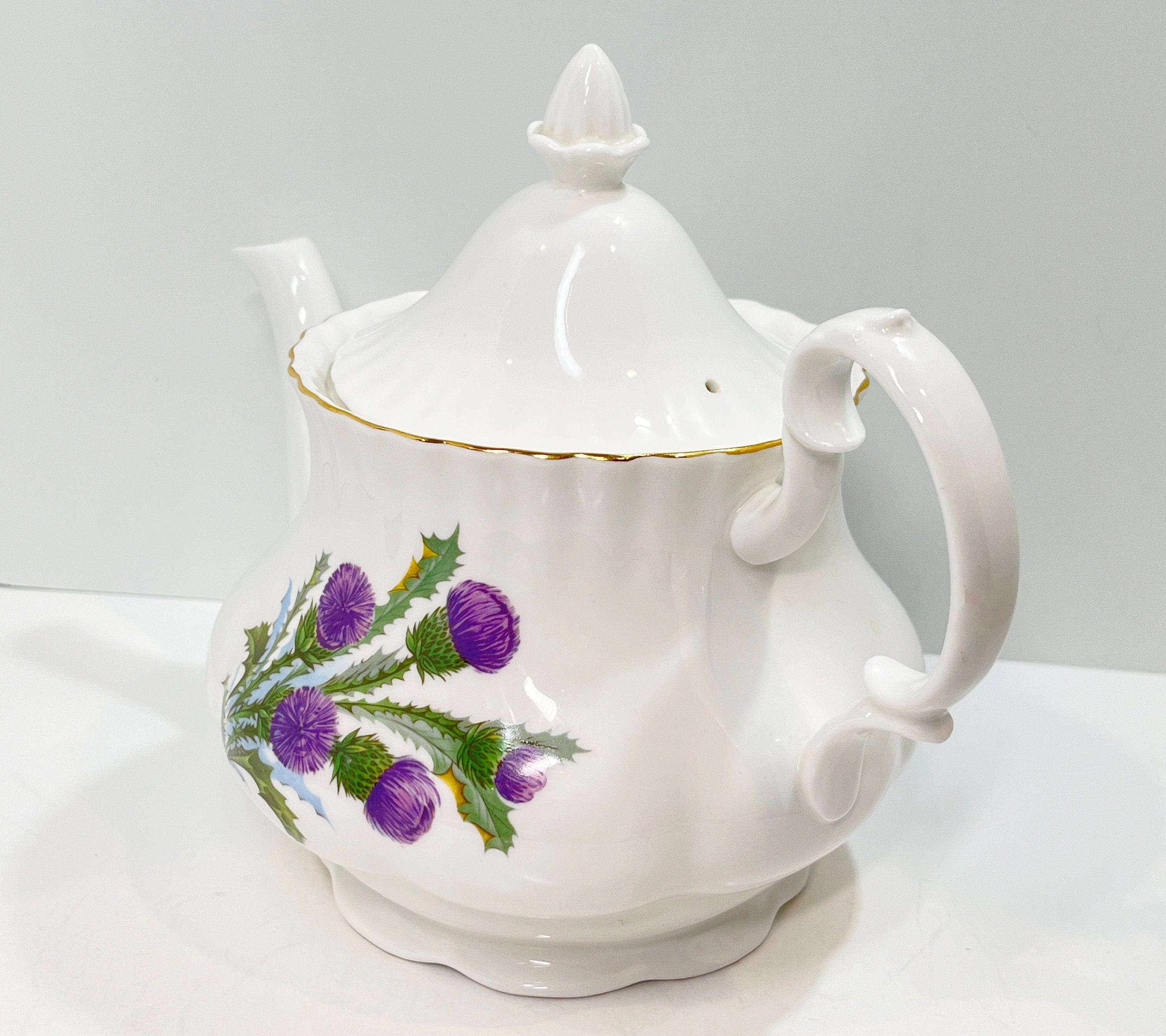 This crisp, clear, vibrant teapot is by Royal Vale Bone China of England.