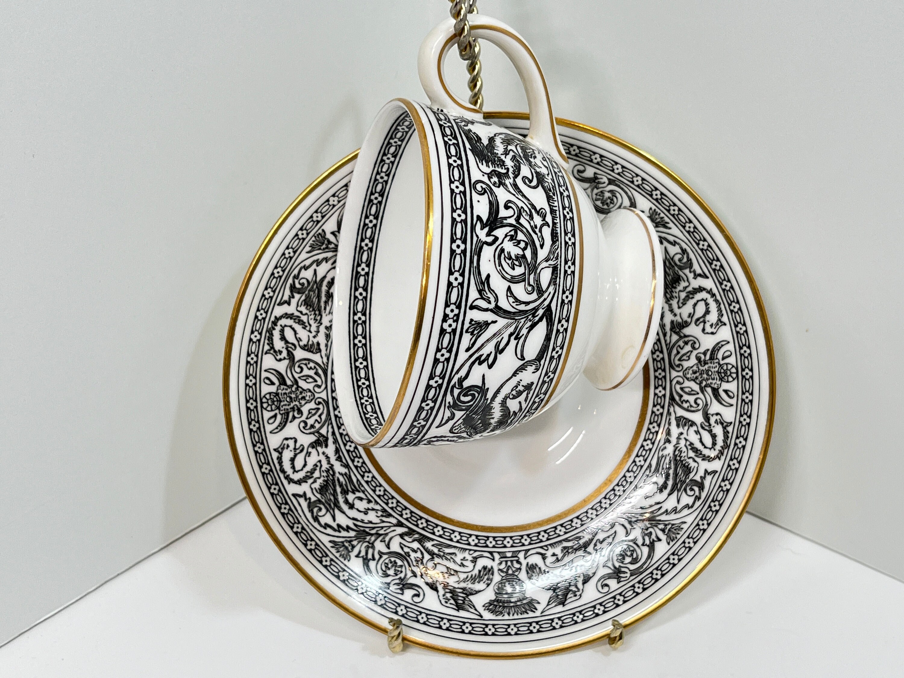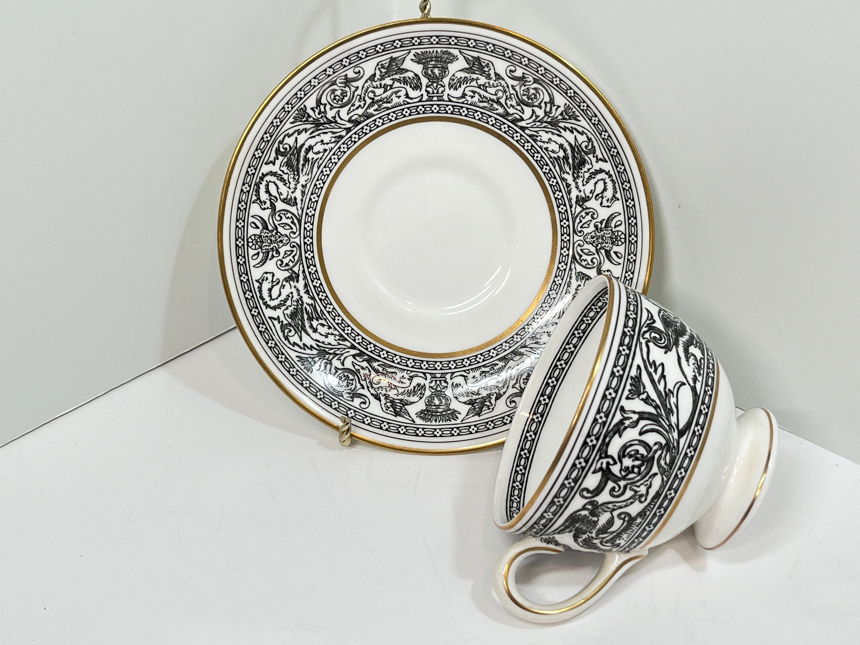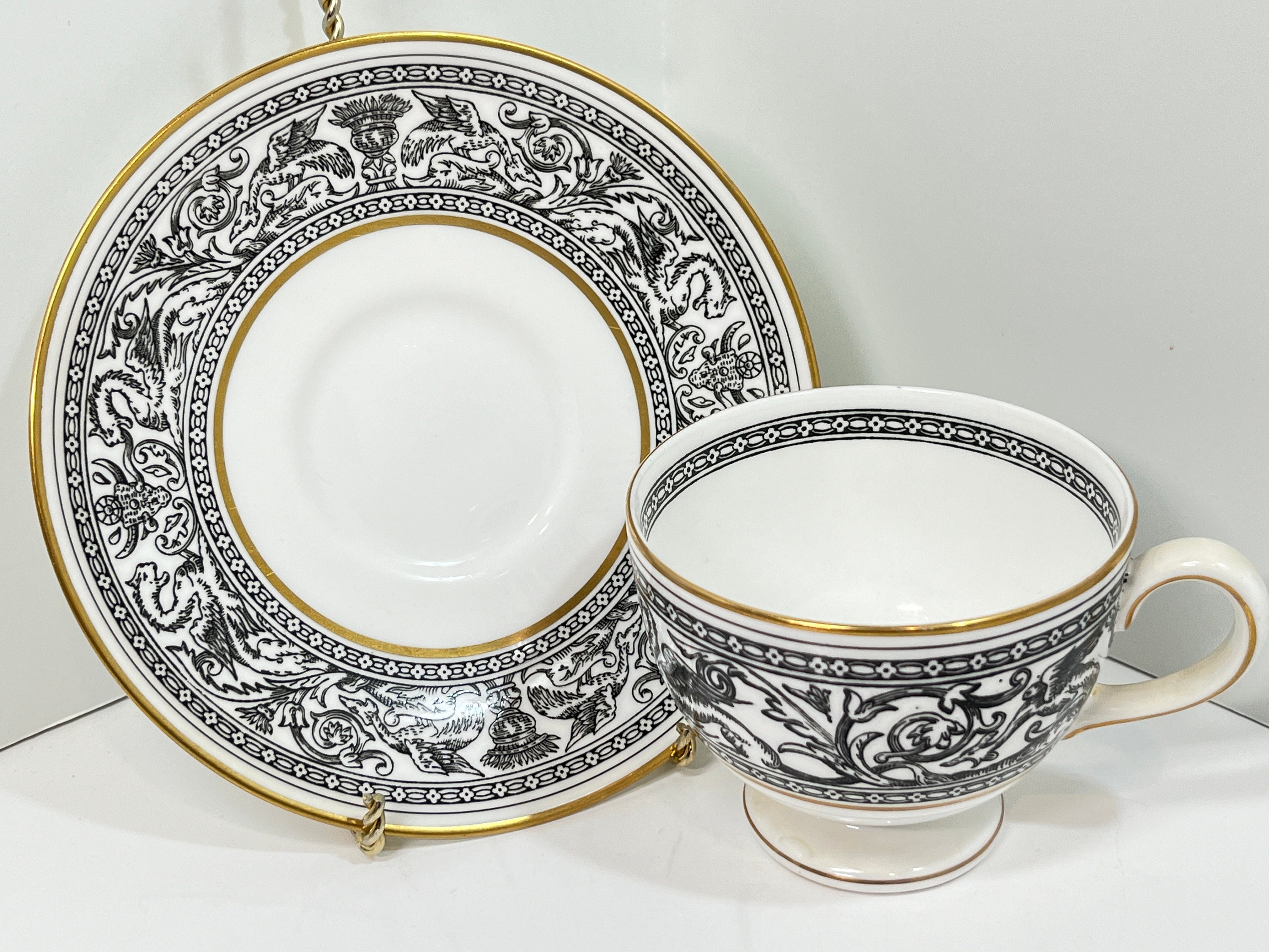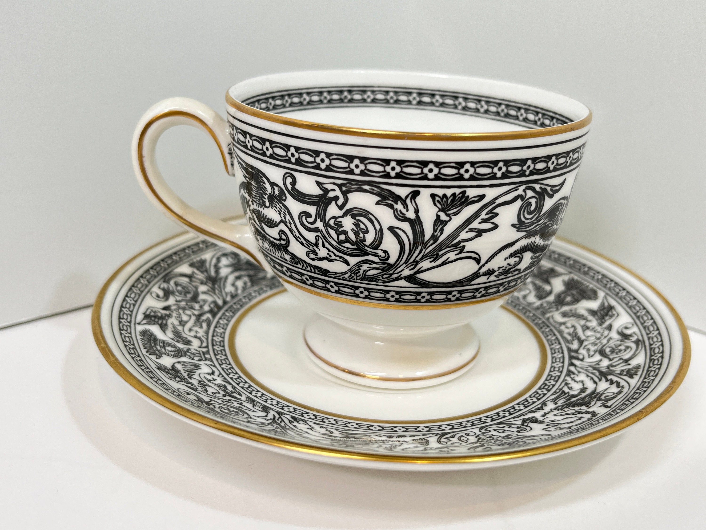 Offering a lustrous Wedgwood Bone China tea cup and saucer in the Florentine Black pattern number W4312, crafted between 1959 and 1997, but now discontinued.