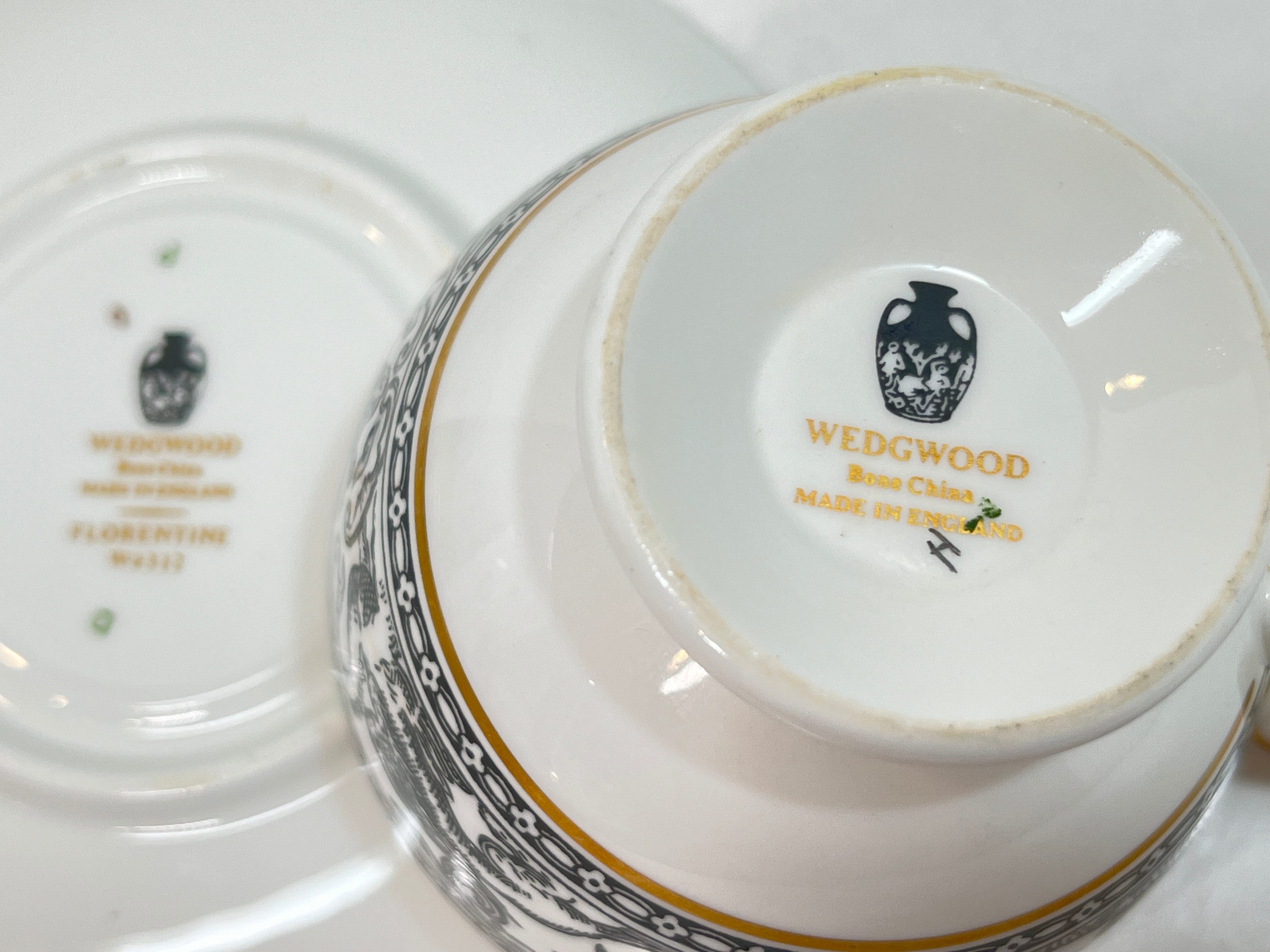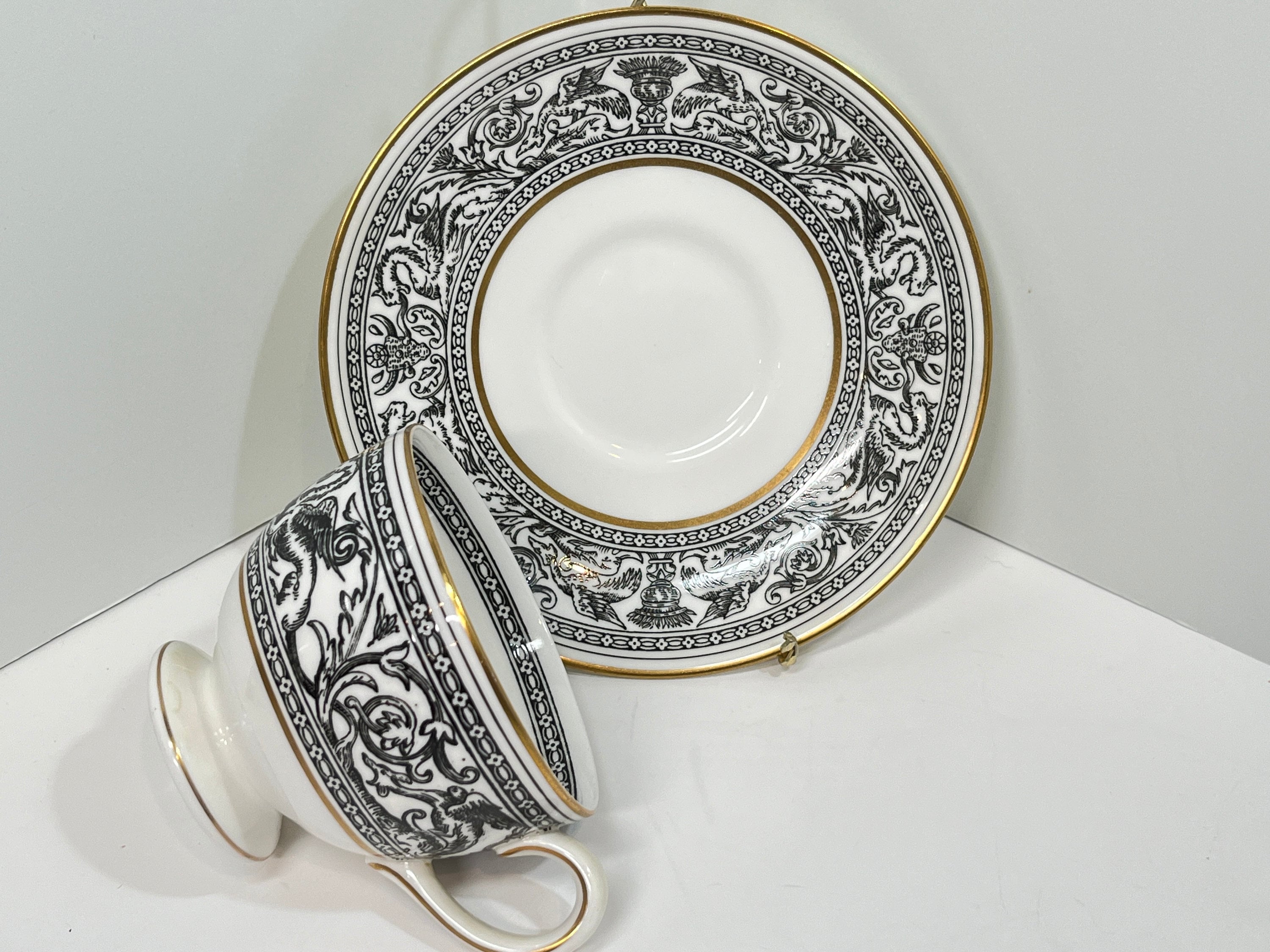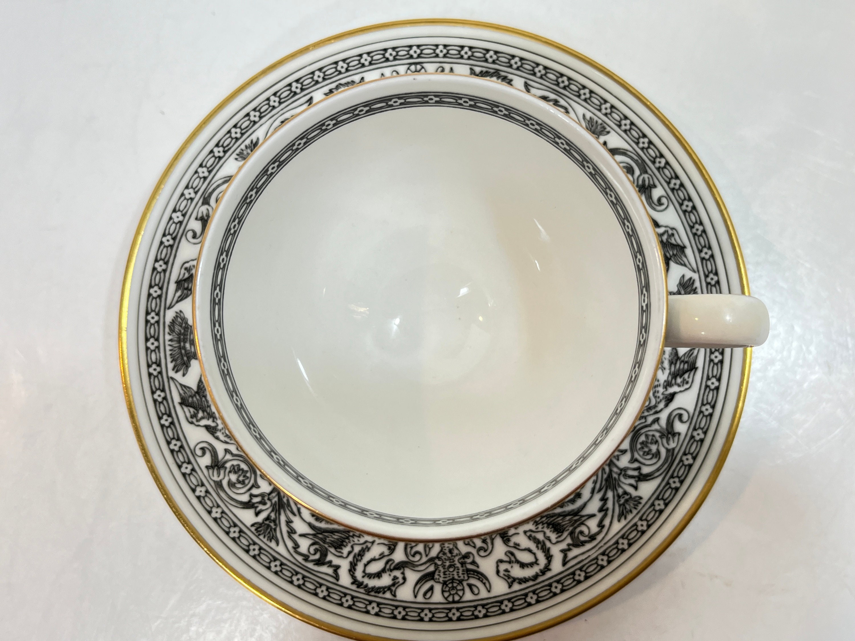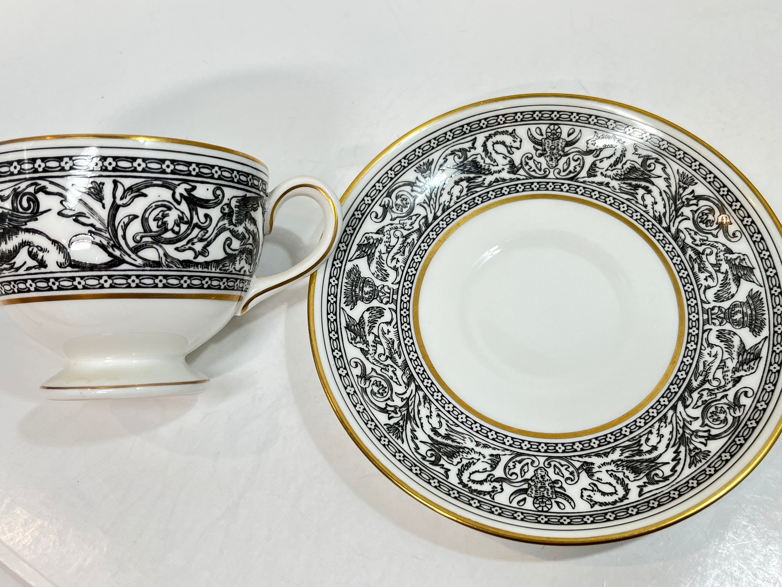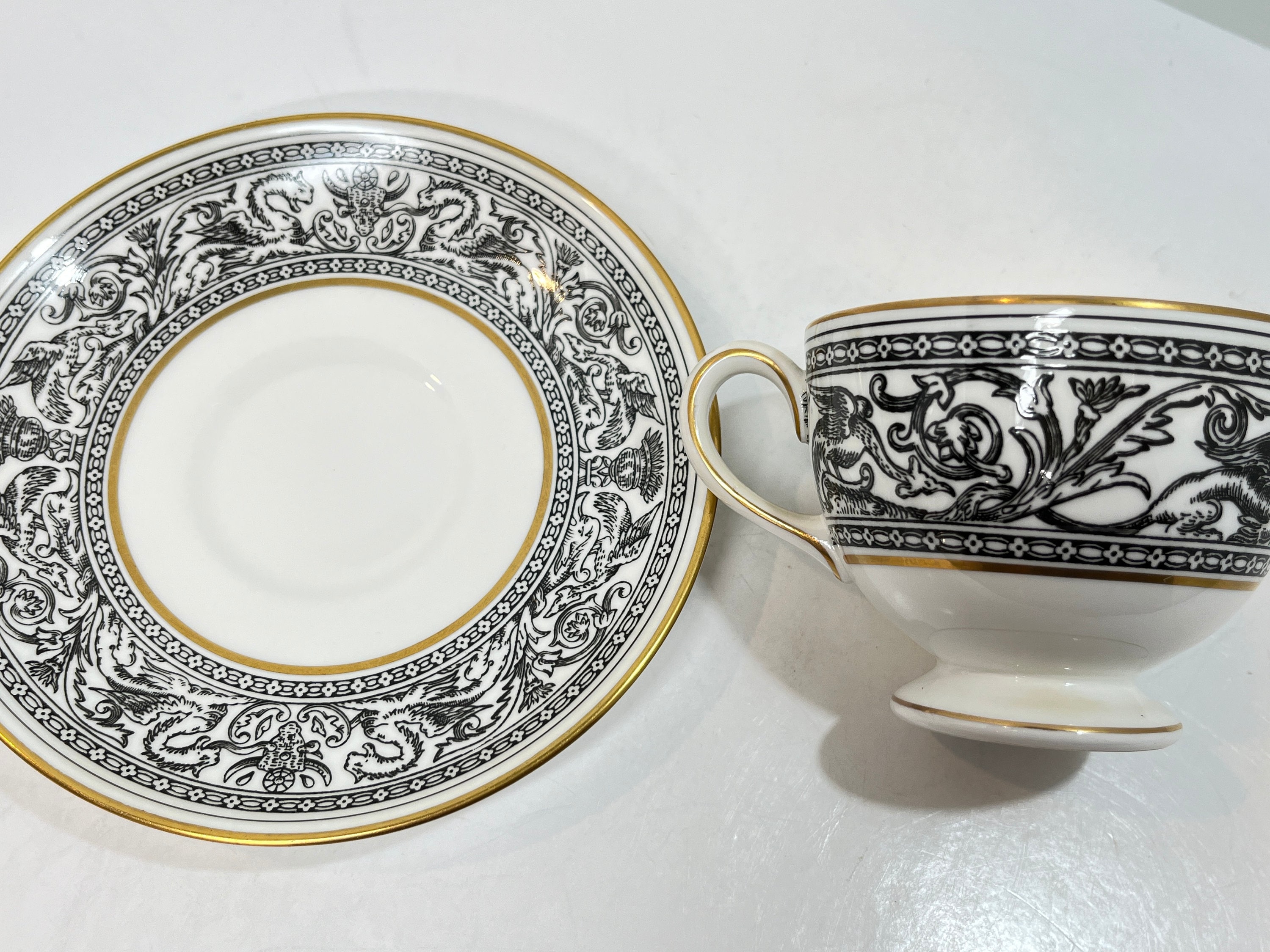 Offering a lustrous Wedgwood Bone China tea cup and saucer in the Florentine Black pattern number W4312, crafted between 1959 and 1997, but now discontinued.