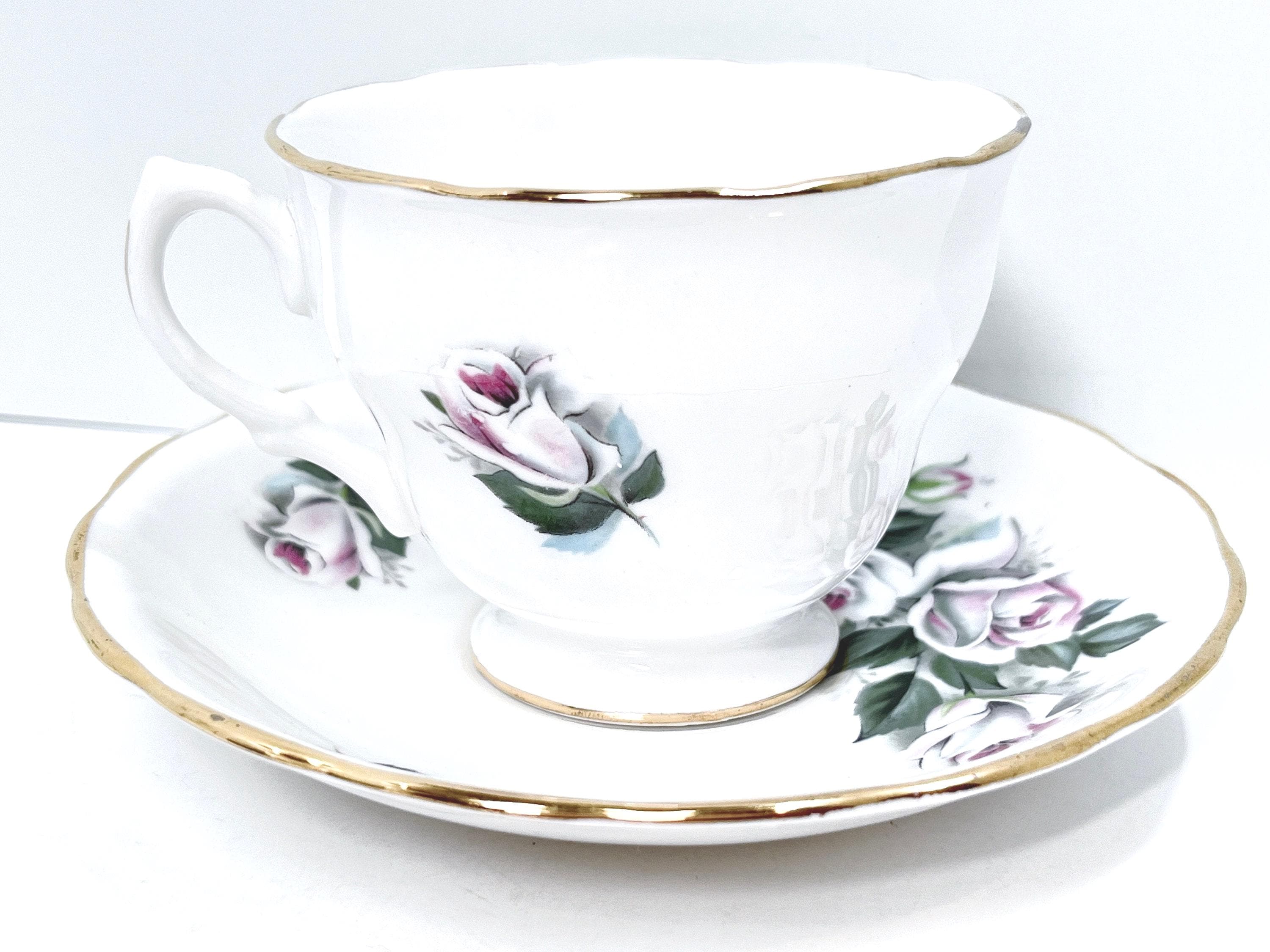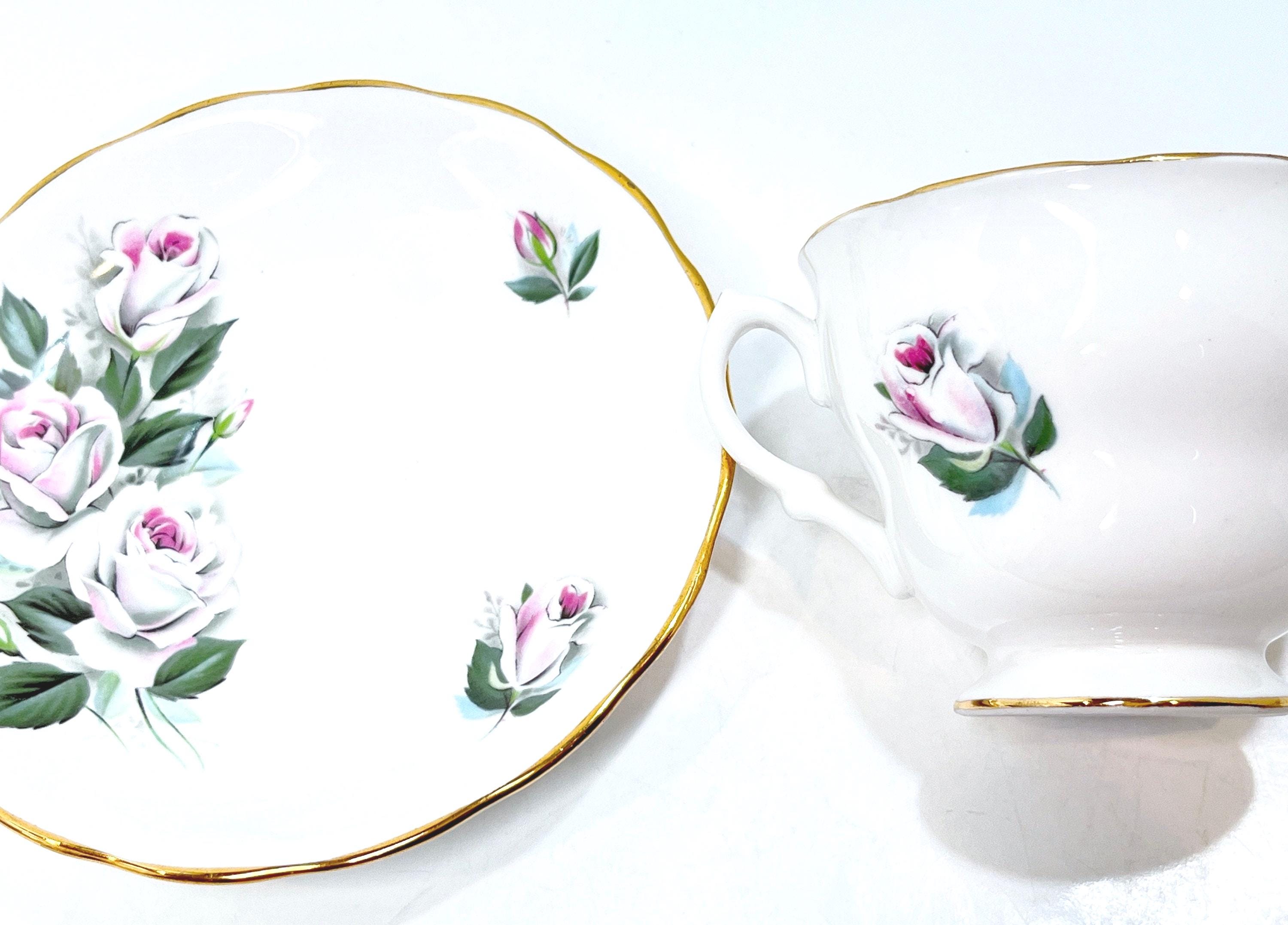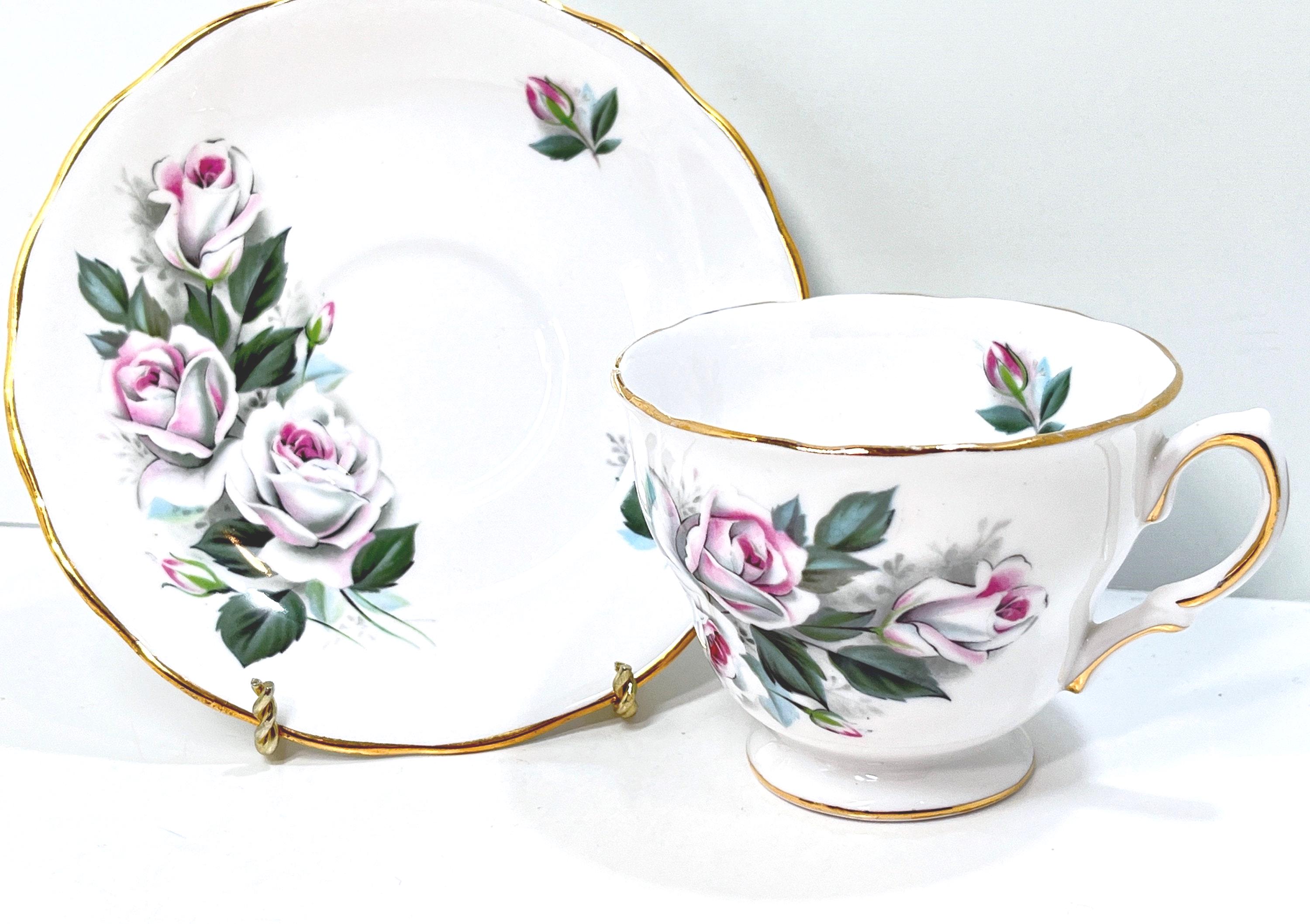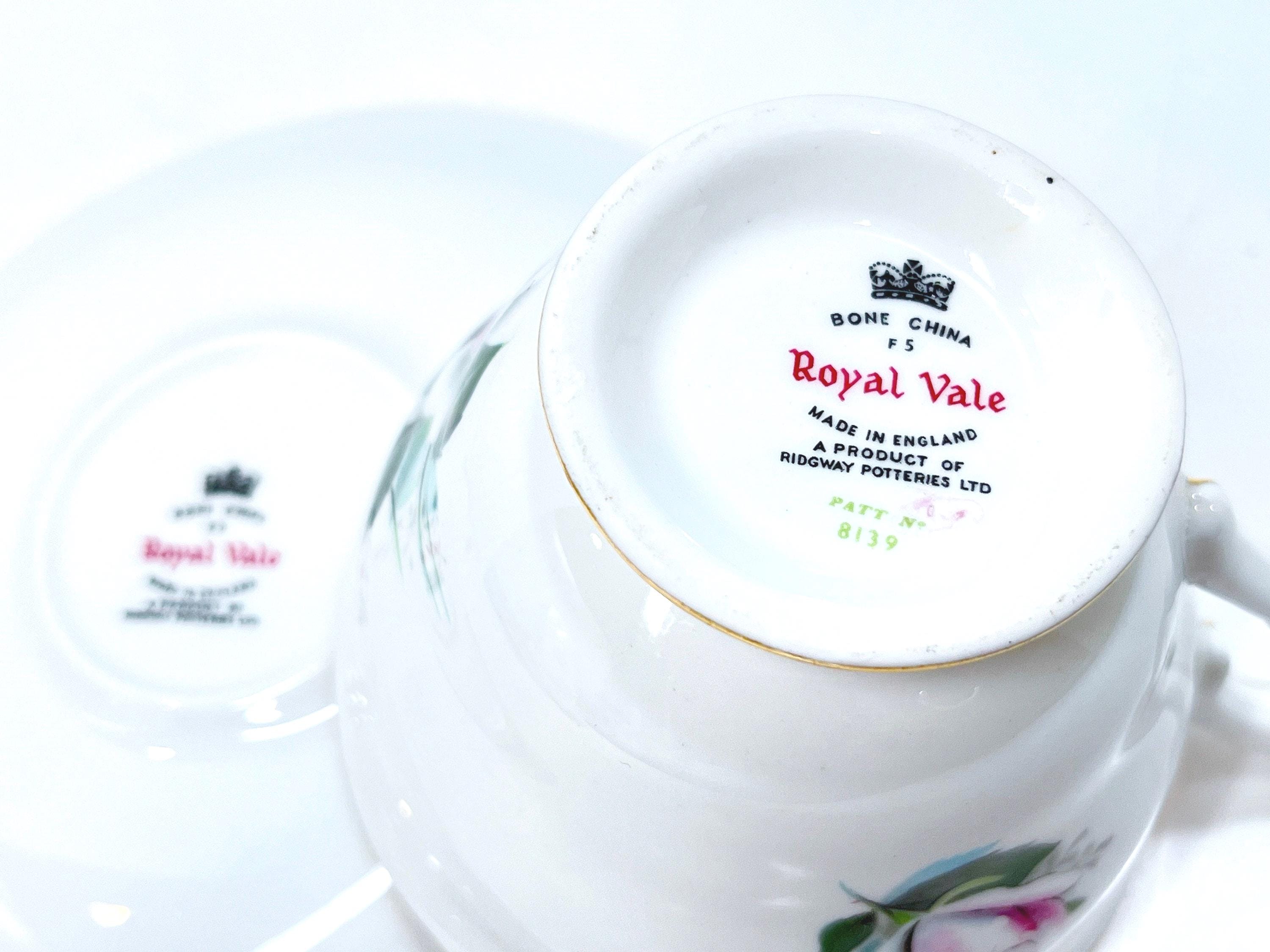 Pink roses, symbolizing gentleness and love, are also the birth flower for June. This teacup and saucer, trimmed in gold, add the perfect finishing touch. Crafted in the 1950s by Royal Vale Bone China of England, this glossy, footed tea set was produced by one of Ridgway Potteries' upscale divisions, known for their quality bone china. They were part of the world-famous Staffordshire potteries.