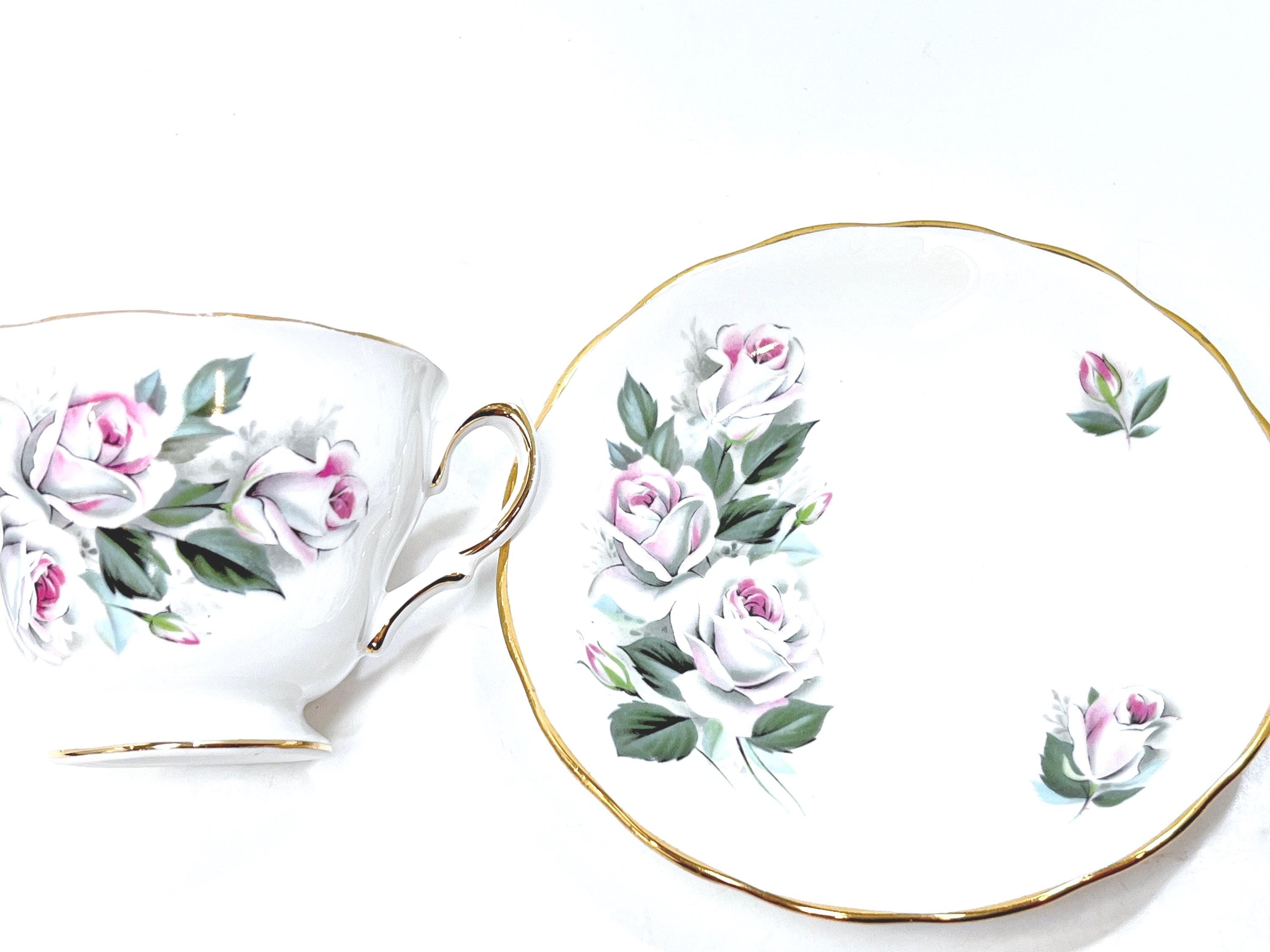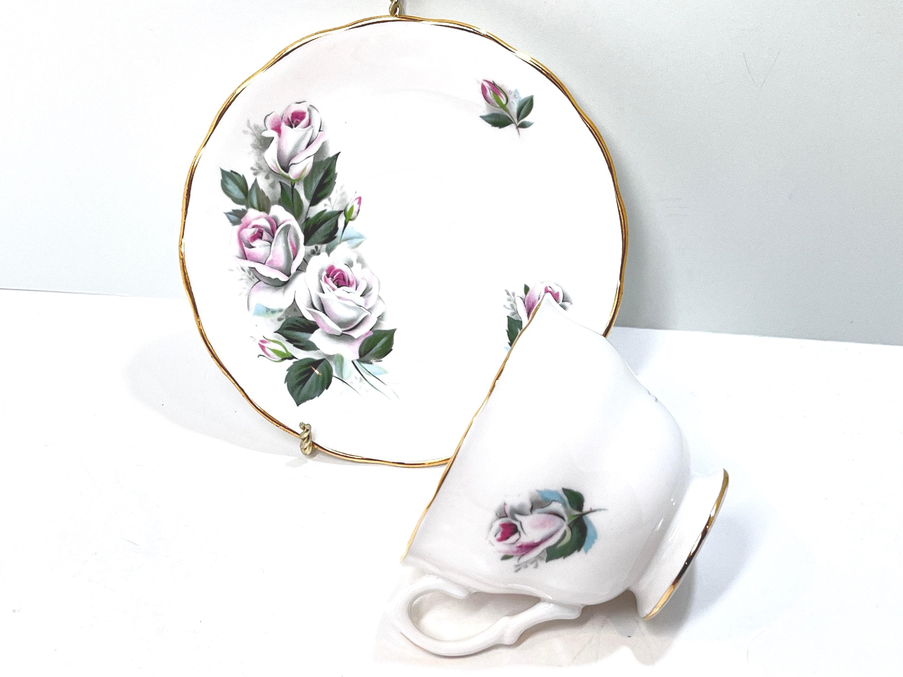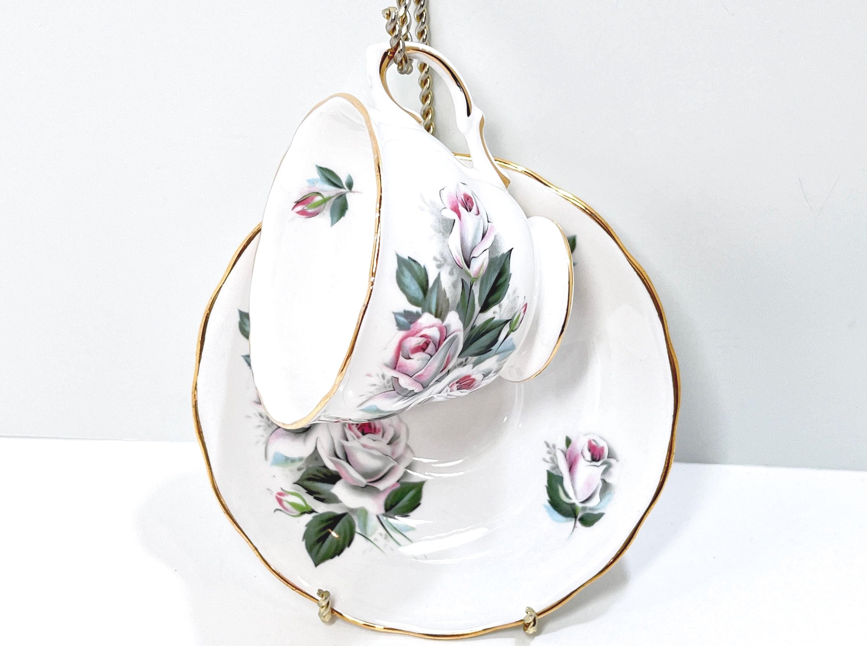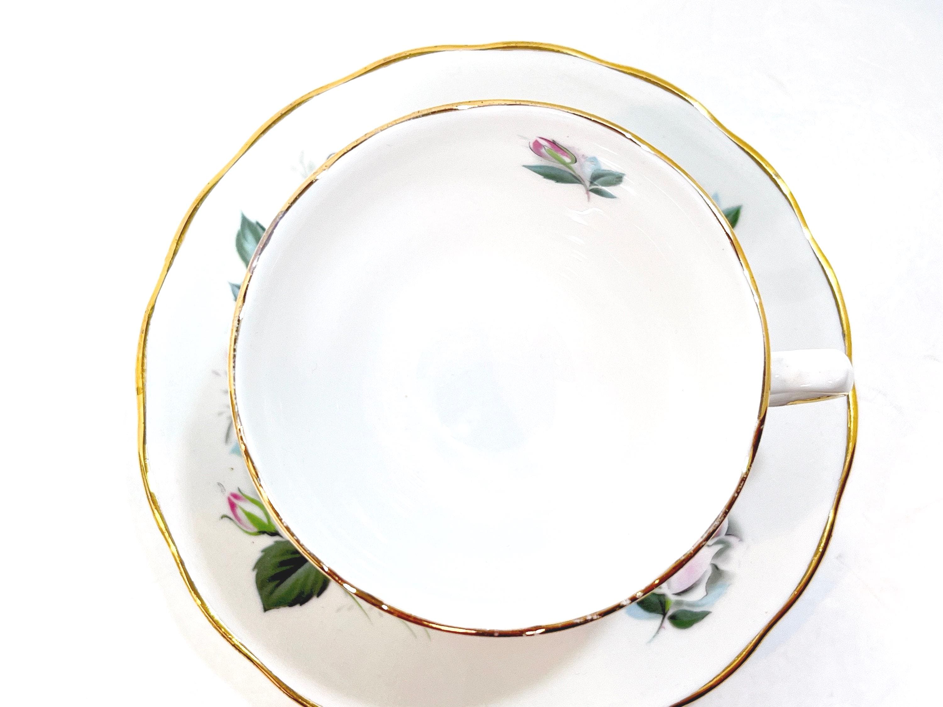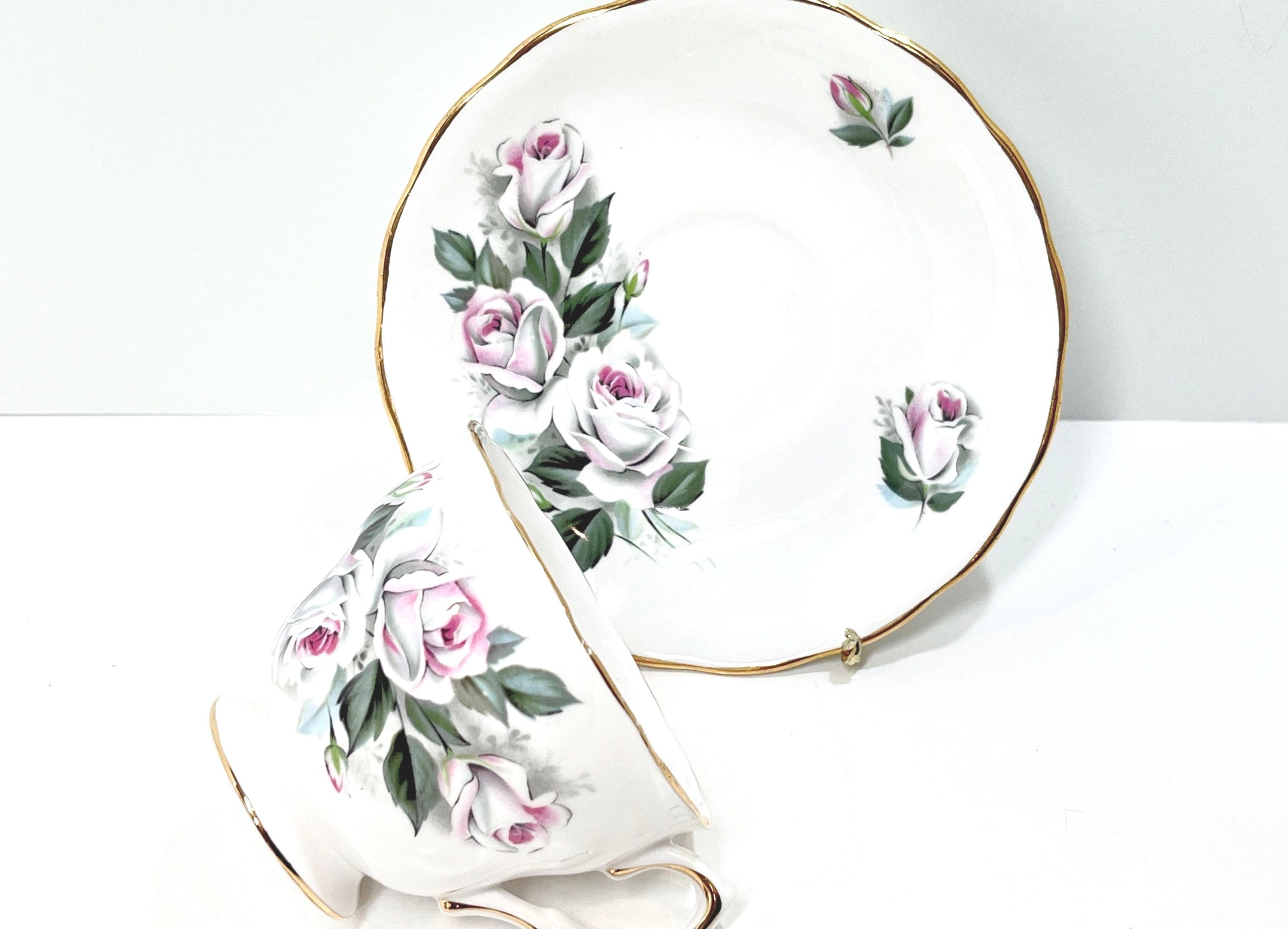 Pink roses, symbolizing gentleness and love, are also the birth flower for June. This teacup and saucer, trimmed in gold, add the perfect finishing touch. Crafted in the 1950s by Royal Vale Bone China of England, this glossy, footed tea set was produced by one of Ridgway Potteries' upscale divisions, known for their quality bone china. They were part of the world-famous Staffordshire potteries.