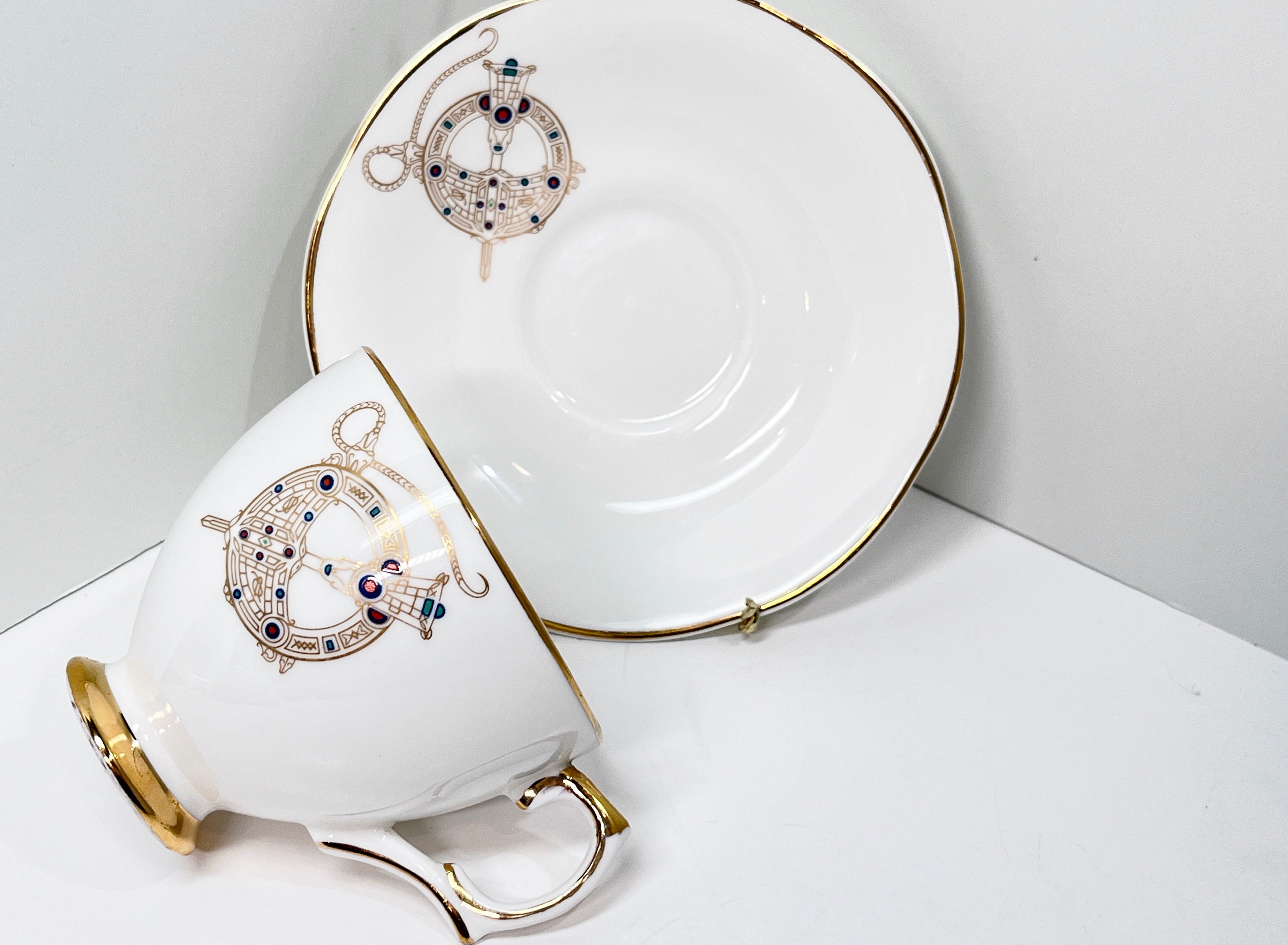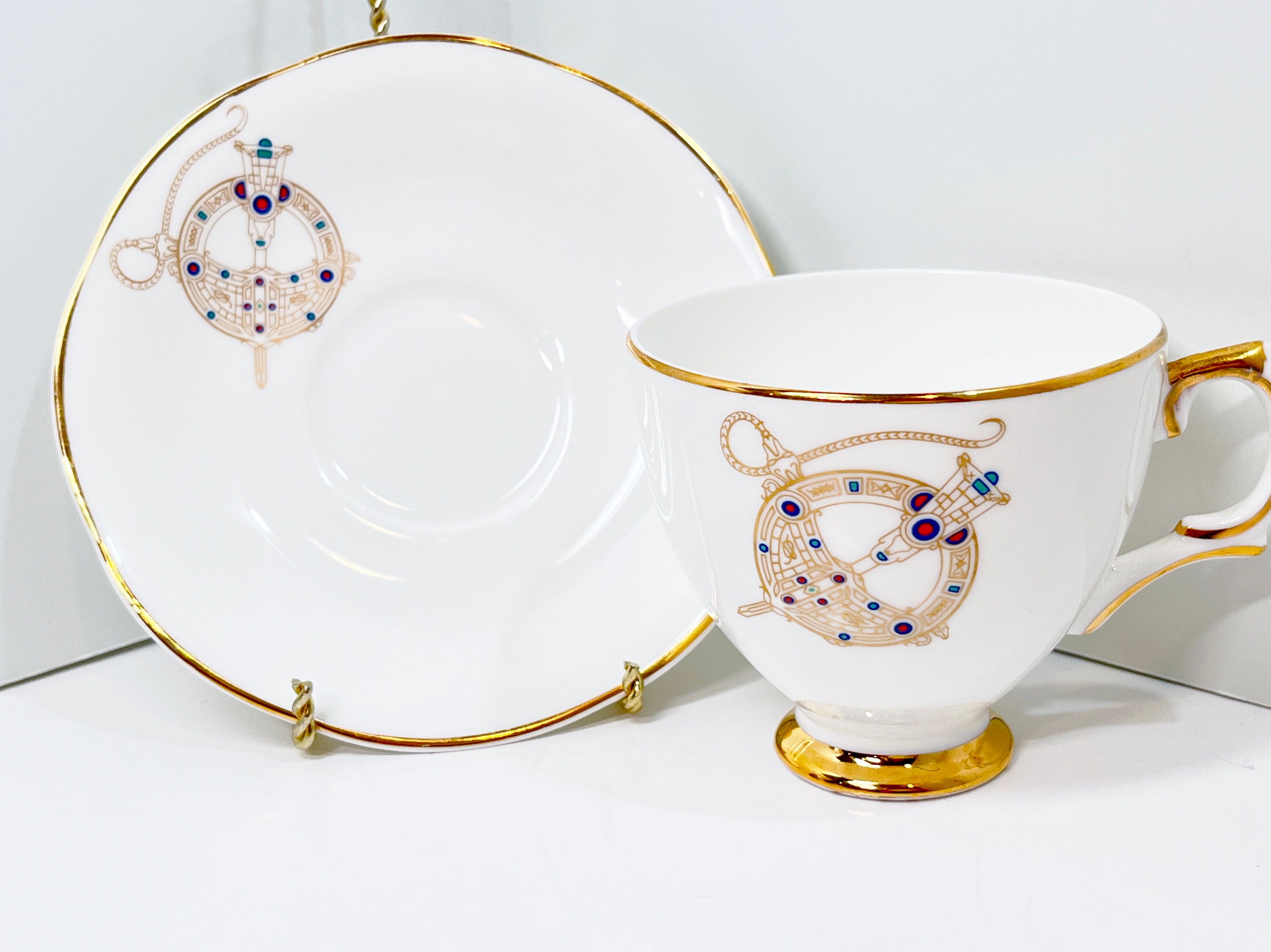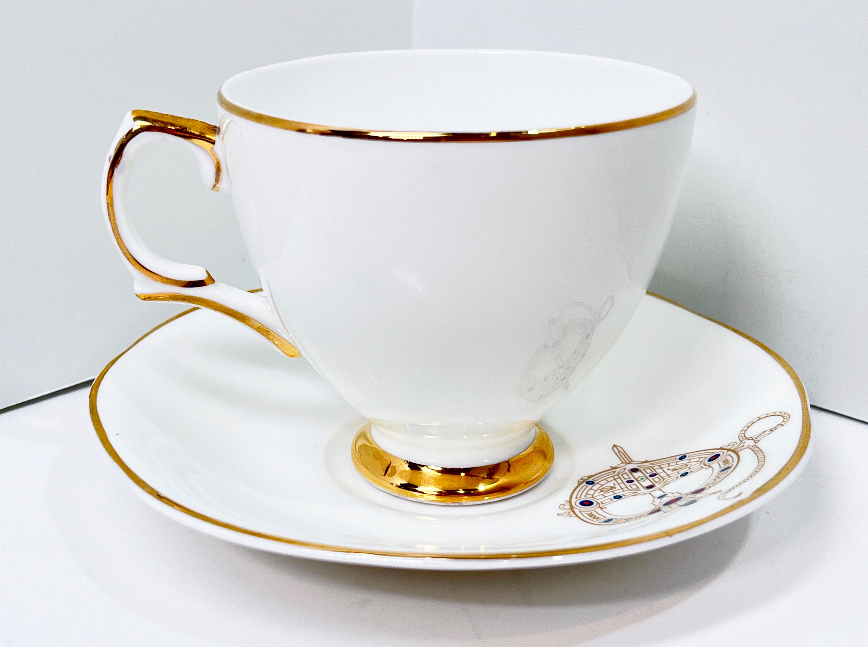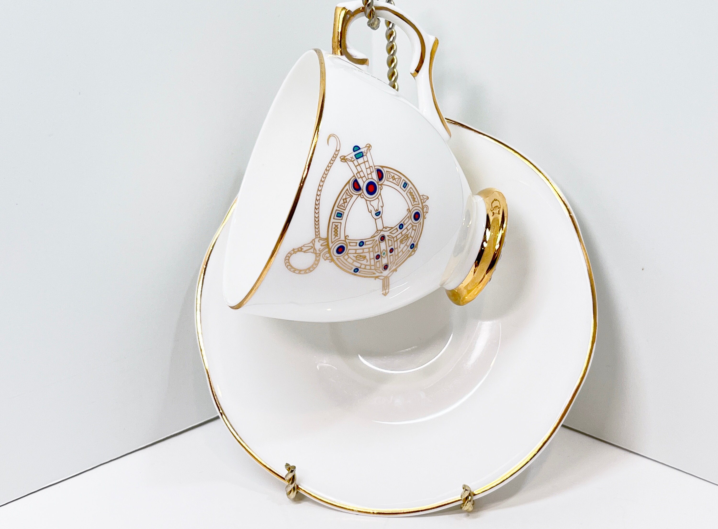 This alluring bone china teacup and saucer is by Royal Tara Bone China of Ireland. The pattern is Tara Brooch.