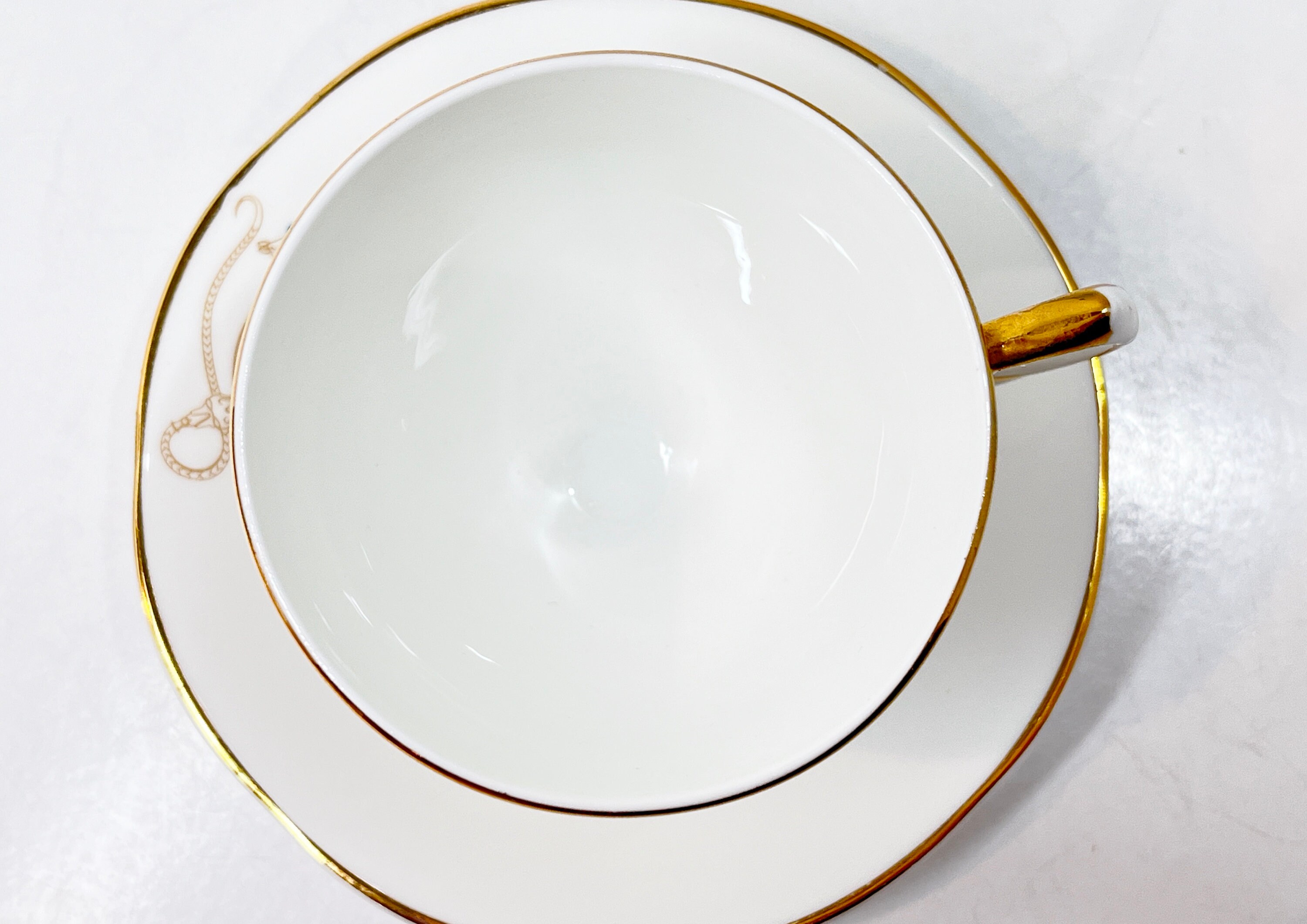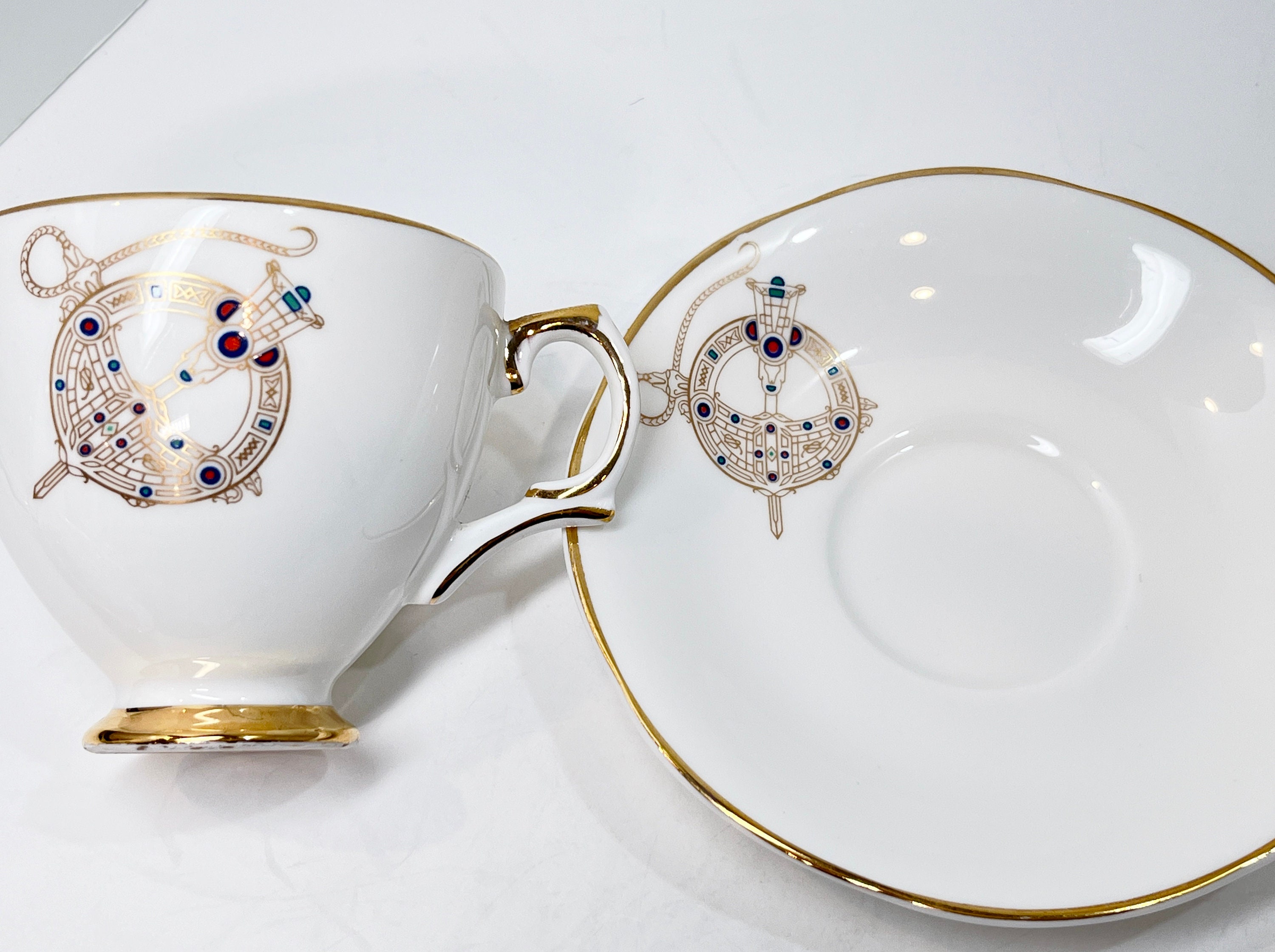 Enjoy the brooch design which is trimmed in gilt on the edges, handle and footed cup.