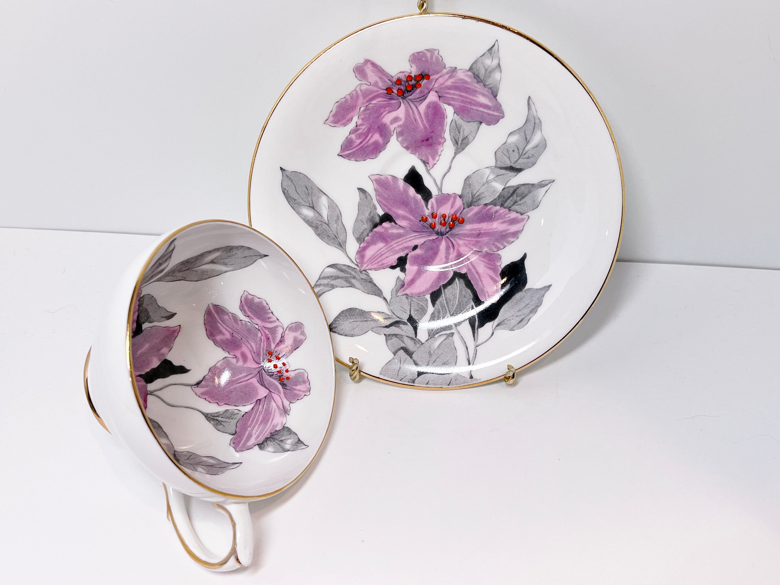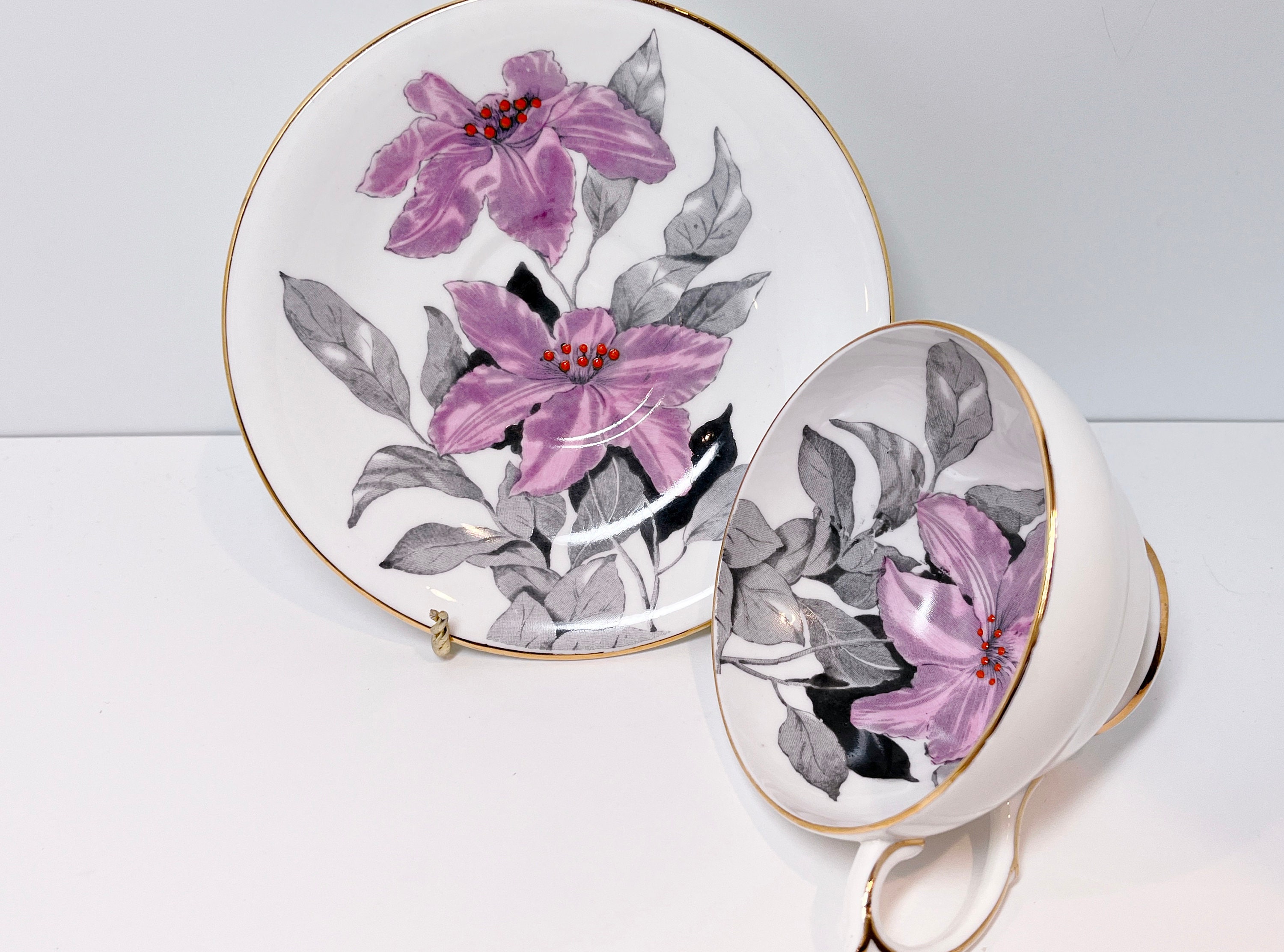 Clarence Bone China of England has created this sophisticated, gorgeous teacup and saucer. The trim is in gold. The orange stamen have been hand painted.