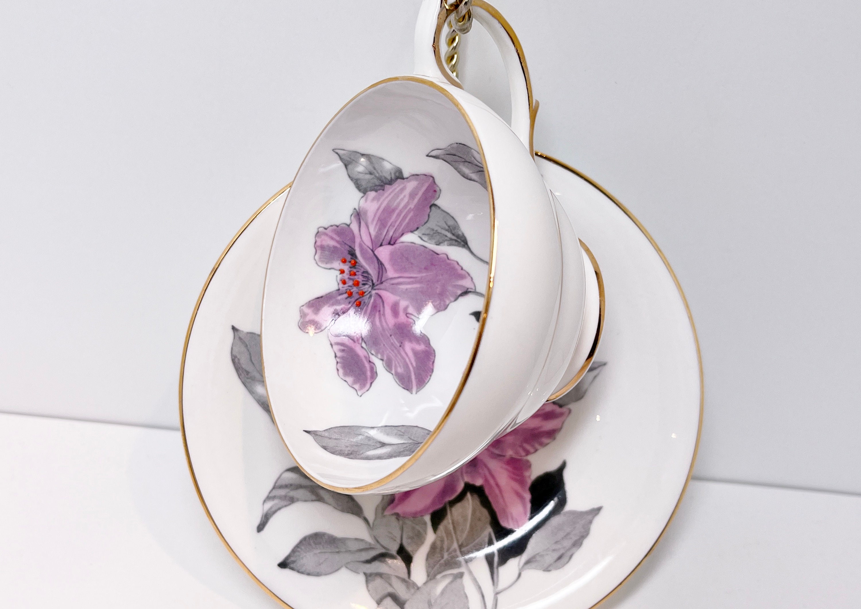 As the seasons change, enjoy a hot cup of tea in a lovely, floral teacup and saucer. The blossom is in an unusual color and so pleasing. Teatime takes on another pleasure with the shape of the English bone china.