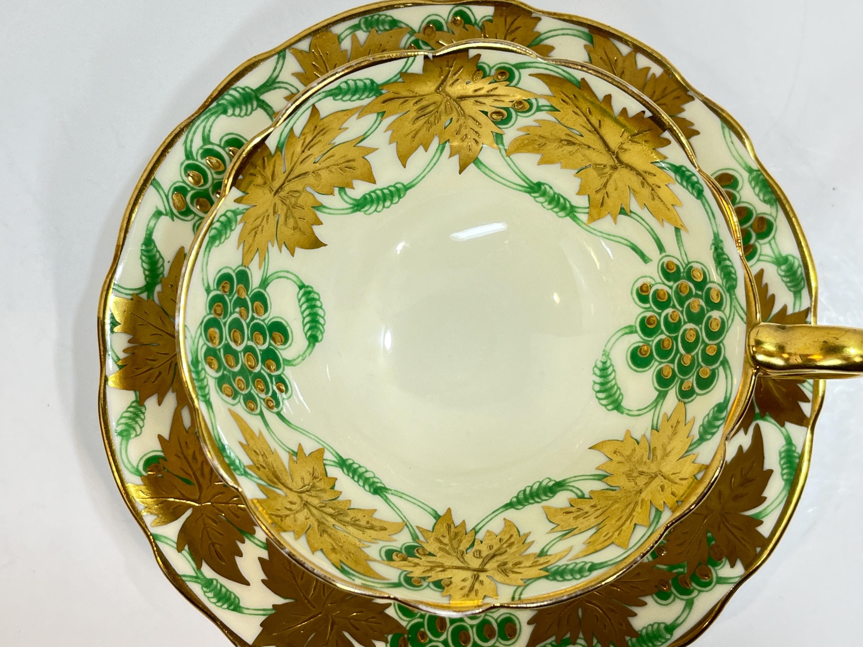 This antique teacup and saucer glistens in the light. The golden leaves repeat throughout the classic gold trim while wisps of green vines and grapes are scattered throughout. The scalloped edges and teacup foot are all in gold.
