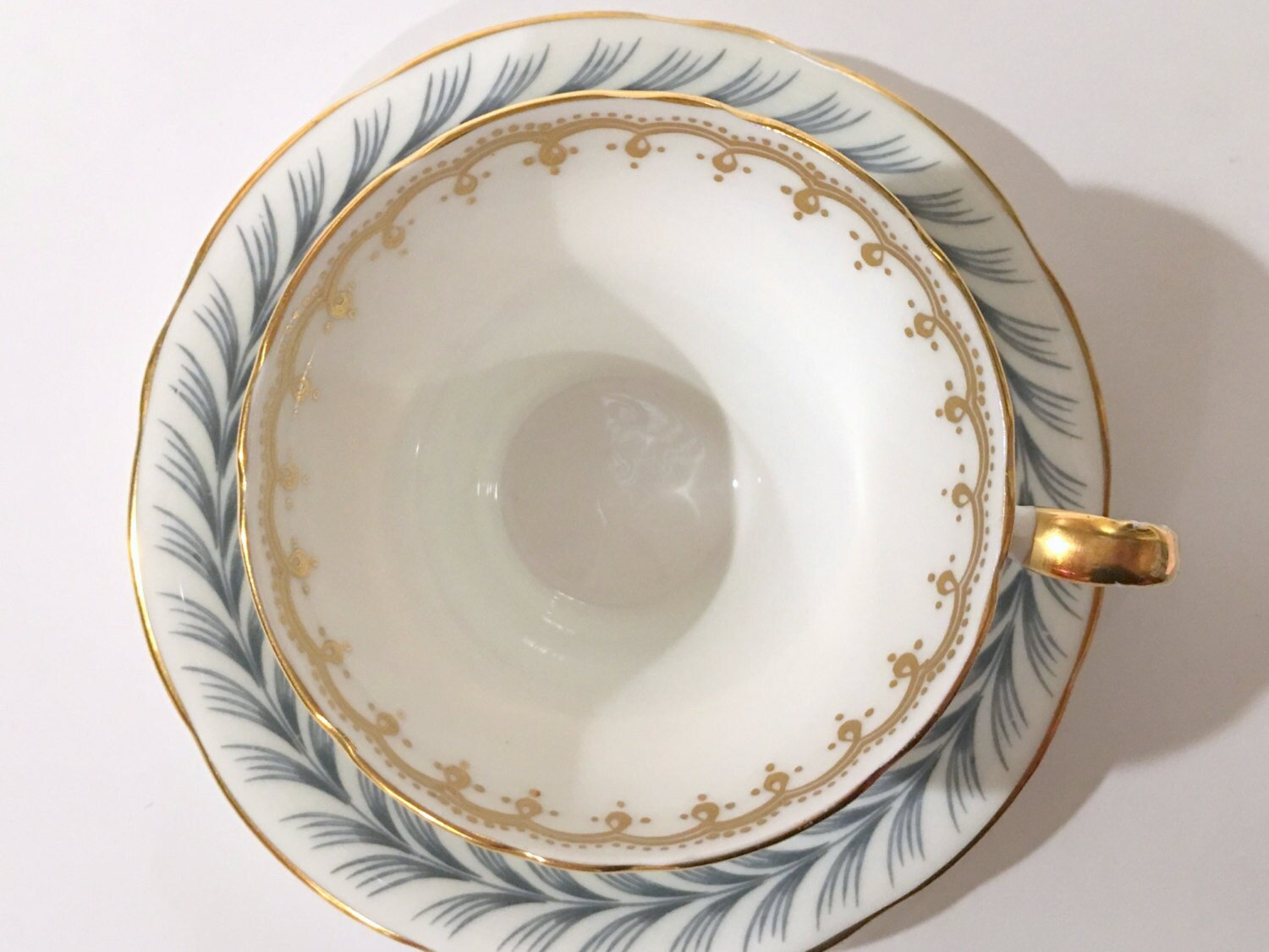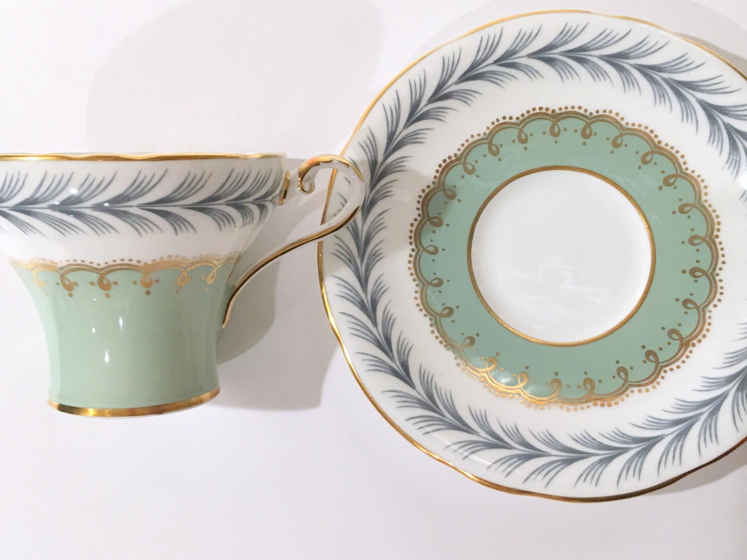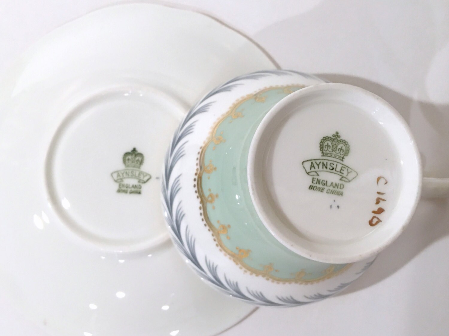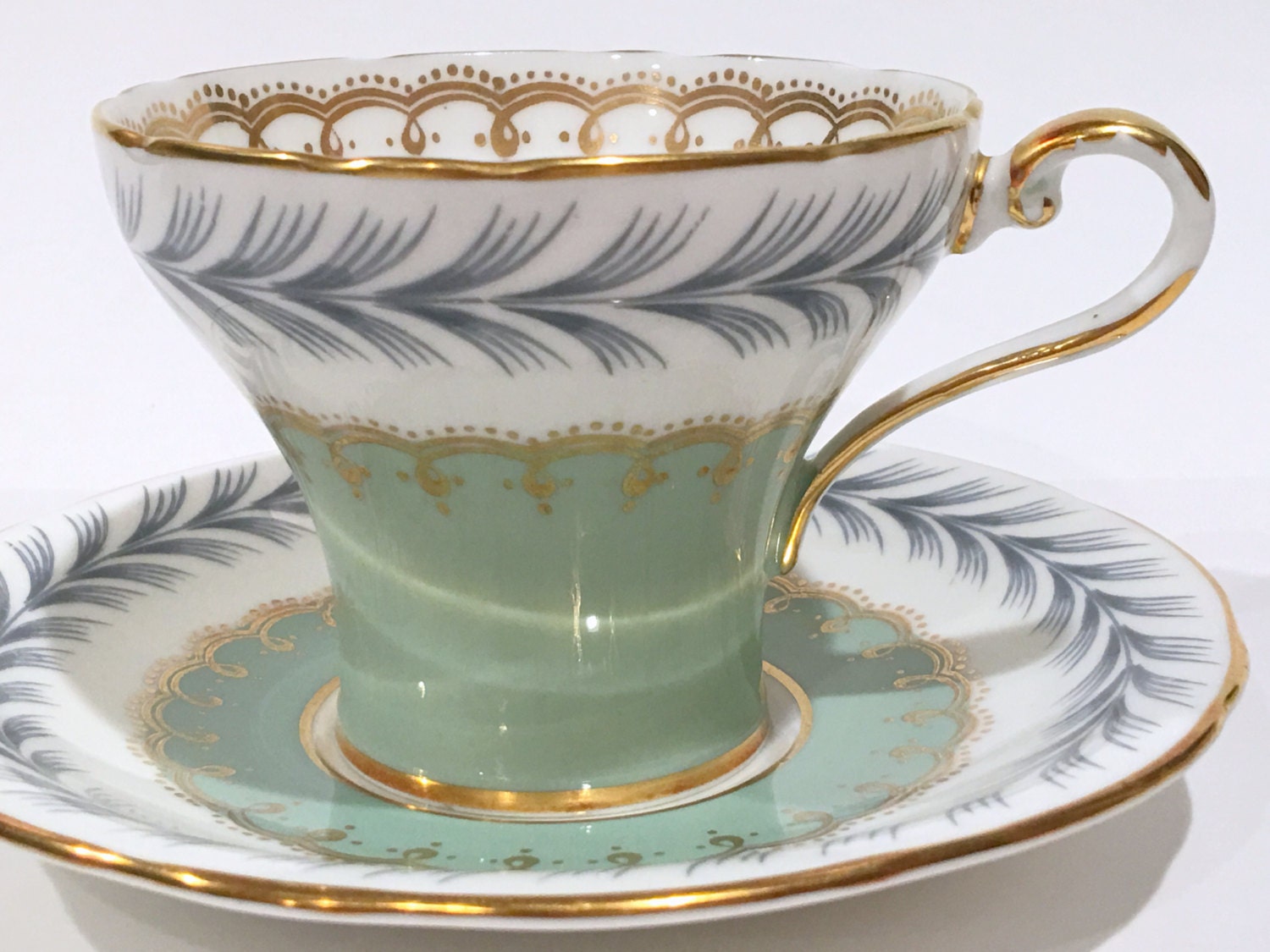 Aynsley Bone China of England crafted this charming green and blue tea cup and saucer in their corset shape style. The gold trim is hand painted.