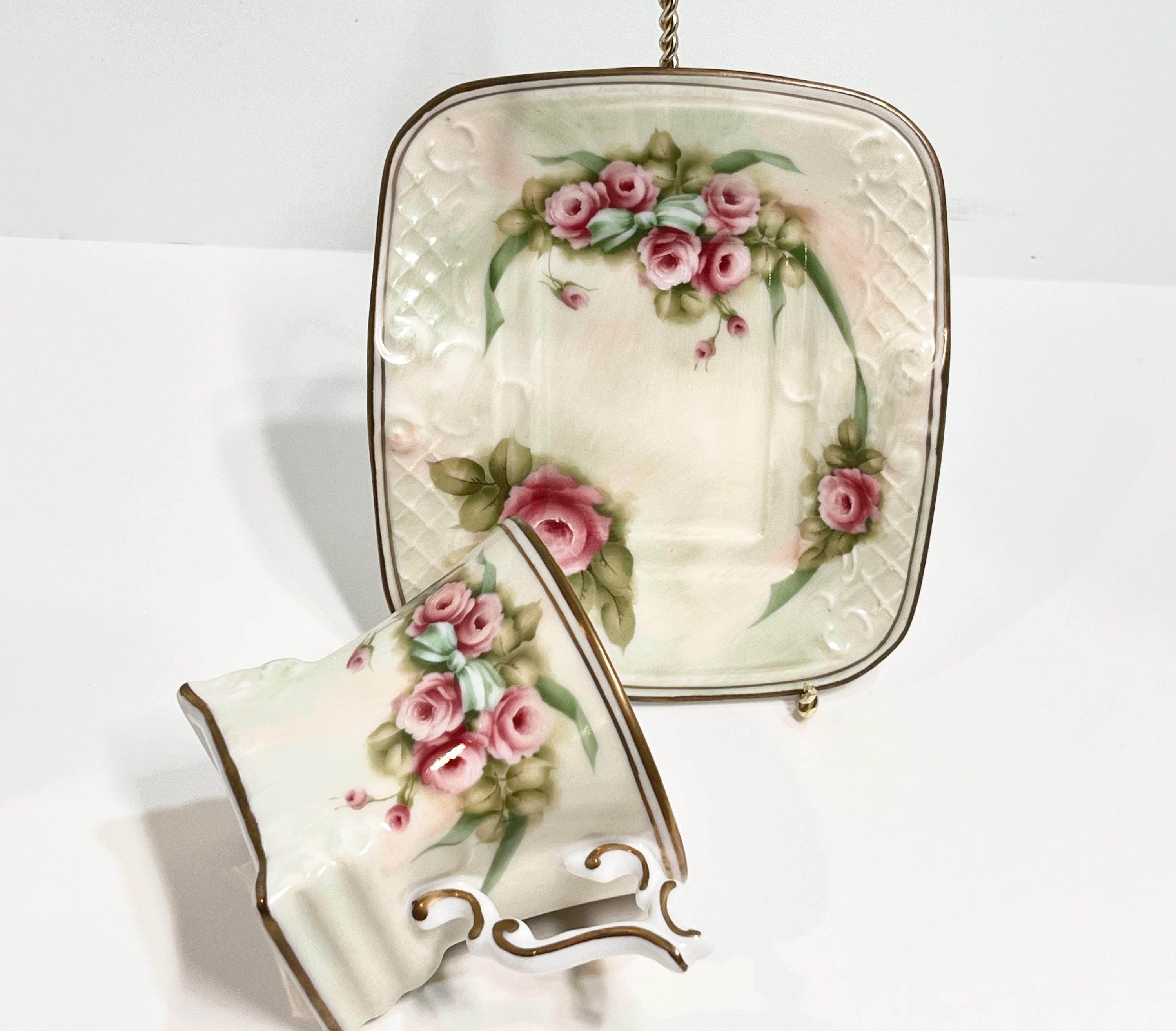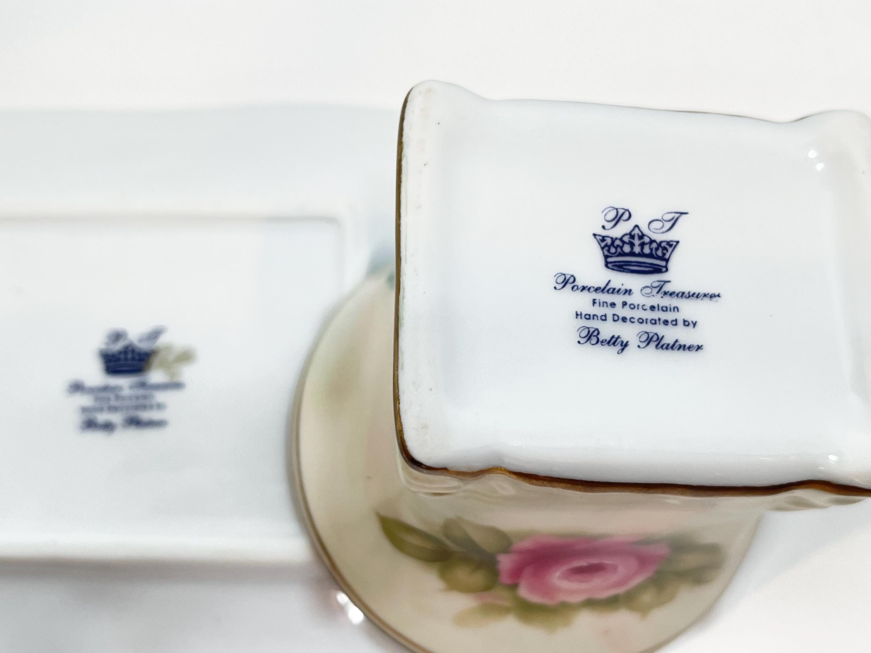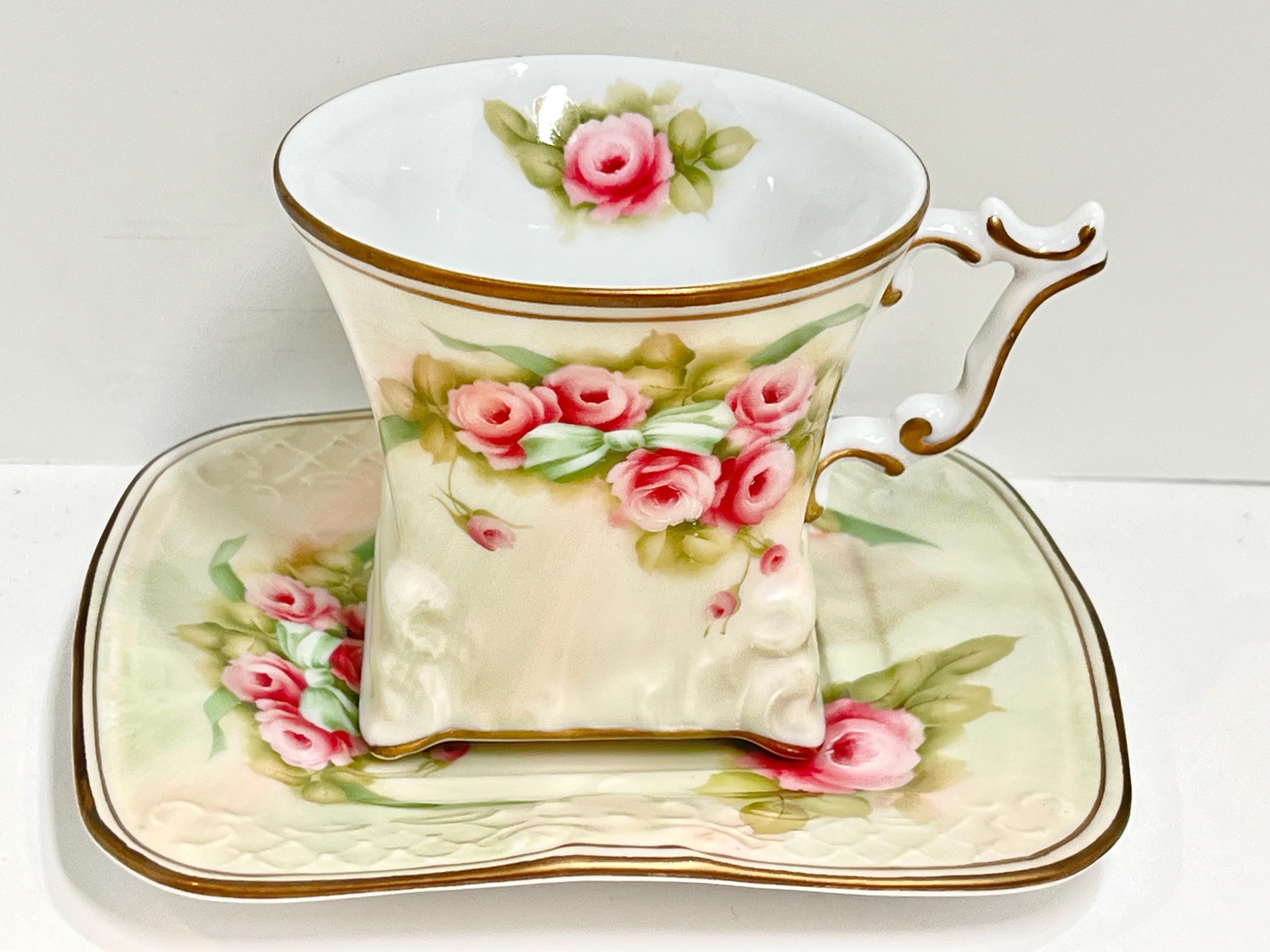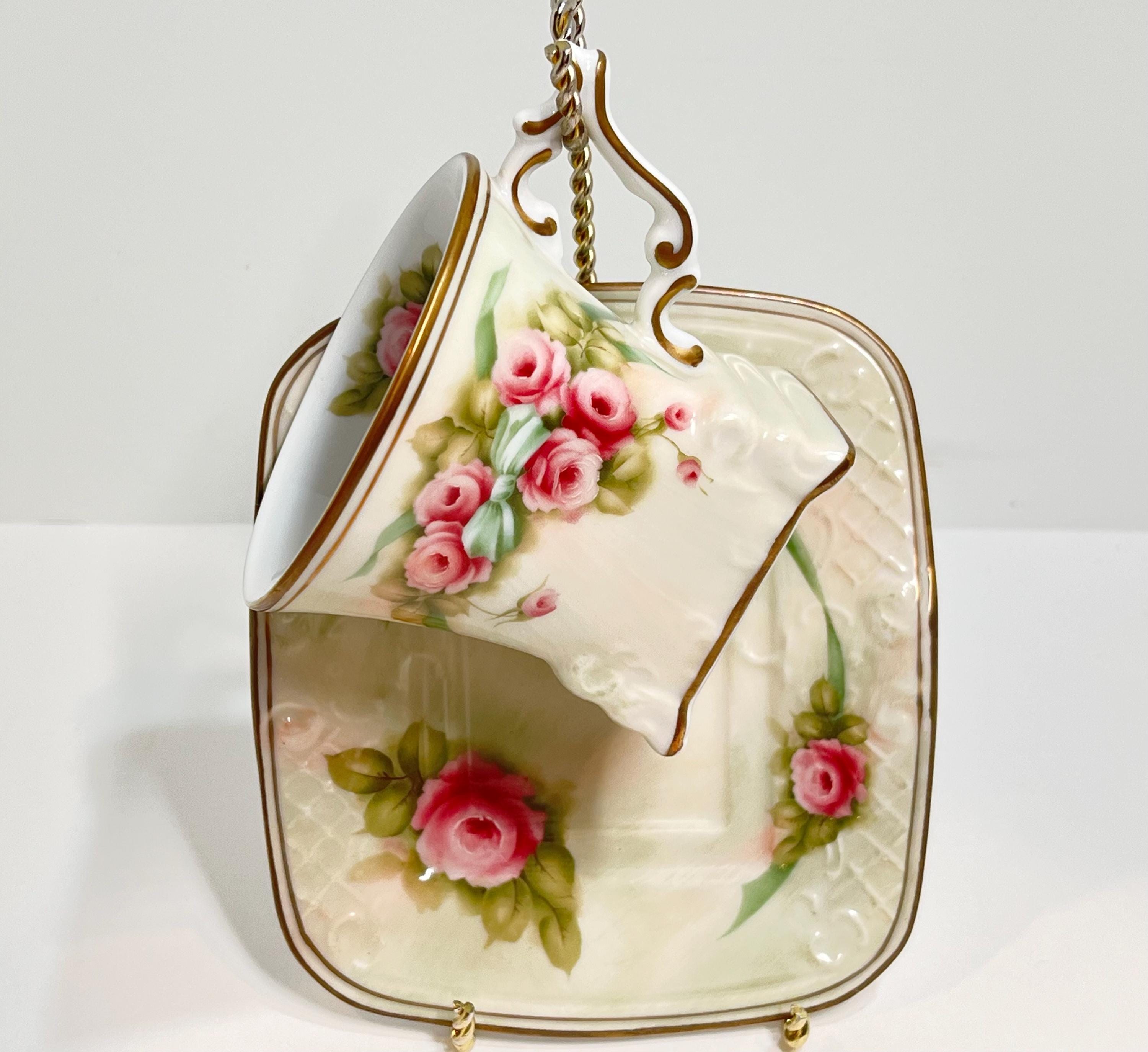 Betty Platner, known for her hand painted porcelain, crafted this glossy, gold trimmed, footed tea cup and saucer. The pink roses and green ribbons are beautiful. There is actually a shape within the saucer and molded design on both pieces. Even the handle is different from standard. The name of her company is Porcelain Treasures. Her logo is PT over a crown.