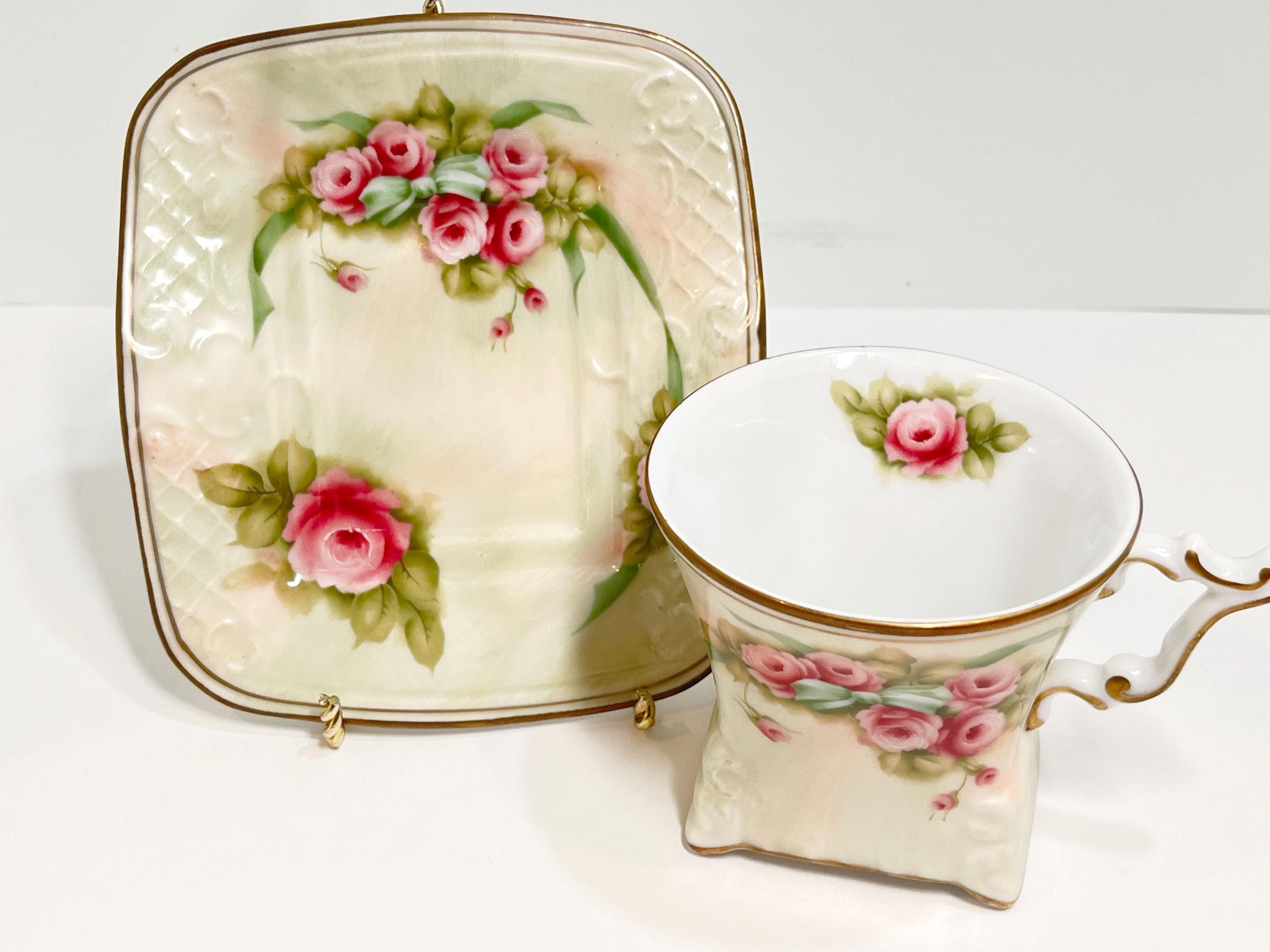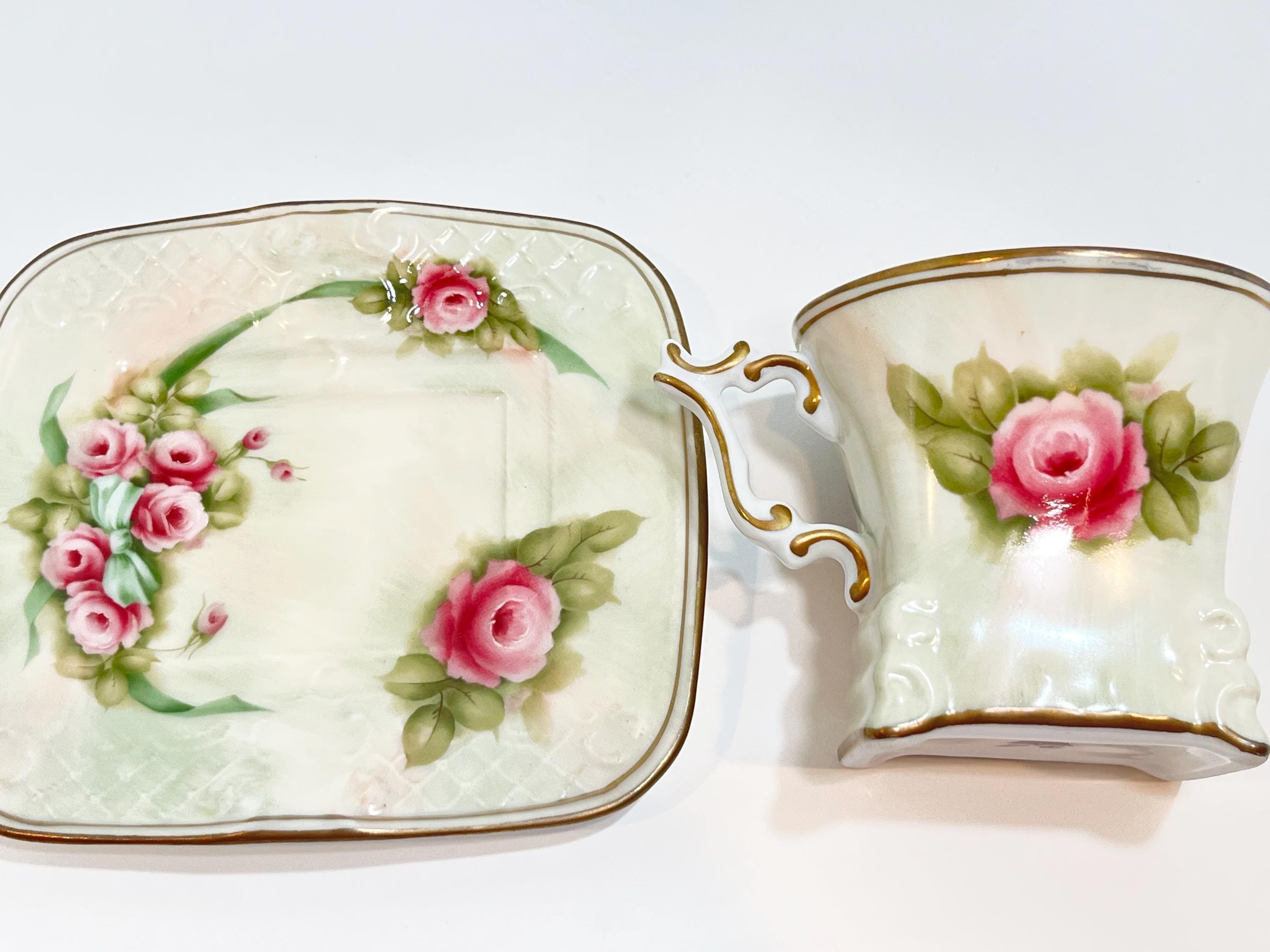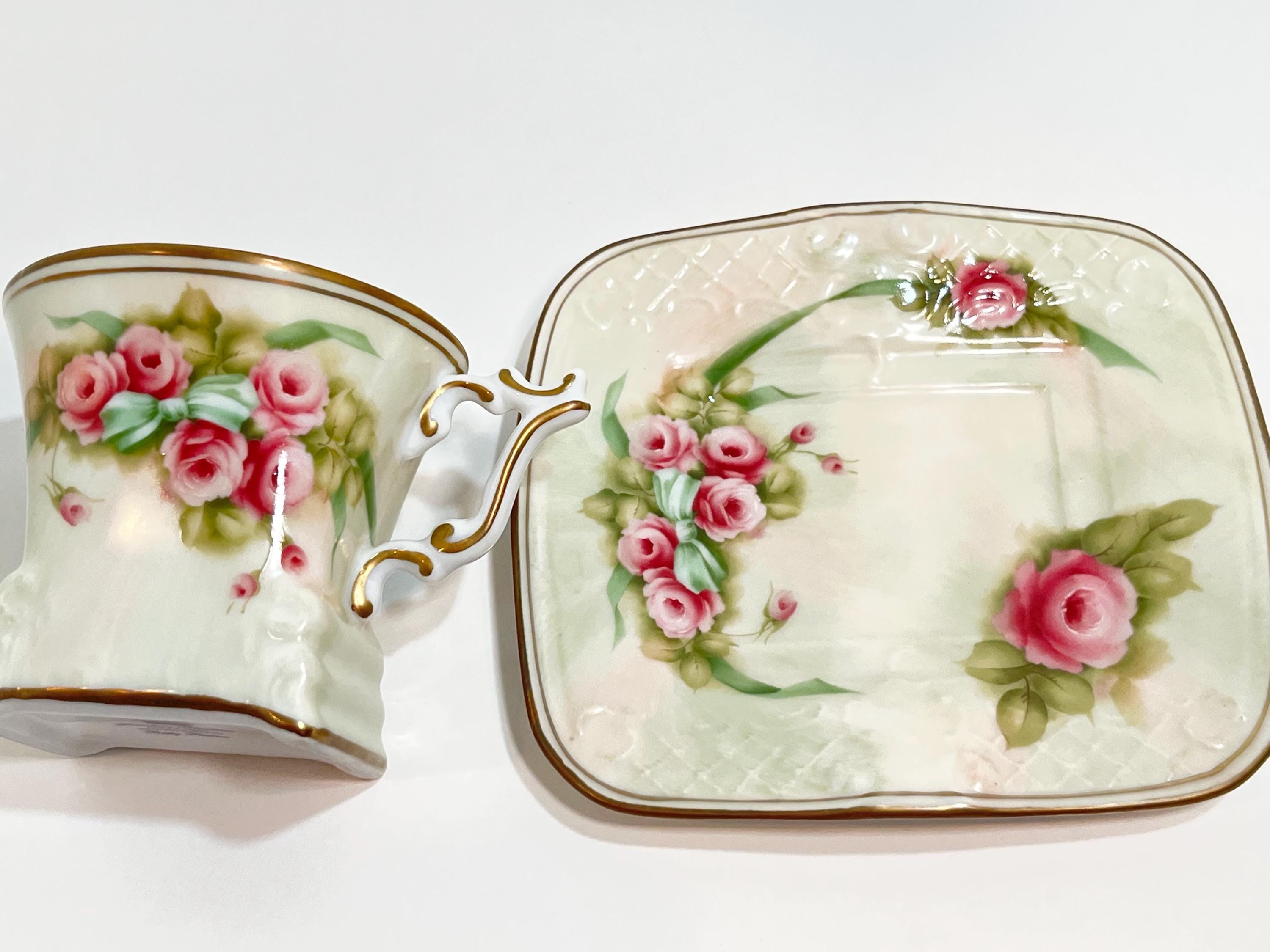 Betty Platner, known for her hand painted porcelain, crafted this glossy, gold trimmed, footed tea cup and saucer. The pink roses and green ribbons are beautiful. There is actually a shape within the saucer and molded design on both pieces. Even the handle is different from standard. The name of her company is Porcelain Treasures. Her logo is PT over a crown.