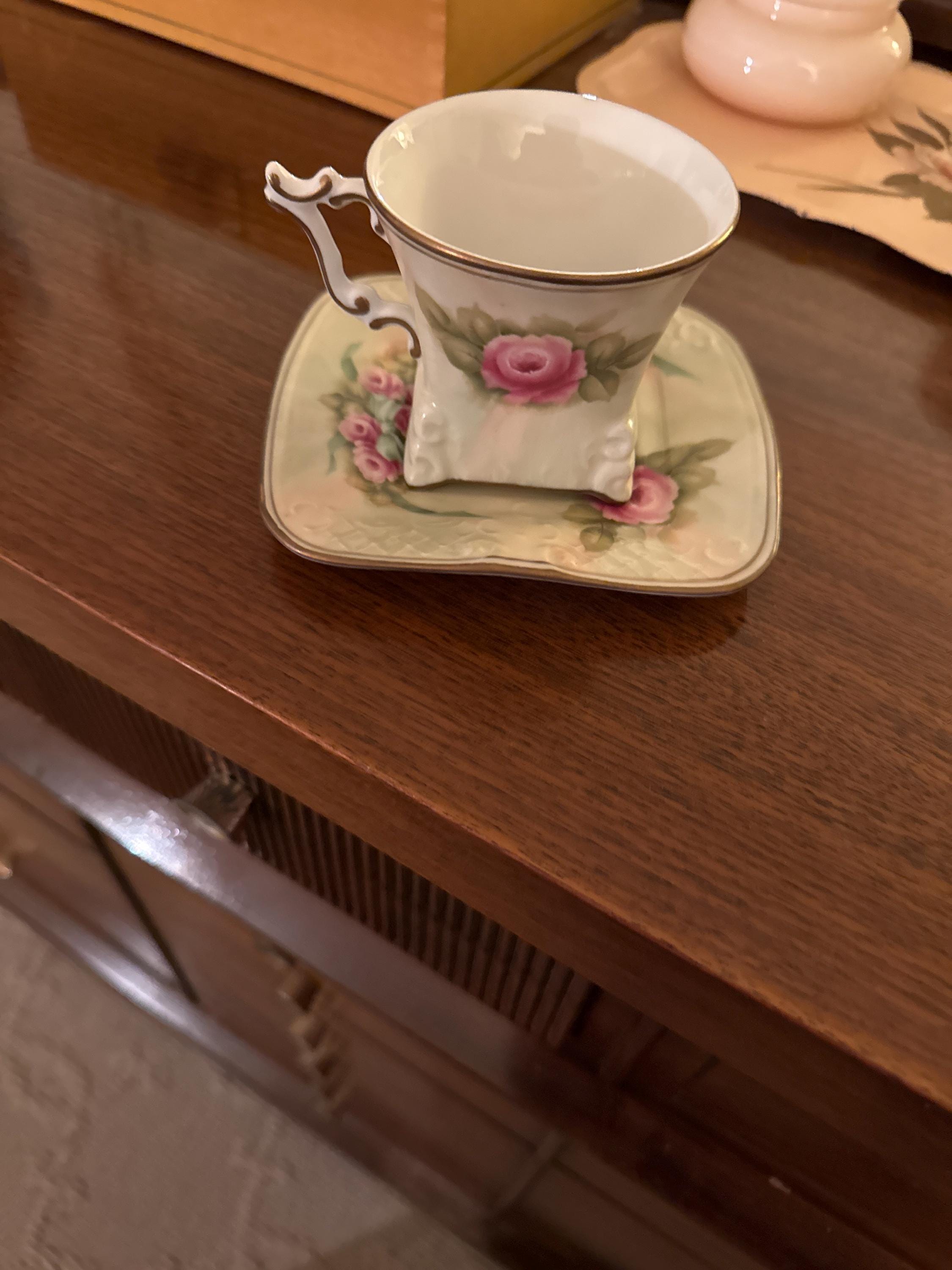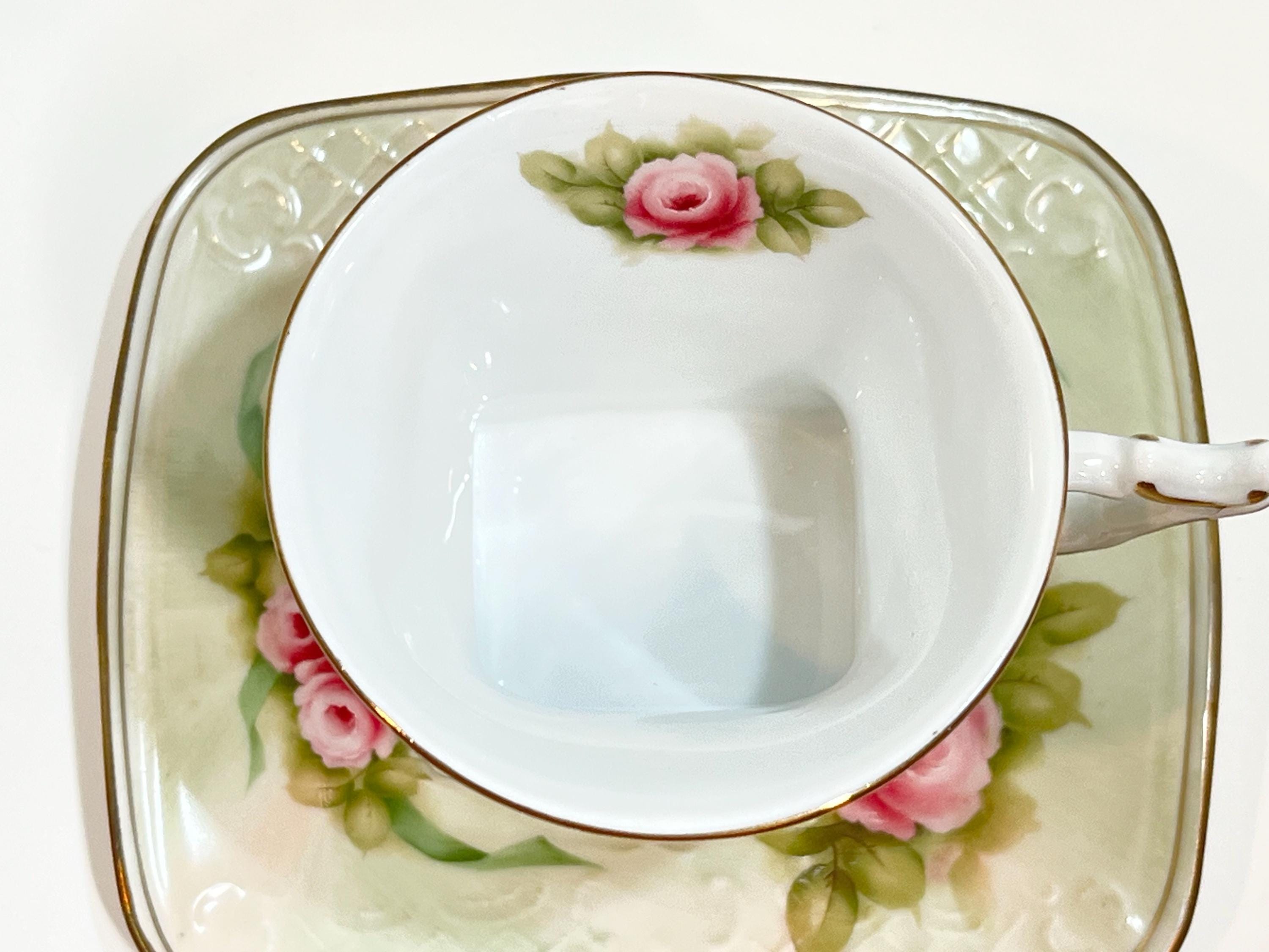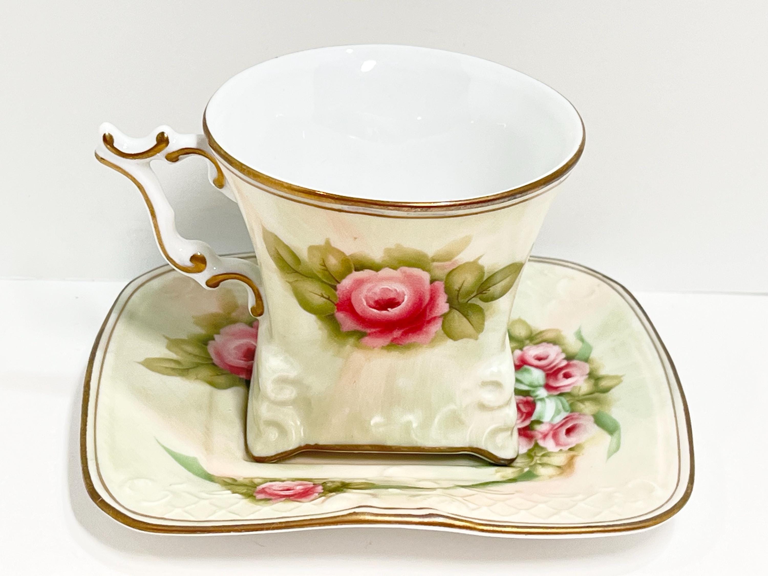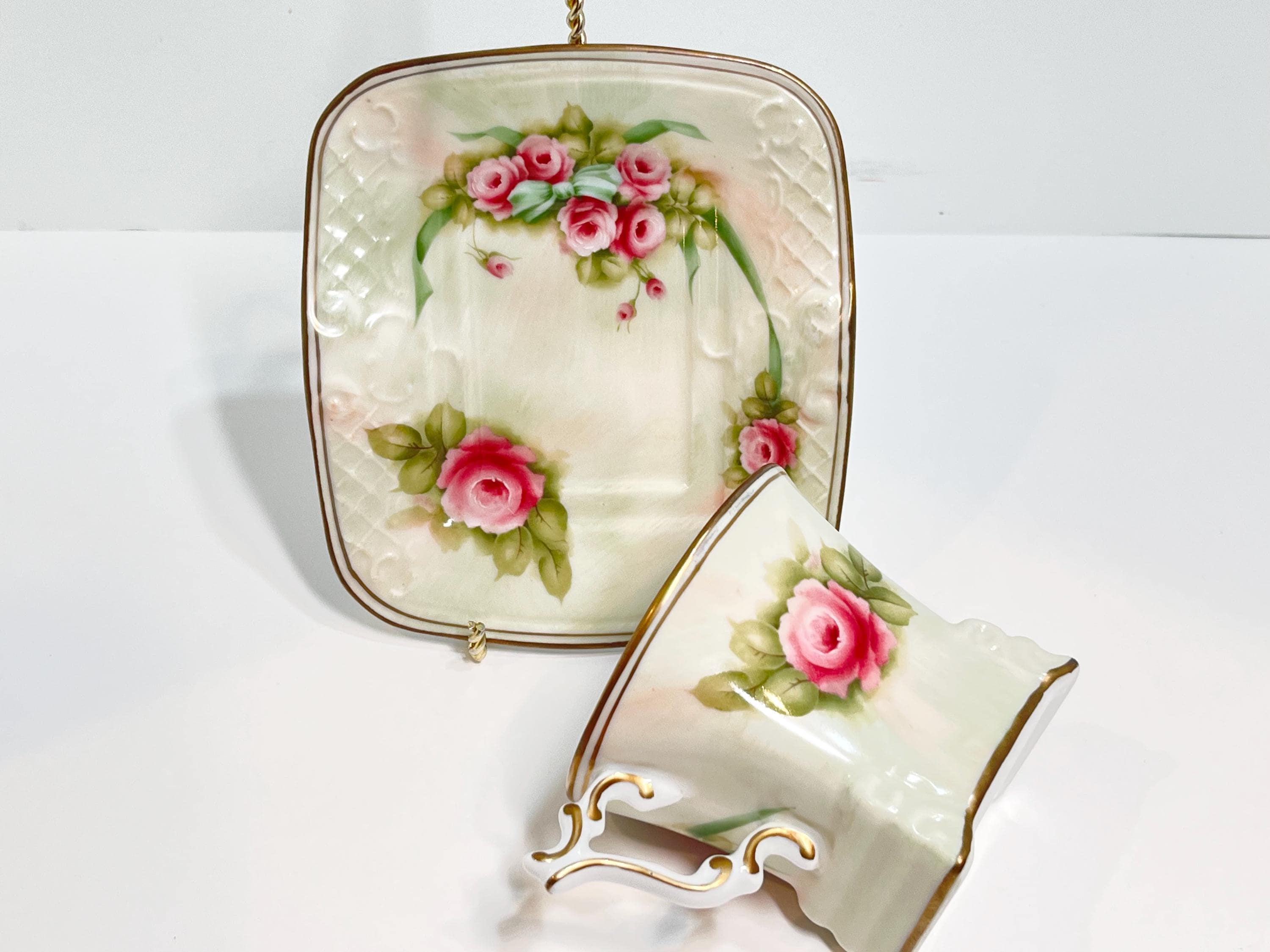 Betty Platner, known for her hand painted porcelain, crafted this glossy, gold trimmed, footed tea cup and saucer. The pink roses and green ribbons are beautiful. There is actually a shape within the saucer and molded design on both pieces. Even the handle is different from standard. The name of her company is Porcelain Treasures. Her logo is PT over a crown.