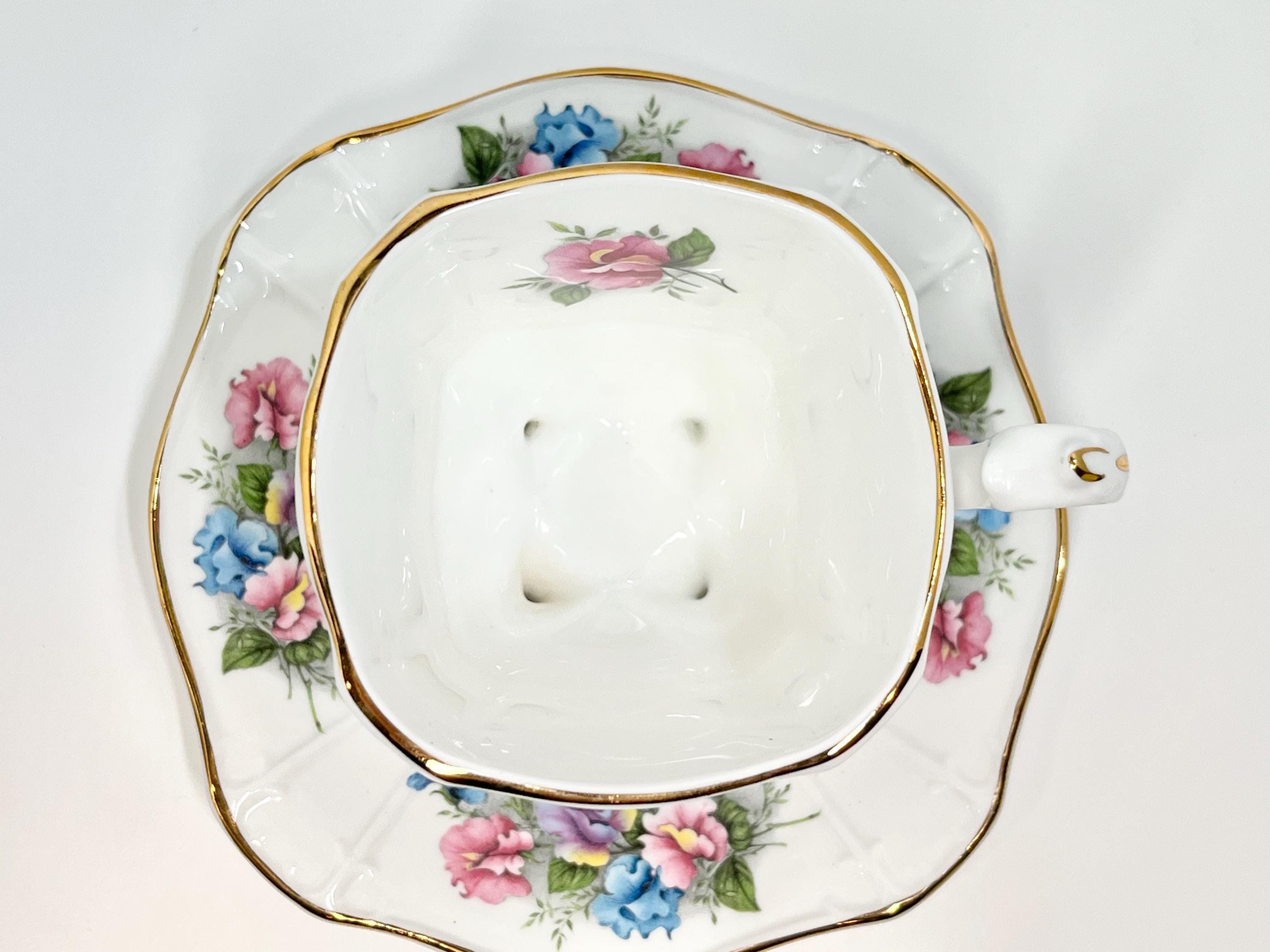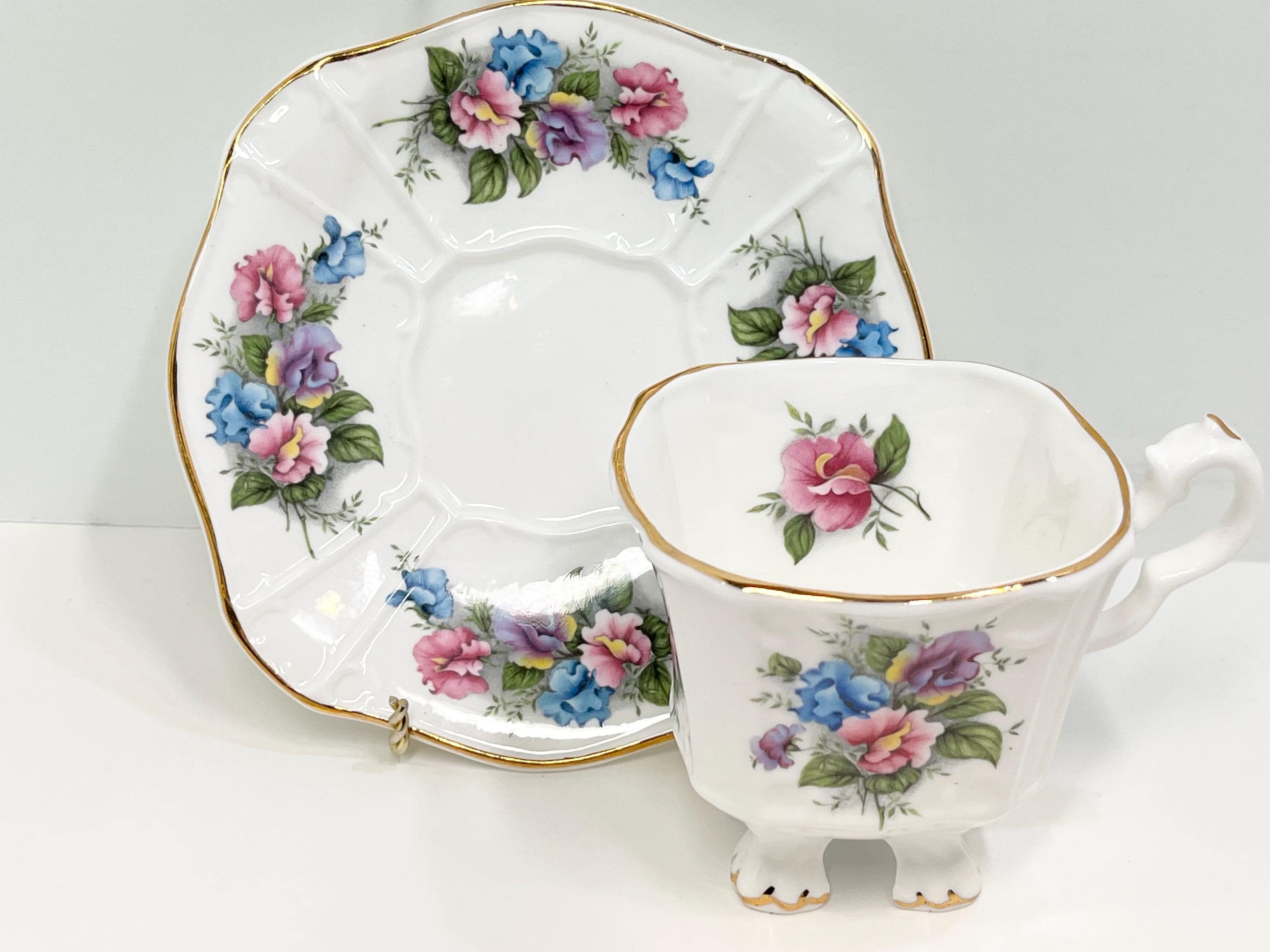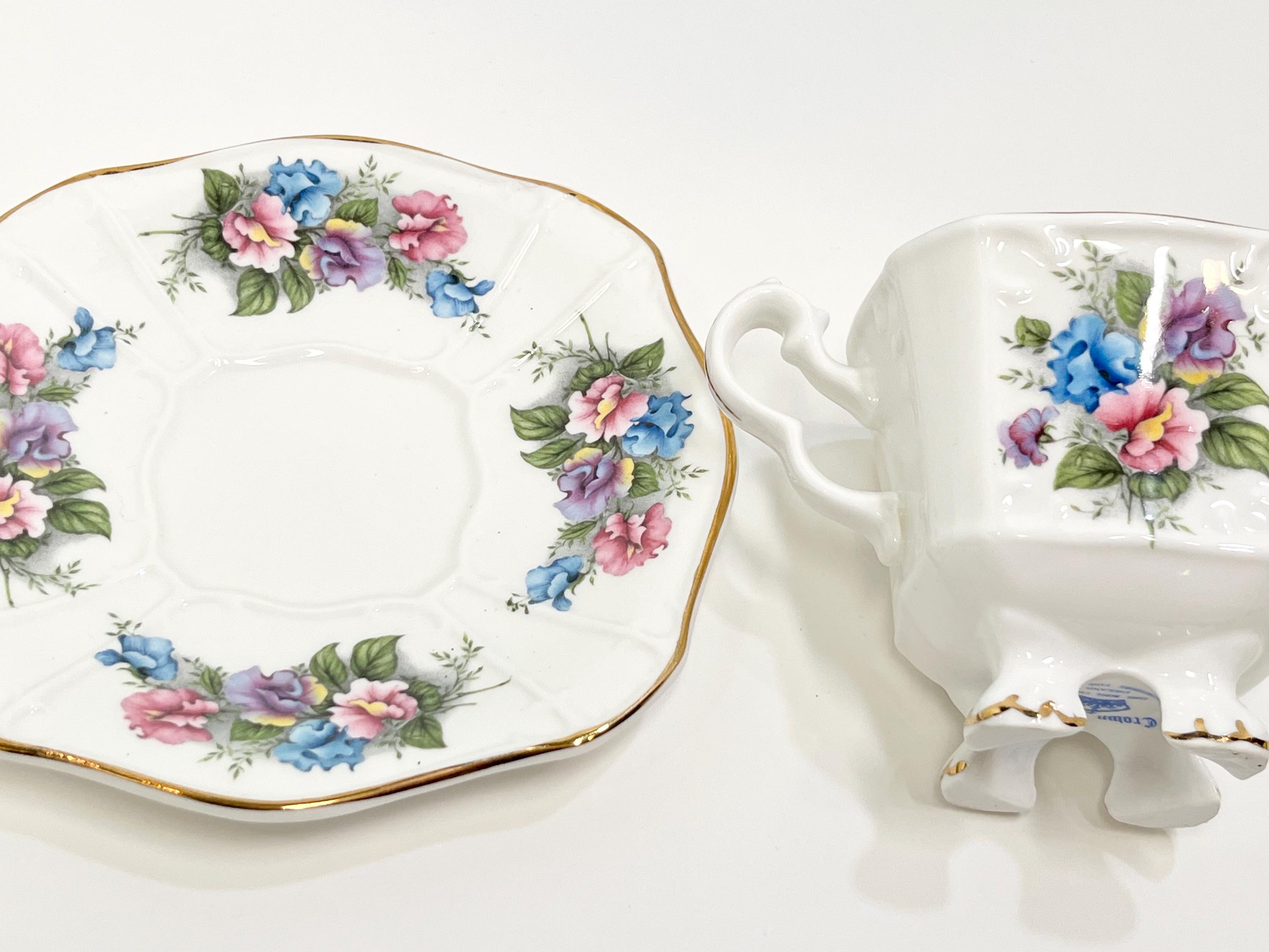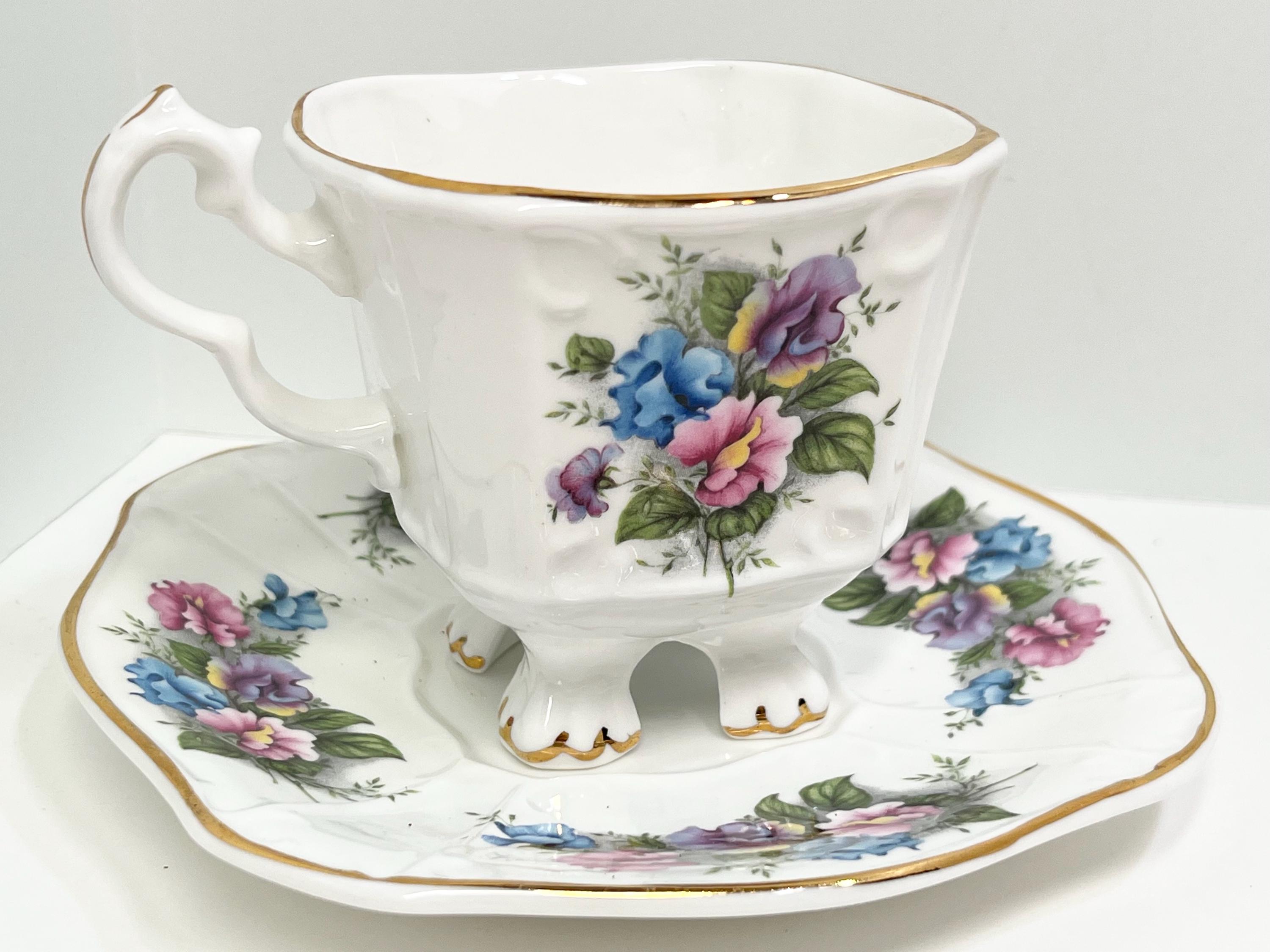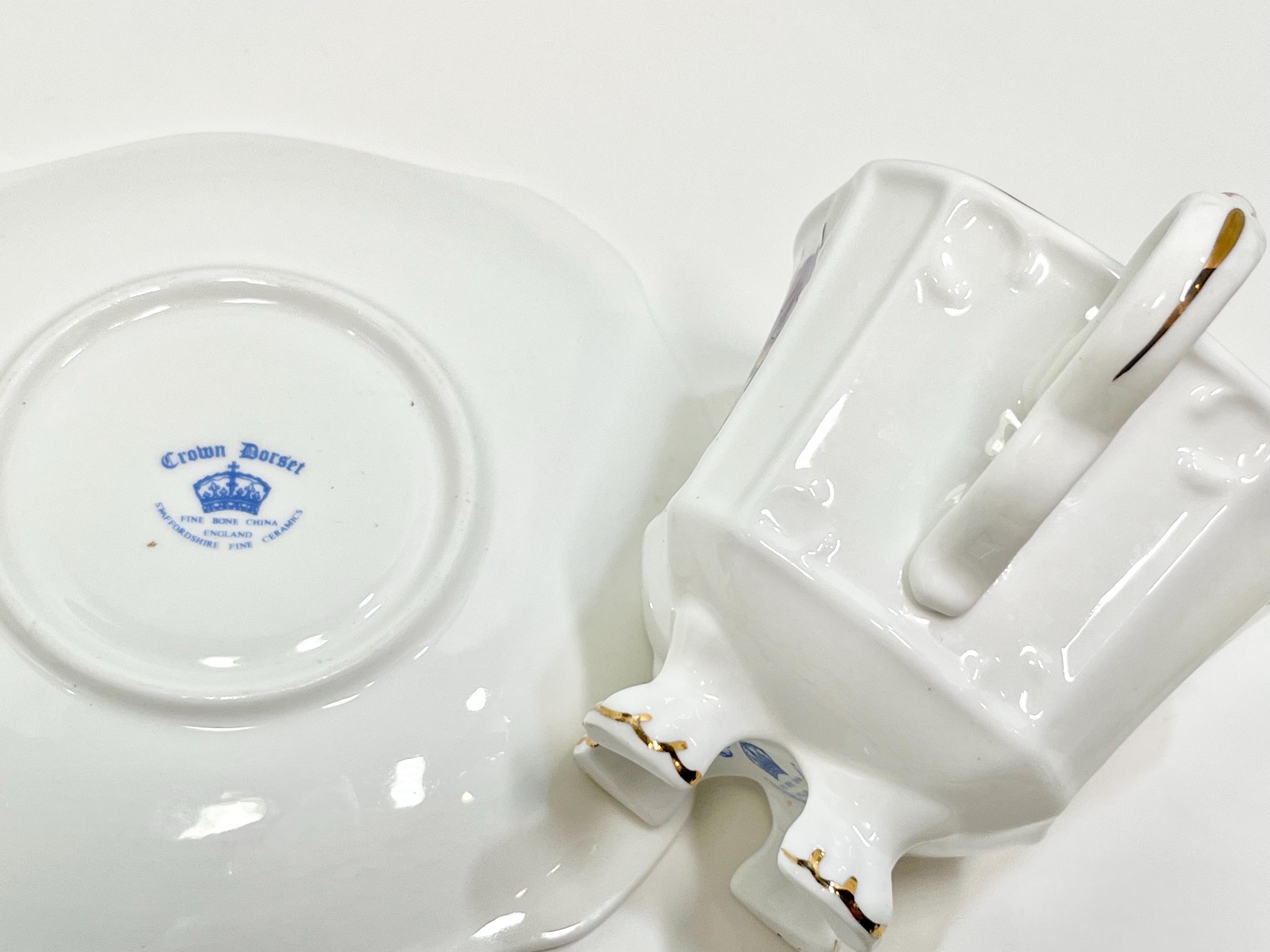 Crown Dorset, famous for its teapots, also made unusual square teacups and saucers in fine bone china. This is one of their pretty ones. It has four feet, and a design molded into the porcelain. It is easy to use and a conversation piece as well.