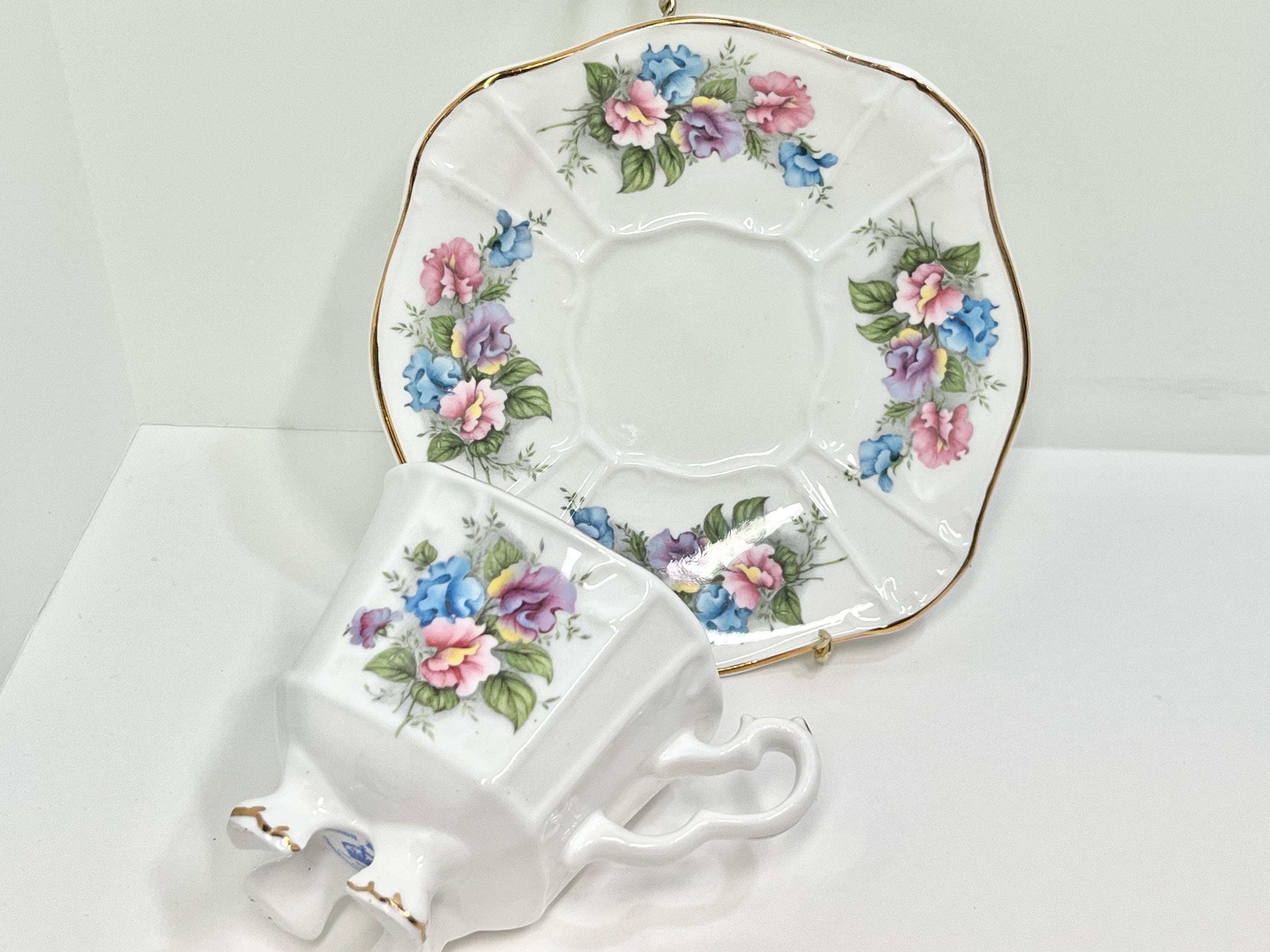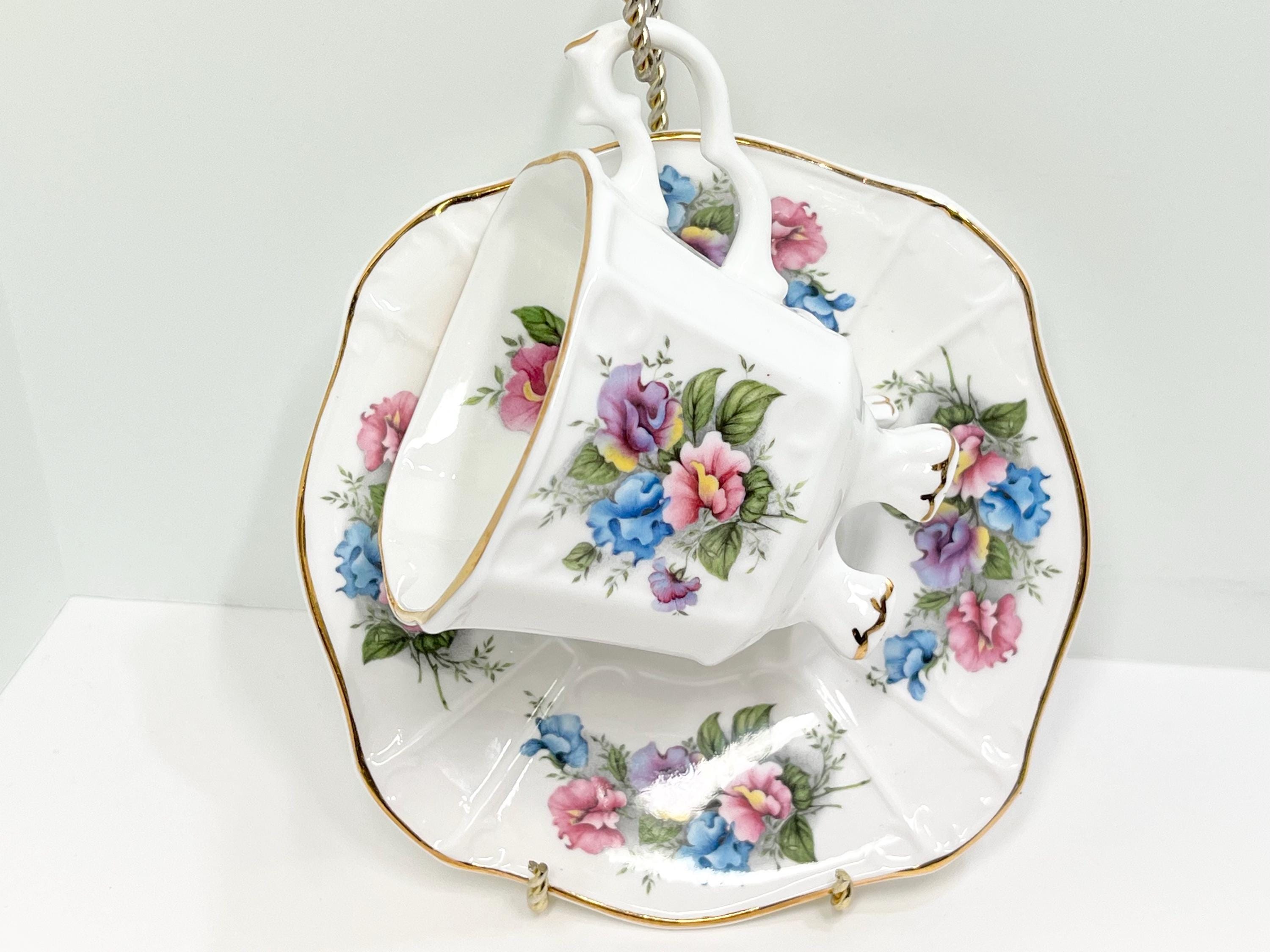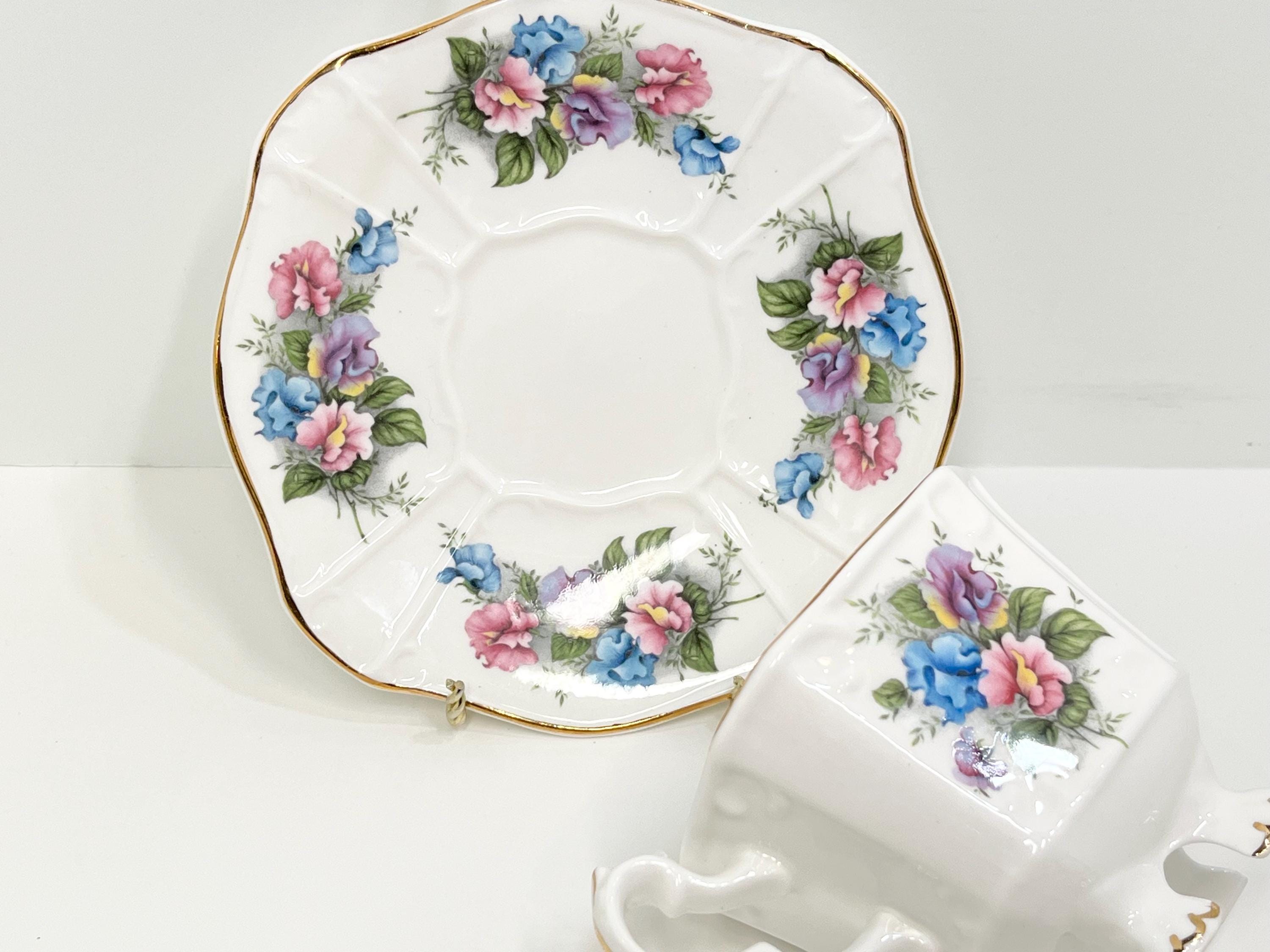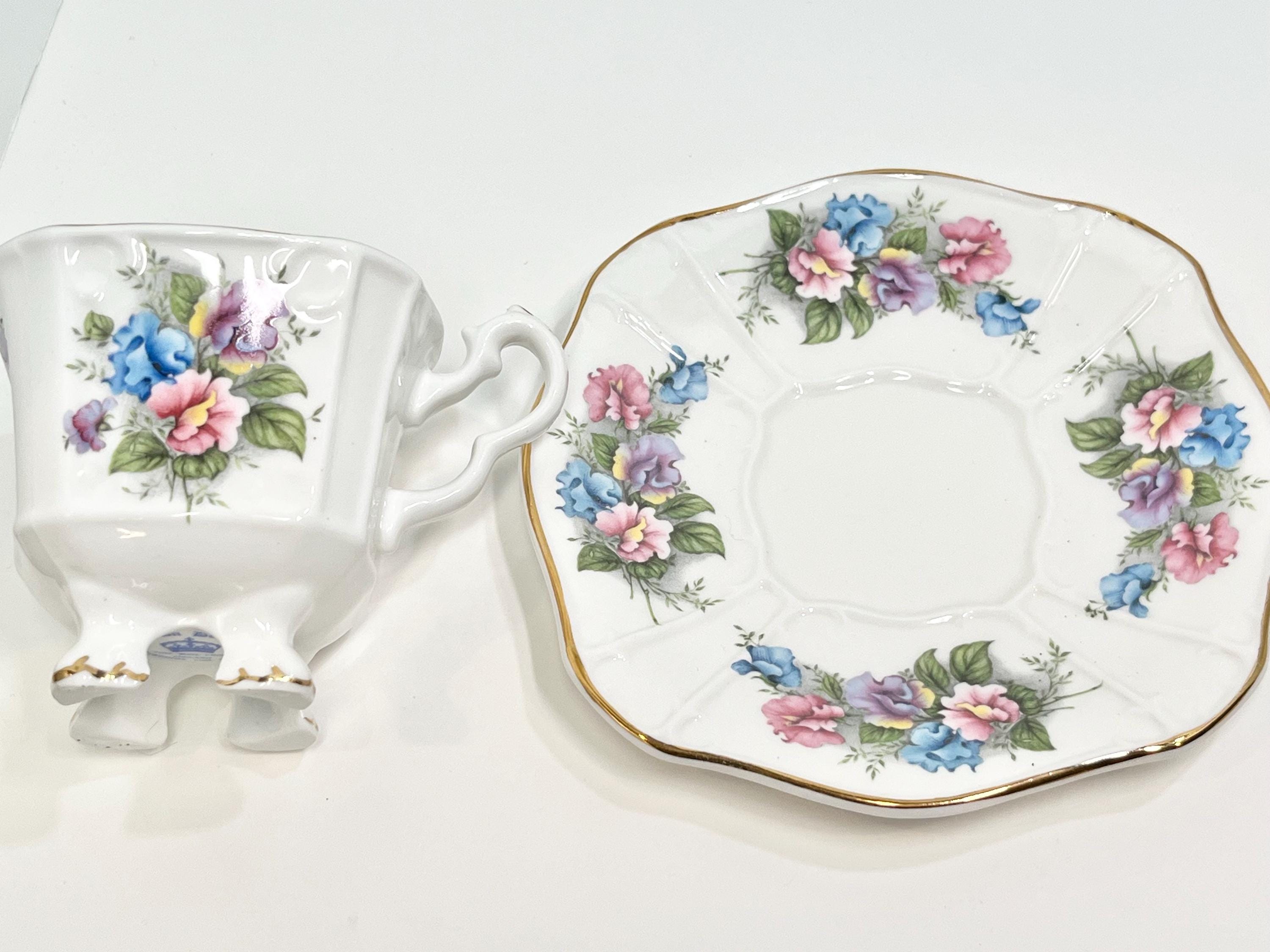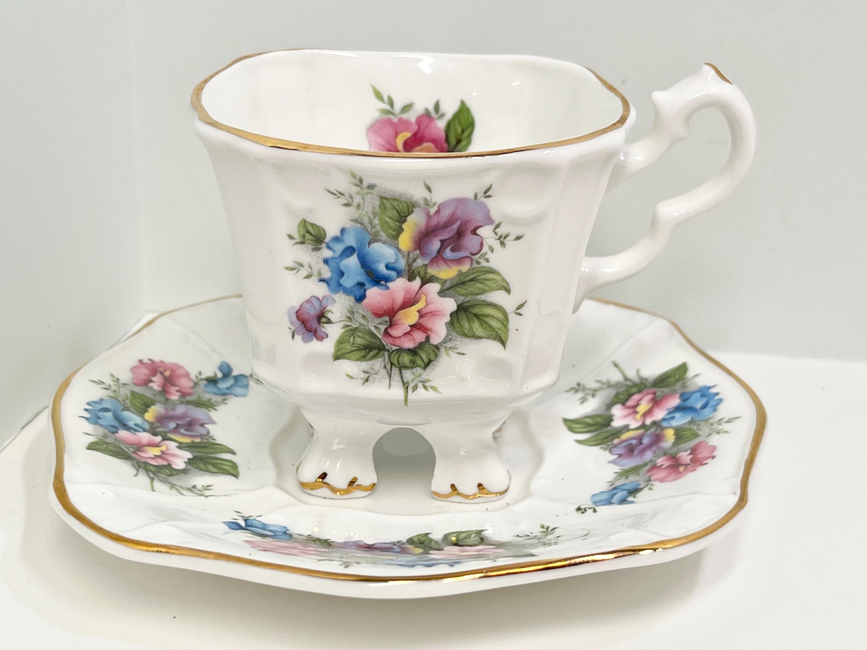Crown Dorset, famous for its teapots, also made unusual square teacups and saucers in fine bone china. This is one of their pretty ones. It has four feet, and a design molded into the porcelain. It is easy to use and a conversation piece as well.