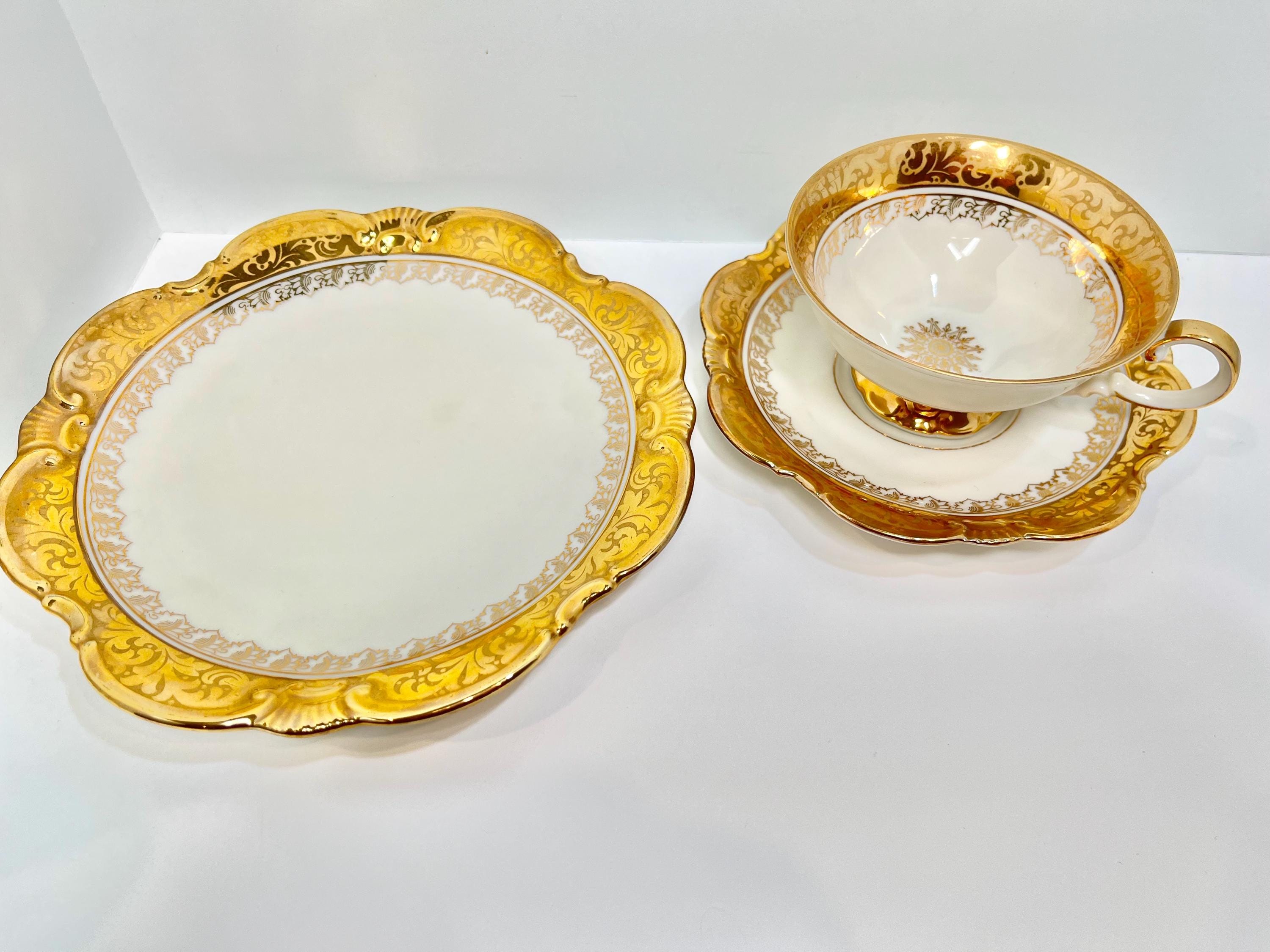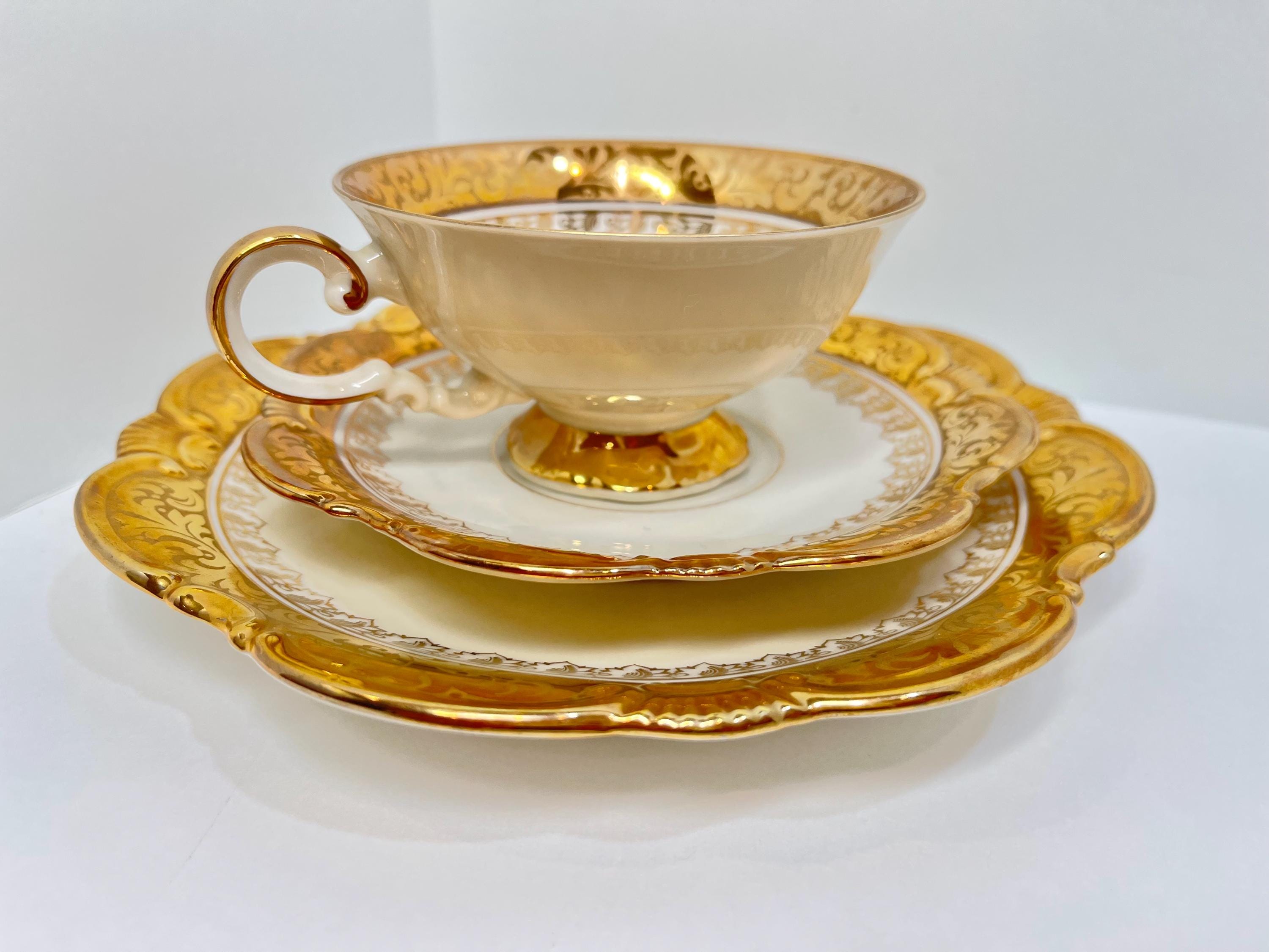 This breathtaking set consists of a plate, teacup and saucer. It was crafted in Bavaria, Germany by Ebertal, a quality porcelain company. It was active from 1950 to 1970. You will see it offered as Eberthal, but the logo on the china is spelled without the H.