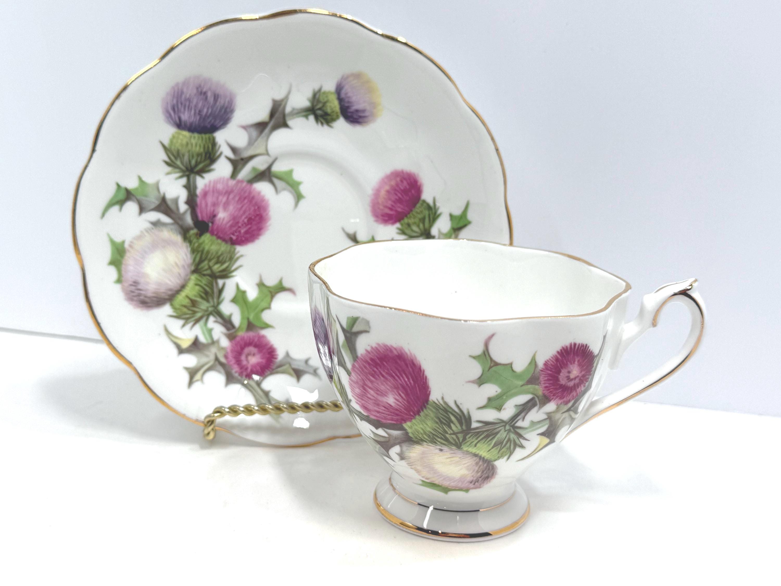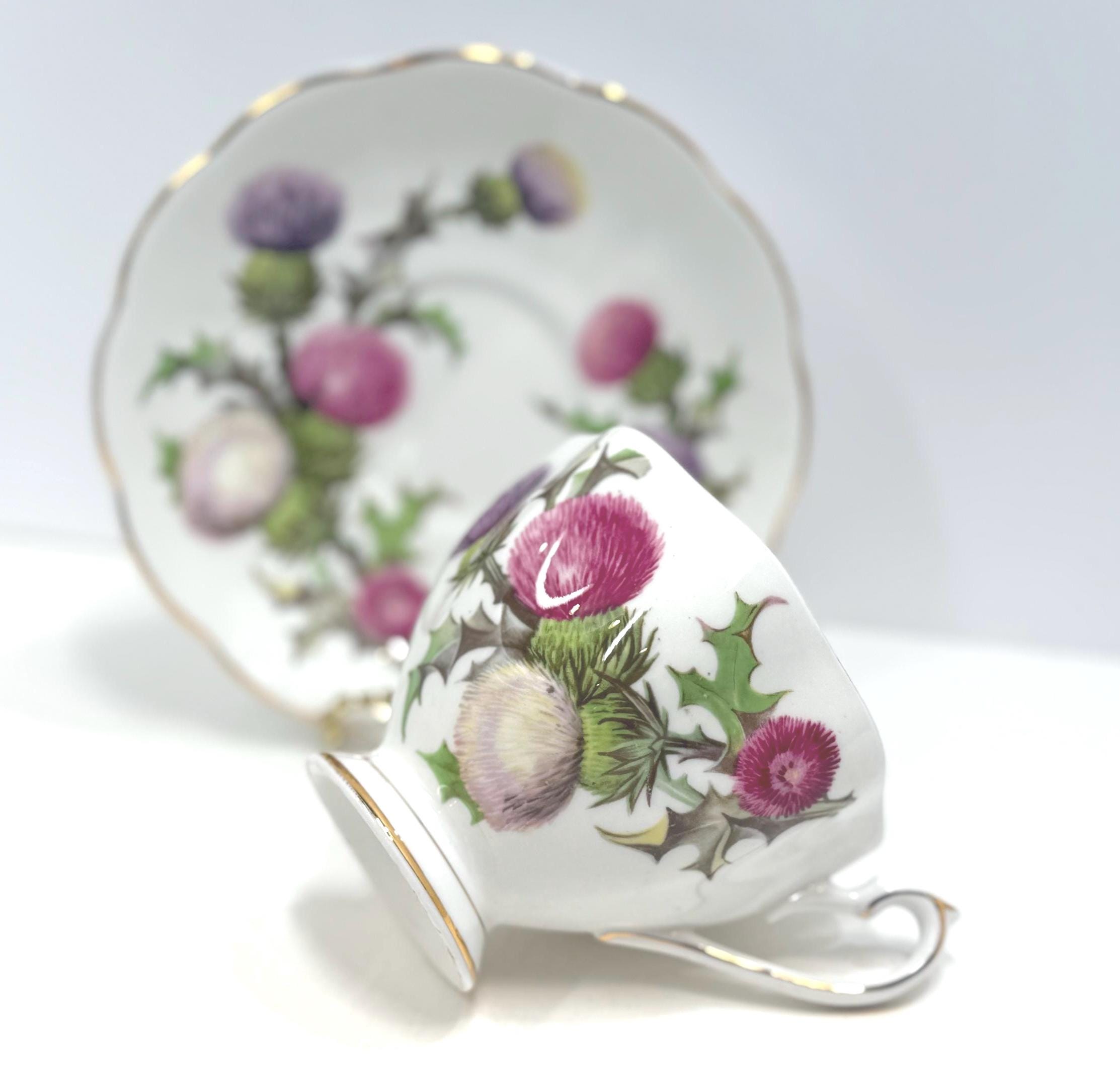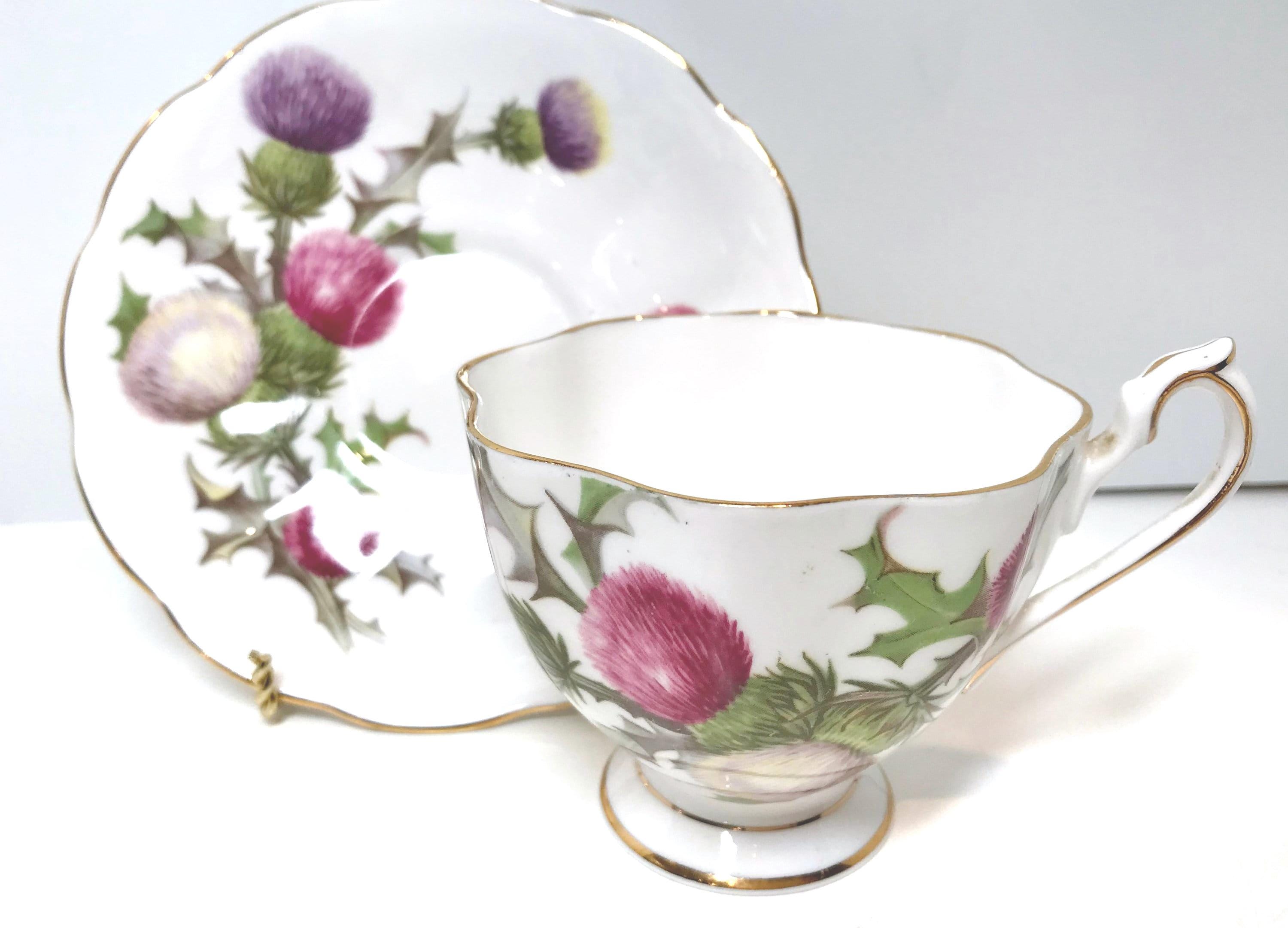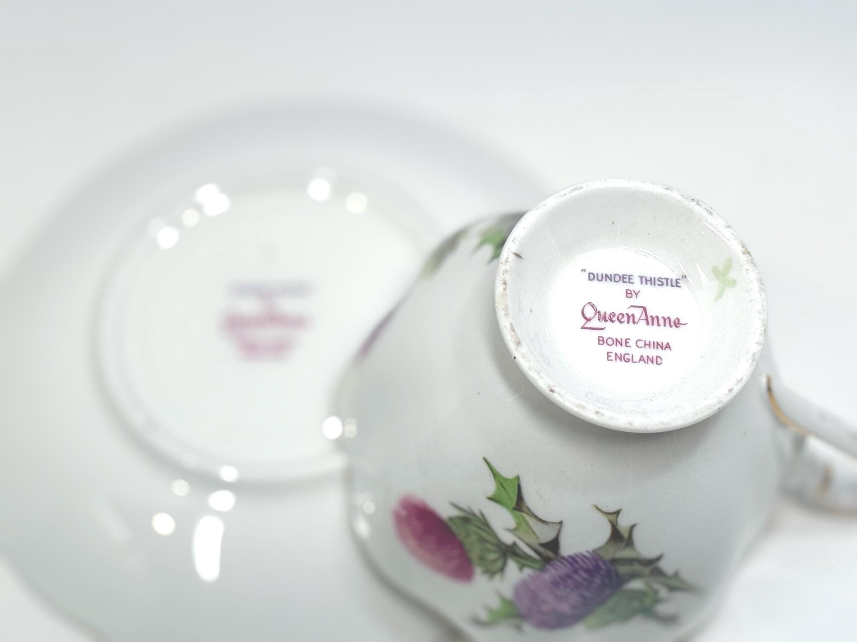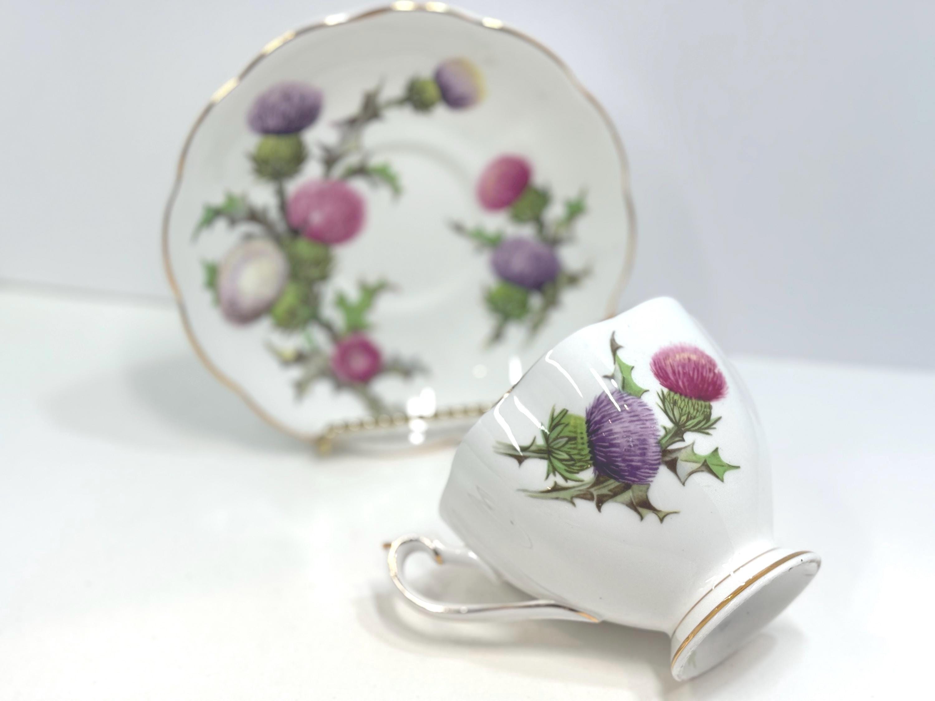Imagine the rolling hills of lavender dotted with thistle, a scene that inspired the gorgeous Dundee Thistle teacup and saucer by Queen Anne. The design is as captivating as its shape, making it an ideal choice for anyone who cherishes Scottish tradition. Queen Anne, owned by Shore and Coggins, operated at the Edensor Works on High Street in Longton, England, and had been part of the Staffordshire potteries since 1911.