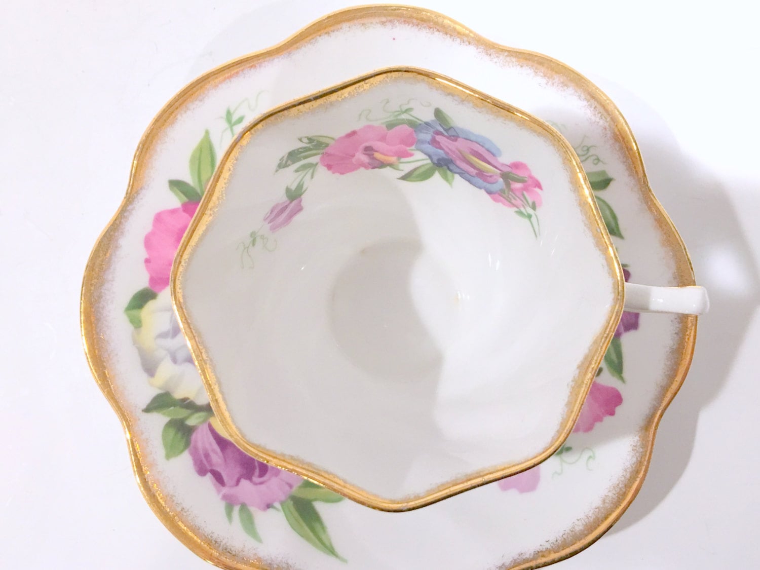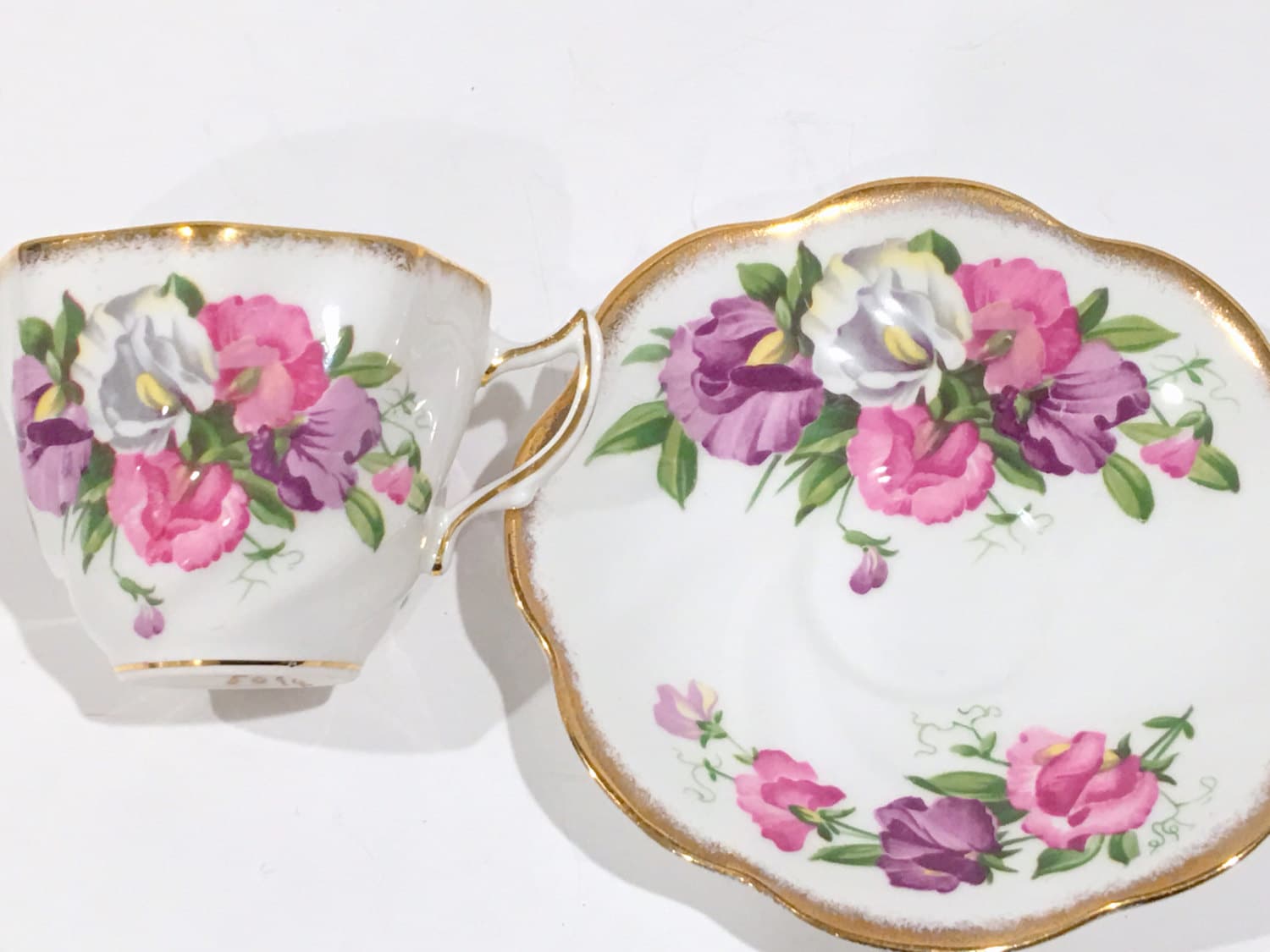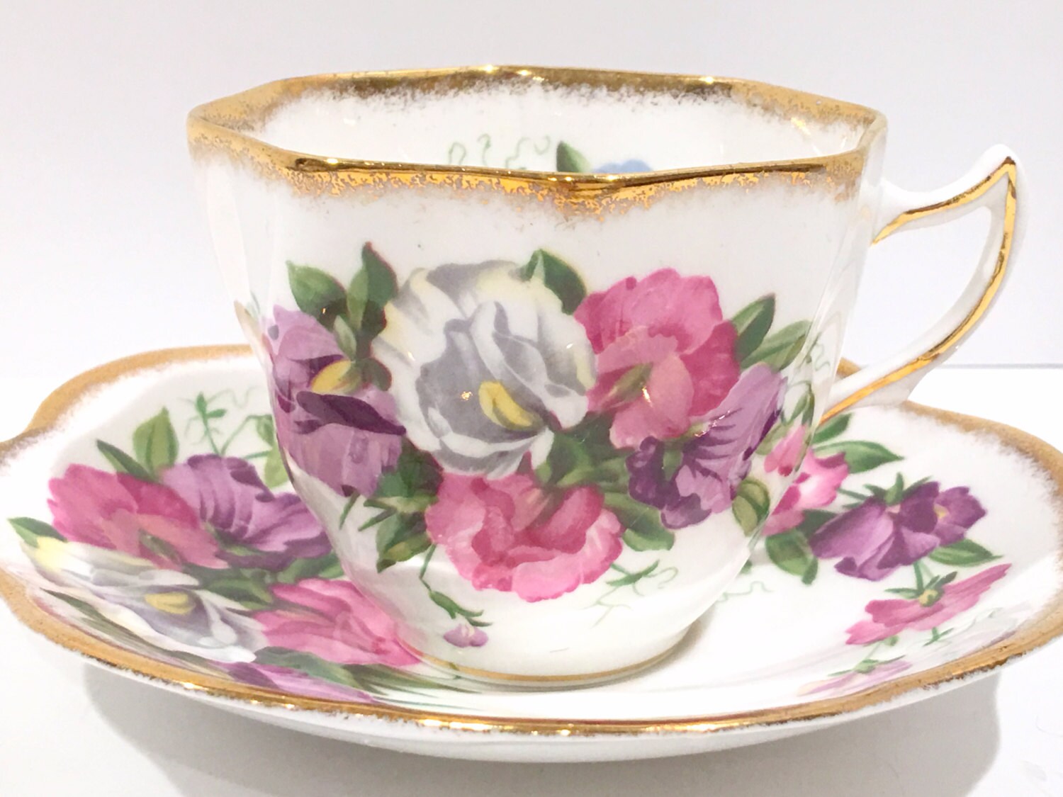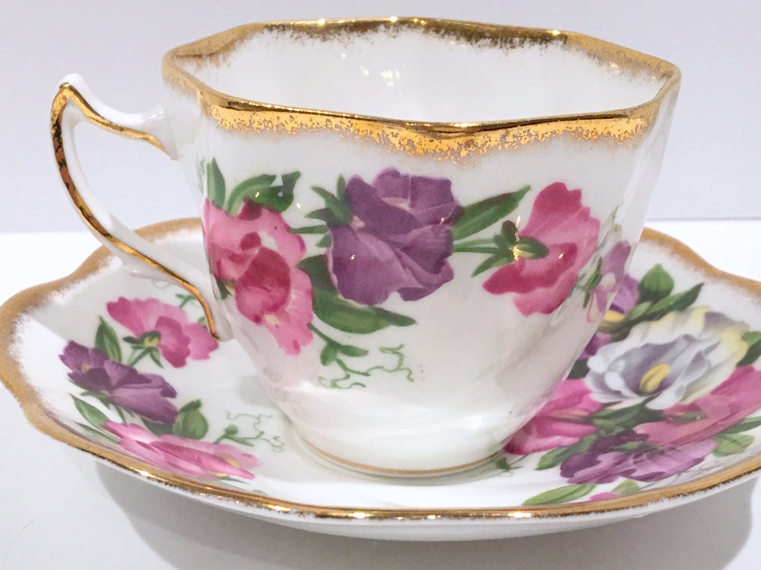 This is especially so when using this captivating teacup and saucer by Rosina Bone China of England. Sweetpeas, birth flower for the month of April, adorn the inside of the teacup as well.