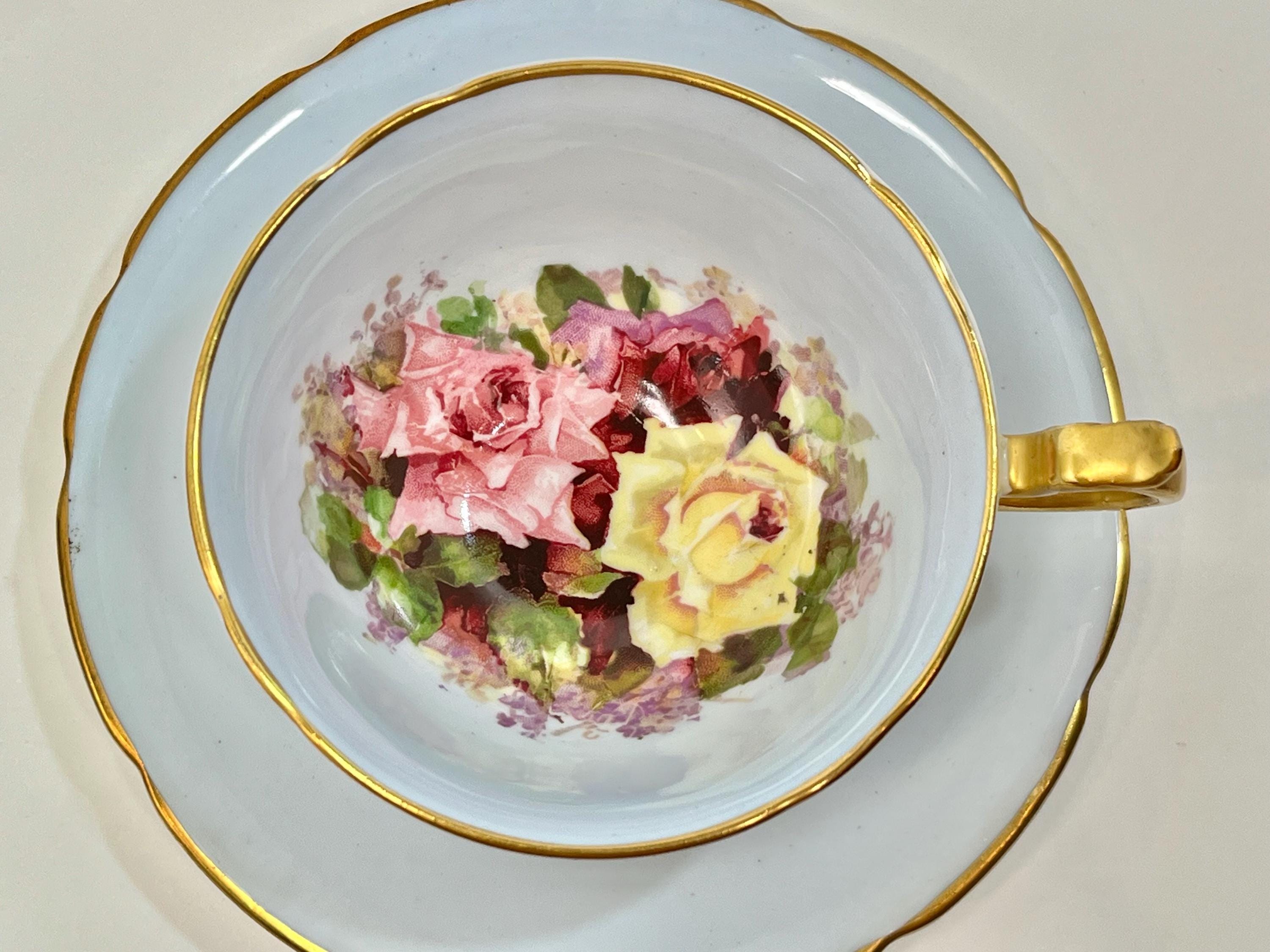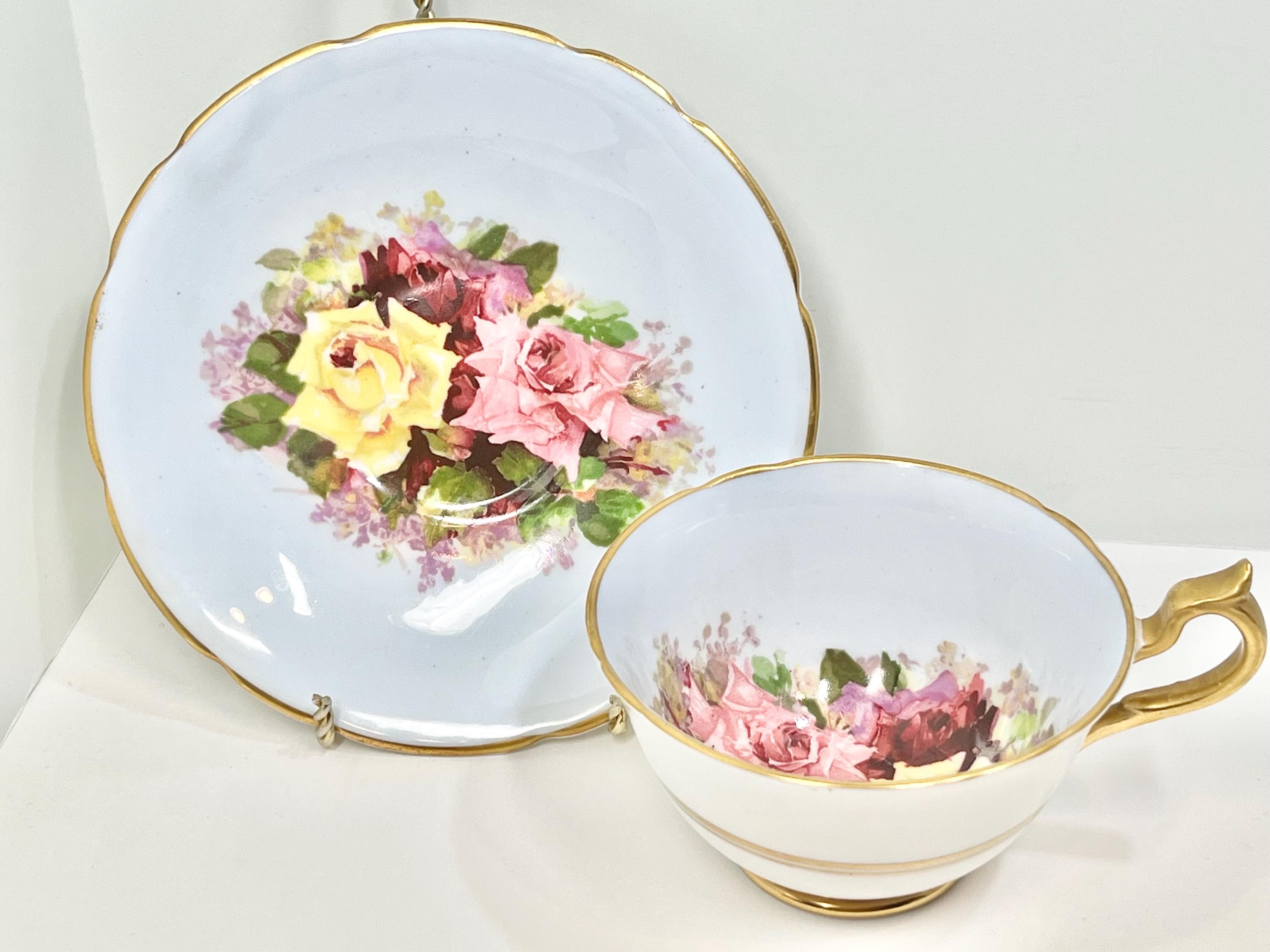 The roses float upon a background of pale sky blue. This is a rare item. The backstamp indicates that it was produced between 1953 and 1962.