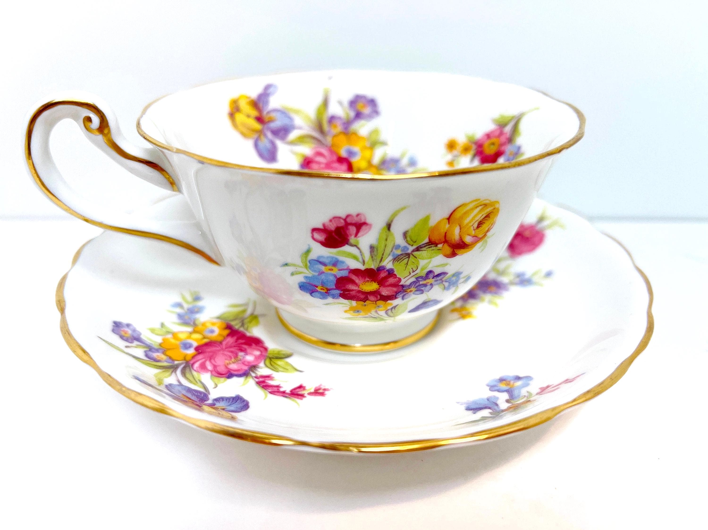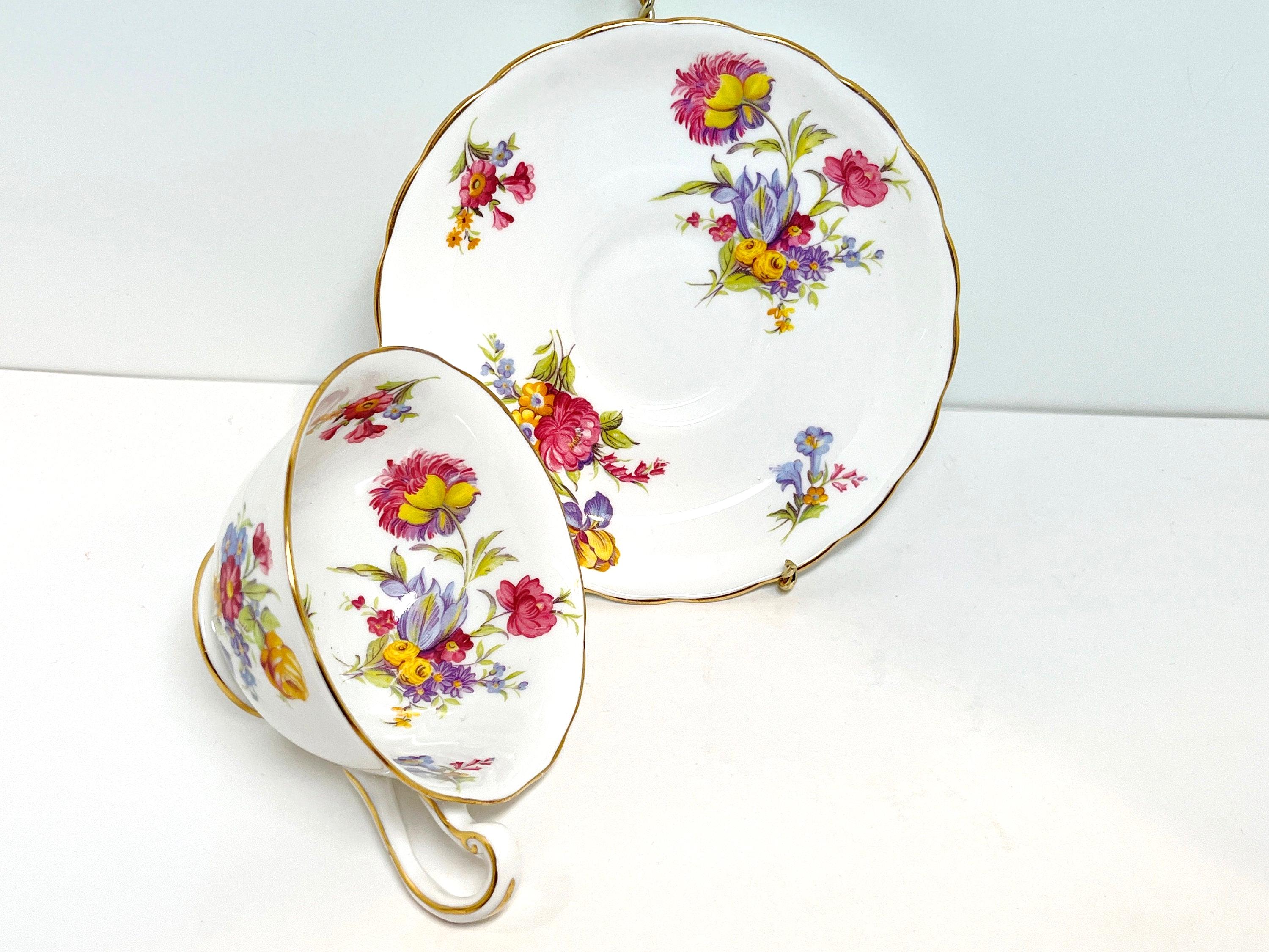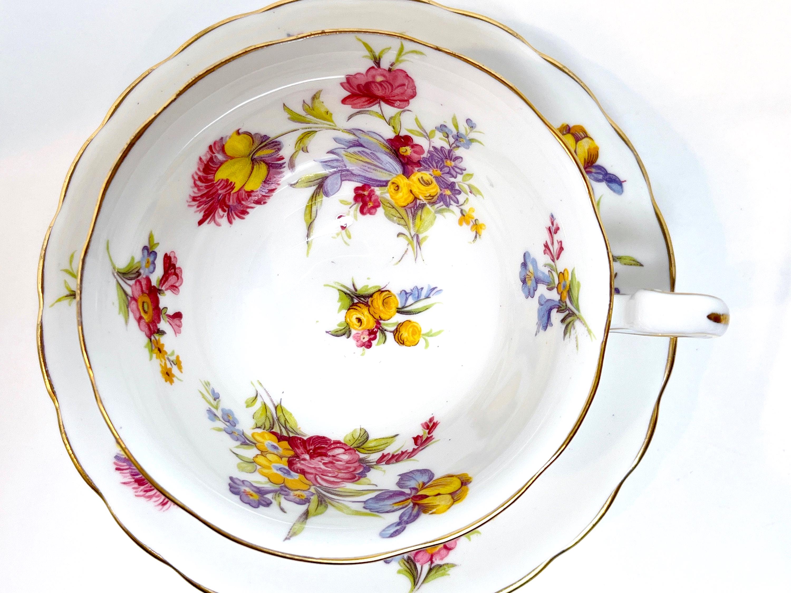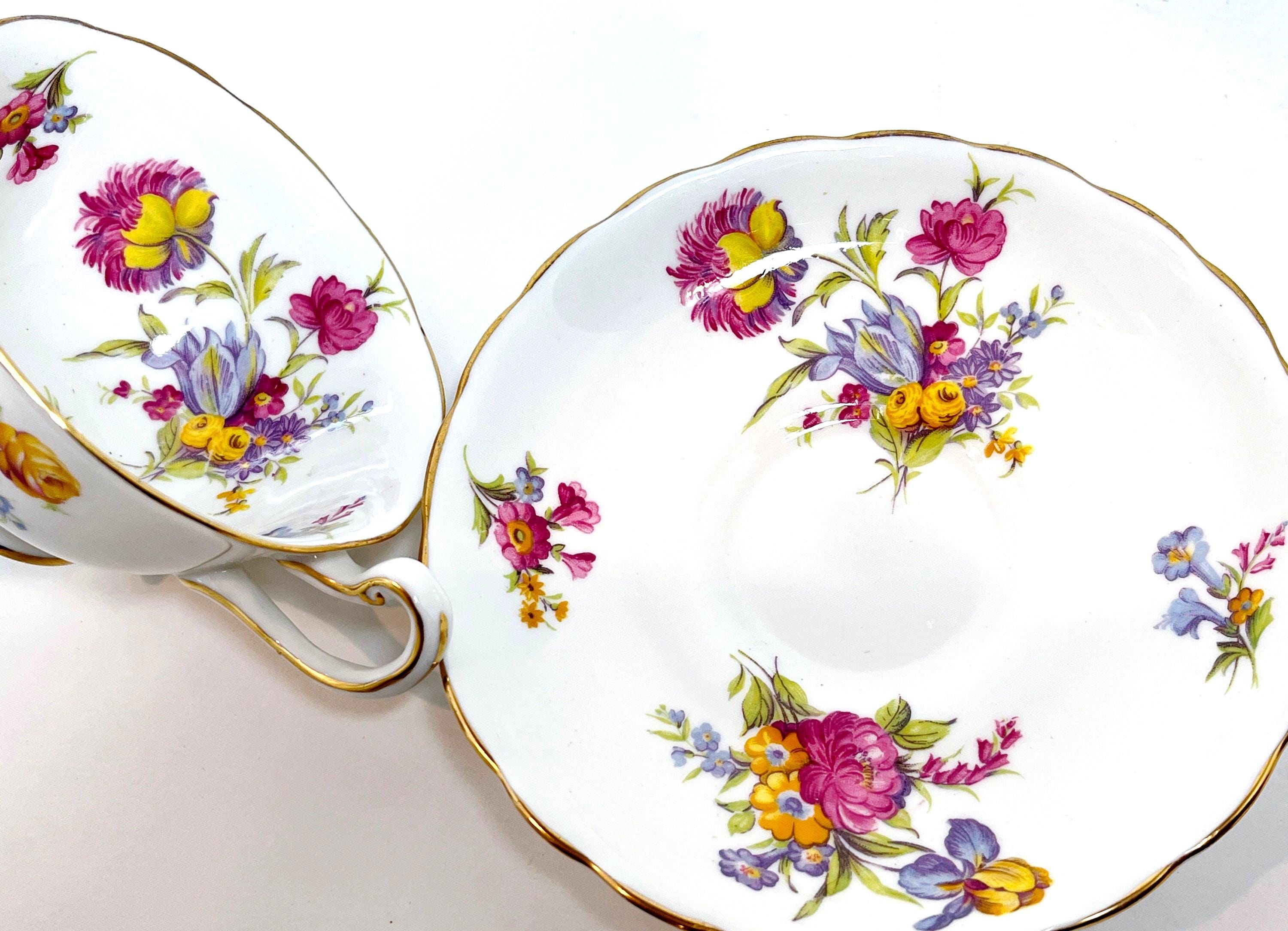 This hand painted teacup and saucer has lovely purple, pink and yellow blossoms. The colors are just right and the softly English bone china is softly scalloped.