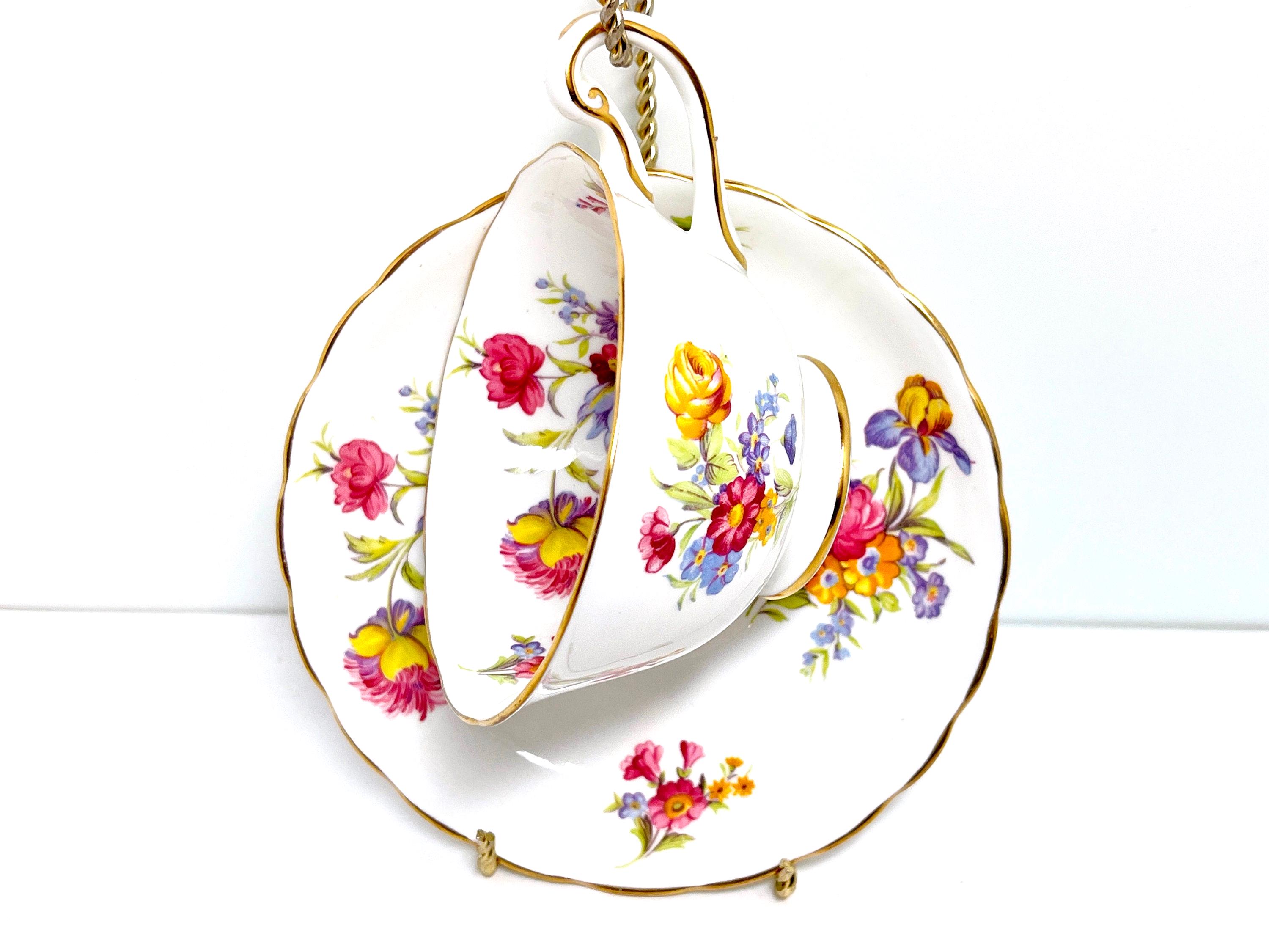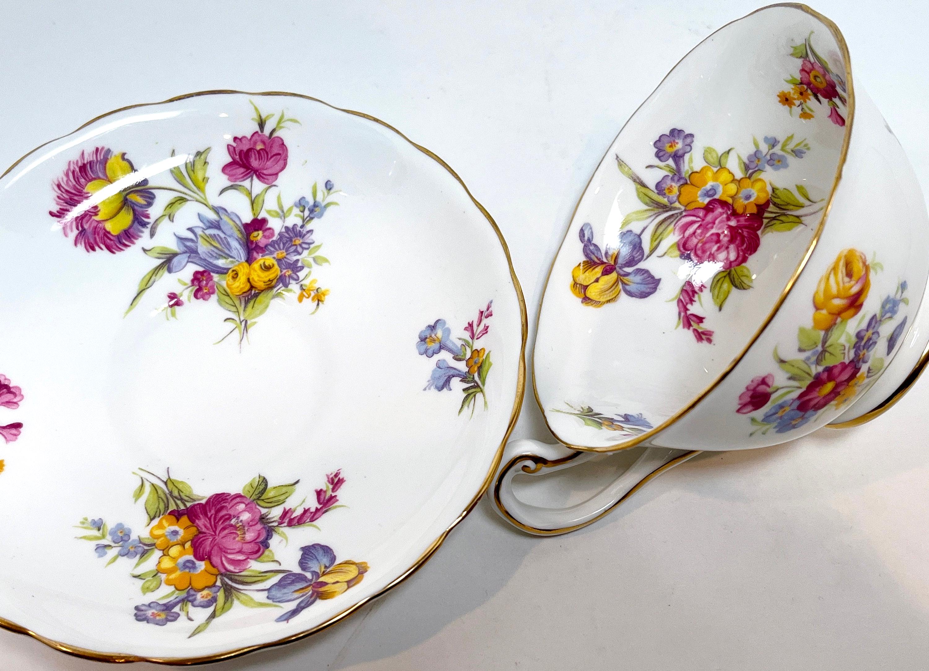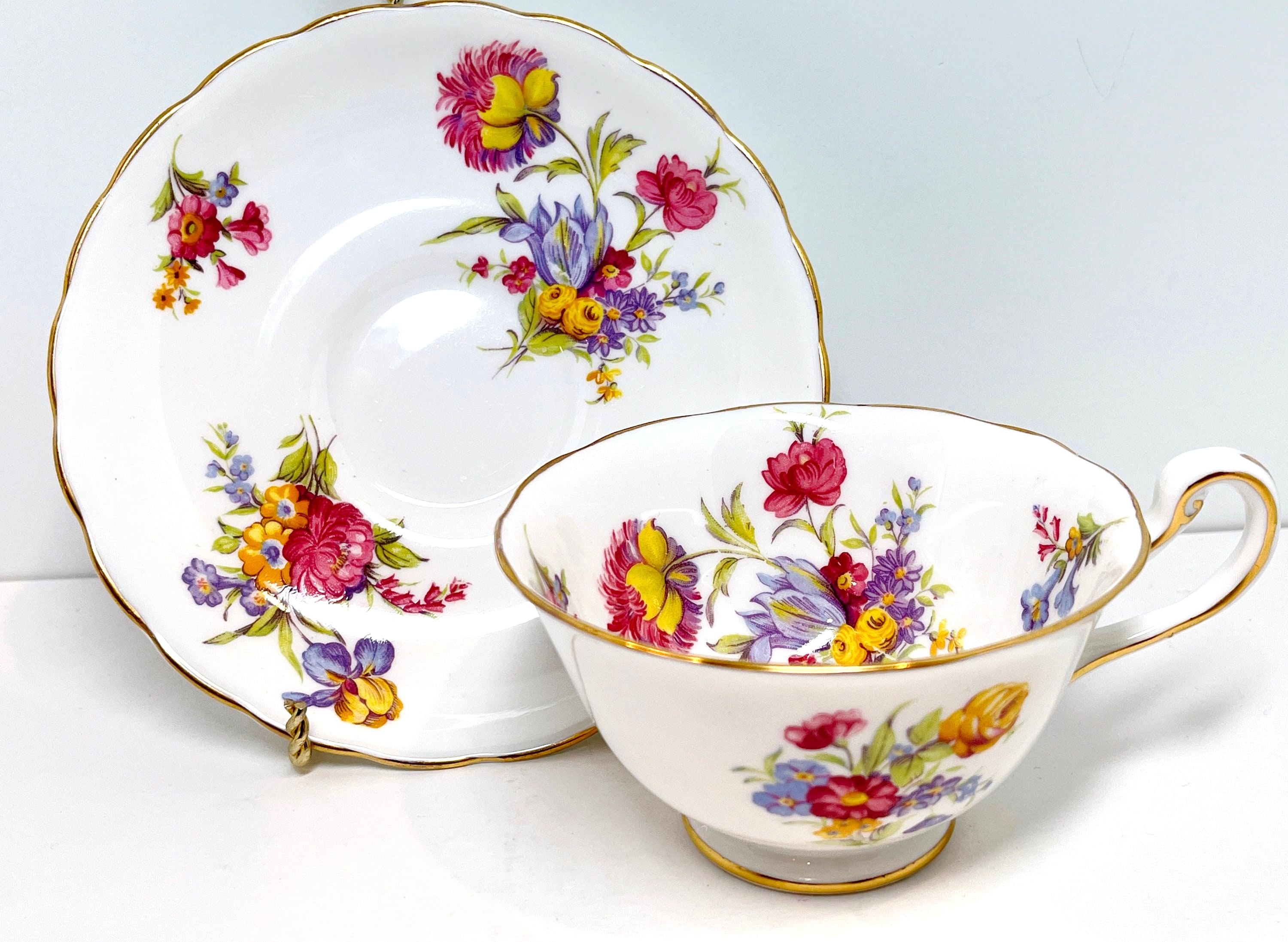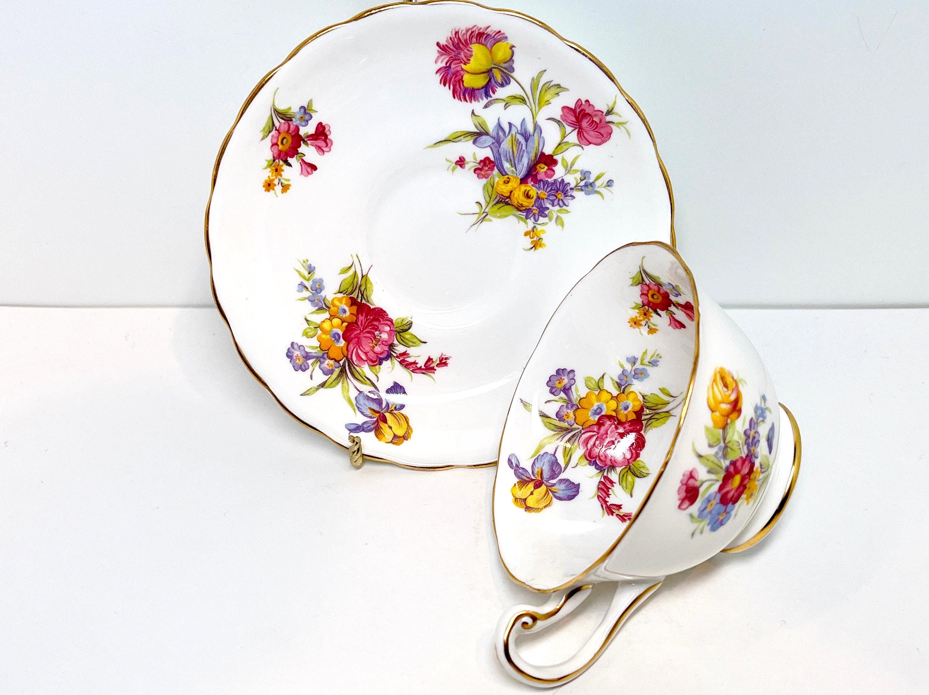 This hand painted teacup and saucer has lovely purple, pink and yellow blossoms. The colors are just right and the softly English bone china is softly scalloped.
